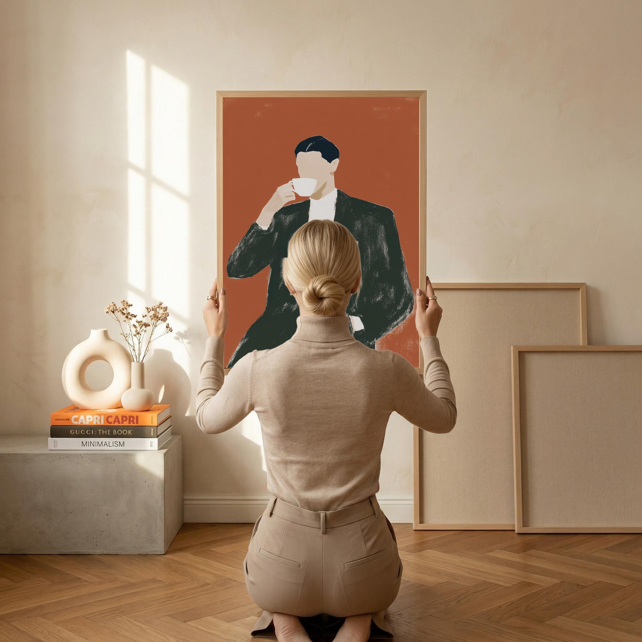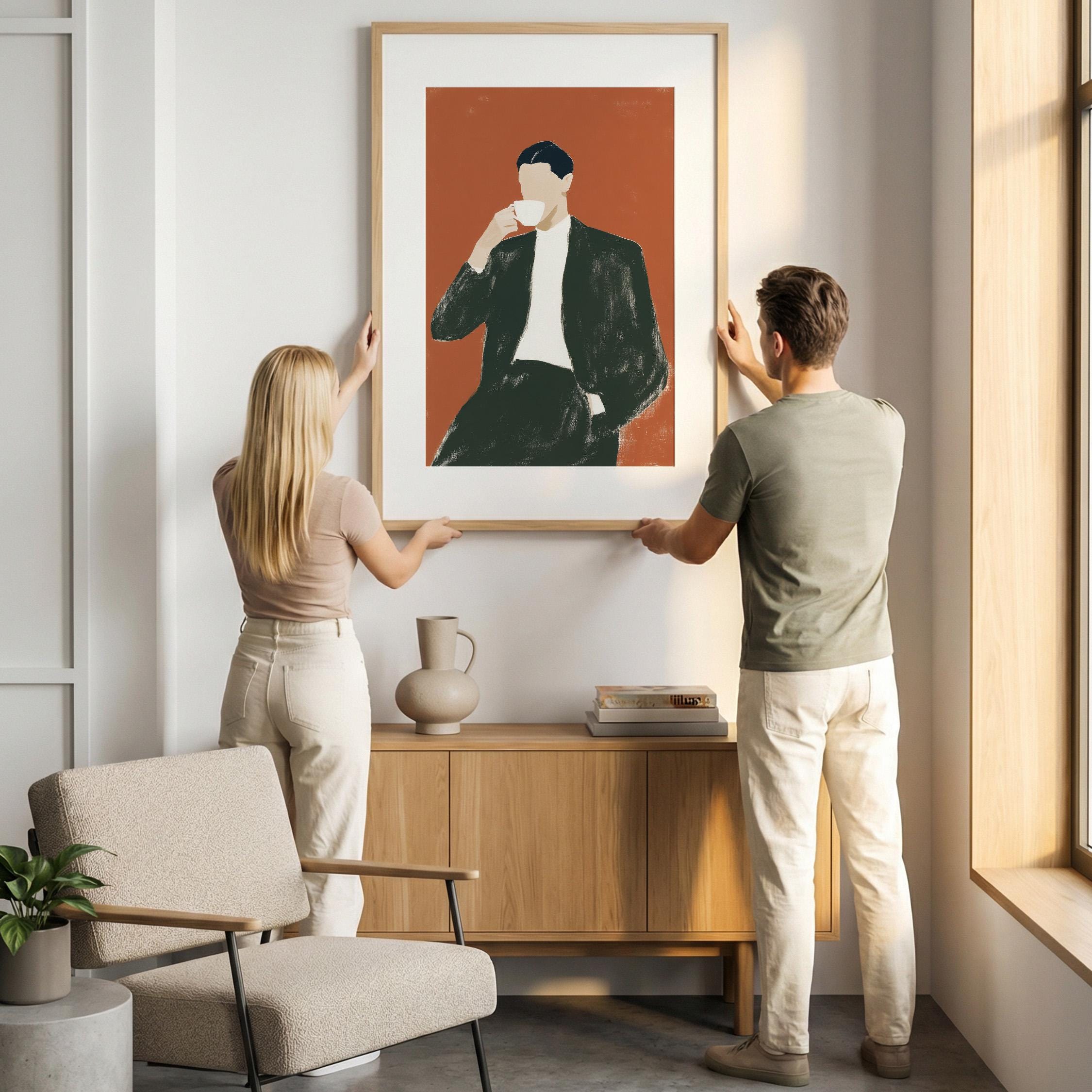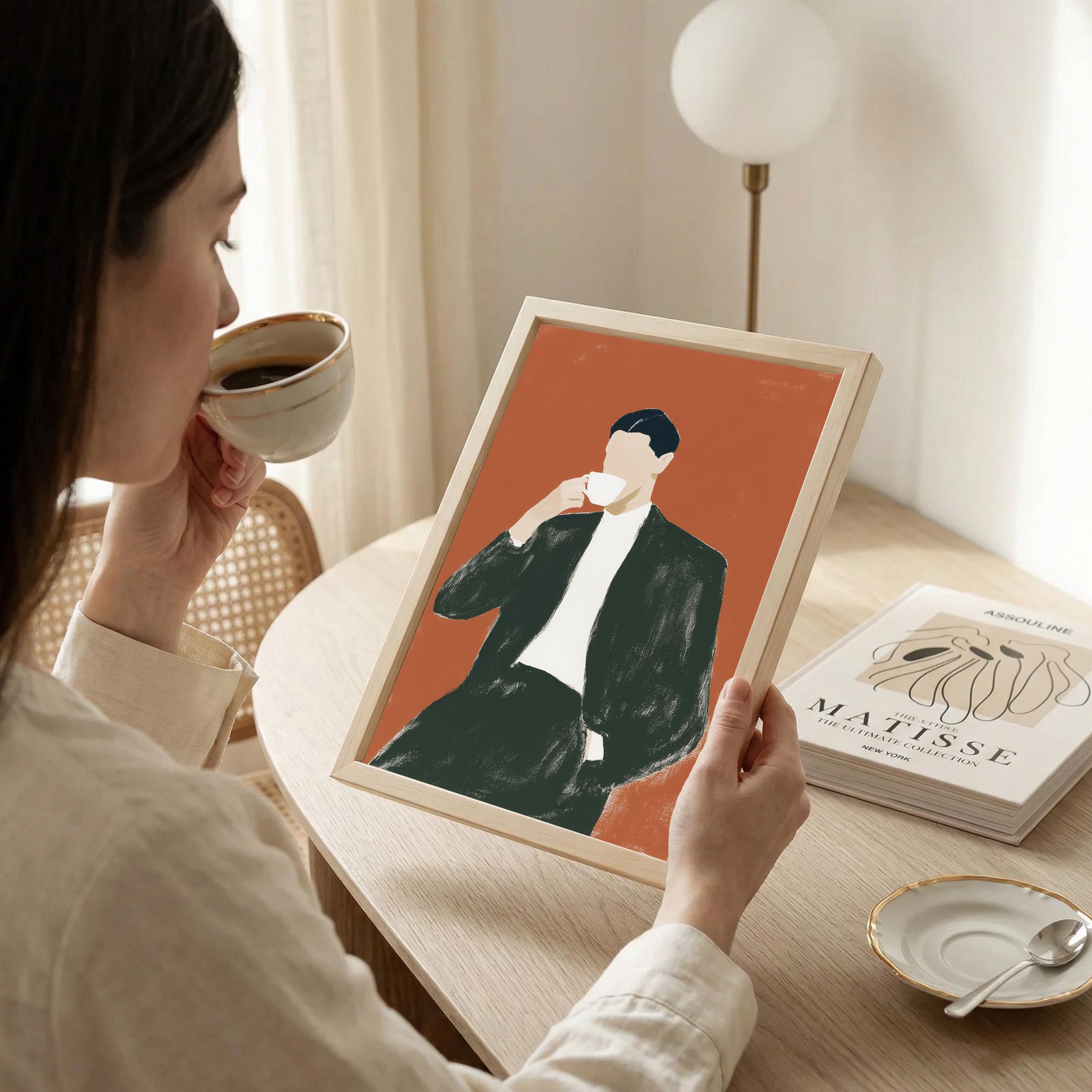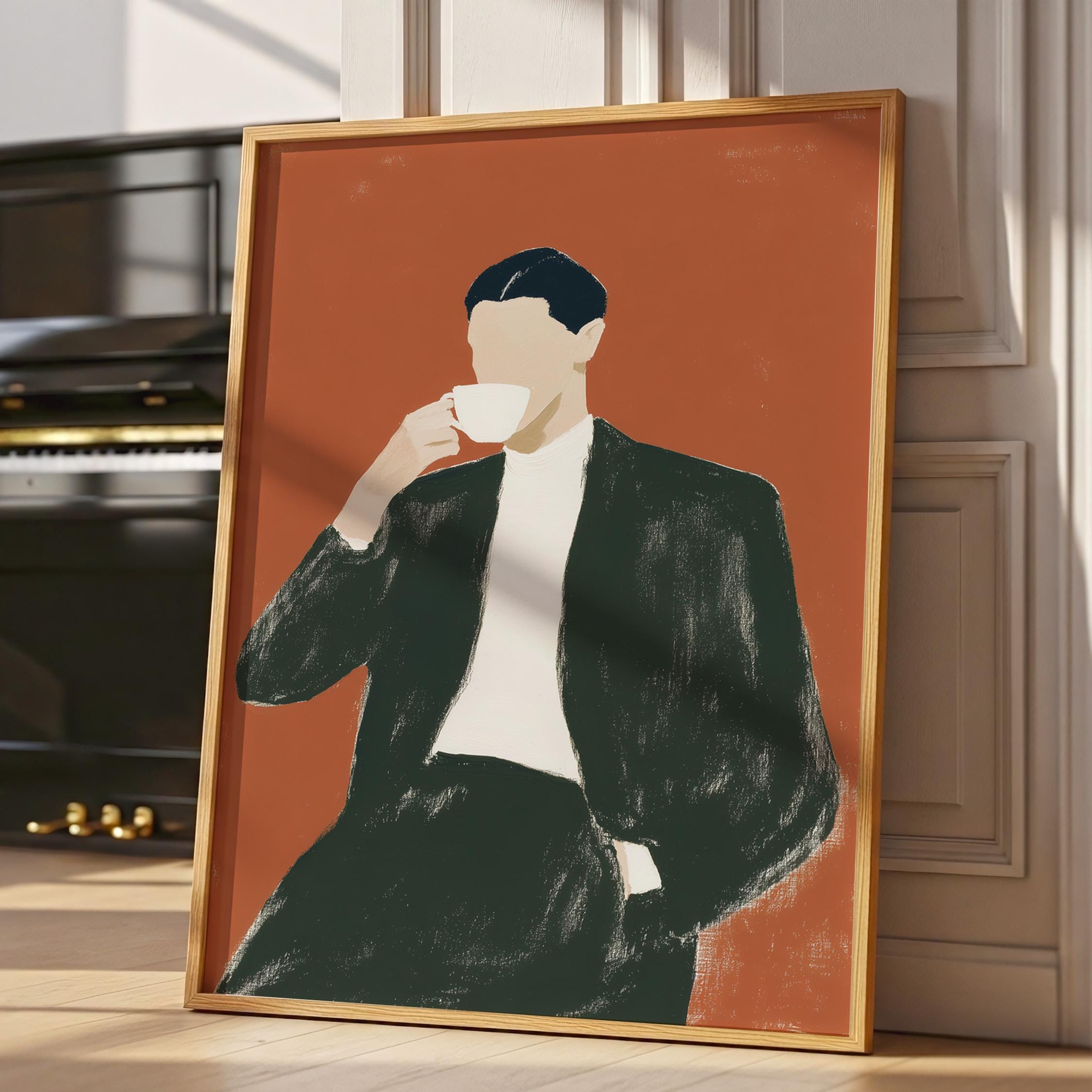 Elevate your space with this Gentleman Drinking Coffee Wall Art Print featuring a sophisticated mid-century modern portrait against a warm terracotta background. Perfect for coffee lovers and anyone seeking vintage-inspired decor for kitchens, dining rooms, coffee bars, or home offices.
