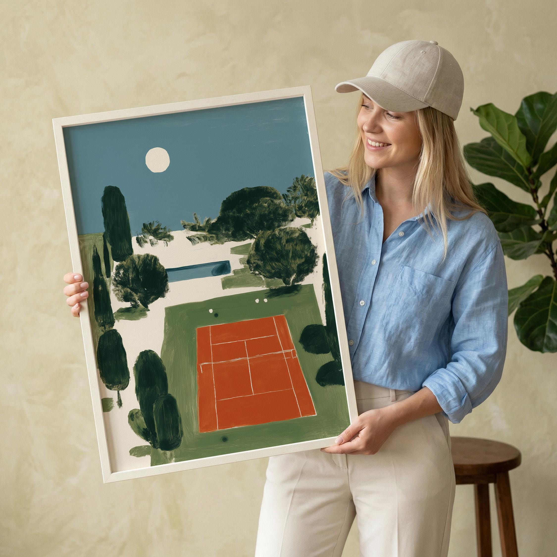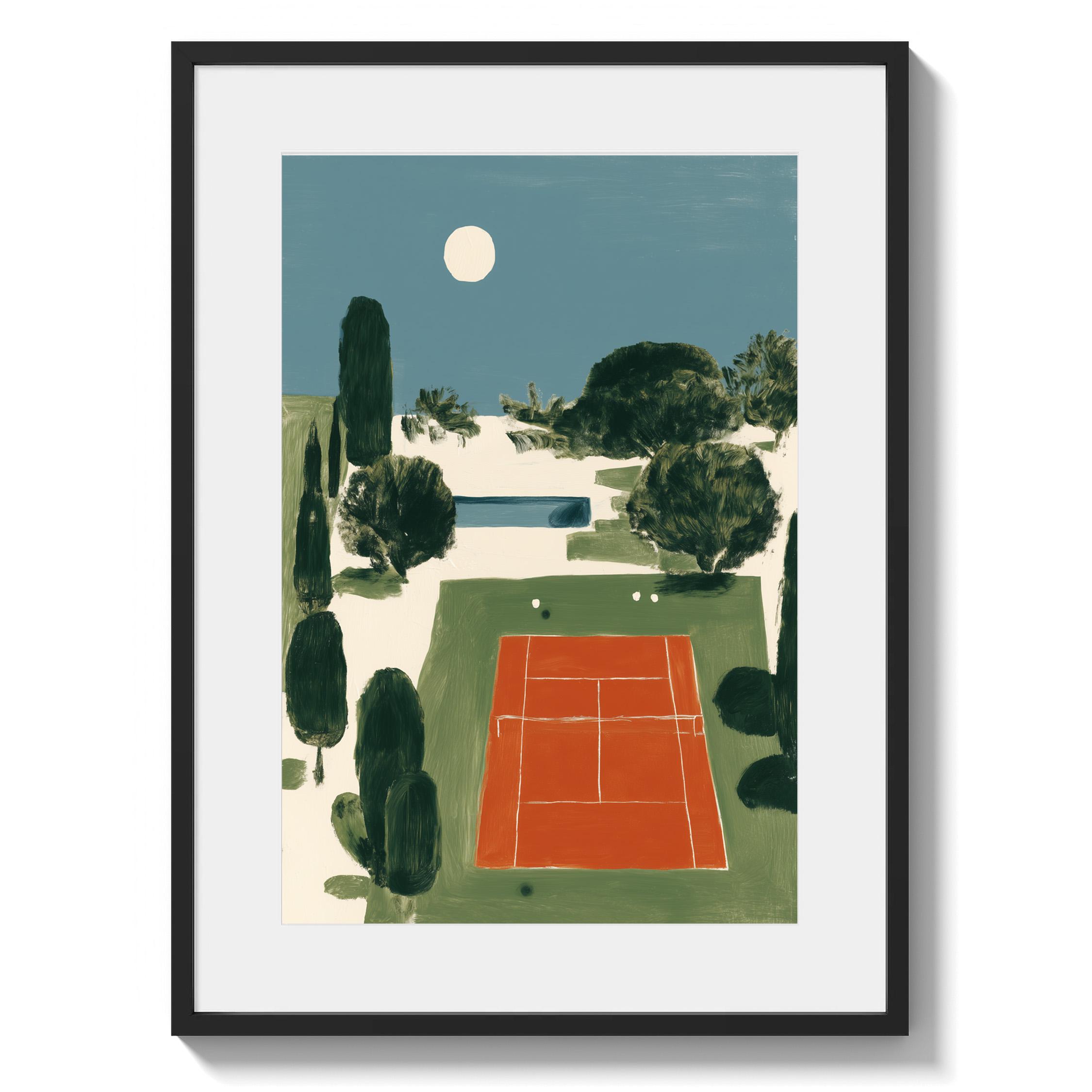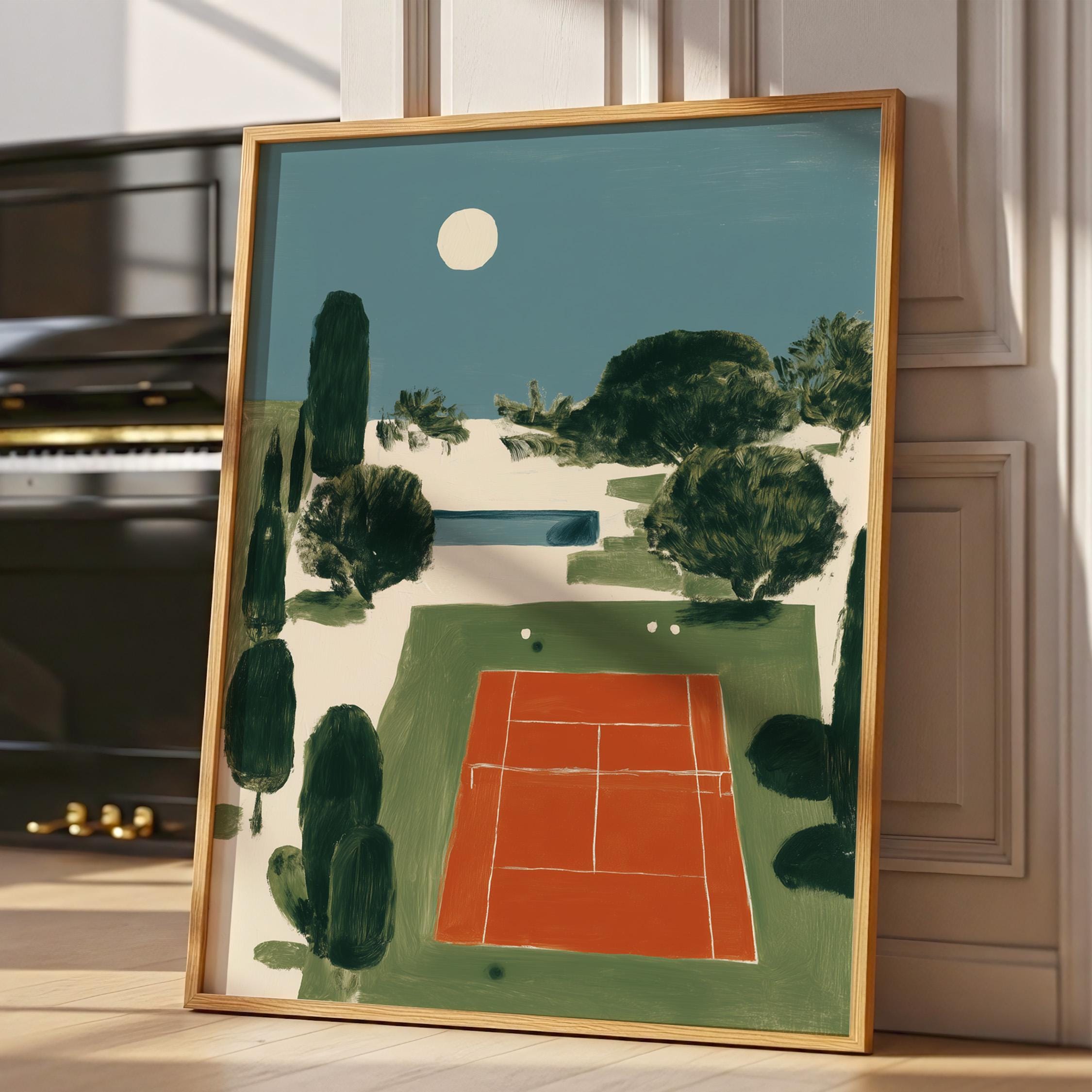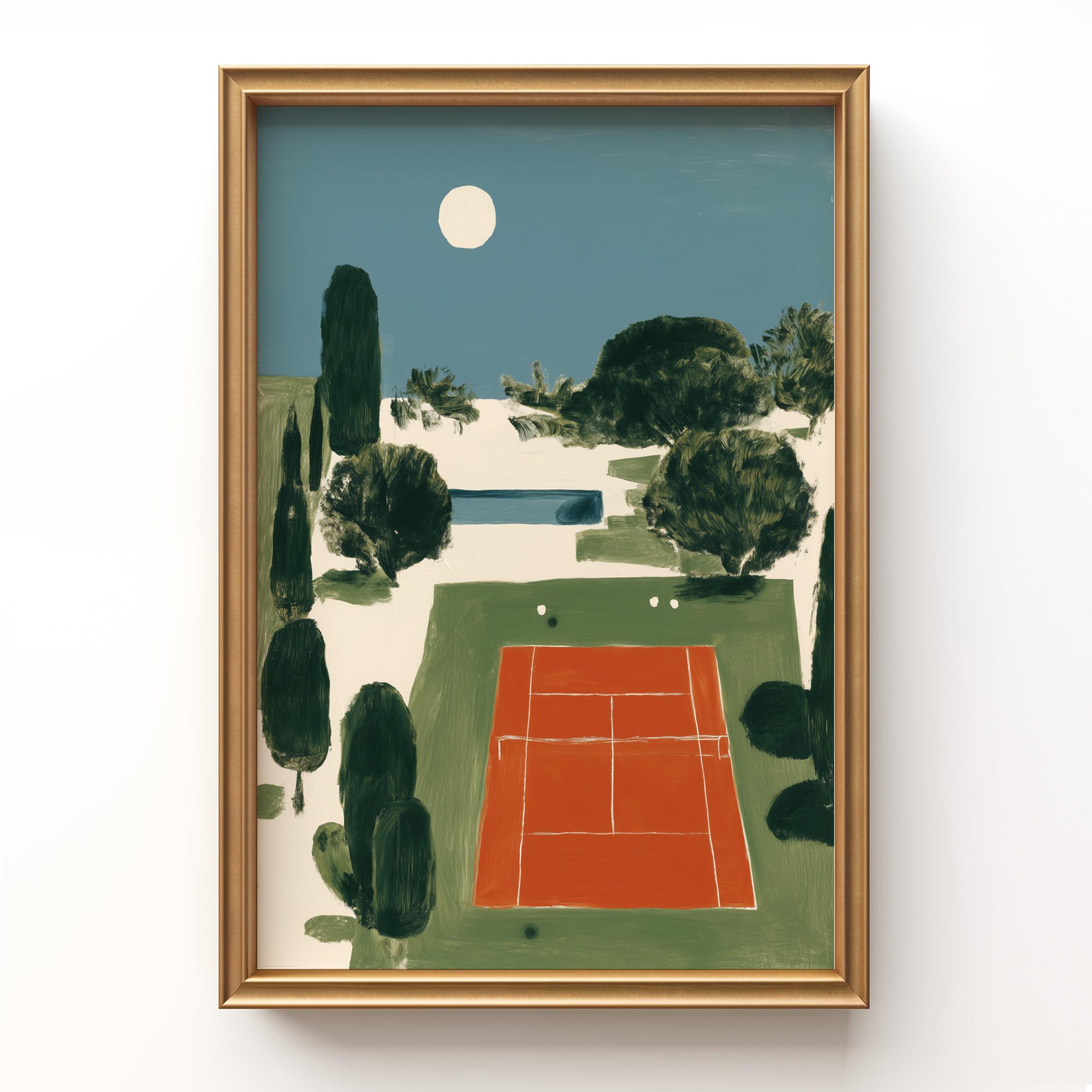 Mediterranean Tennis Court Wall Art Print captures a serene clay court nestled among cypress trees under a peaceful moon, painted in rich terracotta and dusty blue tones. Perfect for tennis enthusiasts, sports lovers, and those drawn to European coastal elegance - ideal for living rooms, home offices, or entryways.