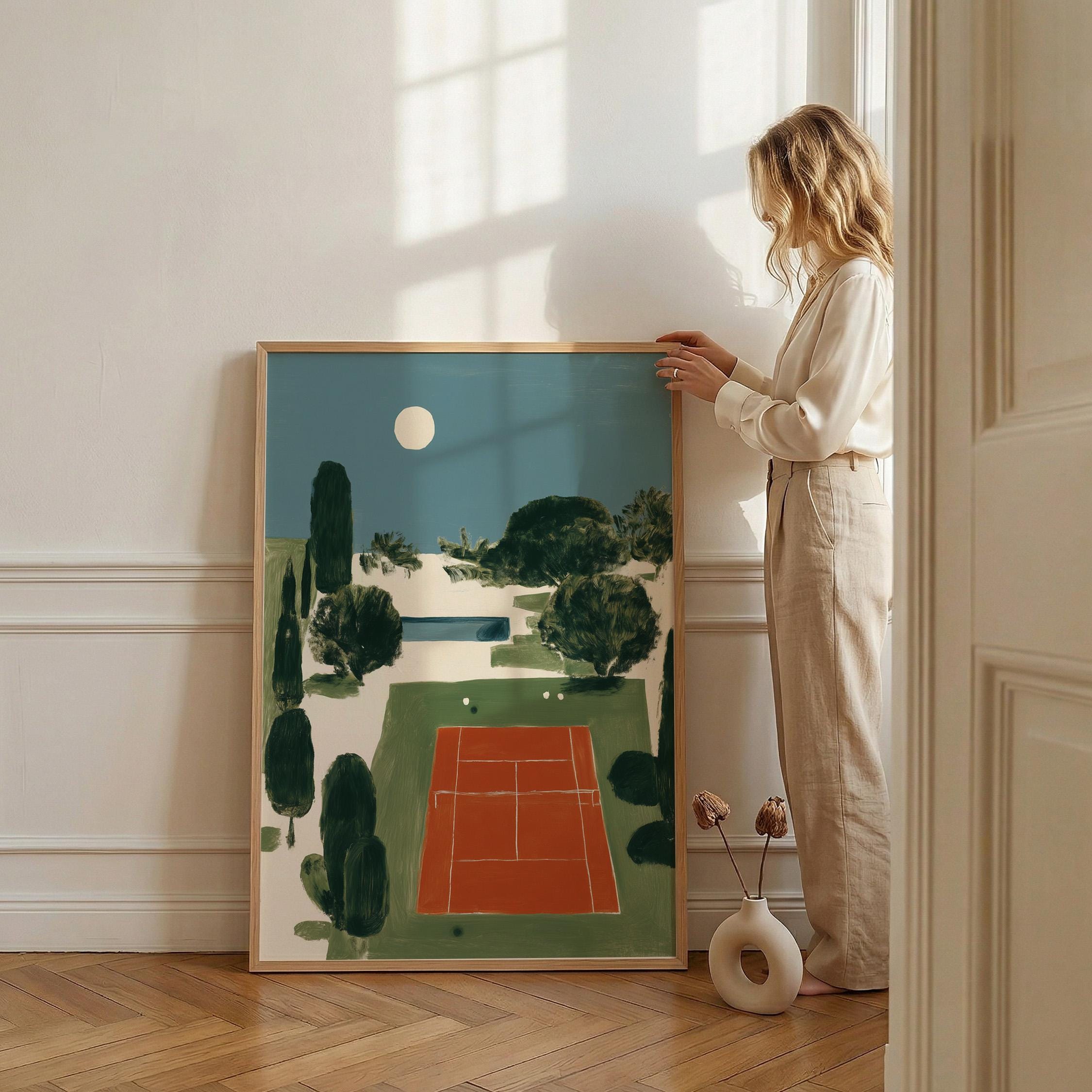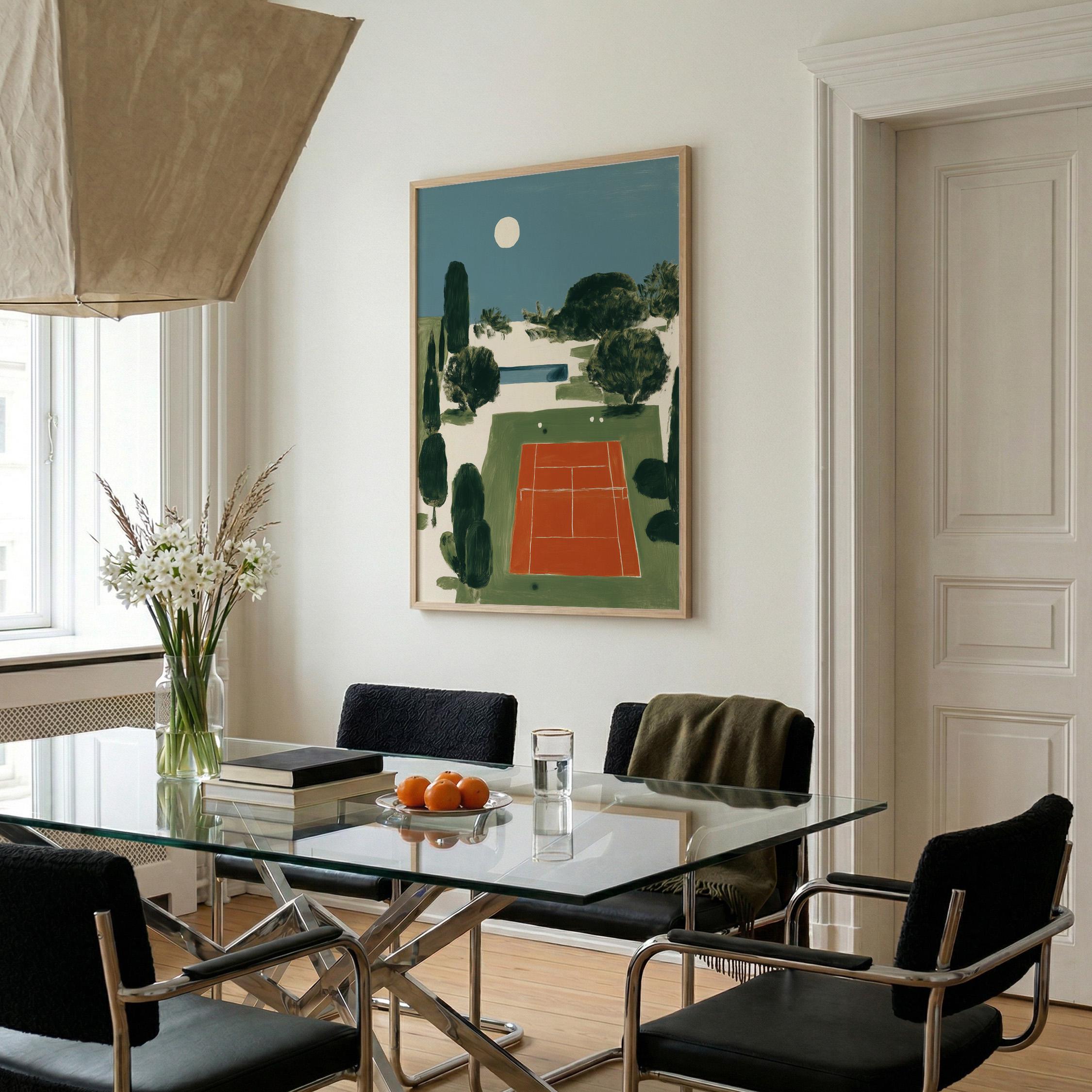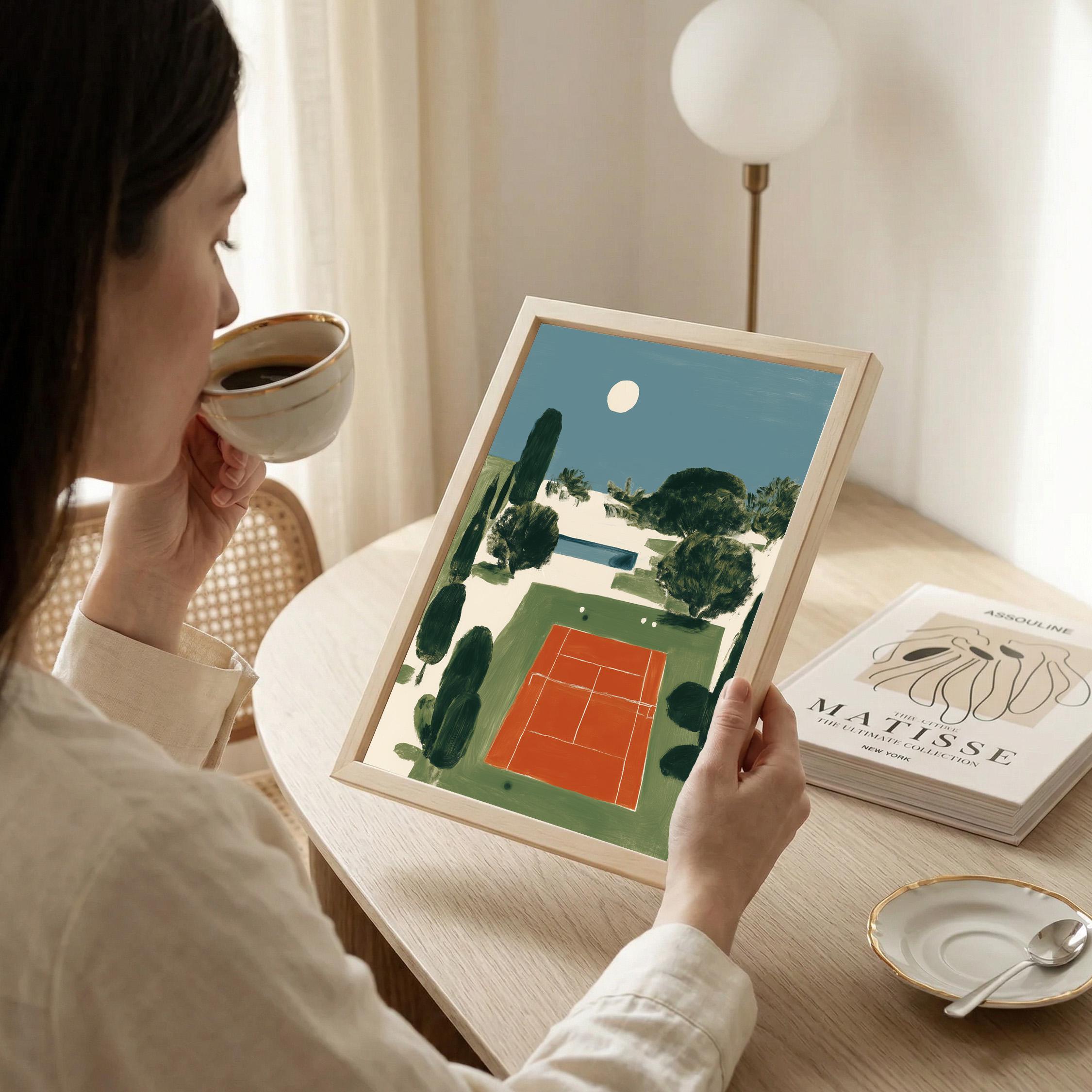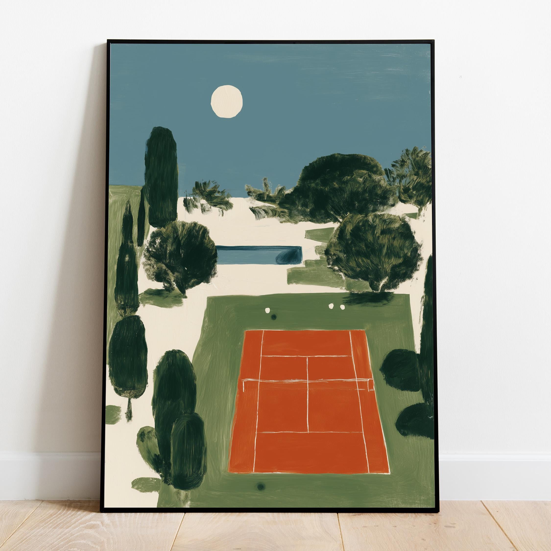 Mediterranean Tennis Court Wall Art Print captures a serene clay court nestled among cypress trees under a peaceful moon, painted in rich terracotta and dusty blue tones. Perfect for tennis enthusiasts, sports lovers, and those drawn to European coastal elegance - ideal for living rooms, home offices, or entryways.