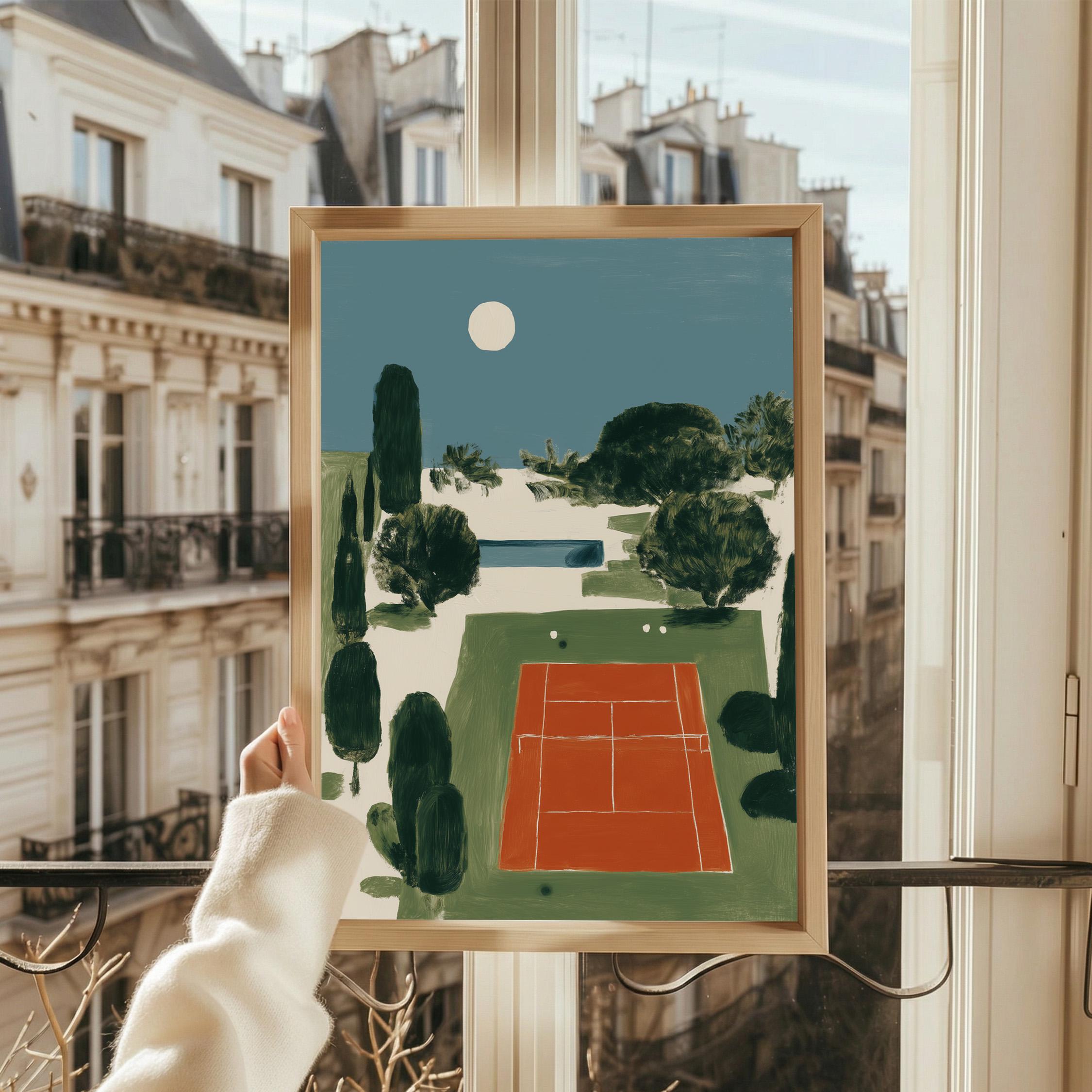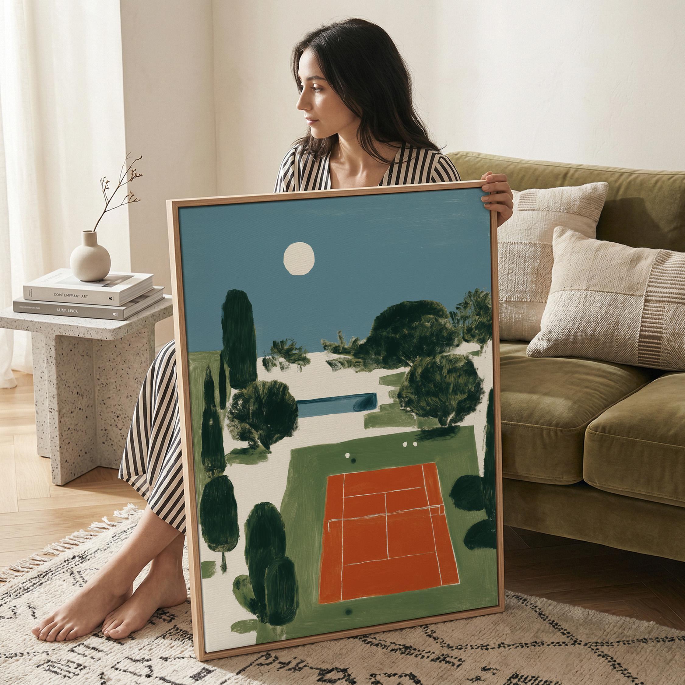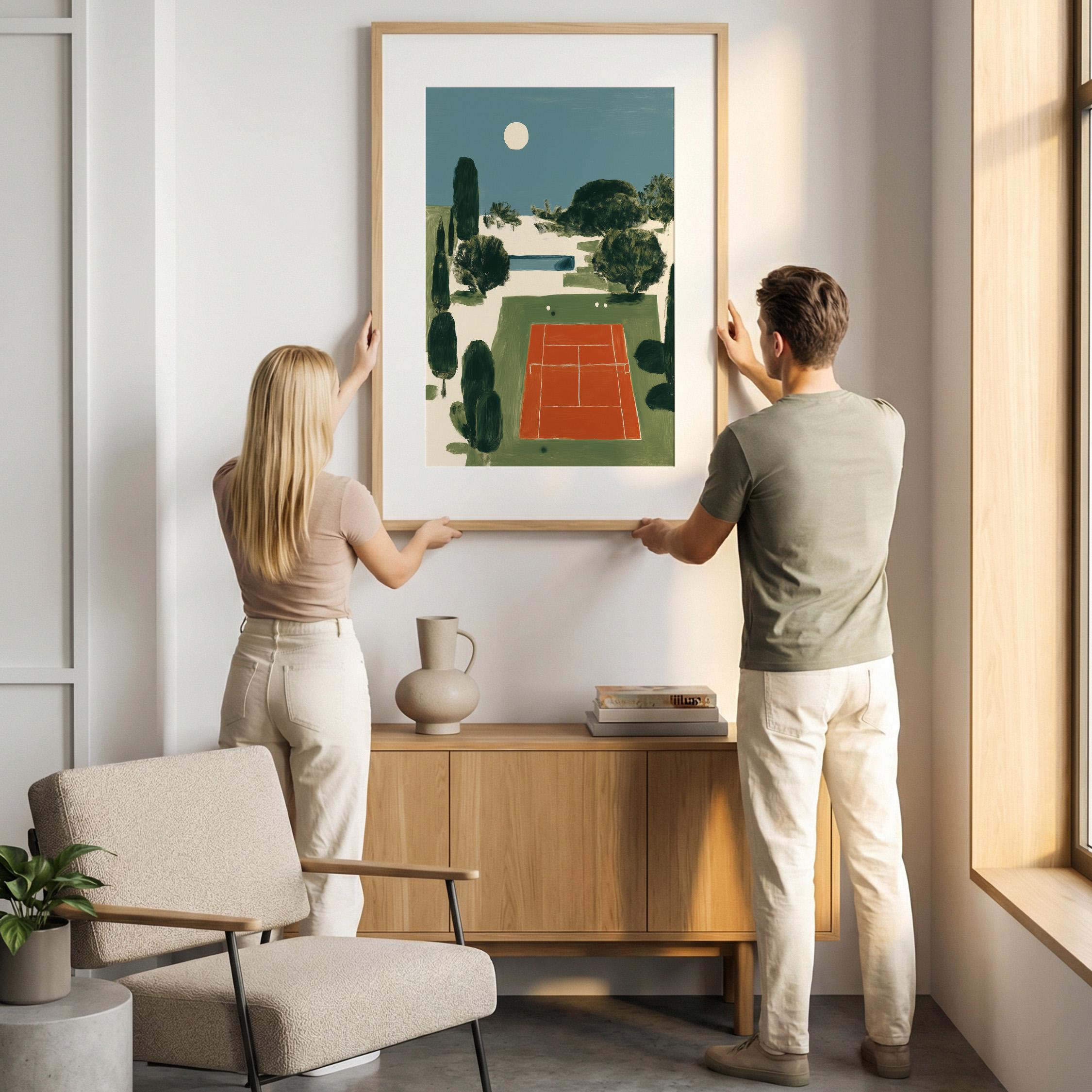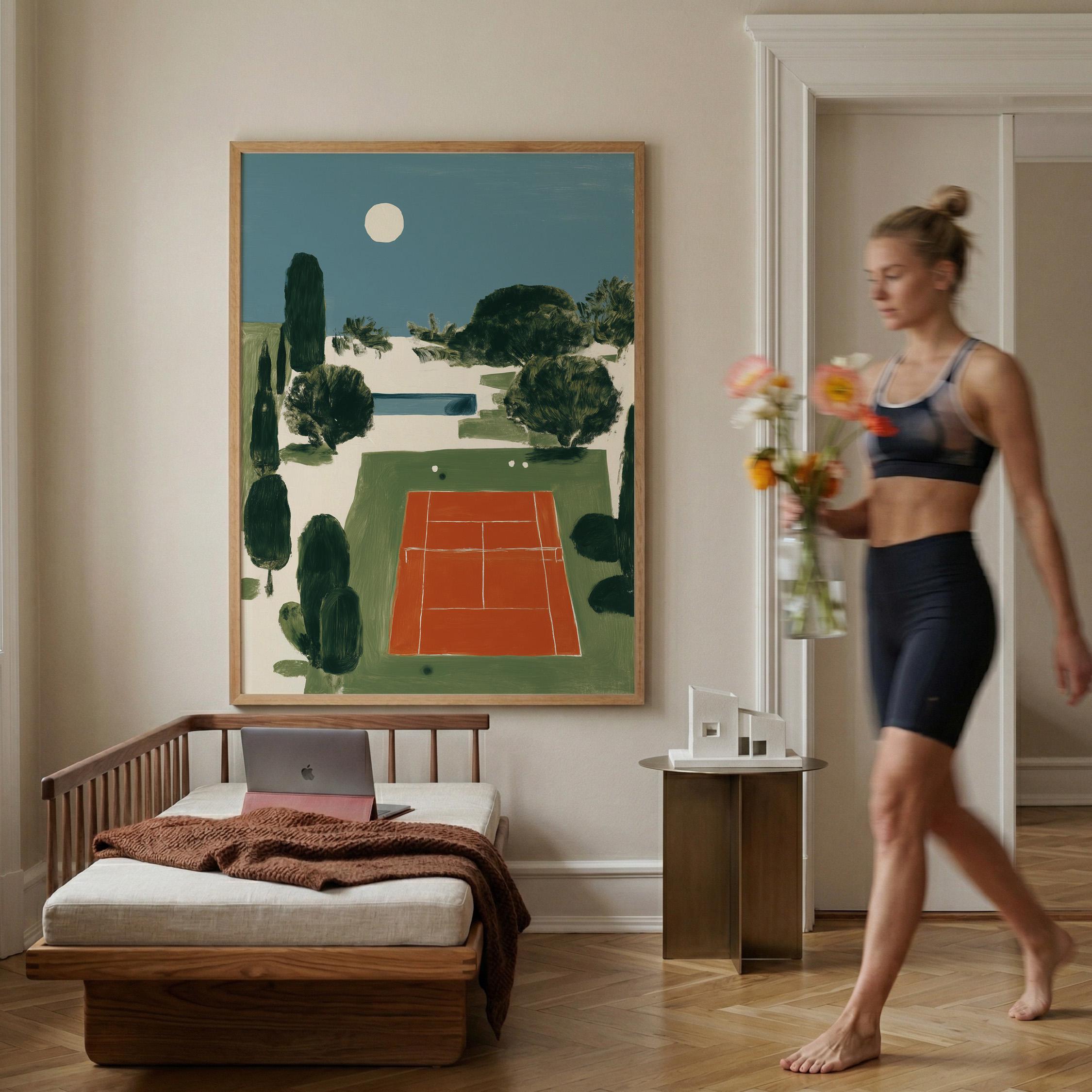 Mediterranean Tennis Court Wall Art Print captures a serene clay court nestled among cypress trees under a peaceful moon, painted in rich terracotta and dusty blue tones. Perfect for tennis enthusiasts, sports lovers, and those drawn to European coastal elegance - ideal for living rooms, home offices, or entryways.