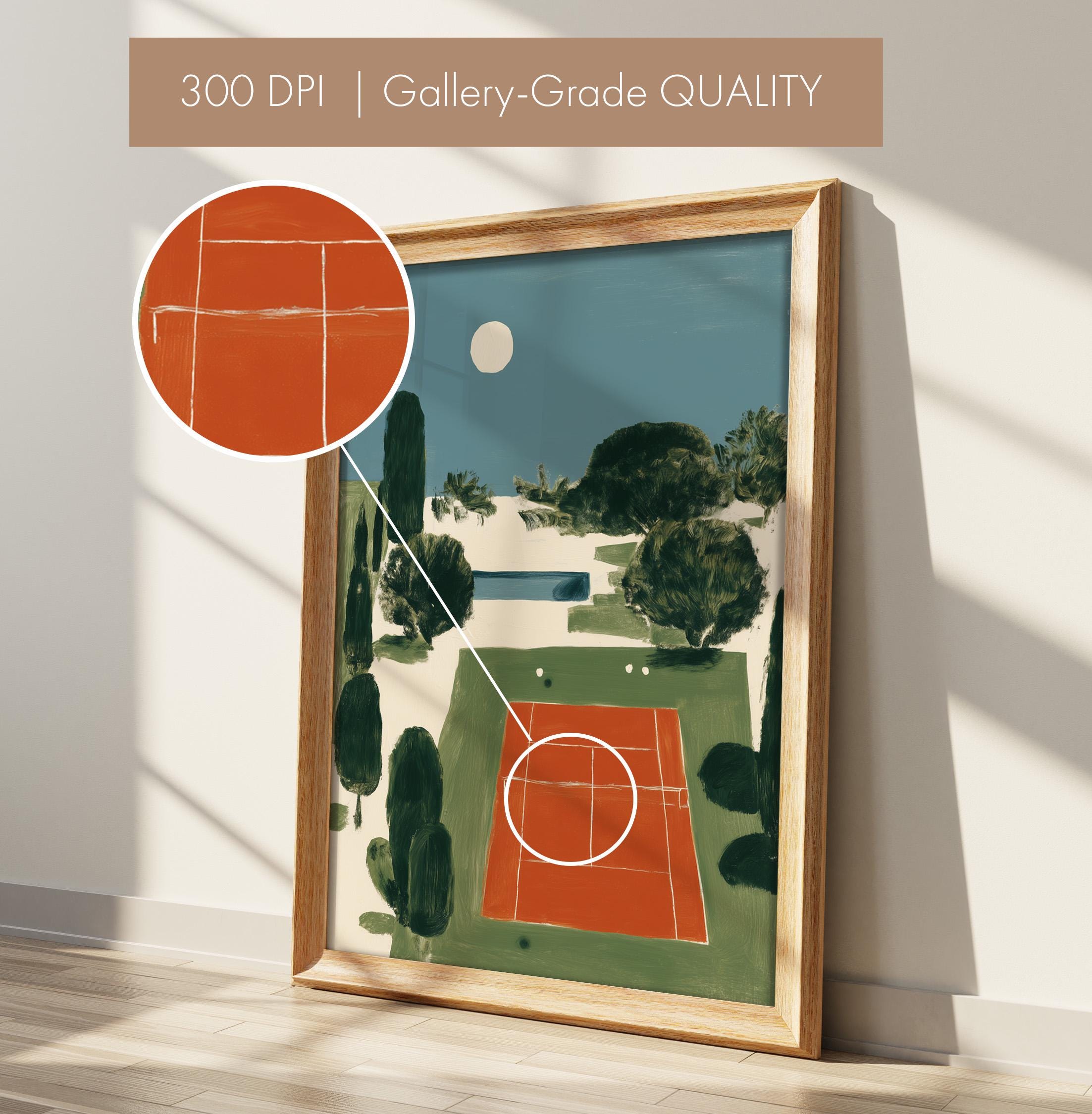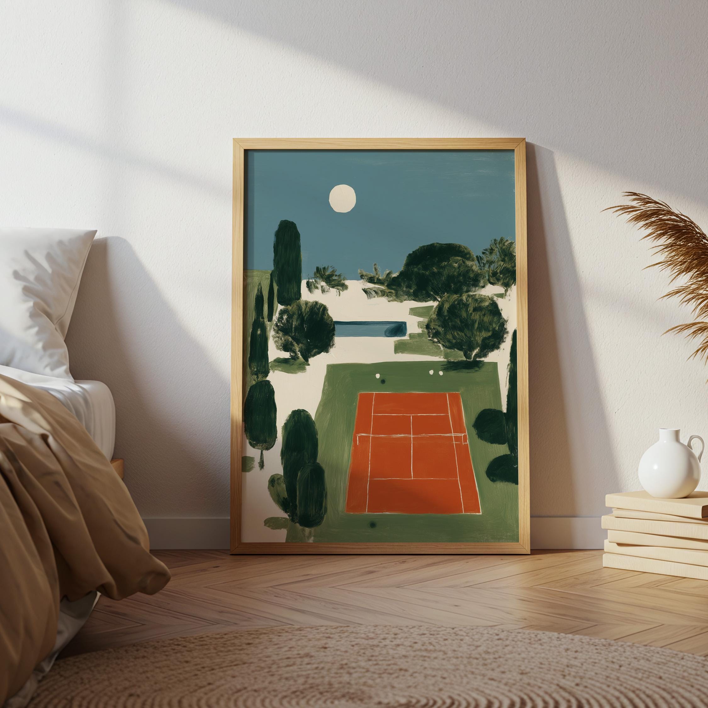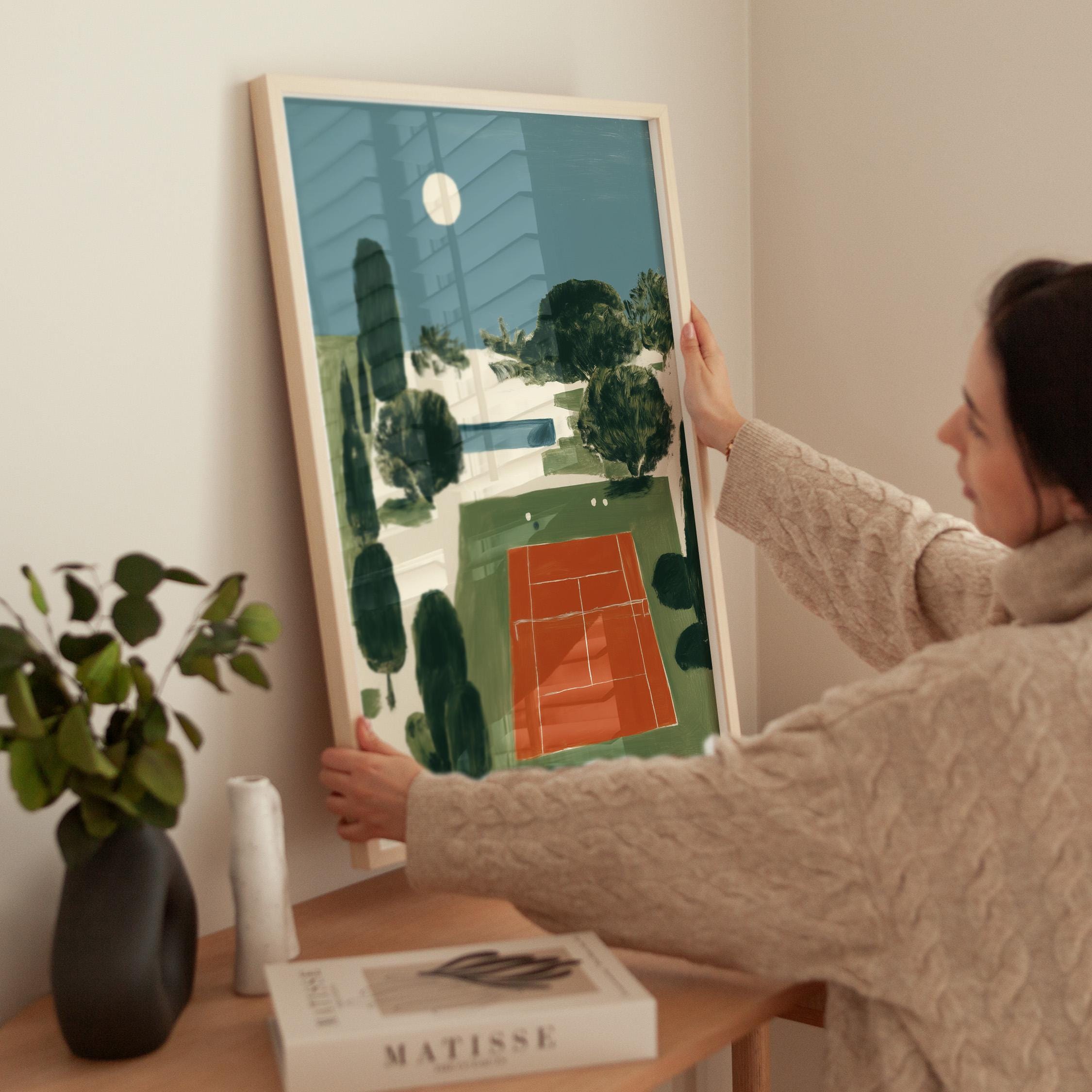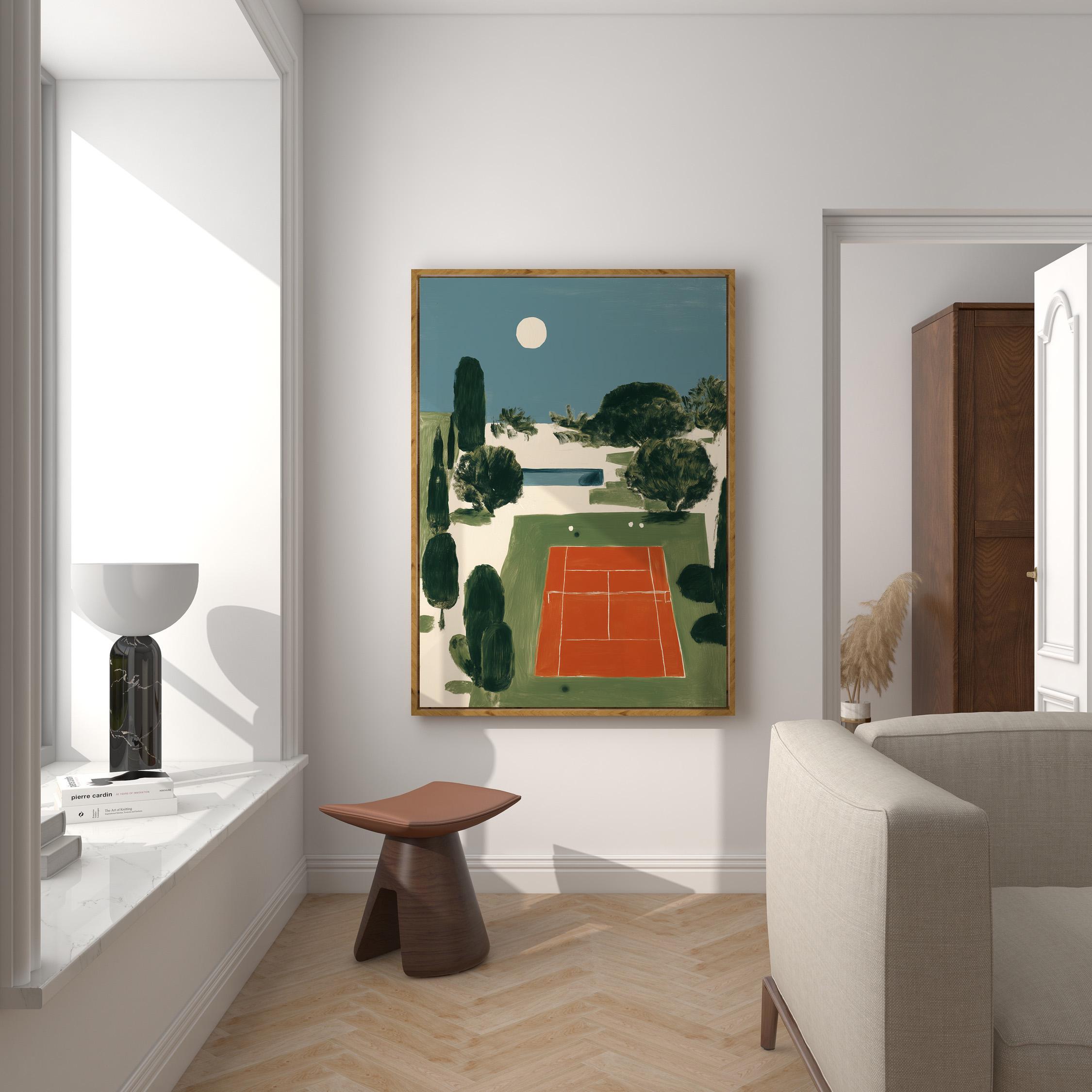 Mediterranean Tennis Court Wall Art Print captures a serene clay court nestled among cypress trees under a peaceful moon, painted in rich terracotta and dusty blue tones. Perfect for tennis enthusiasts, sports lovers, and those drawn to European coastal elegance - ideal for living rooms, home offices, or entryways.
