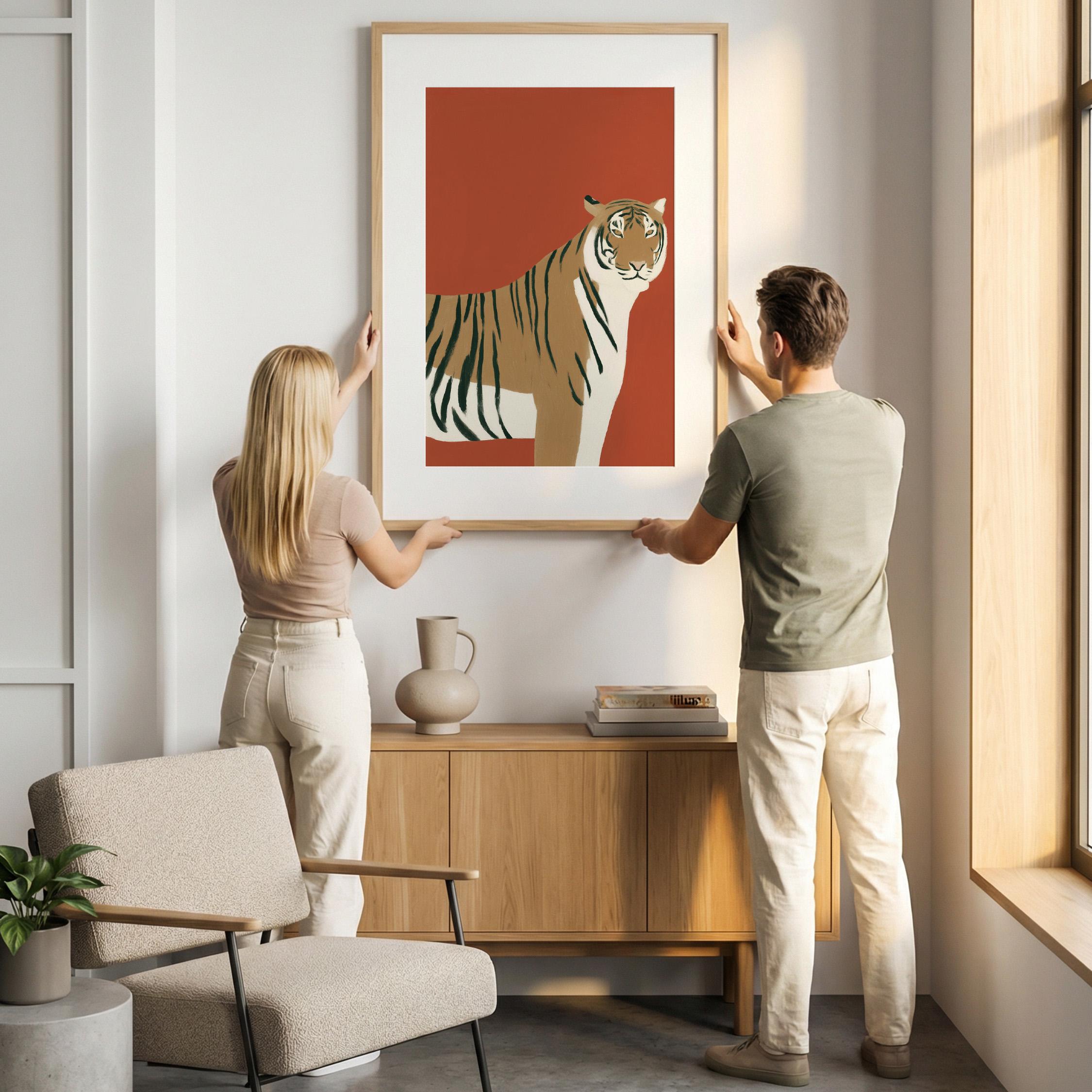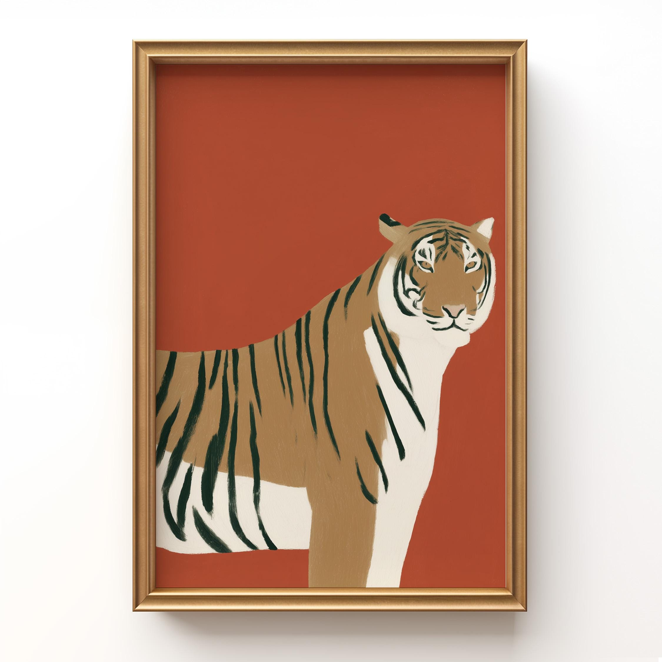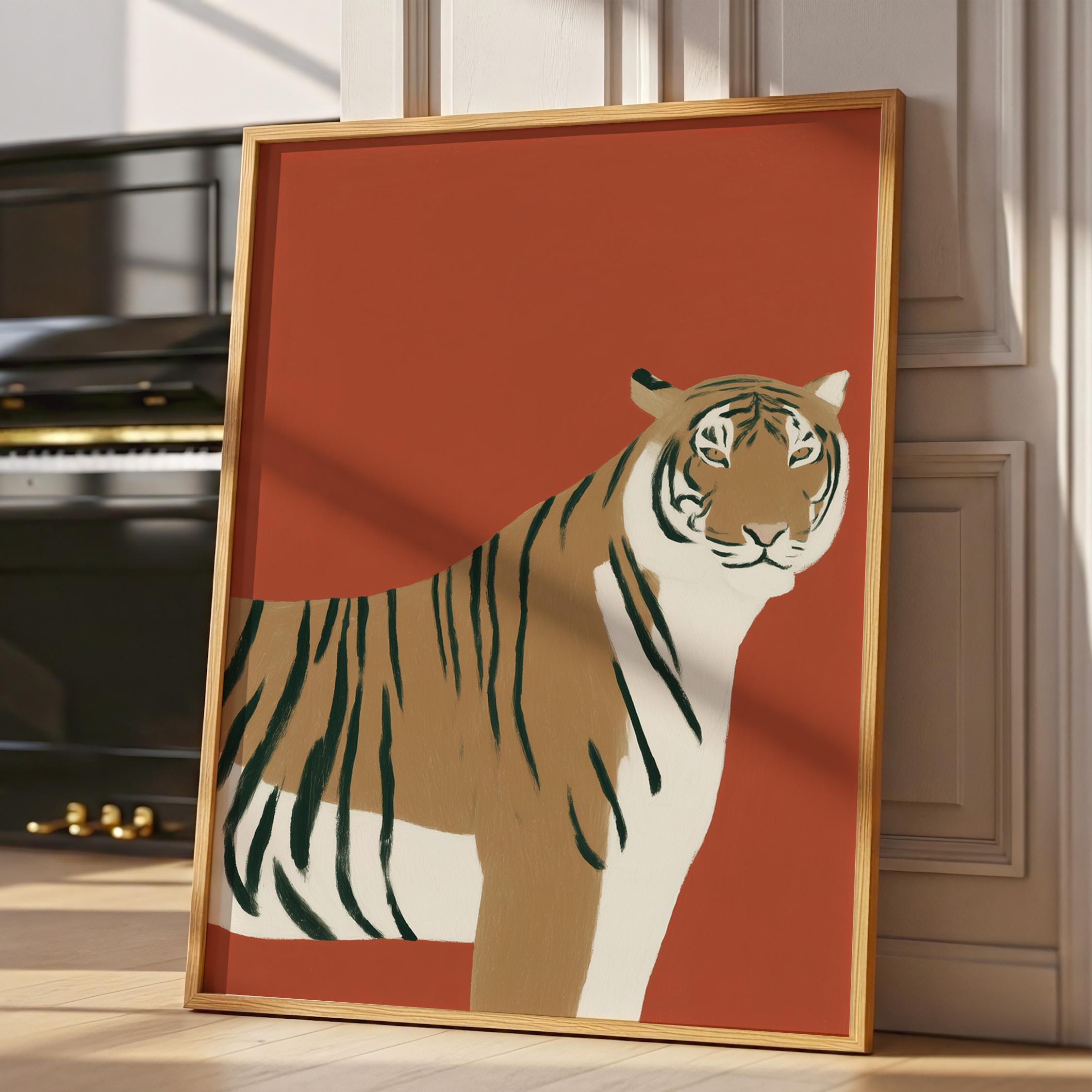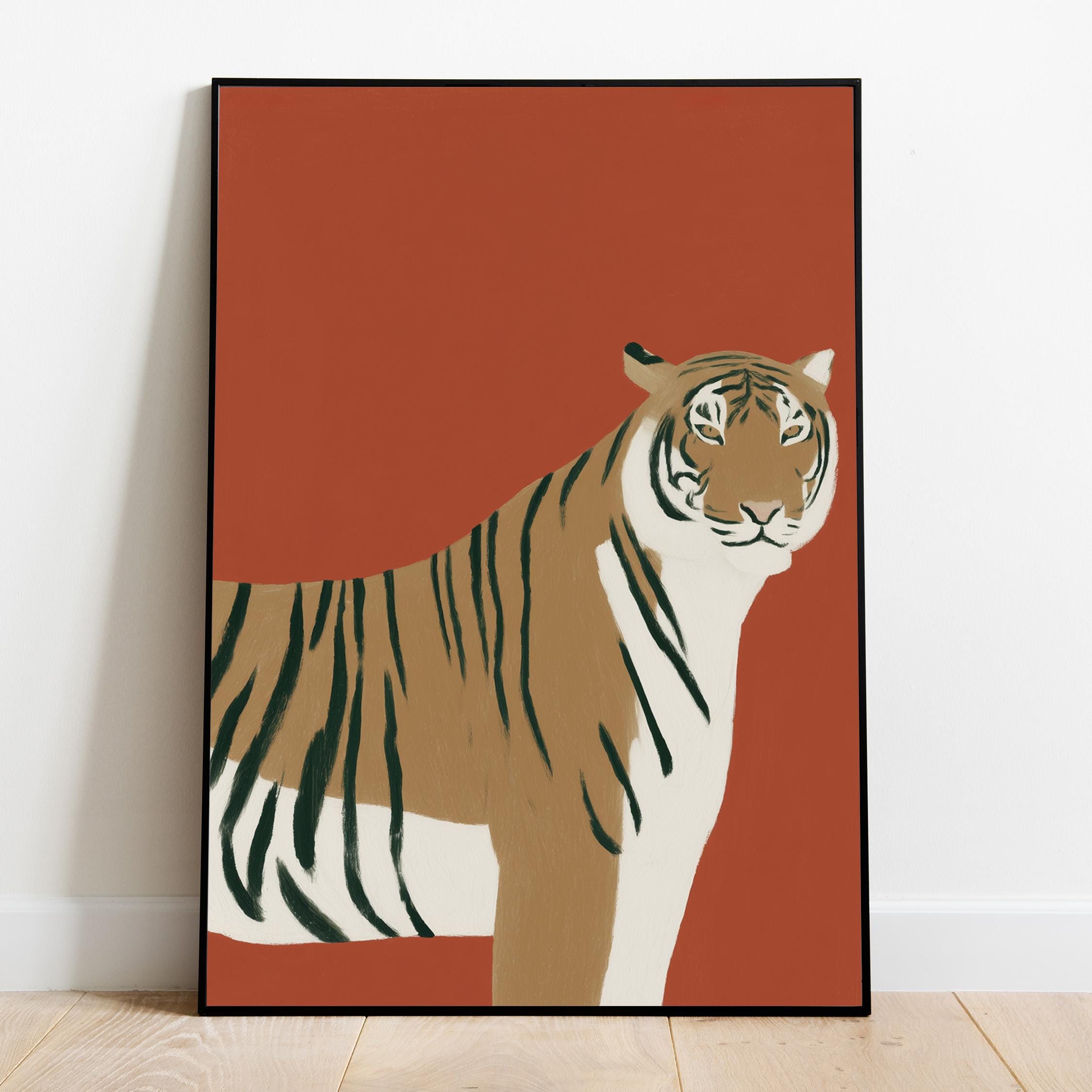 Striking tiger wall art print brings bold safari elegance with a modern minimalist twist on a warm burnt orange backdrop. Perfect for living rooms, bedrooms, nurseries or office spaces seeking sophisticated animal-inspired style