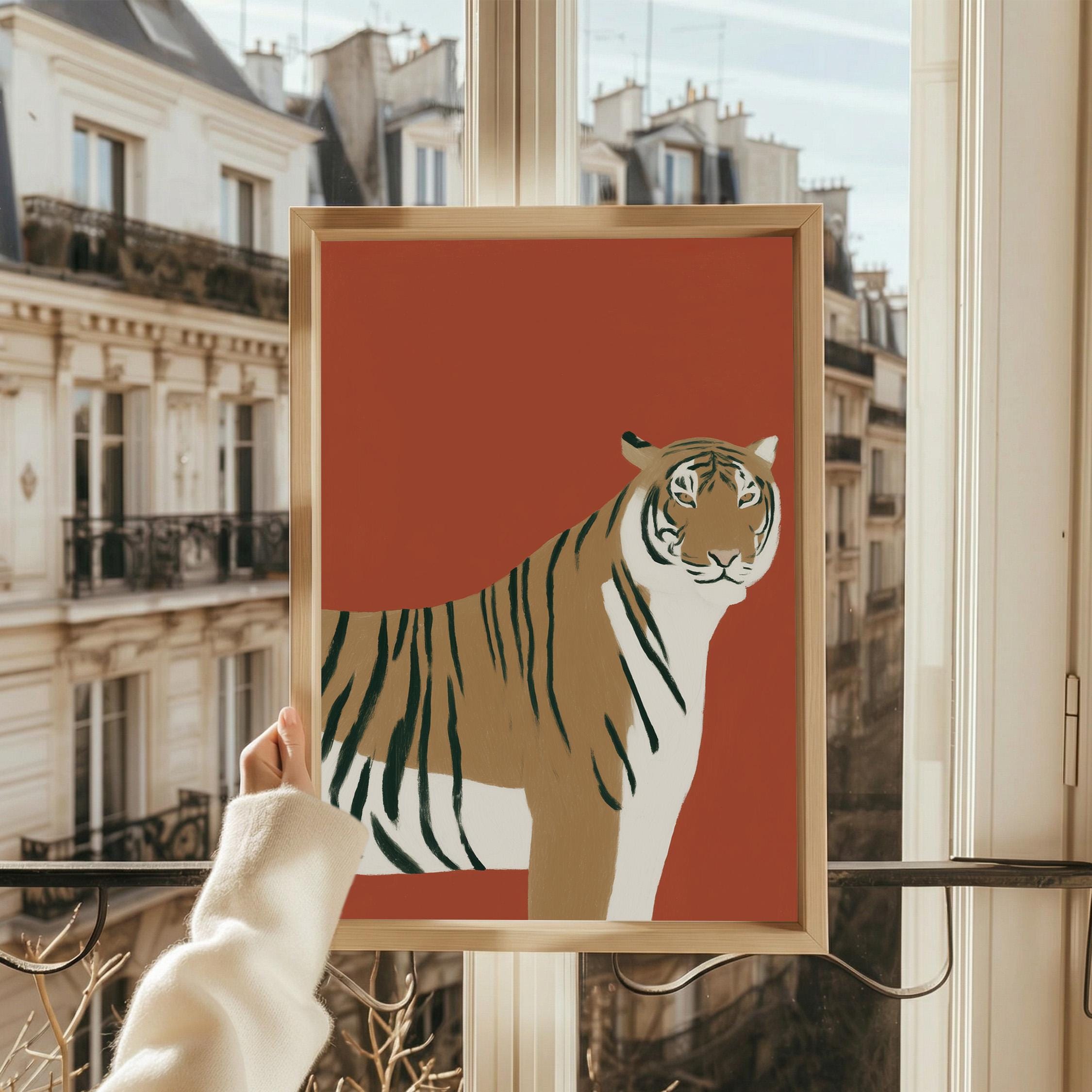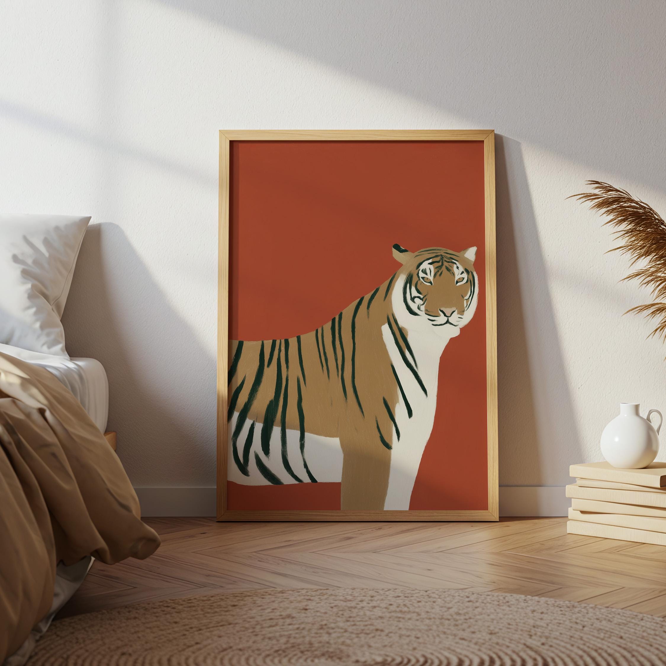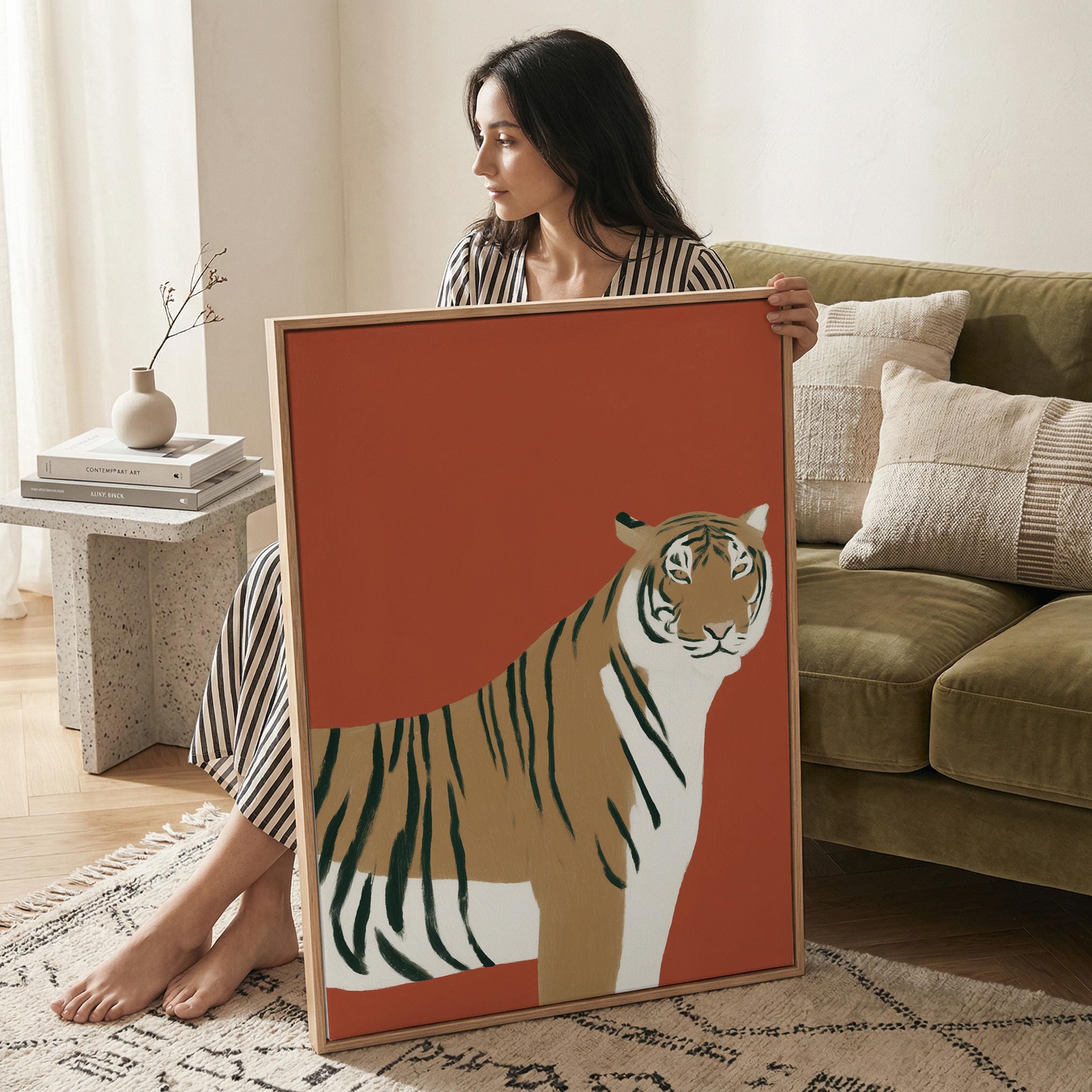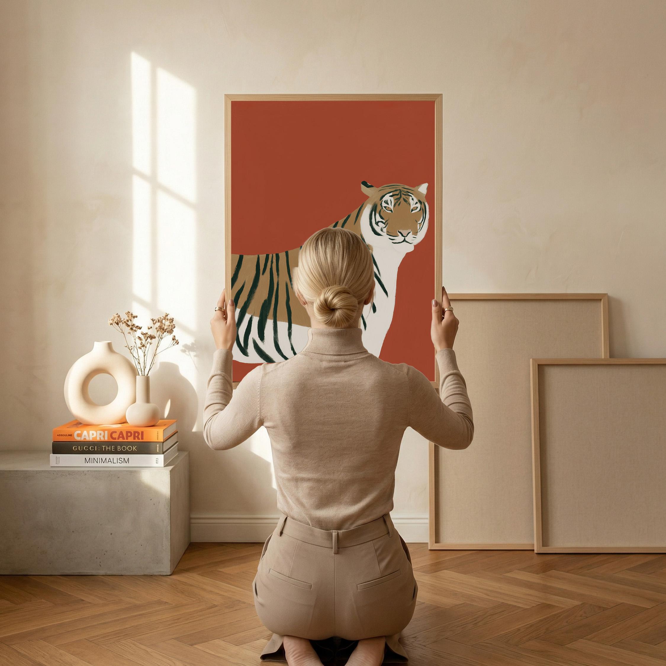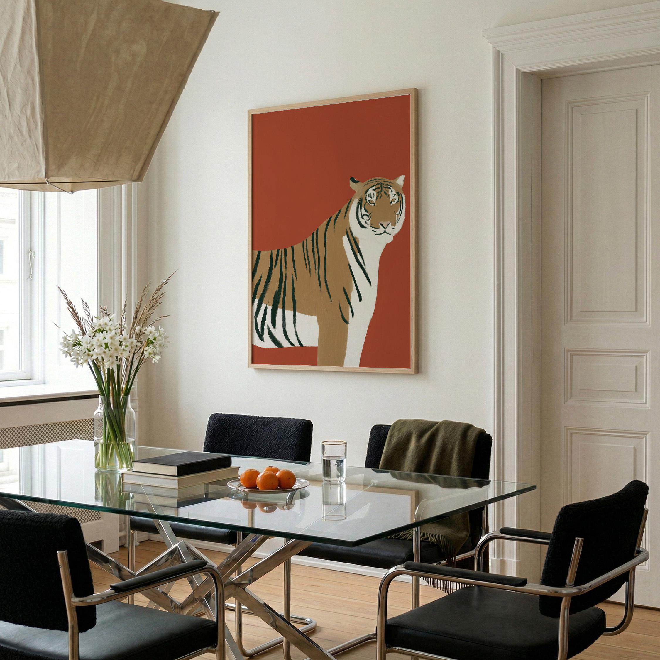 Striking tiger wall art print brings bold safari elegance with a modern minimalist twist on a warm burnt orange backdrop. Perfect for living rooms, bedrooms, nurseries or office spaces seeking sophisticated animal-inspired style
