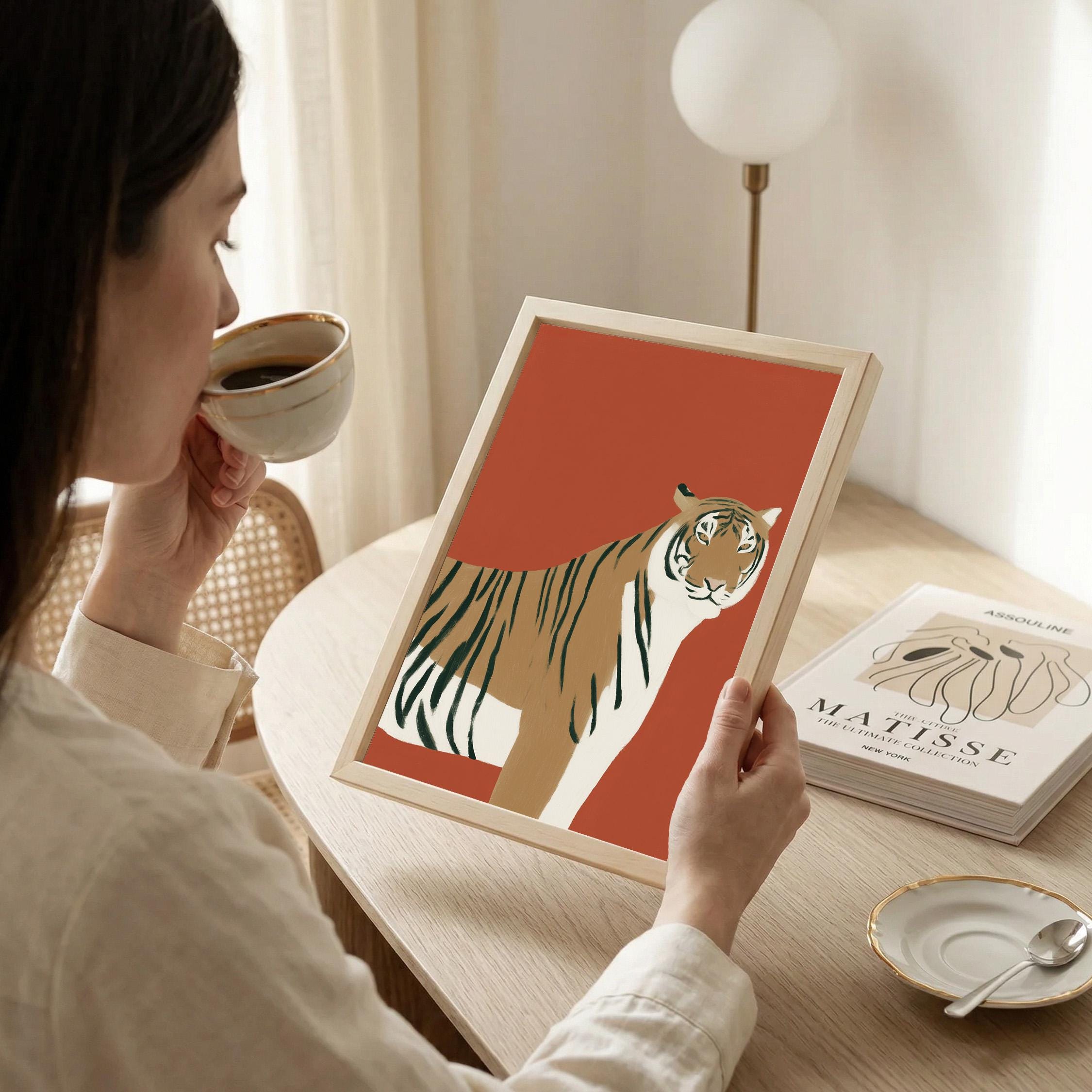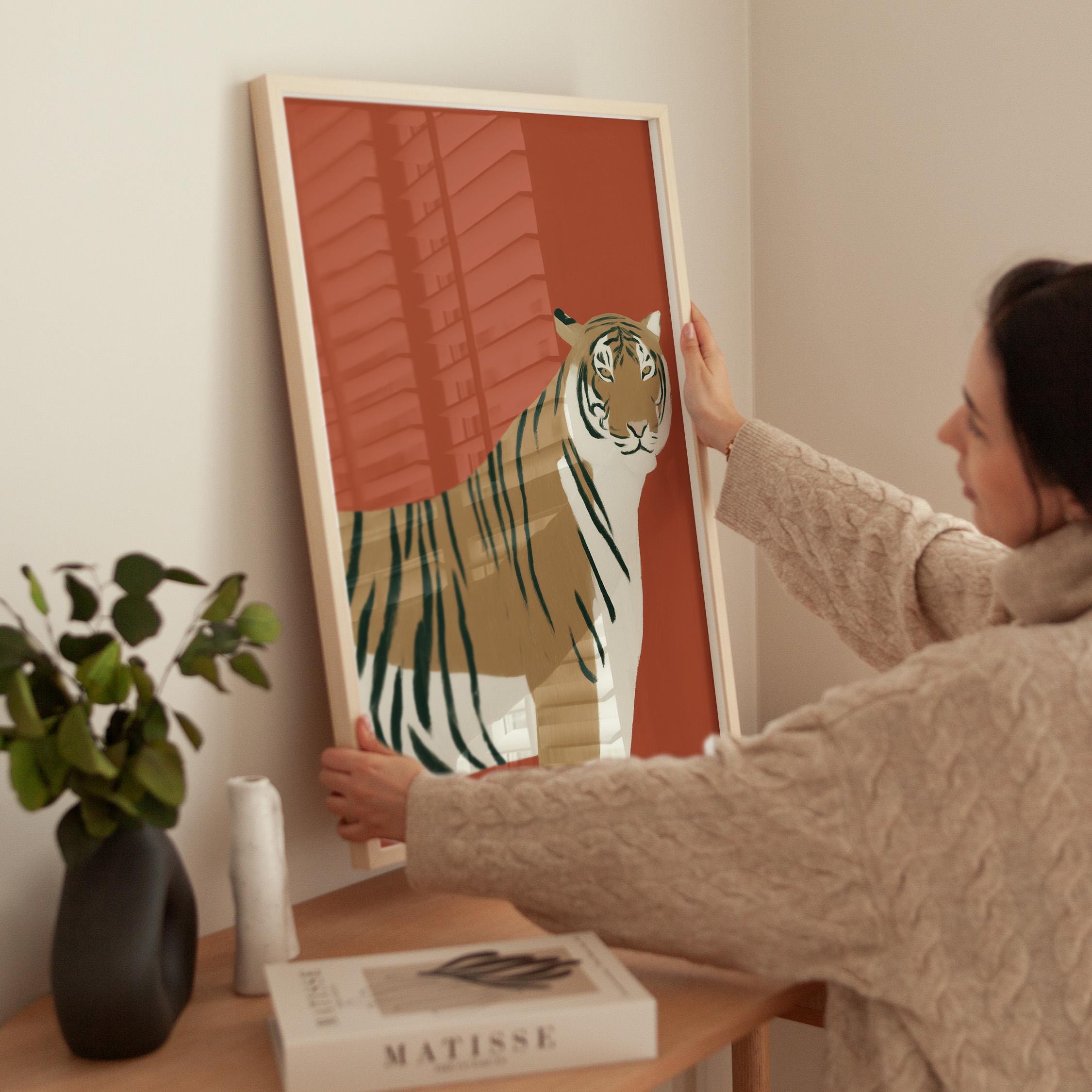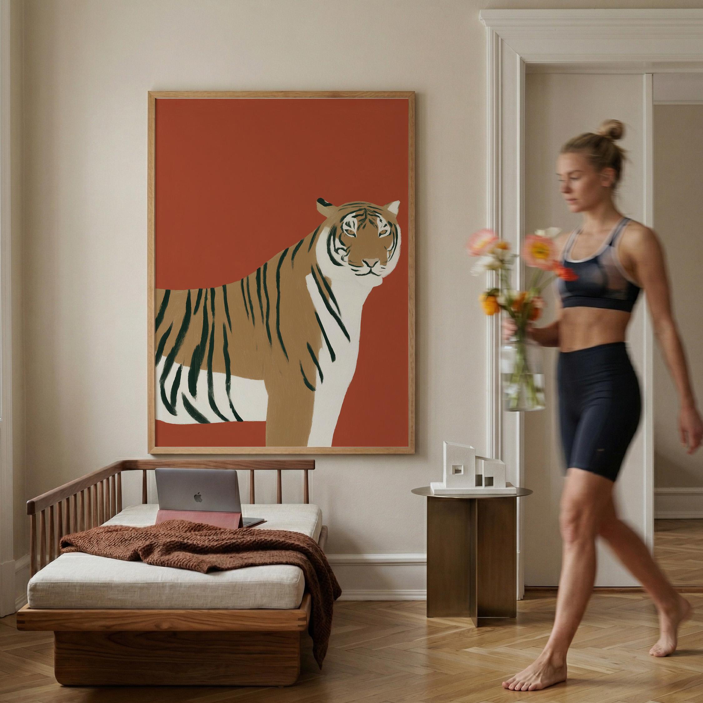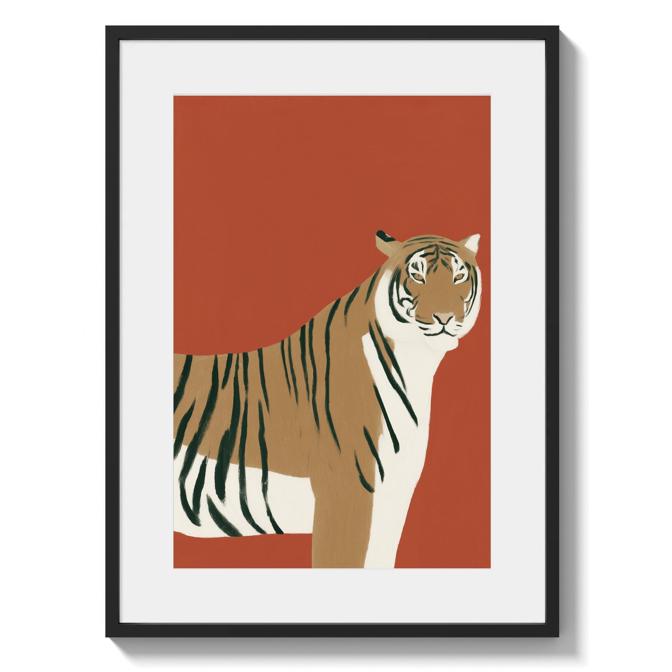 Striking tiger wall art print brings bold safari elegance with a modern minimalist twist on a warm burnt orange backdrop. Perfect for living rooms, bedrooms, nurseries or office spaces seeking sophisticated animal-inspired style