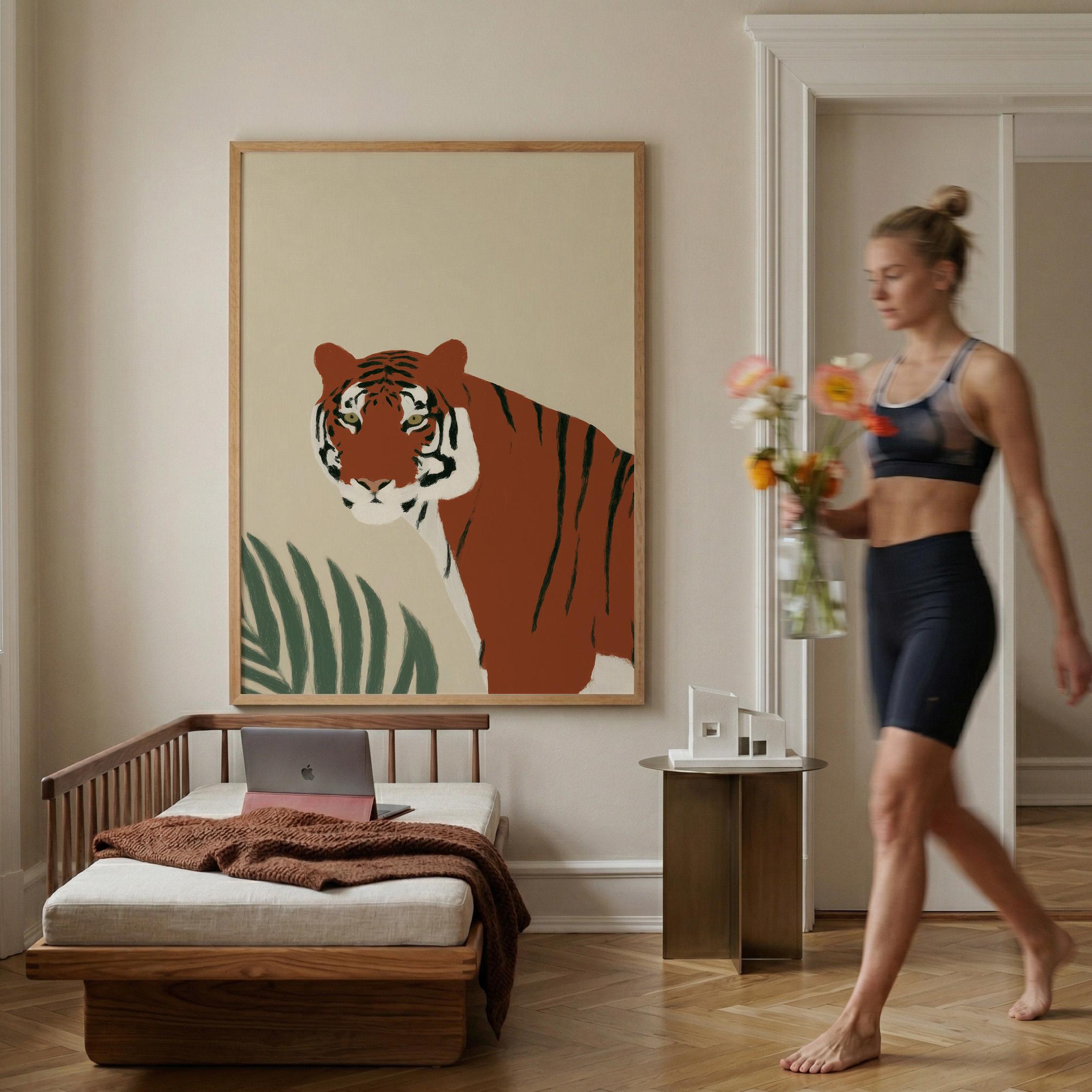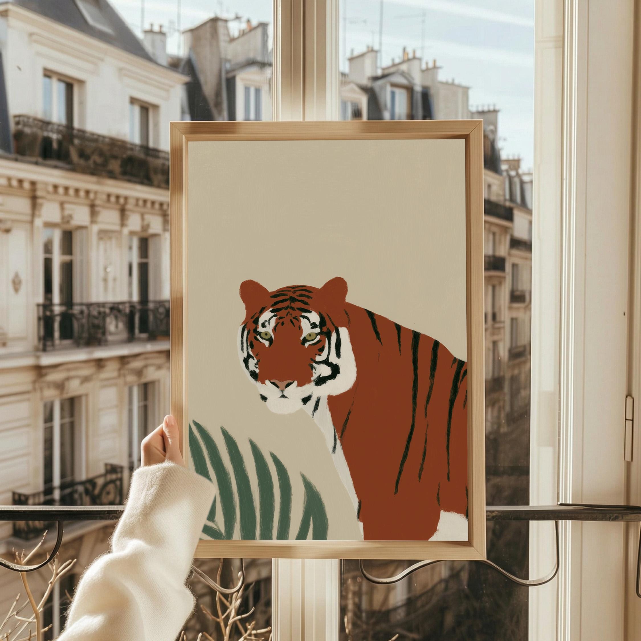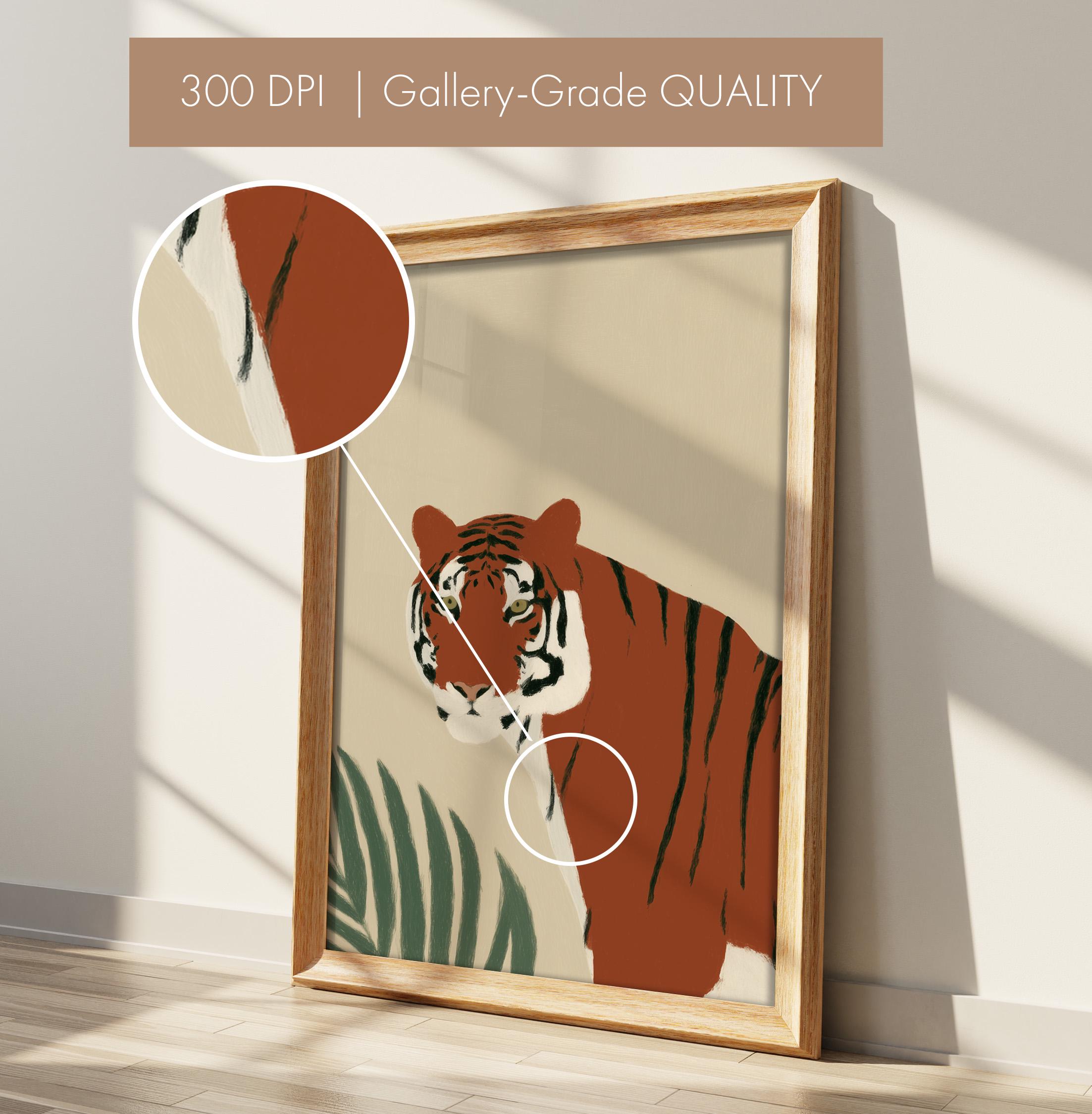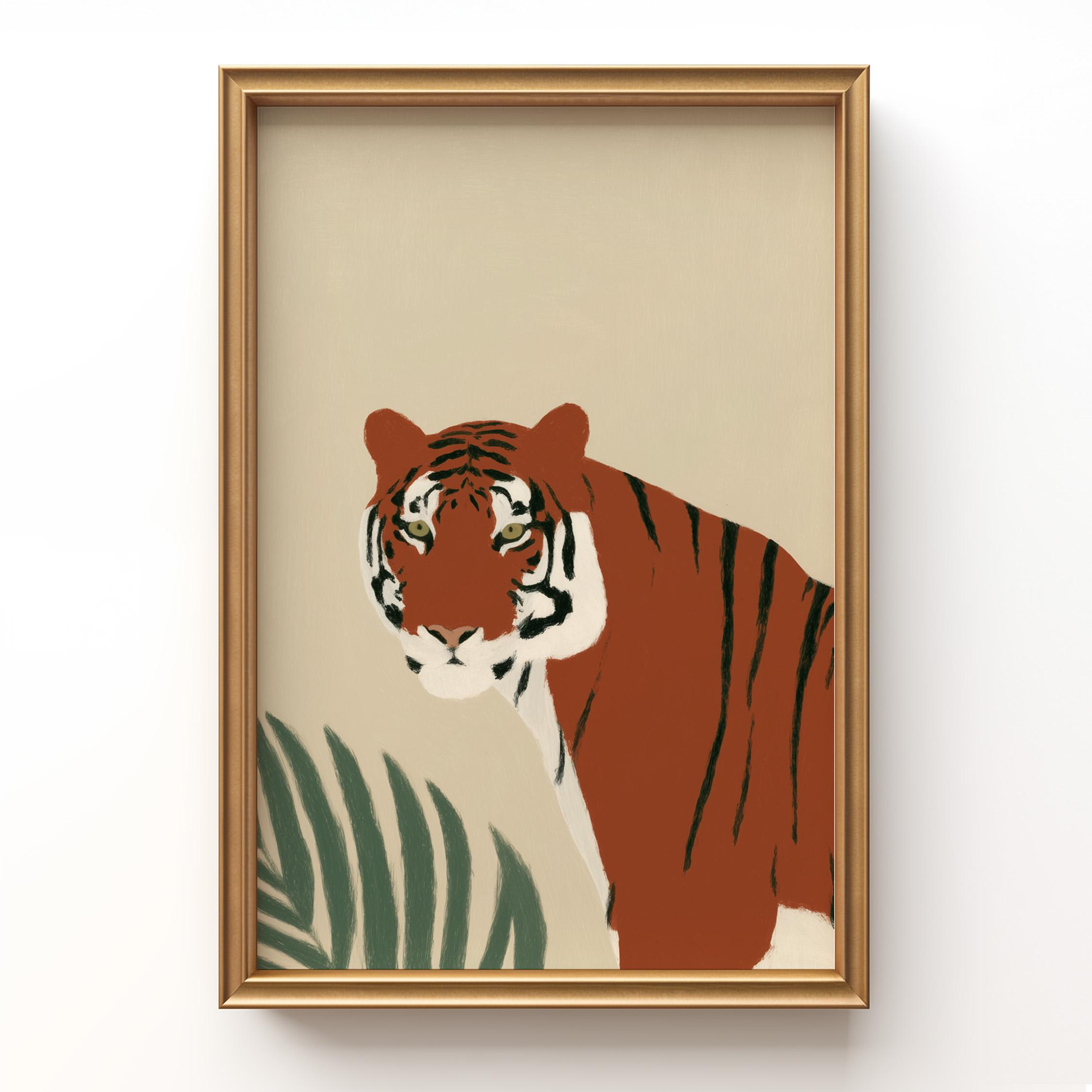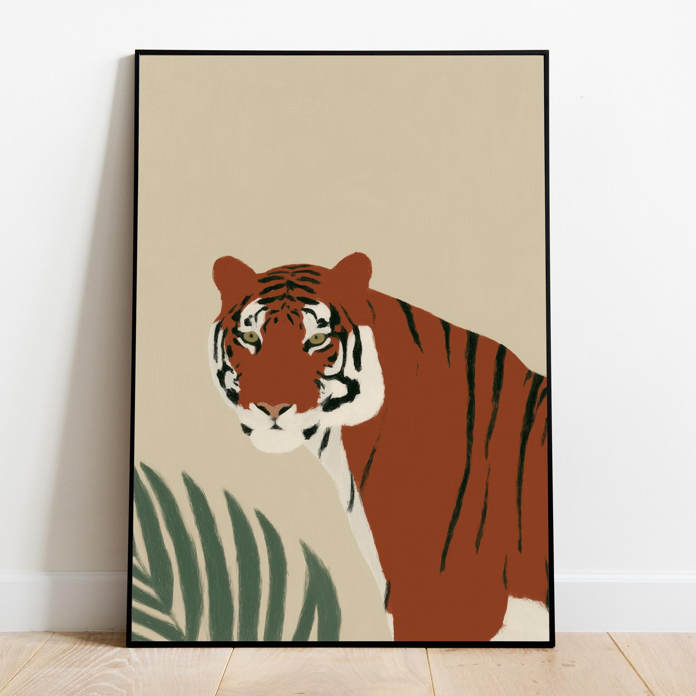 This striking tiger wall art print features a majestic tropical animal portrait with warm earthy tones and minimalist botanical accents that create instant visual drama. Perfect for safari nurseries, living rooms, bedrooms, or offices seeking sophisticated jungle-inspired decor with modern minimalist appeal.