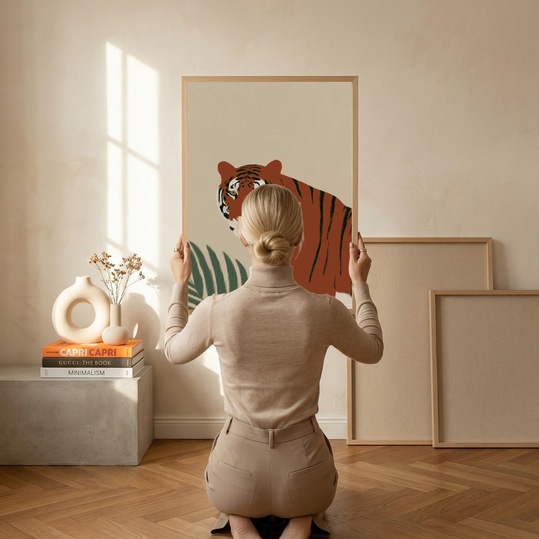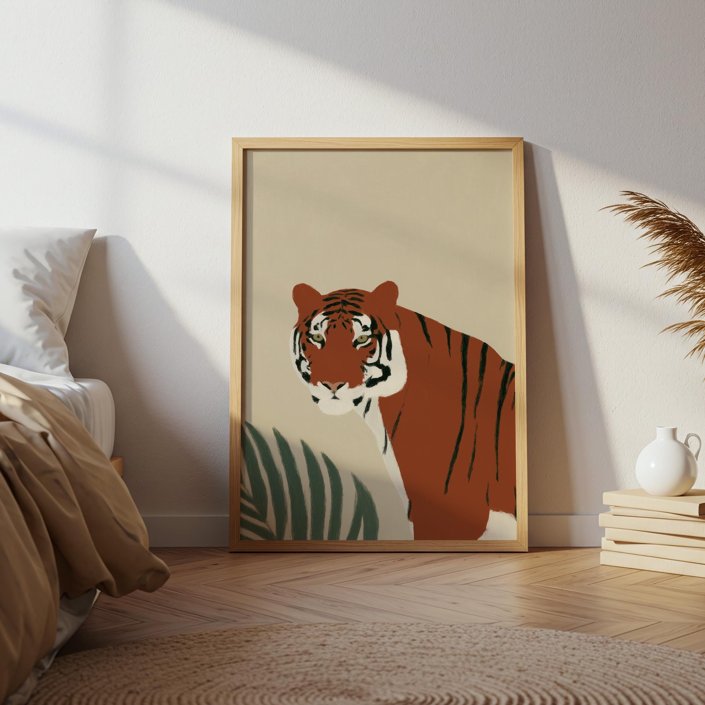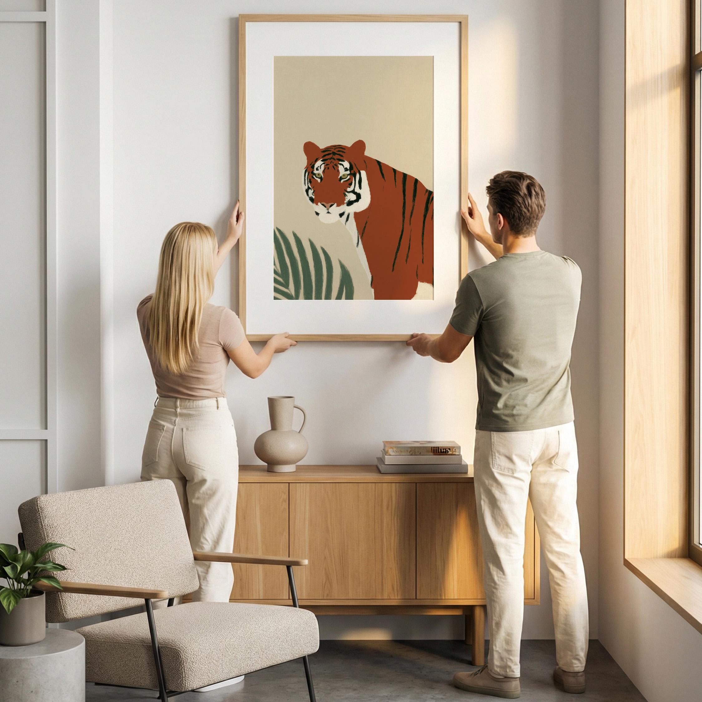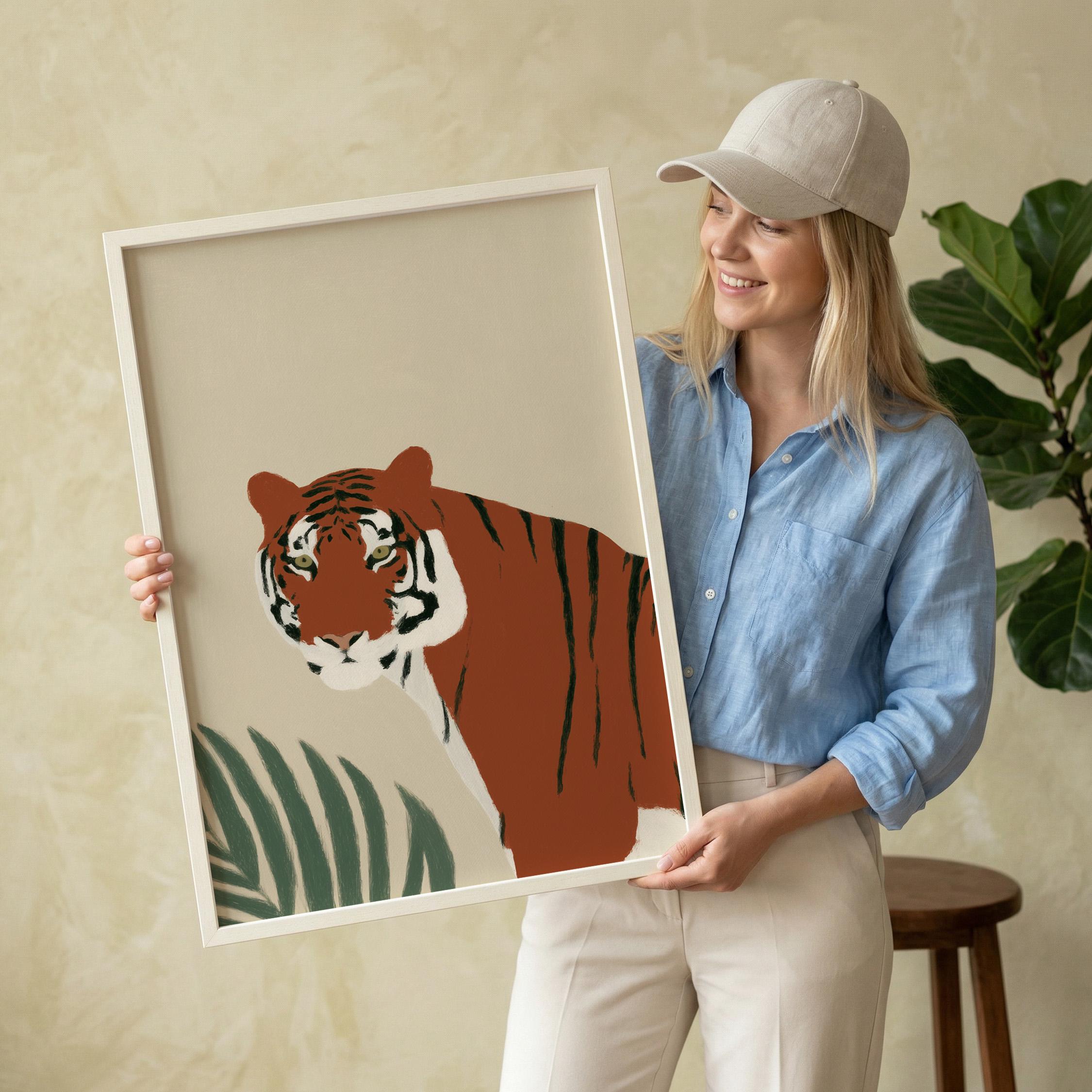 This striking tiger wall art print features a majestic tropical animal portrait with warm earthy tones and minimalist botanical accents that create instant visual drama. Perfect for safari nurseries, living rooms, bedrooms, or offices seeking sophisticated jungle-inspired decor with modern minimalist appeal.