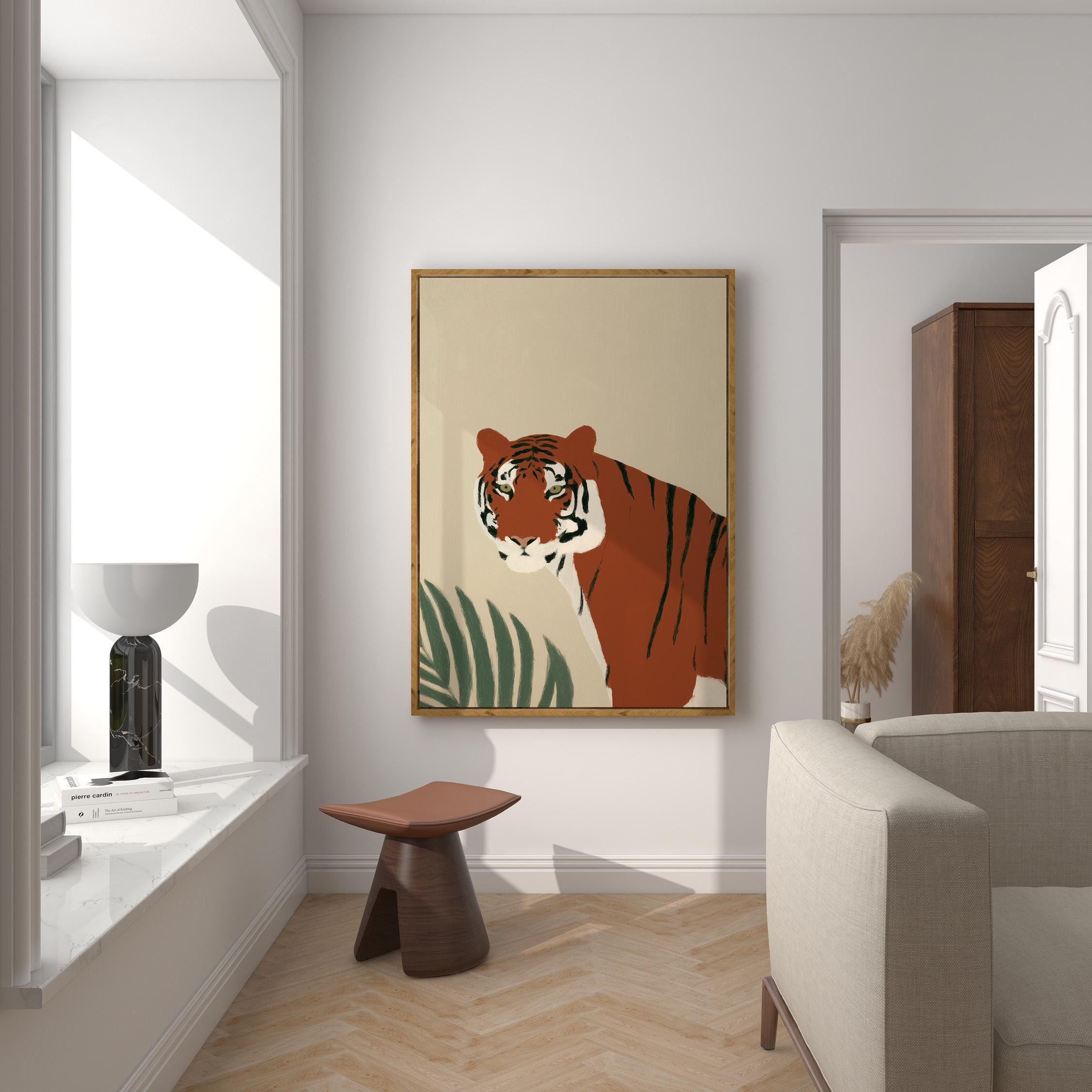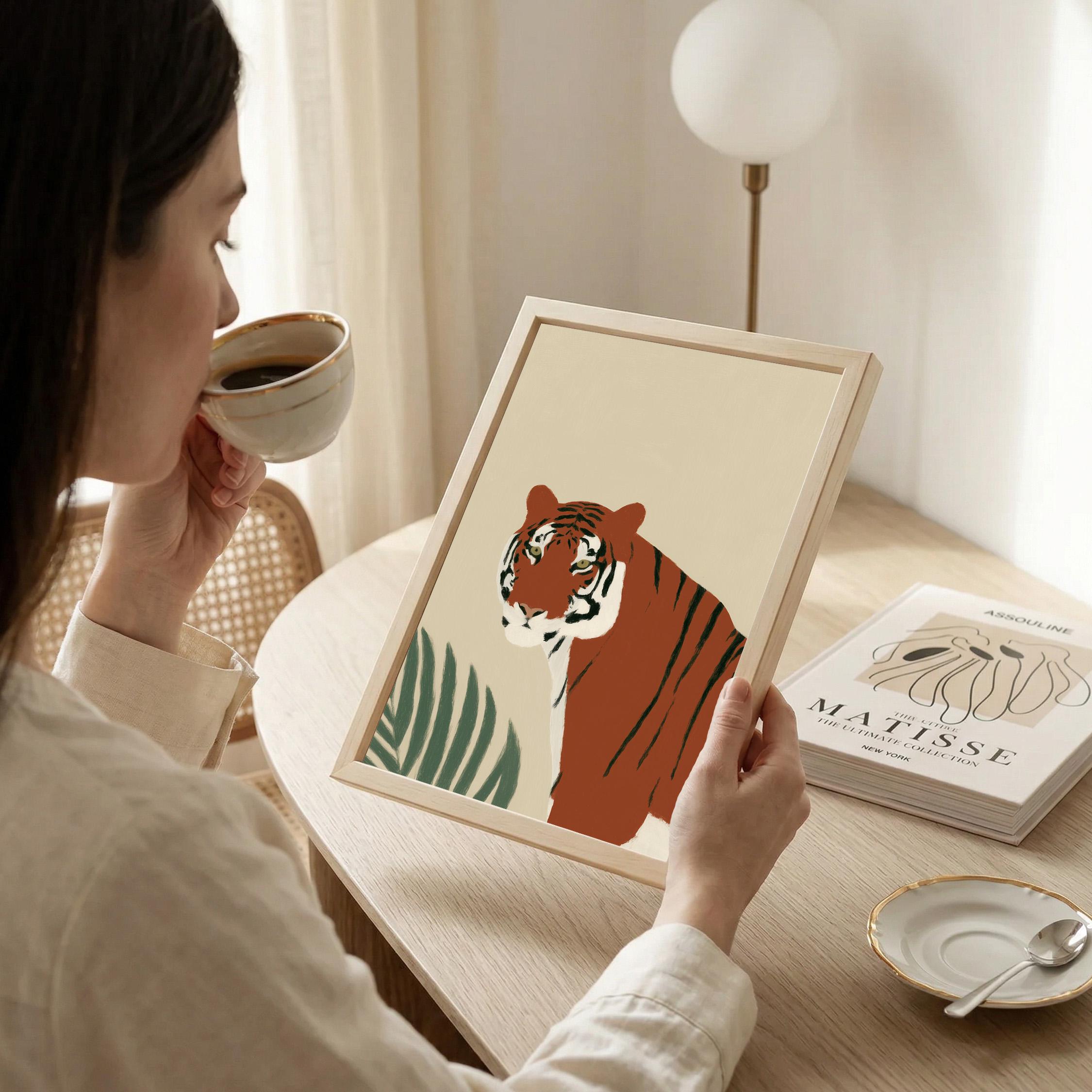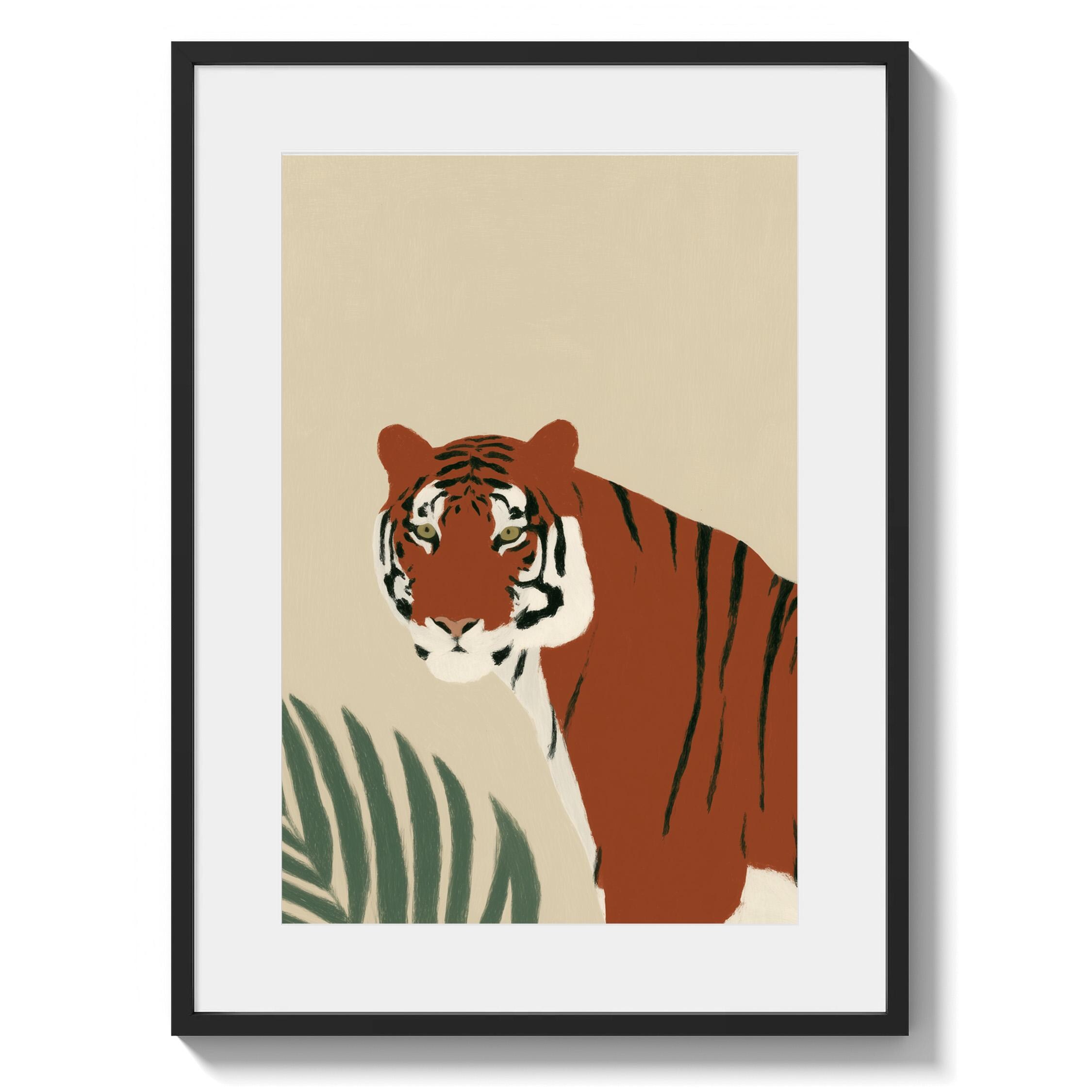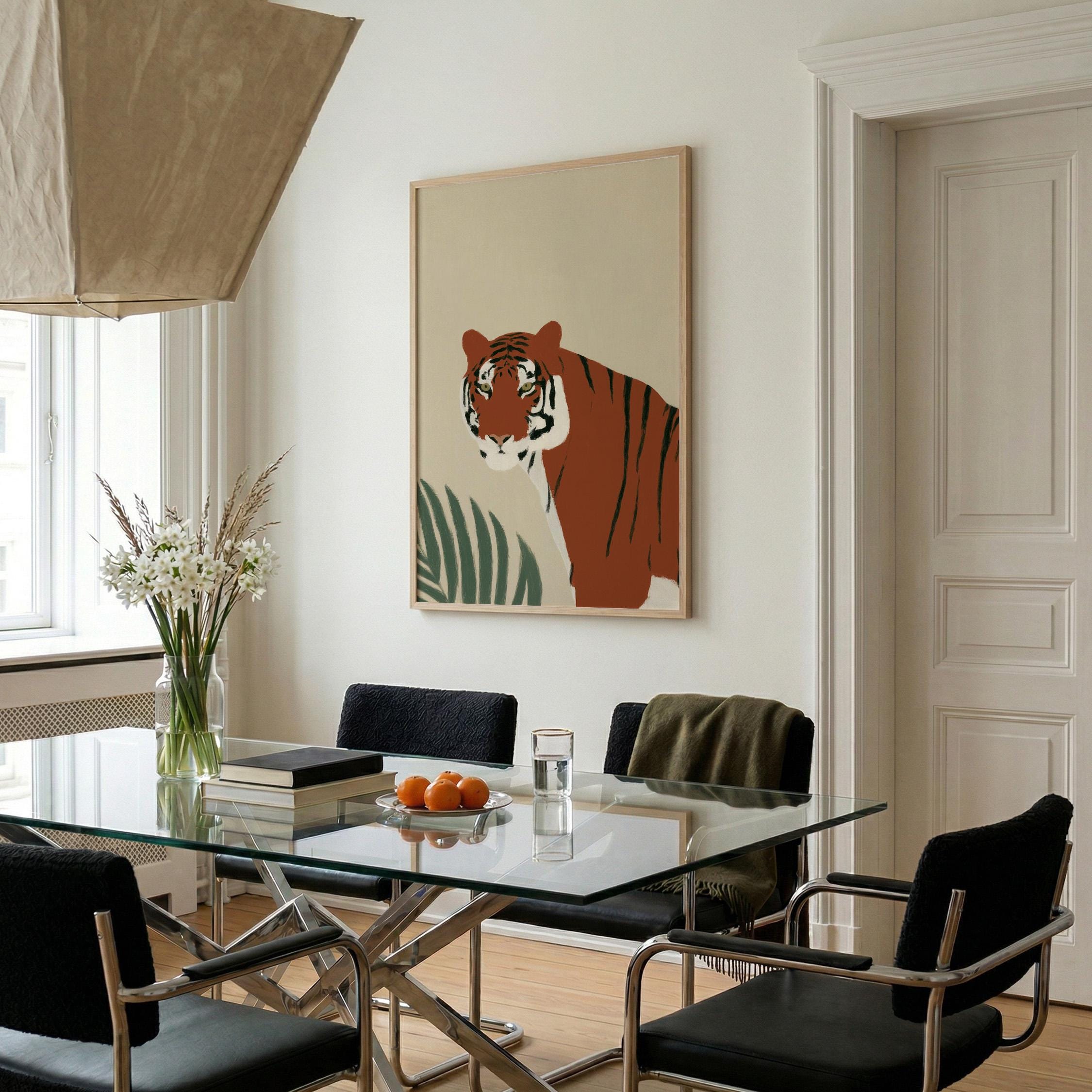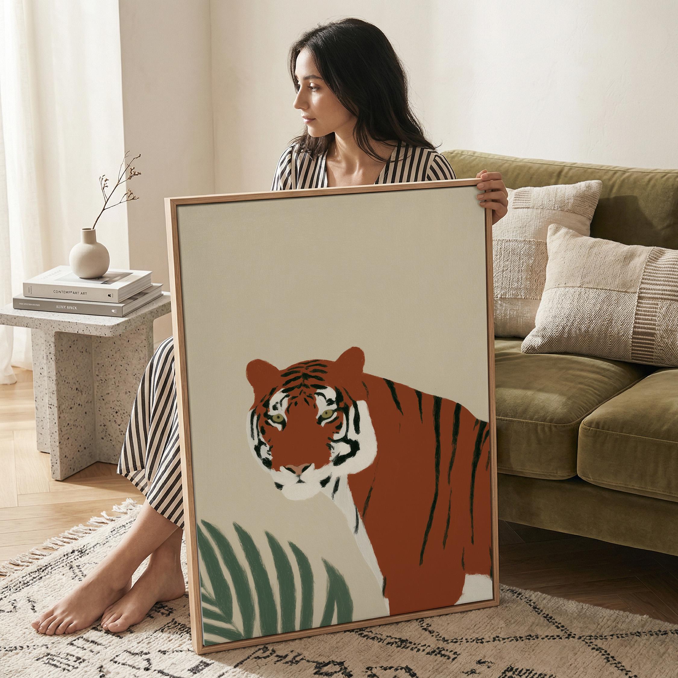 This striking tiger wall art print features a majestic tropical animal portrait with warm earthy tones and minimalist botanical accents that create instant visual drama. Perfect for safari nurseries, living rooms, bedrooms, or offices seeking sophisticated jungle-inspired decor with modern minimalist appeal.