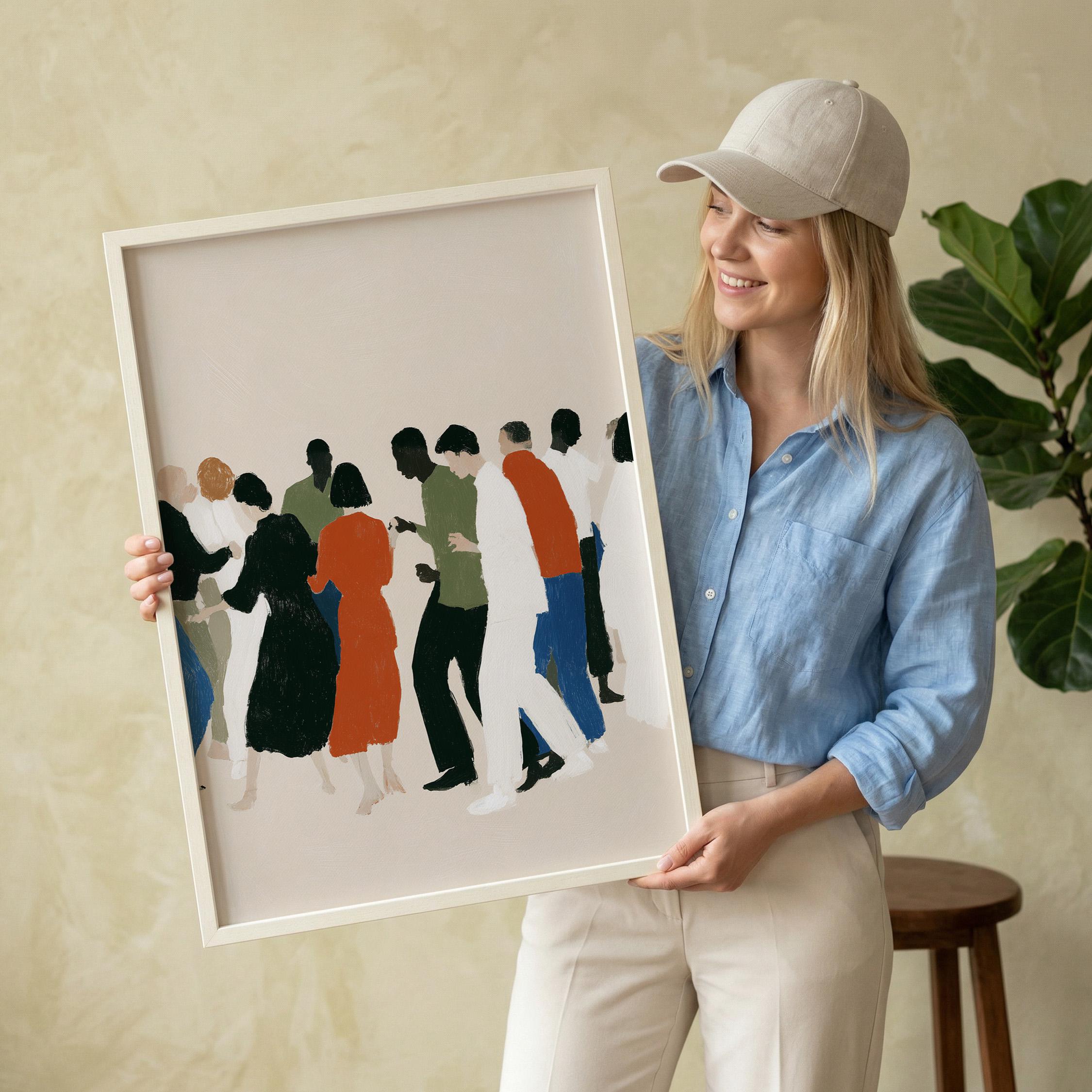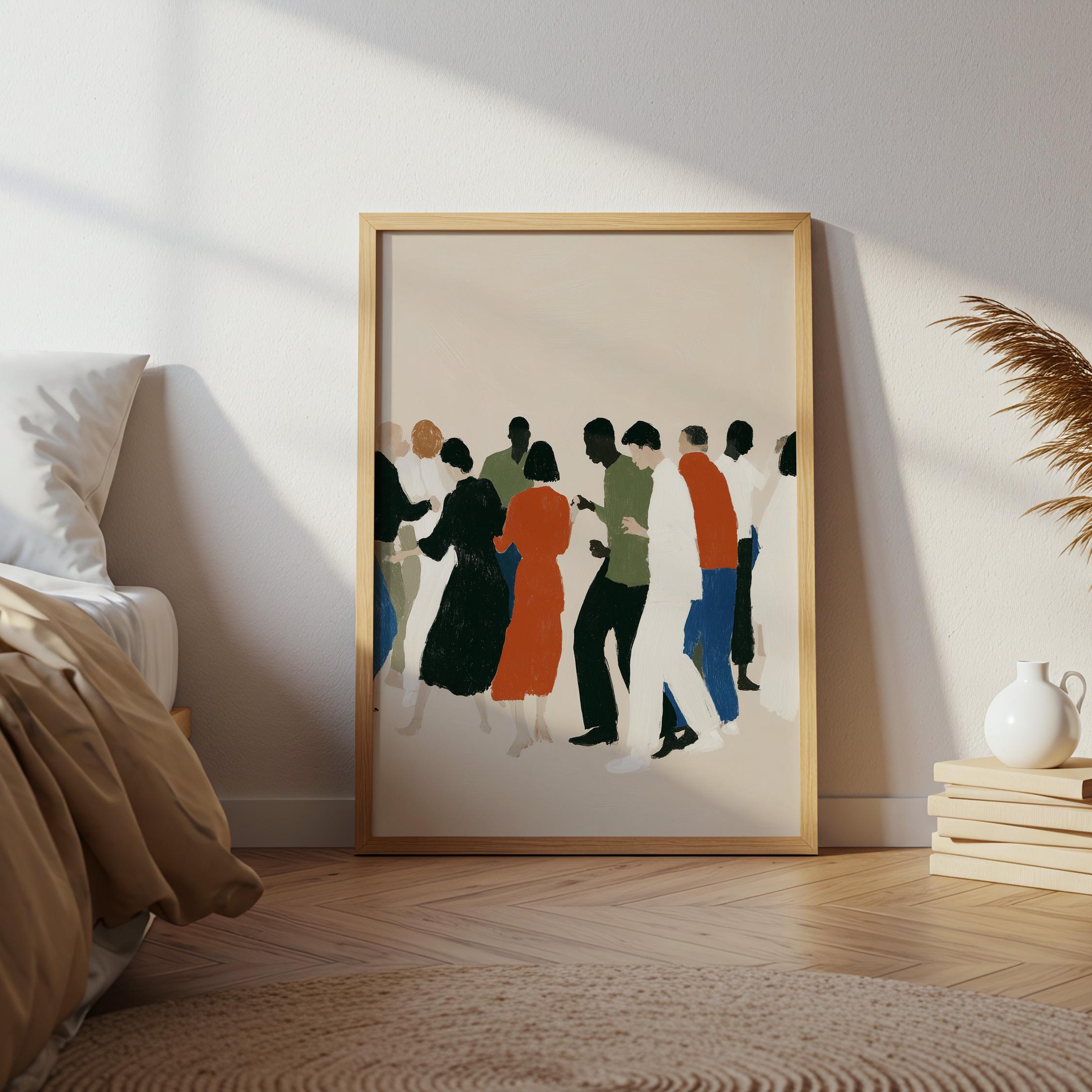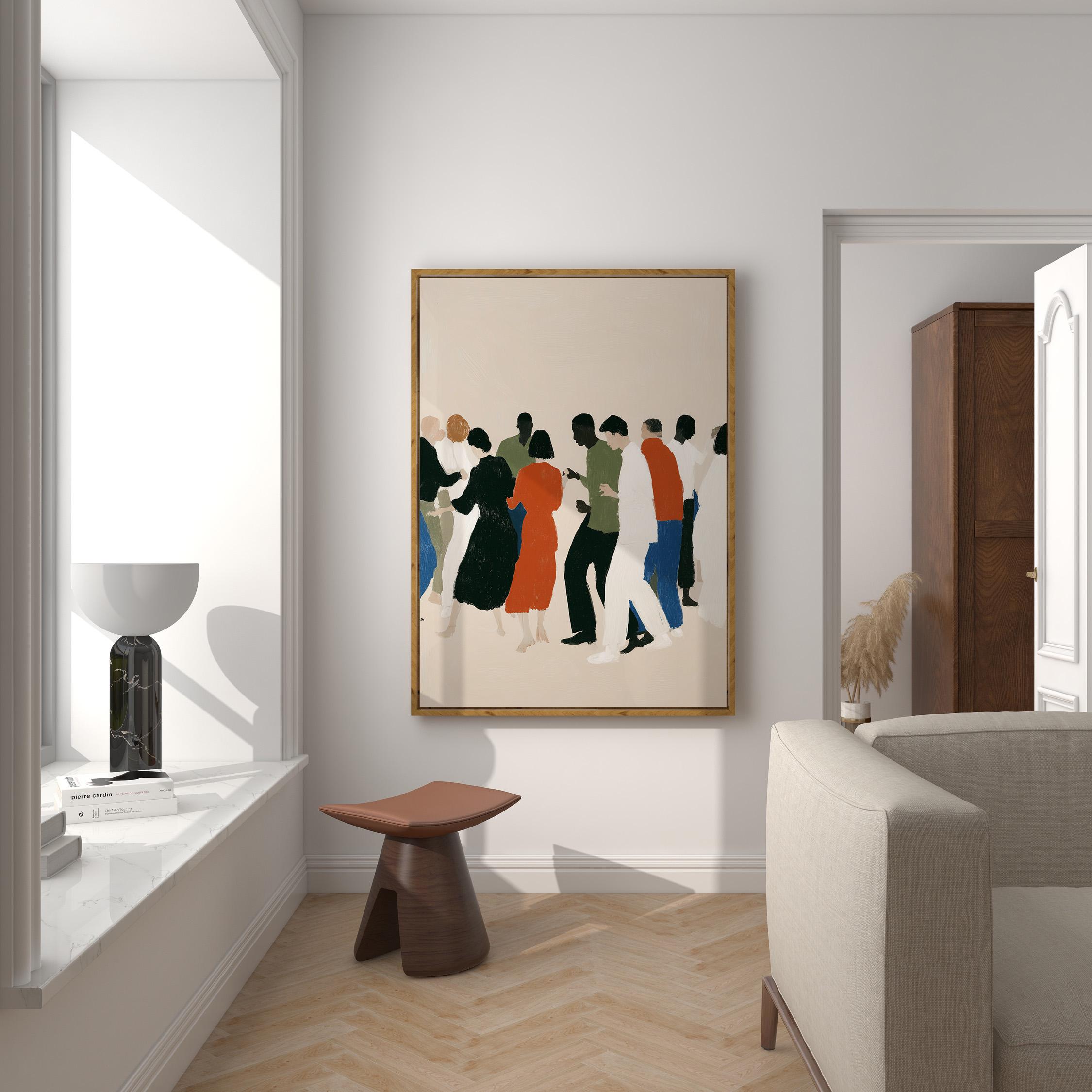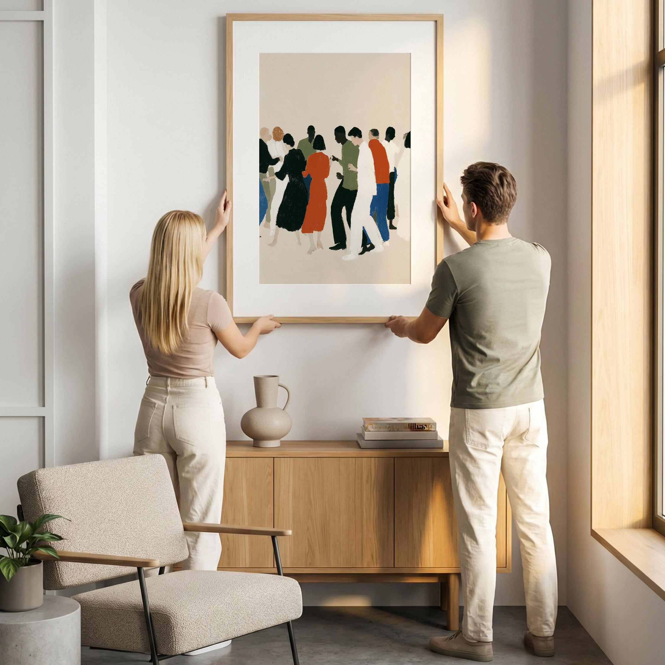 This contemporary crowd illustration captures the beauty of human connection through abstract figures in earthy tones and vibrant orange accents. Ideal for therapists, community centers, offices, or anyone who values diversity and togetherness in their home or workspace.