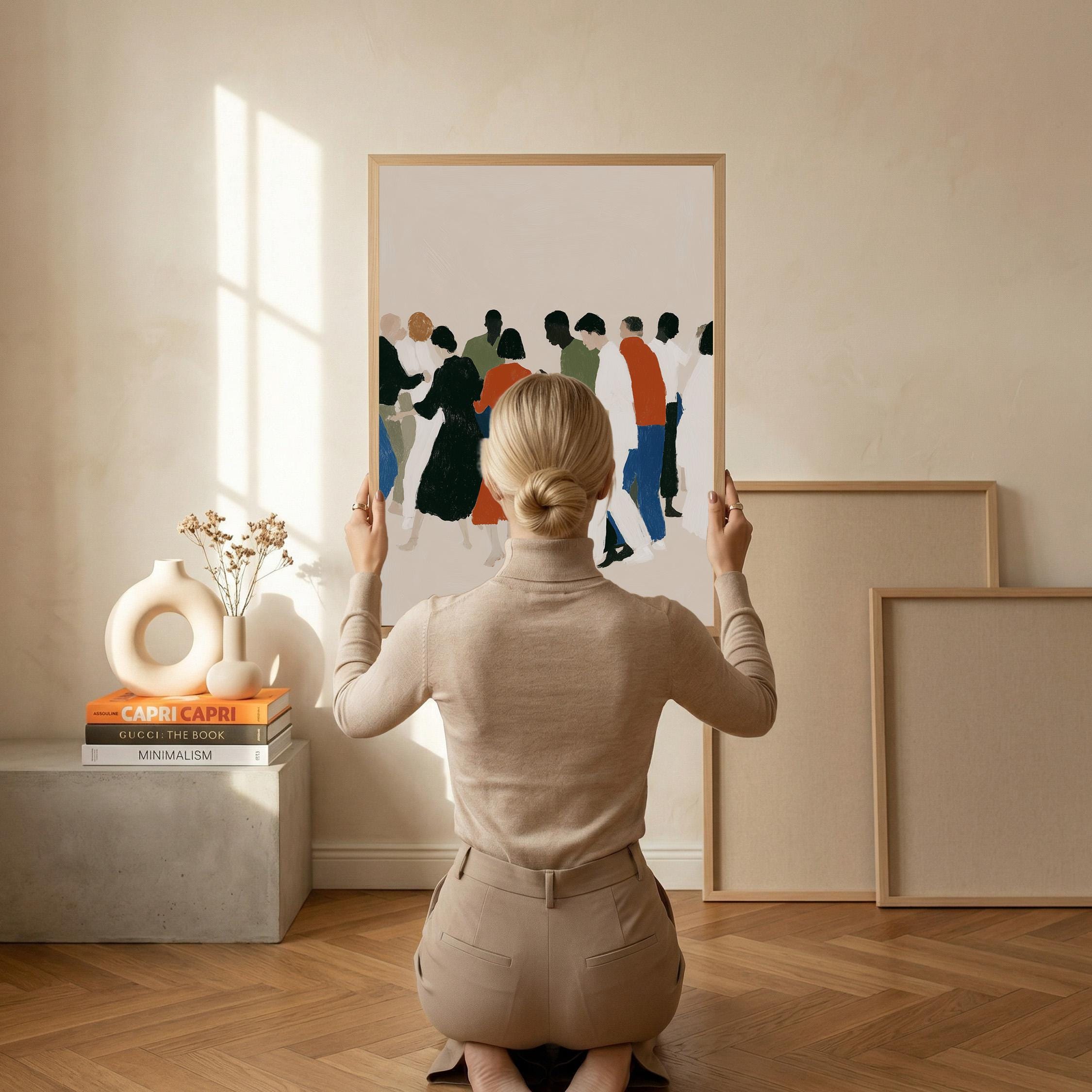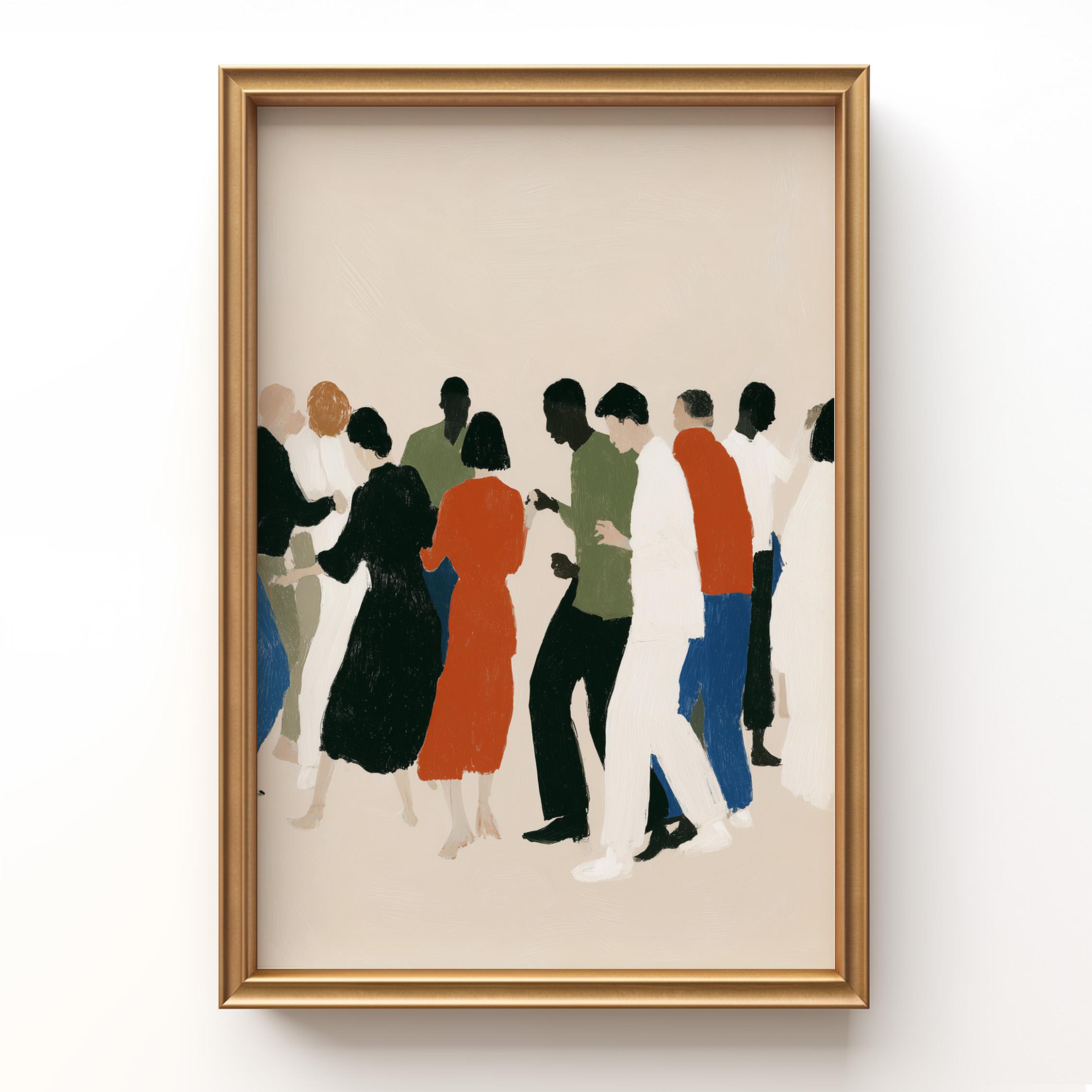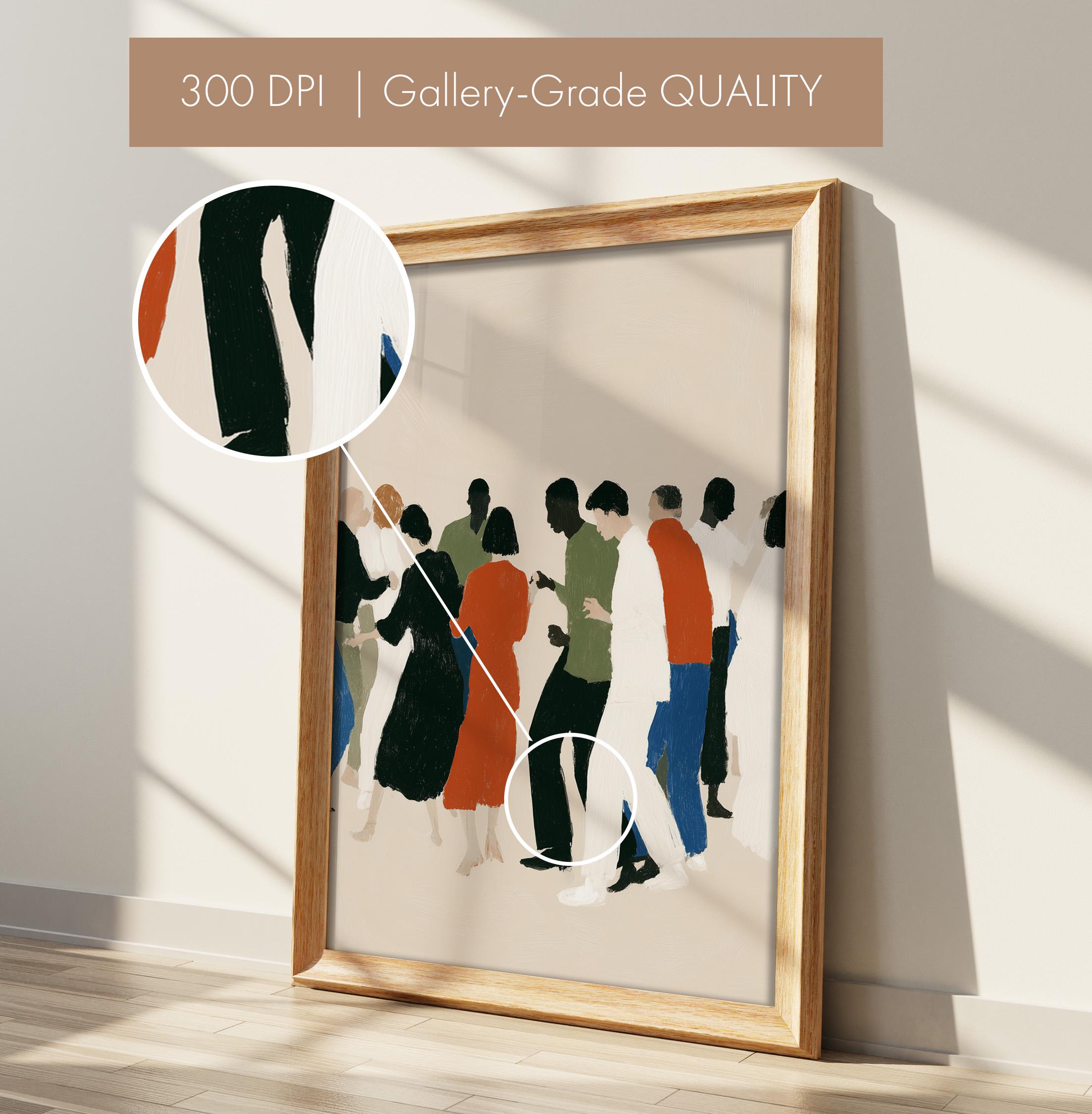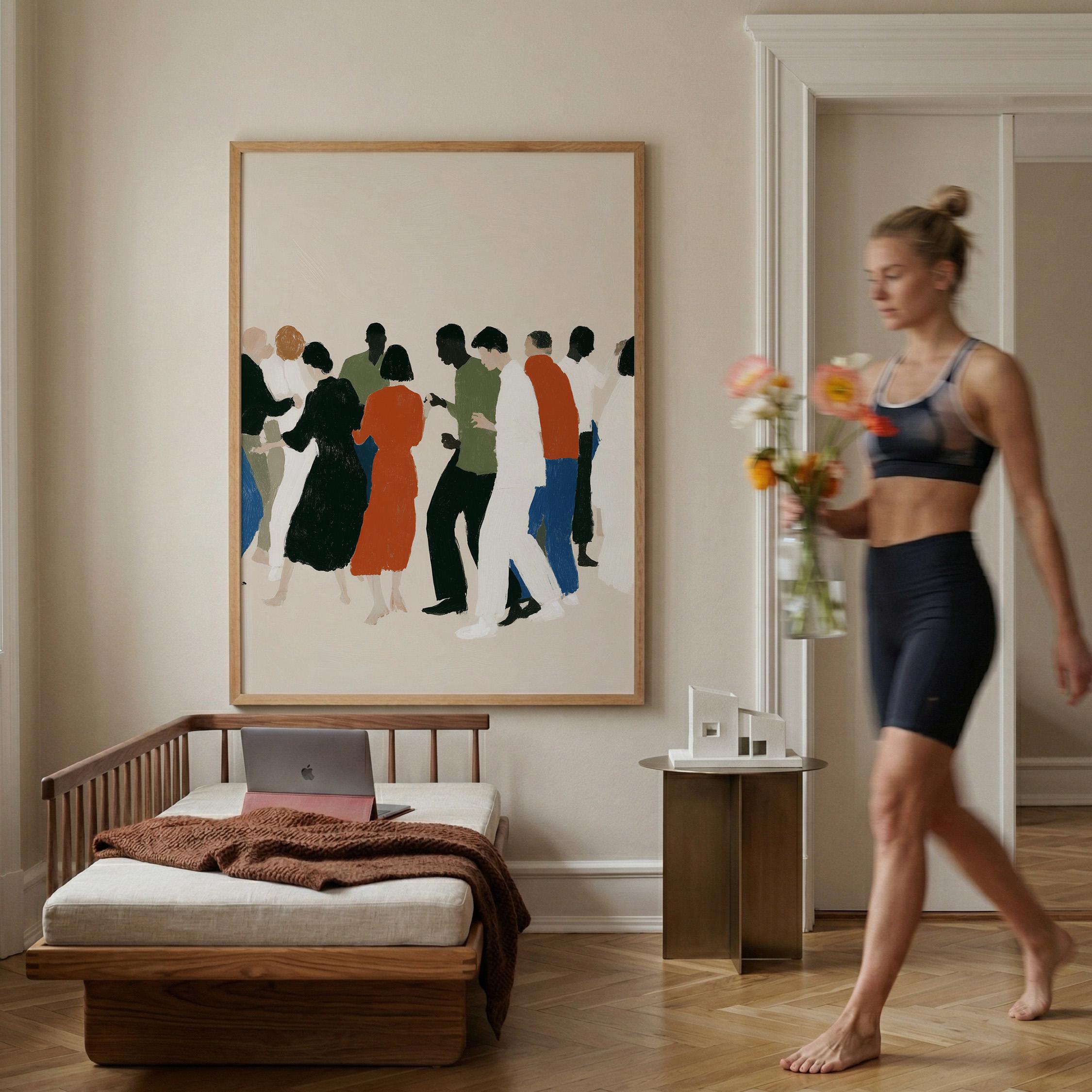 This contemporary crowd illustration captures the beauty of human connection through abstract figures in earthy tones and vibrant orange accents. Ideal for therapists, community centers, offices, or anyone who values diversity and togetherness in their home or workspace.