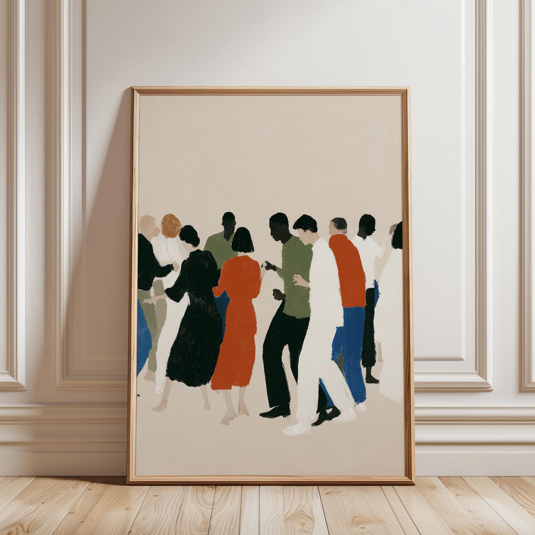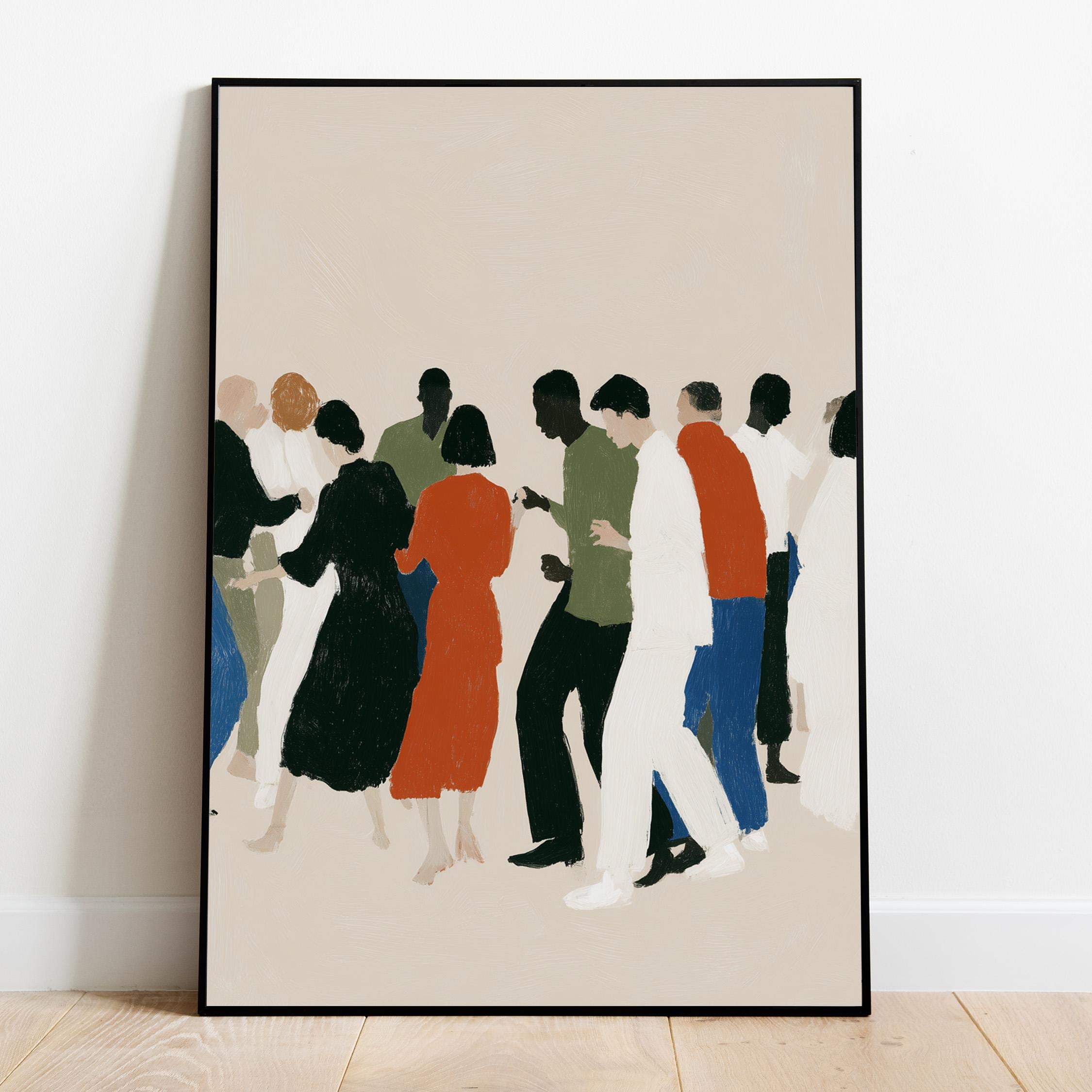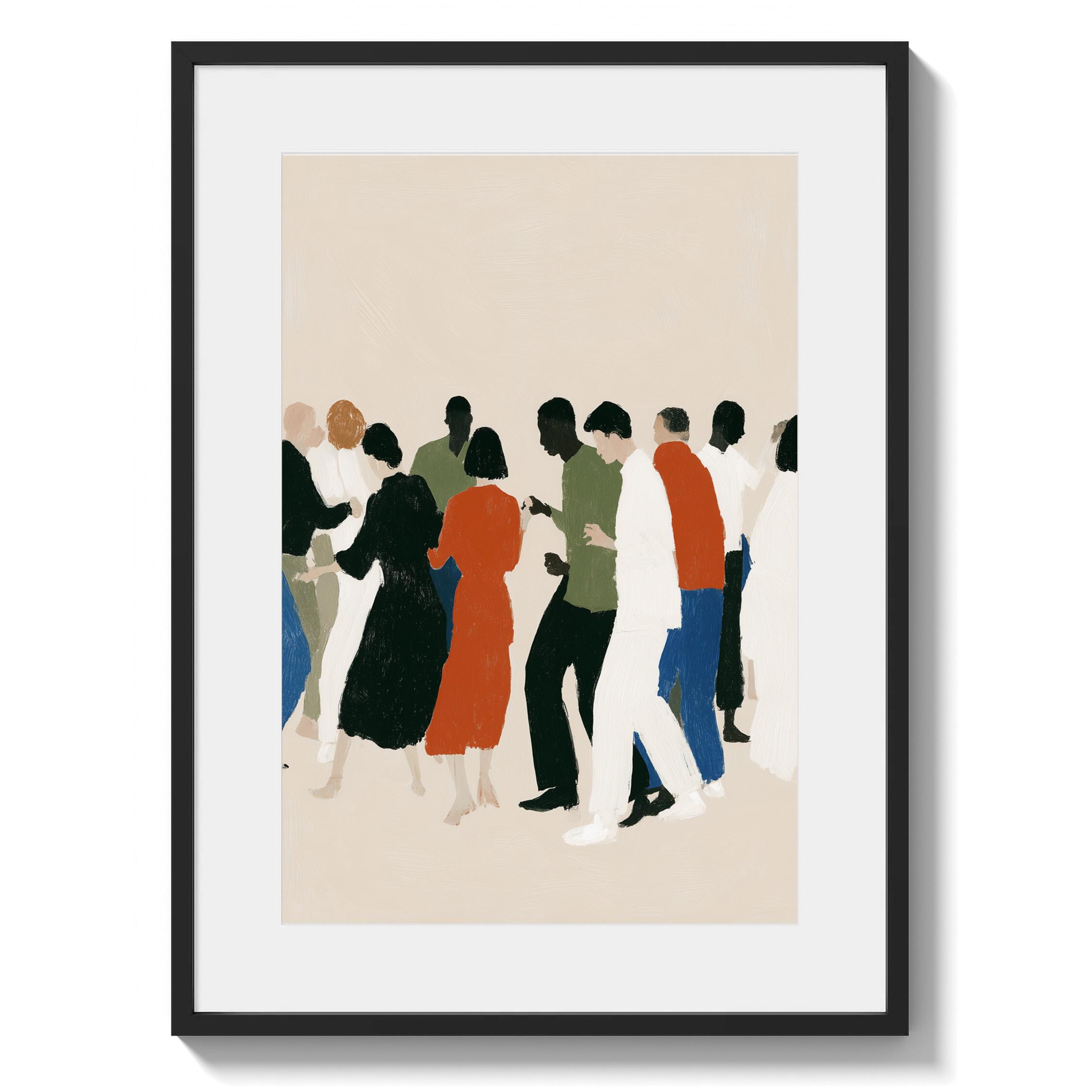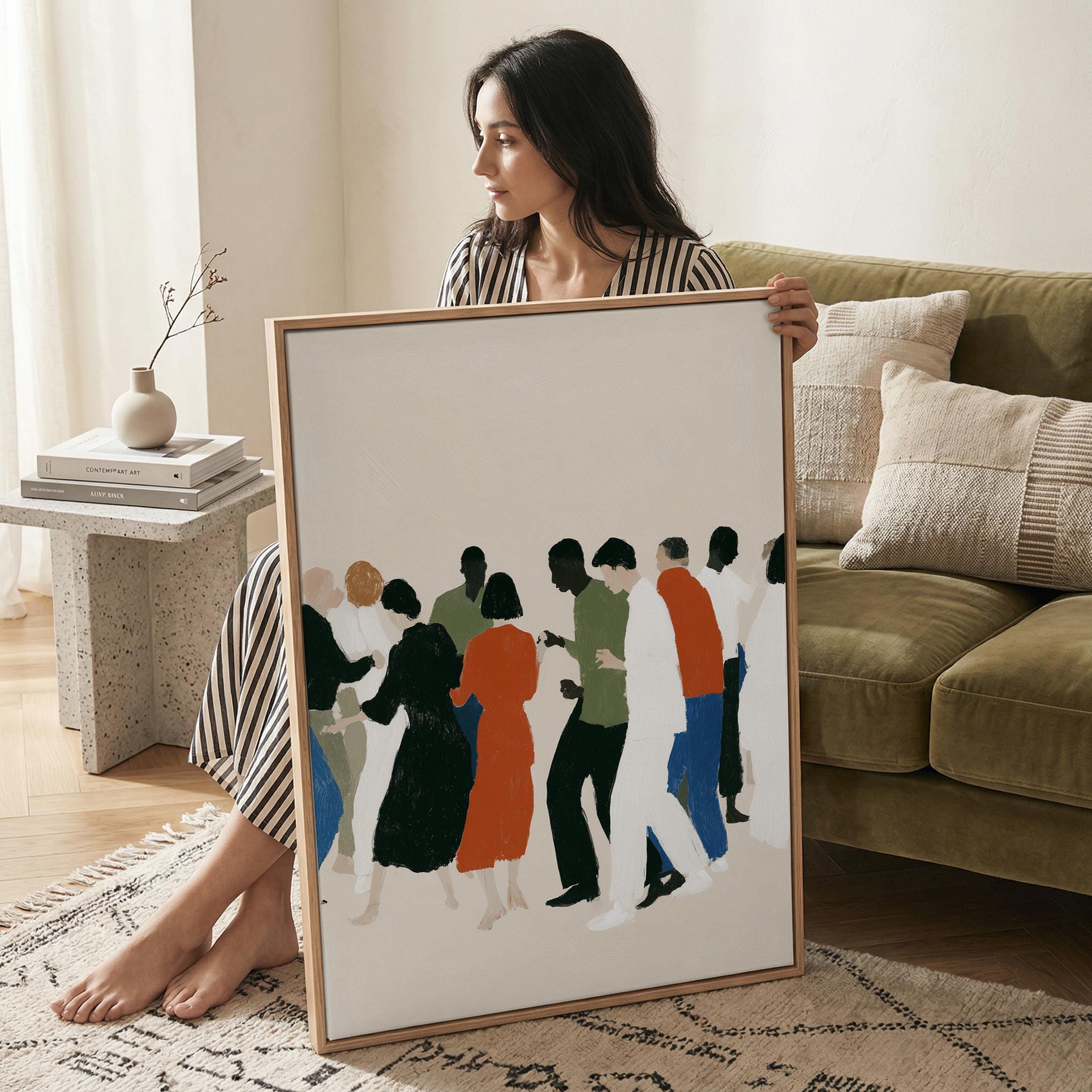 This contemporary crowd illustration captures the beauty of human connection through abstract figures in earthy tones and vibrant orange accents. Ideal for therapists, community centers, offices, or anyone who values diversity and togetherness in their home or workspace.