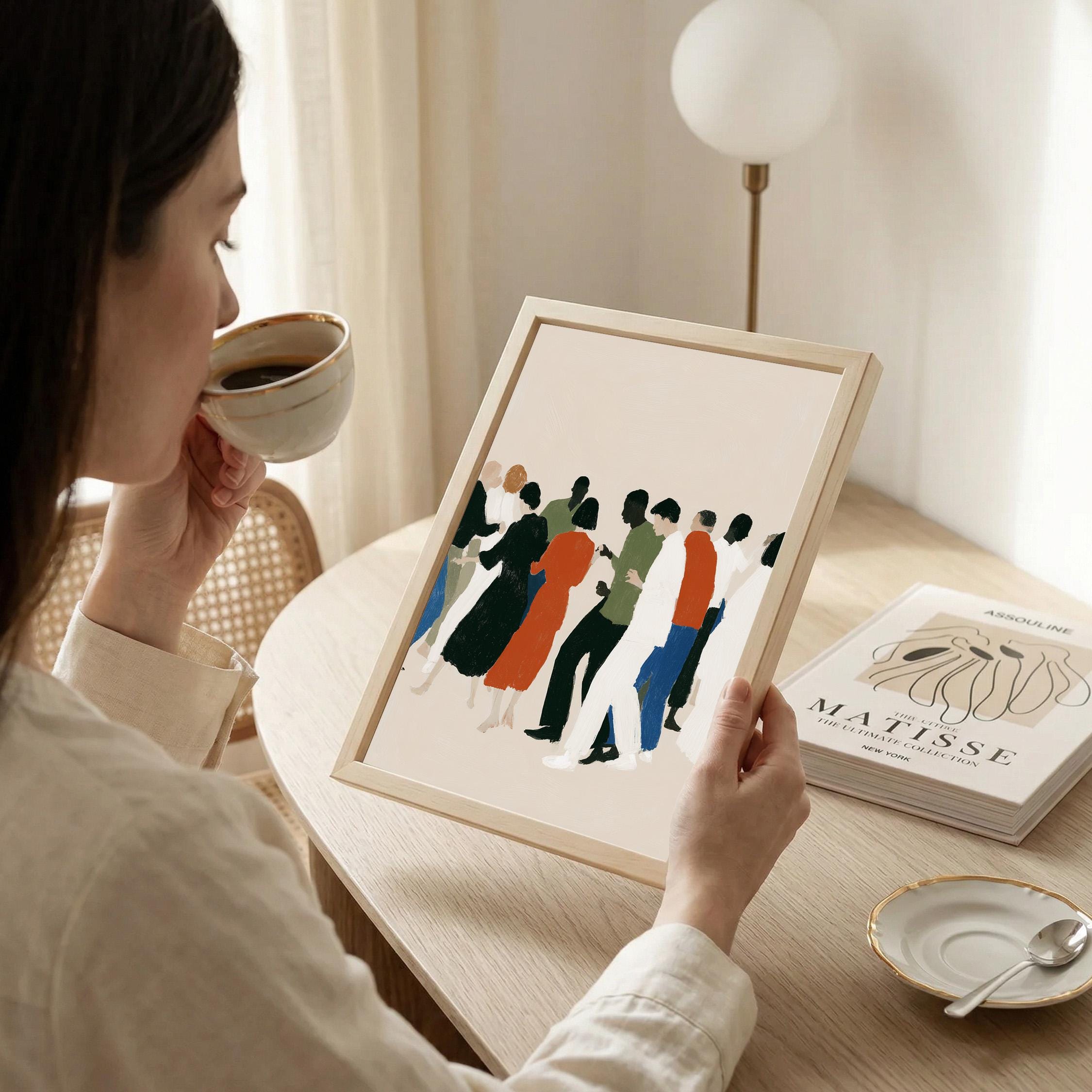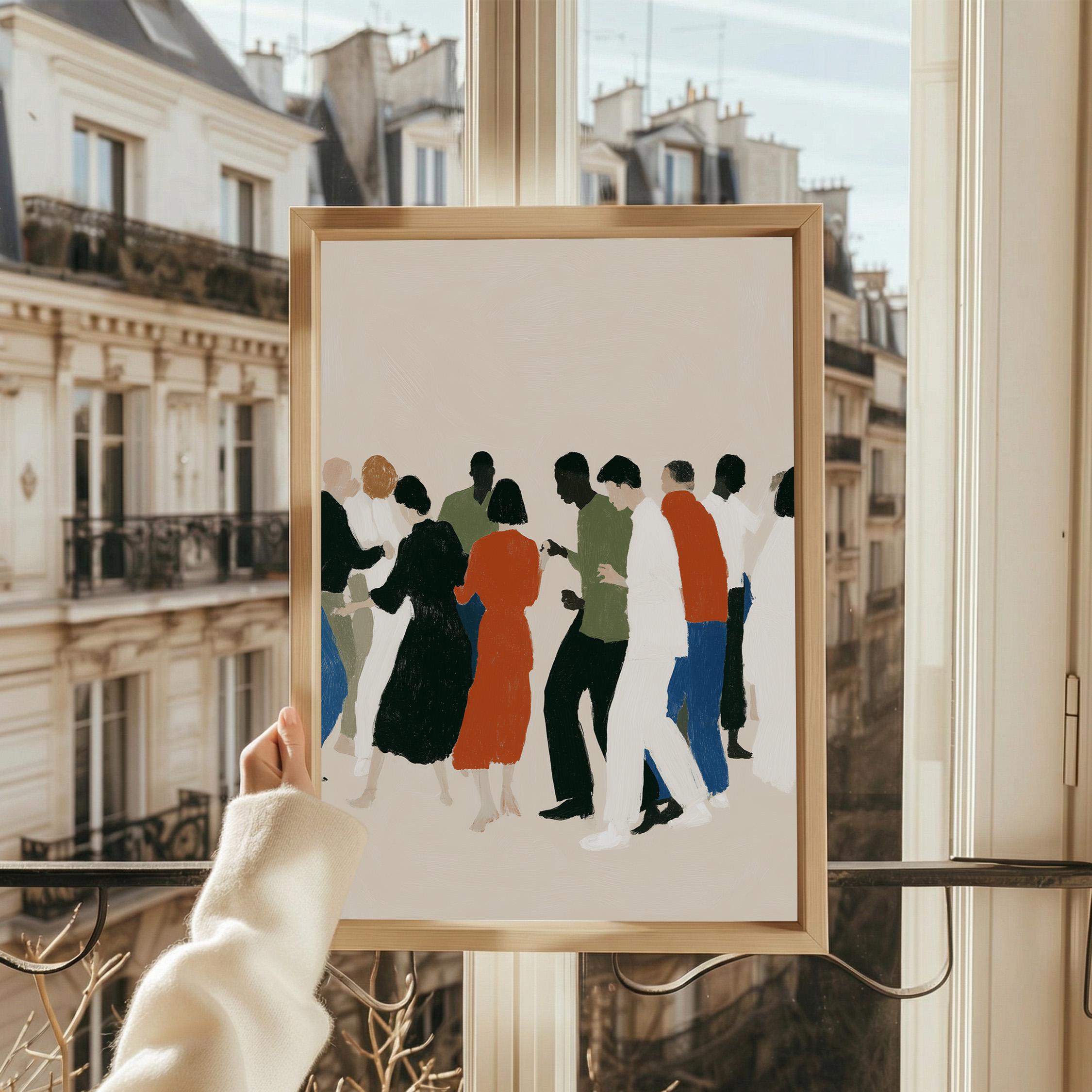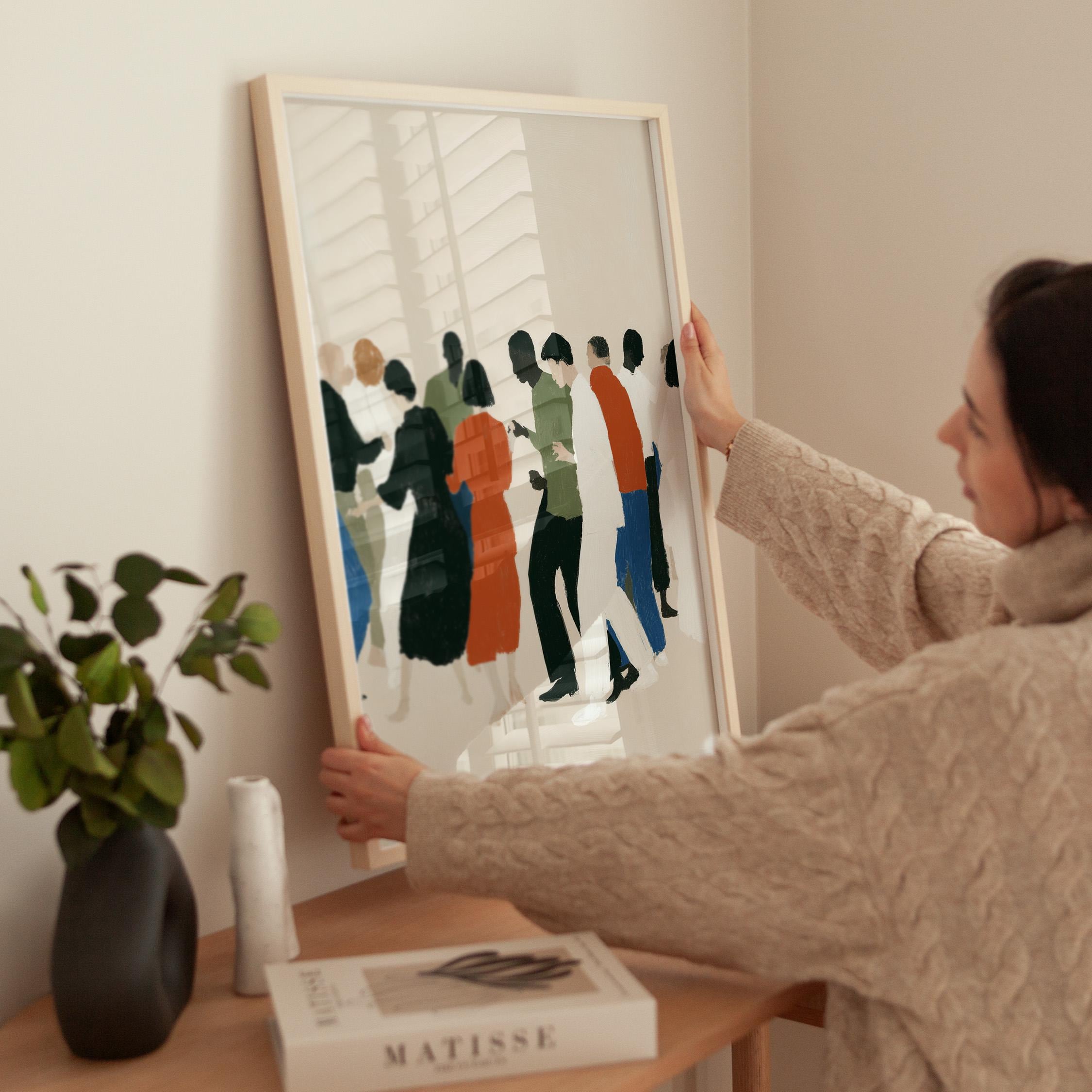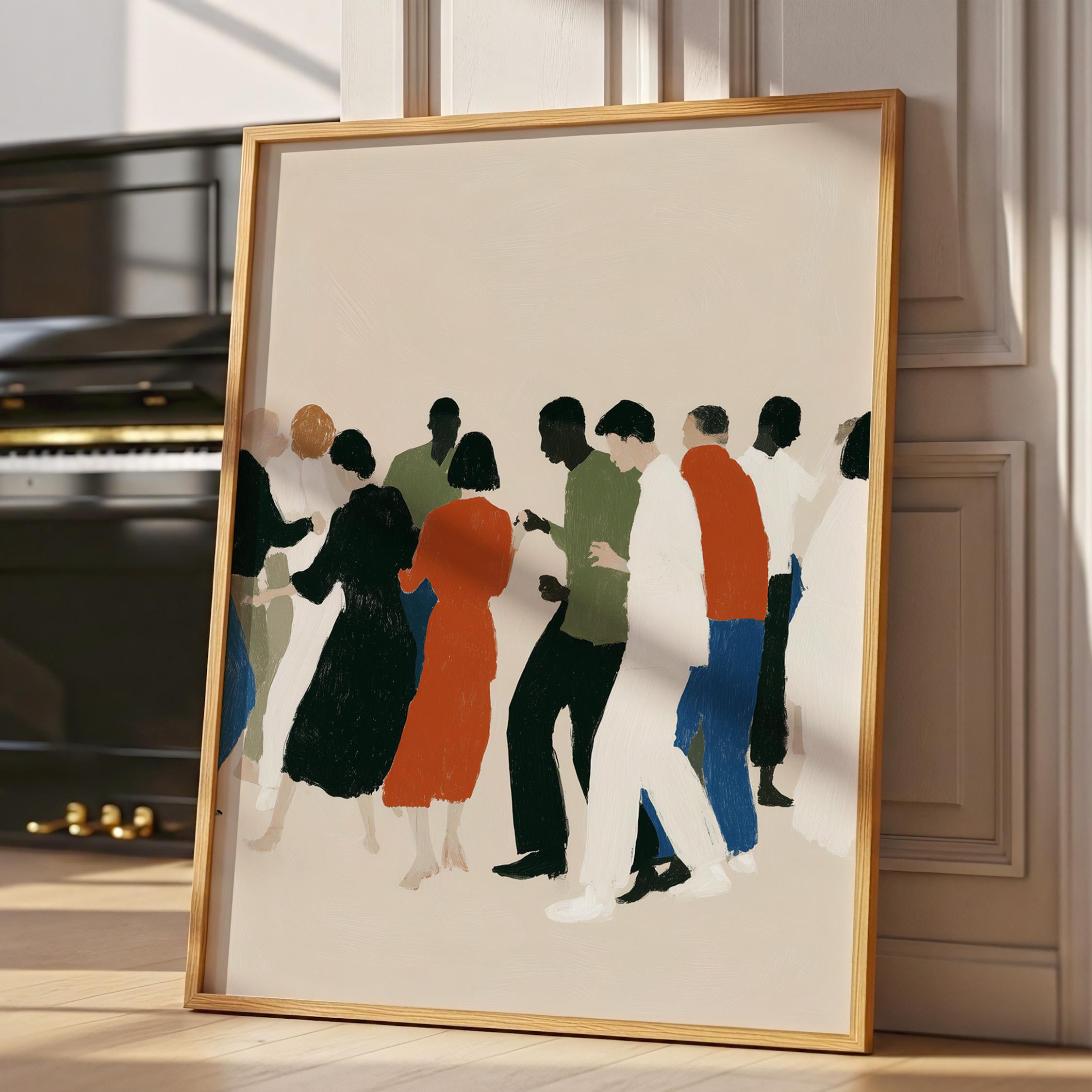 This contemporary crowd illustration captures the beauty of human connection through abstract figures in earthy tones and vibrant orange accents. Ideal for therapists, community centers, offices, or anyone who values diversity and togetherness in their home or workspace.