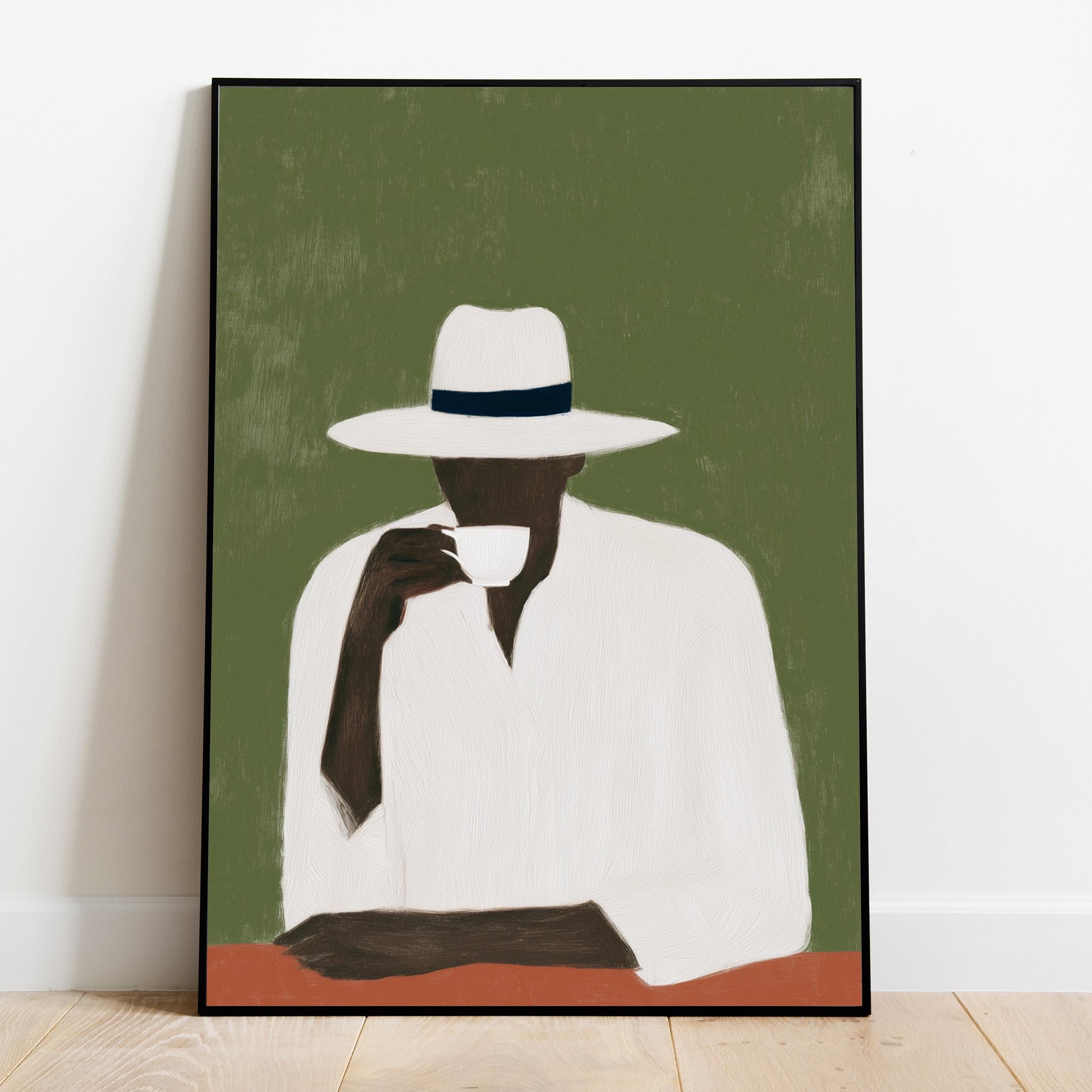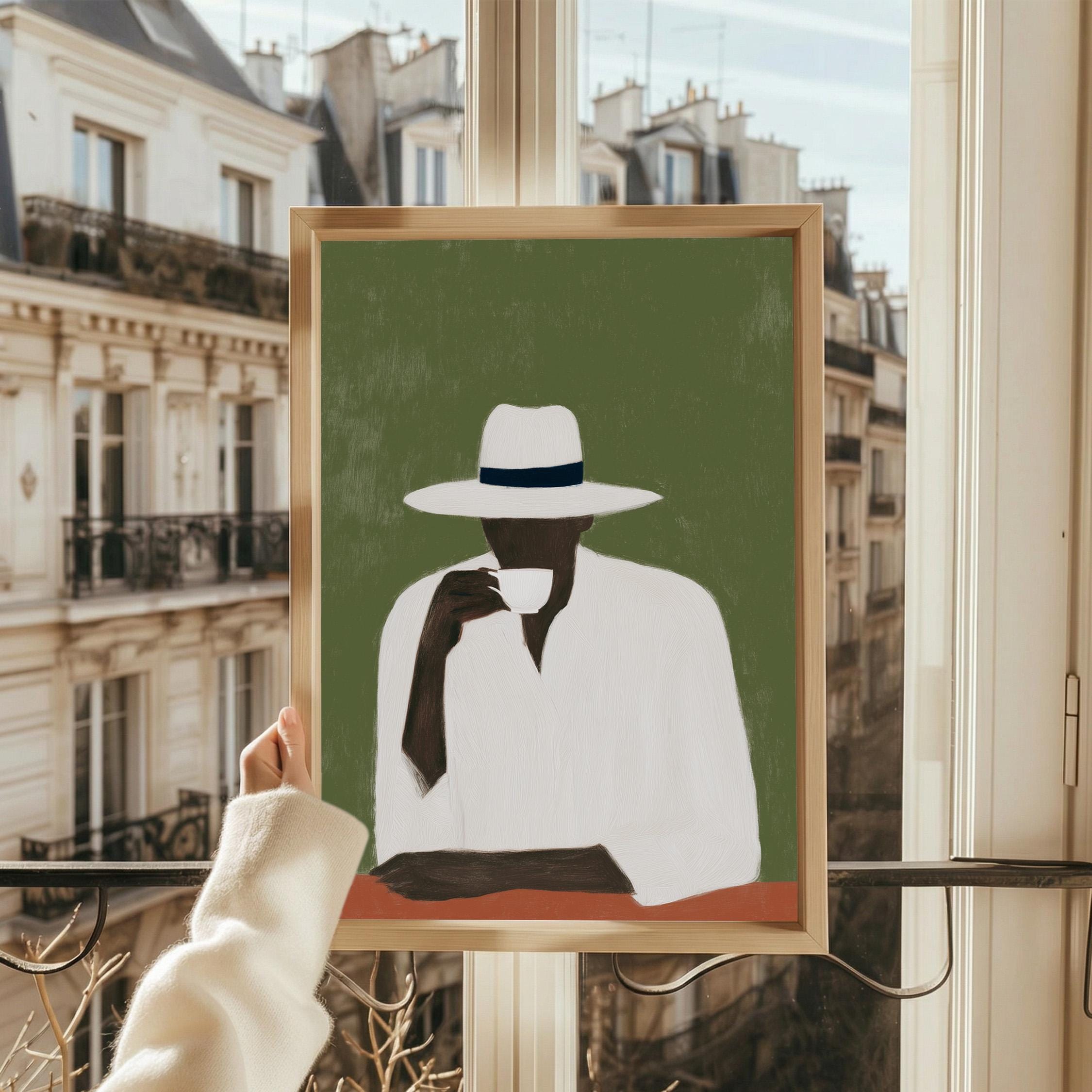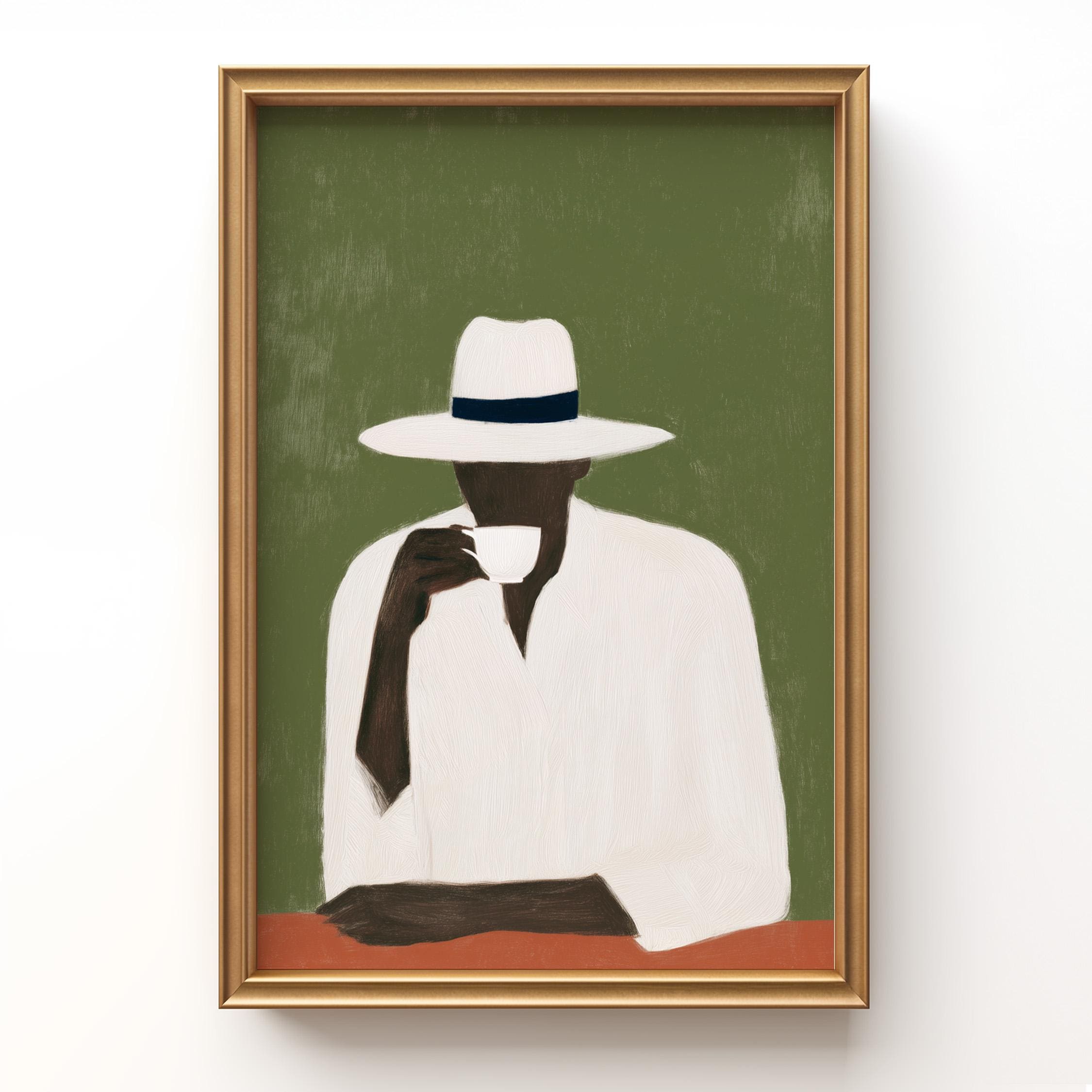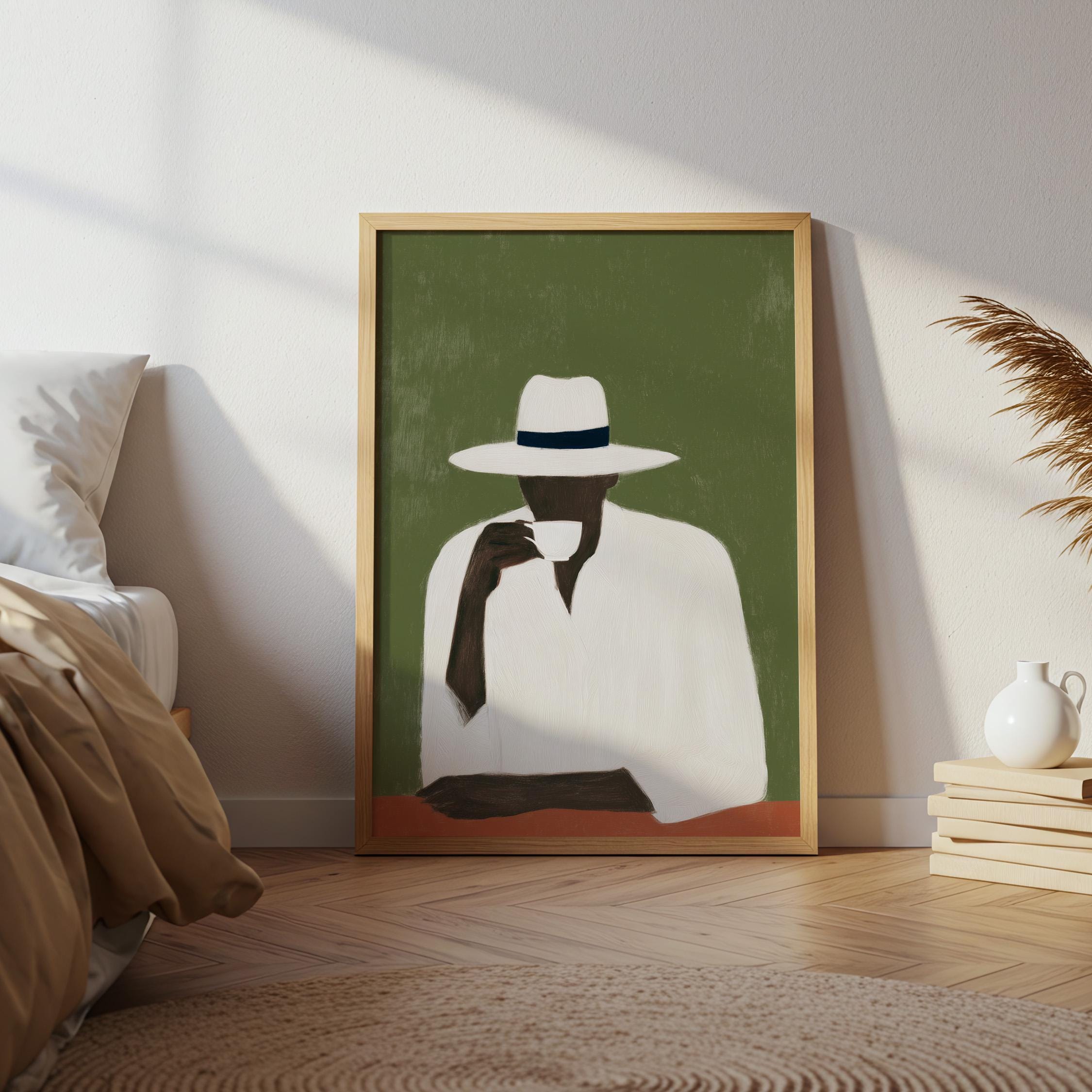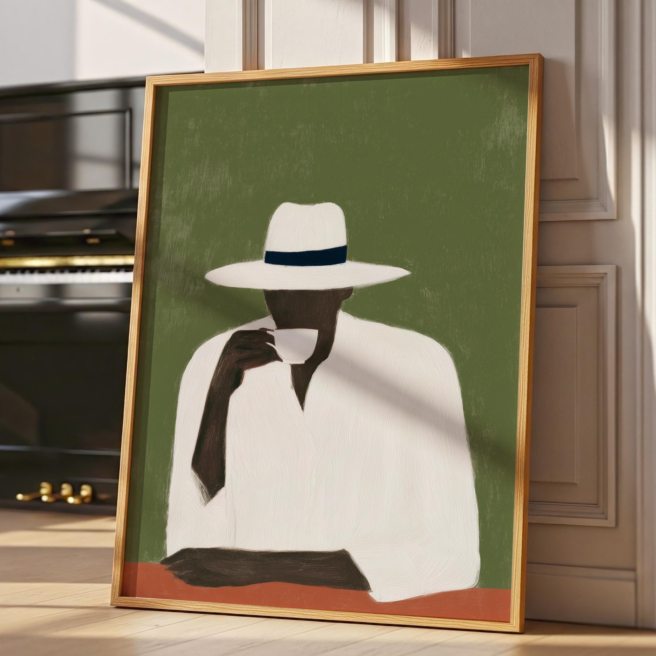 A sophisticated portrait of a Black man in a white fedora hat enjoying a peaceful coffee moment, painted in elegant minimalist style against an olive green background with warm terracotta tones.