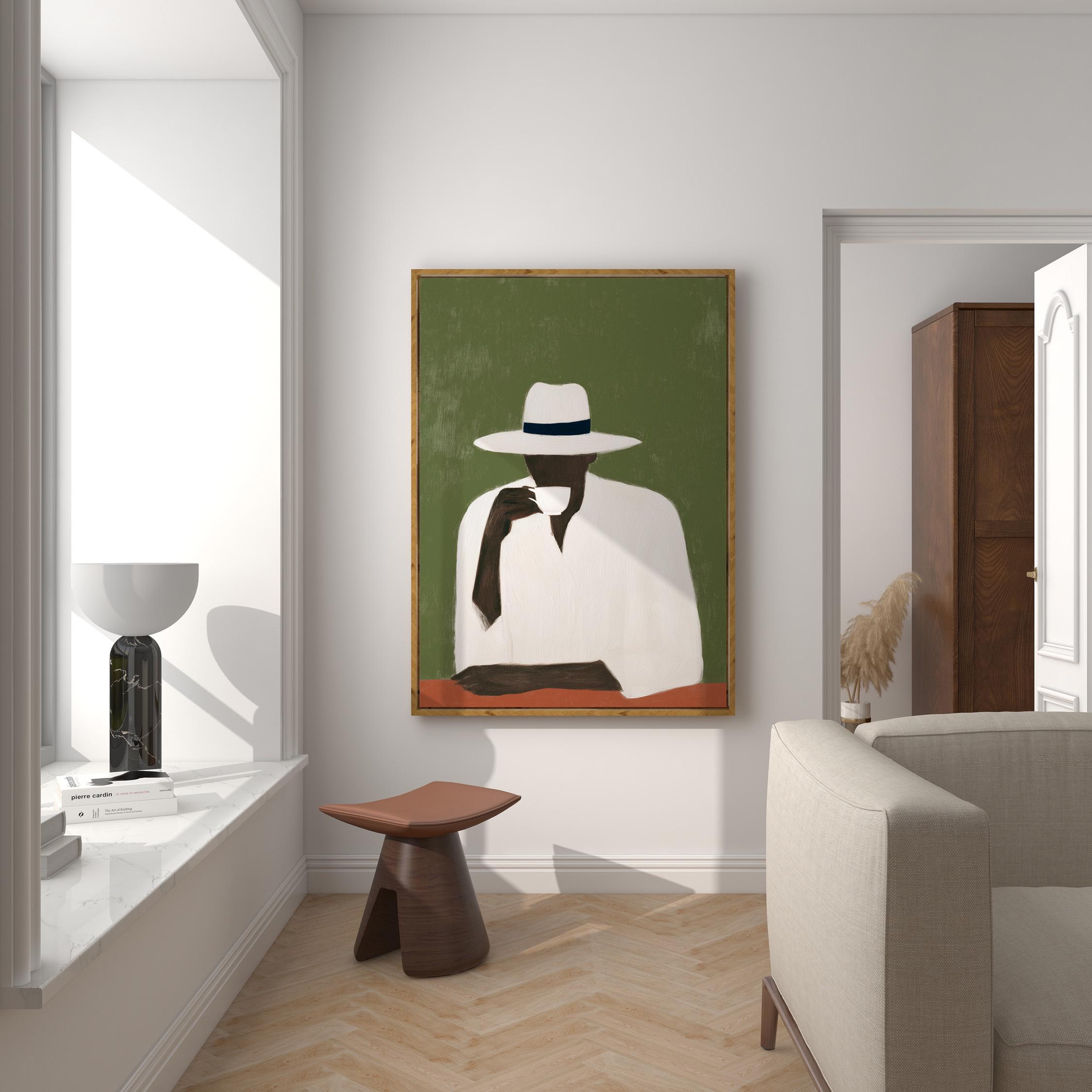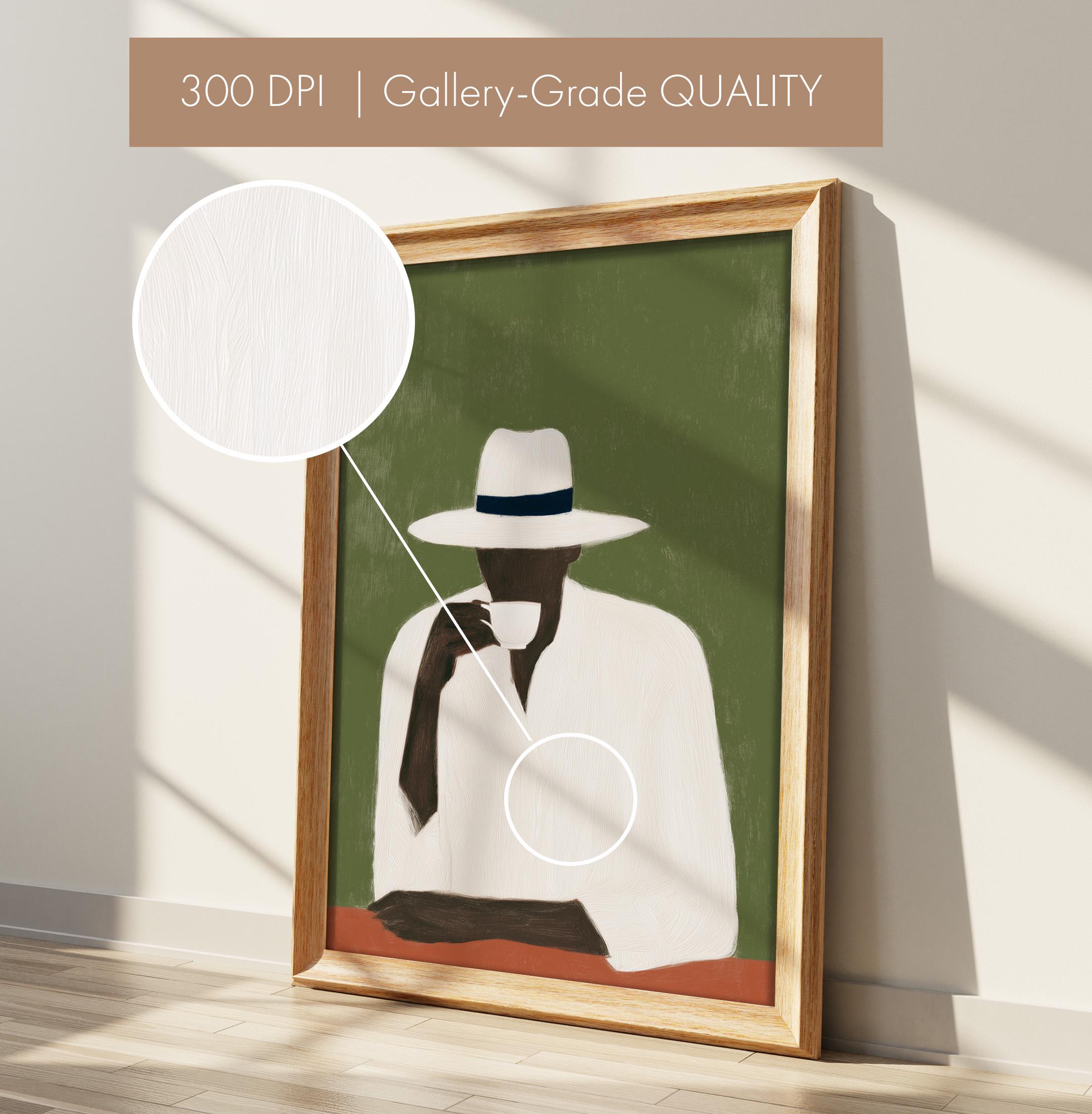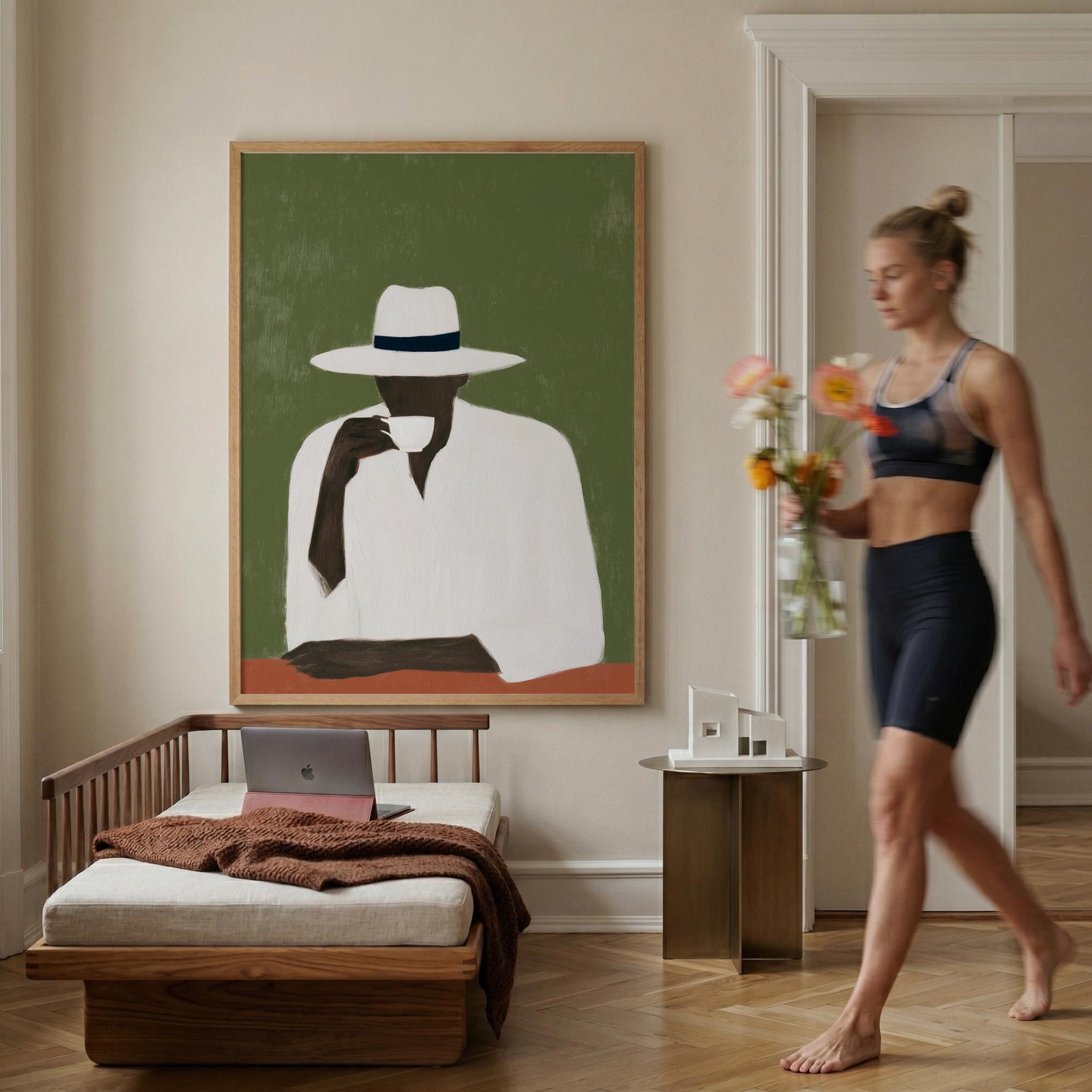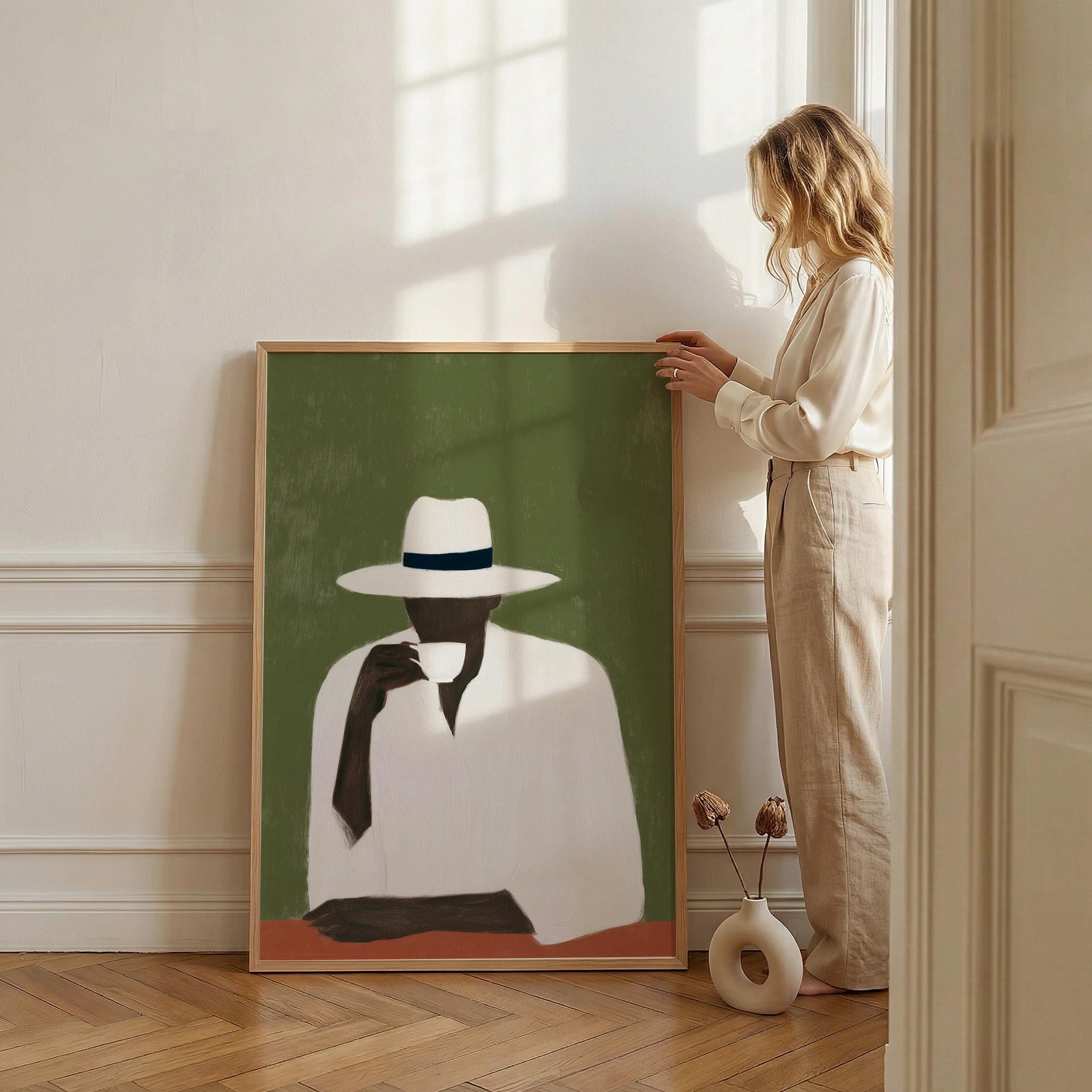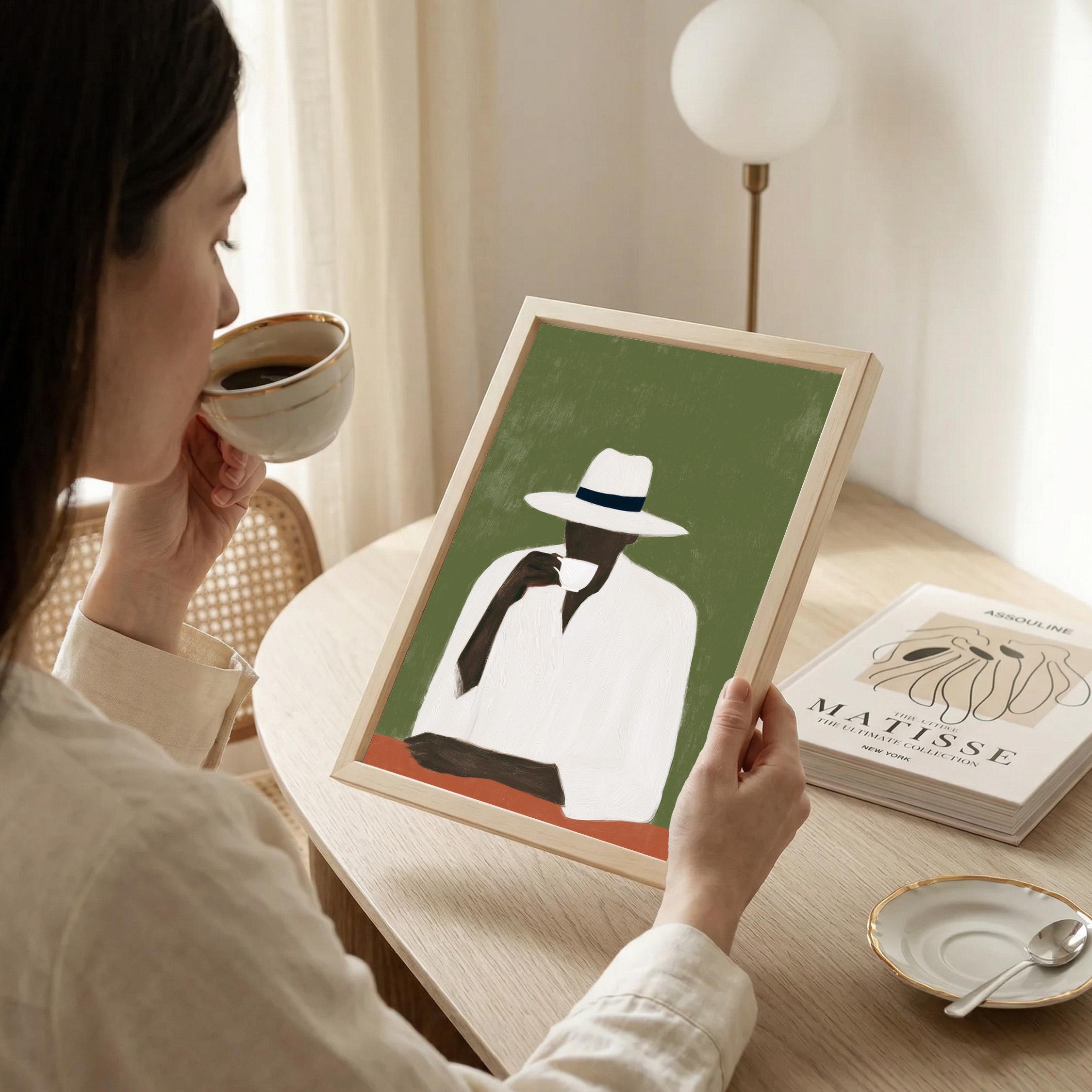A sophisticated portrait of a Black man in a white fedora hat enjoying a peaceful coffee moment, painted in elegant minimalist style against an olive green background with warm terracotta tones.