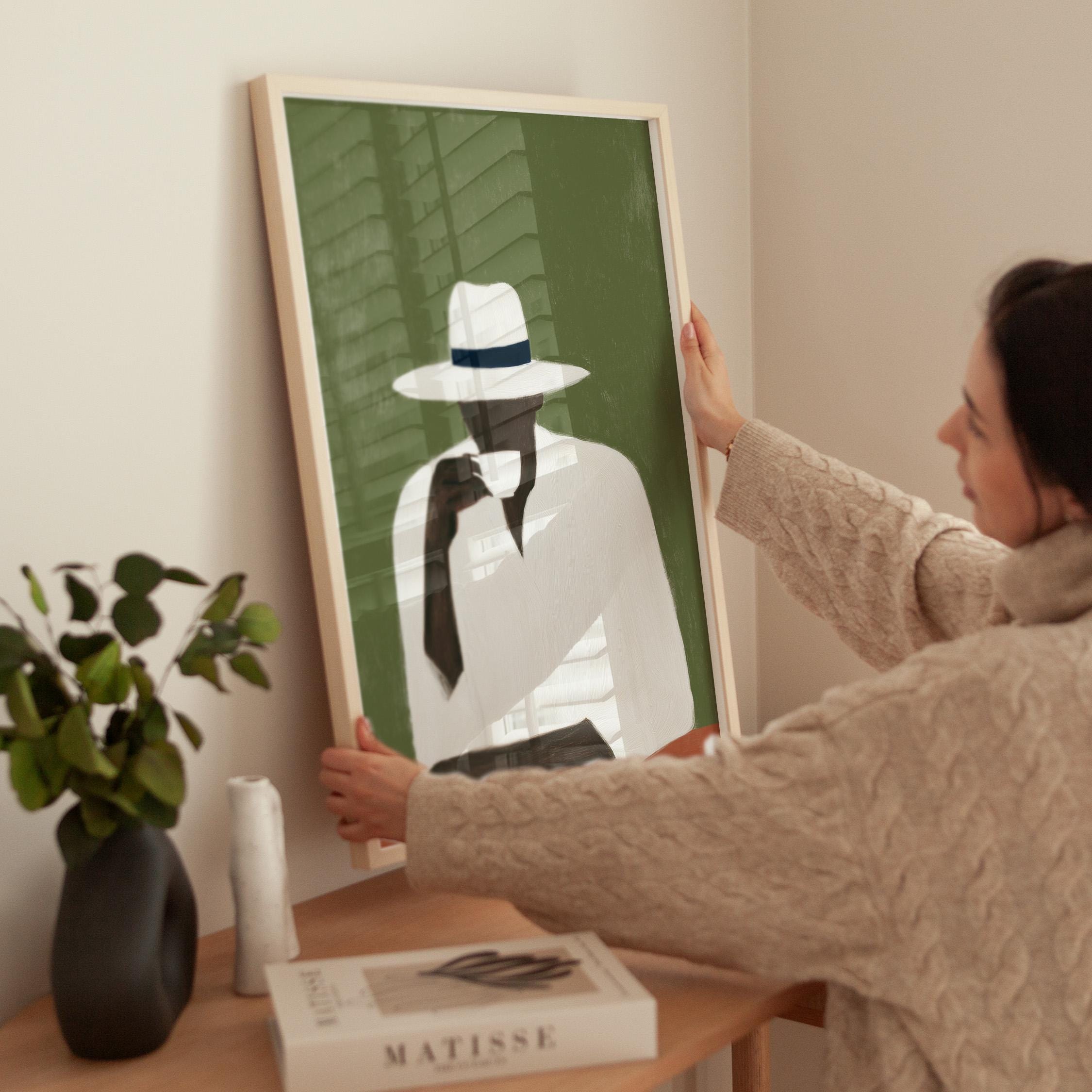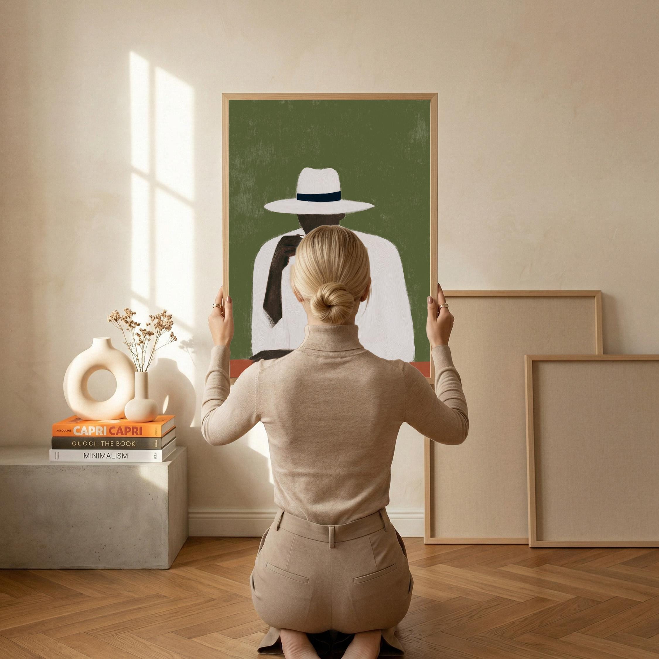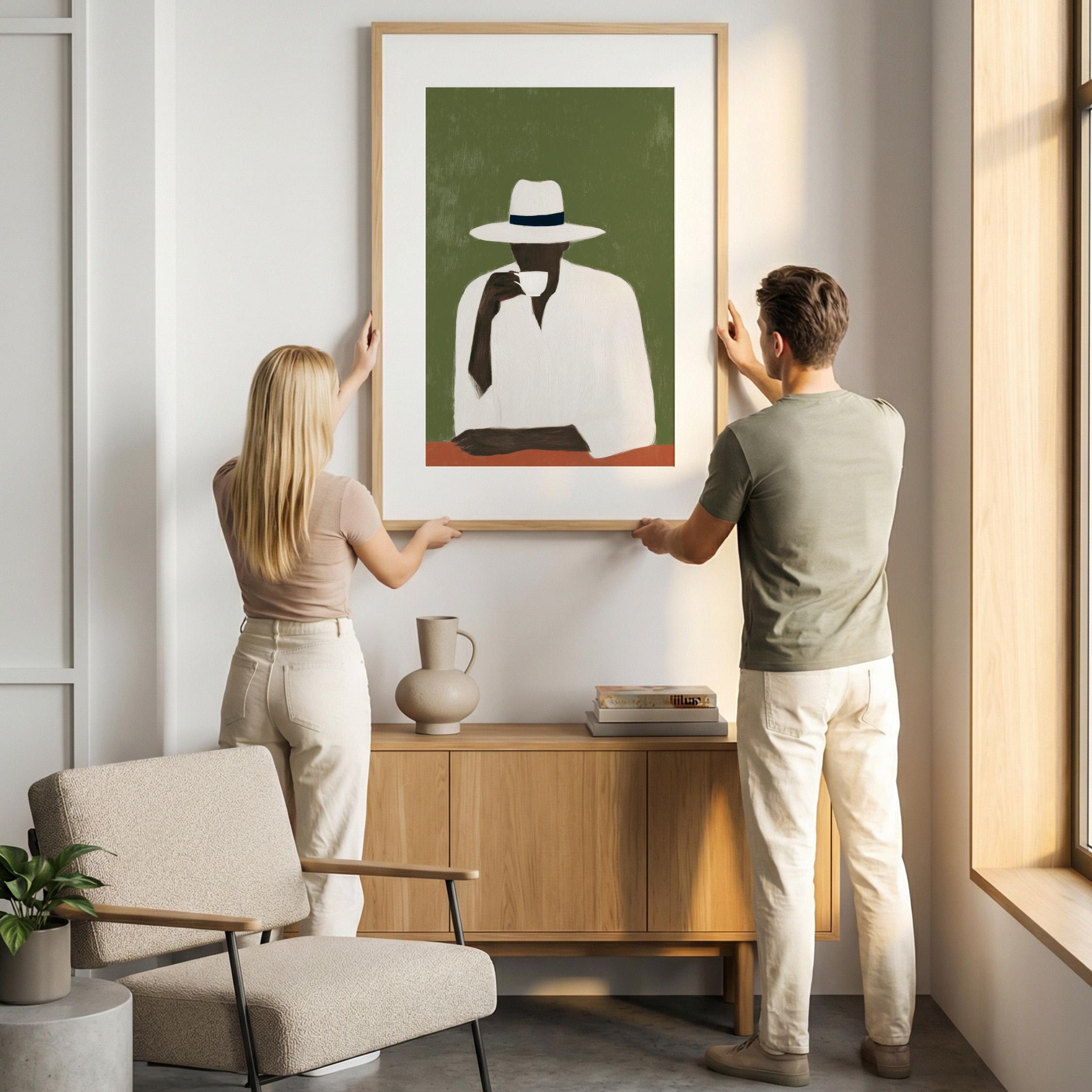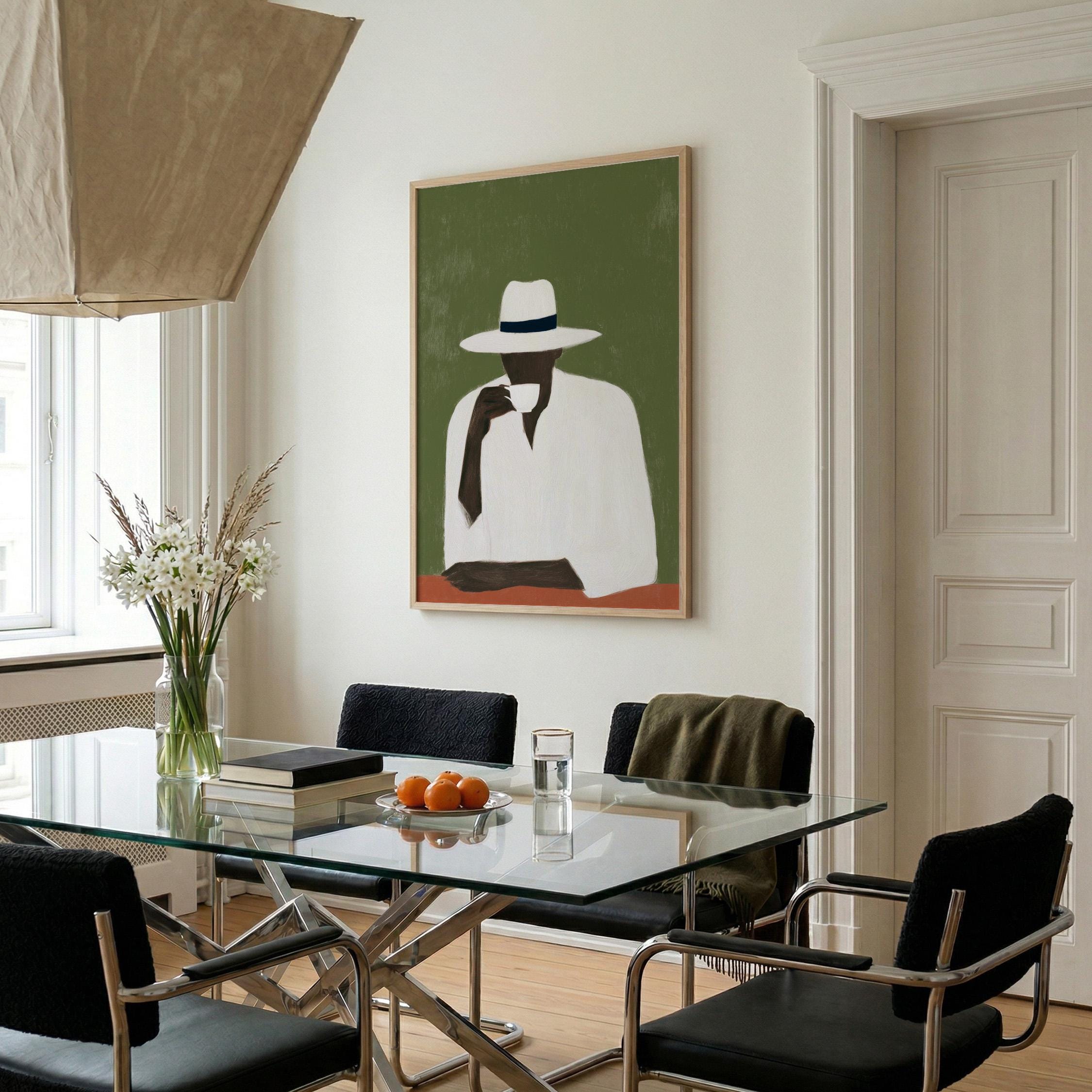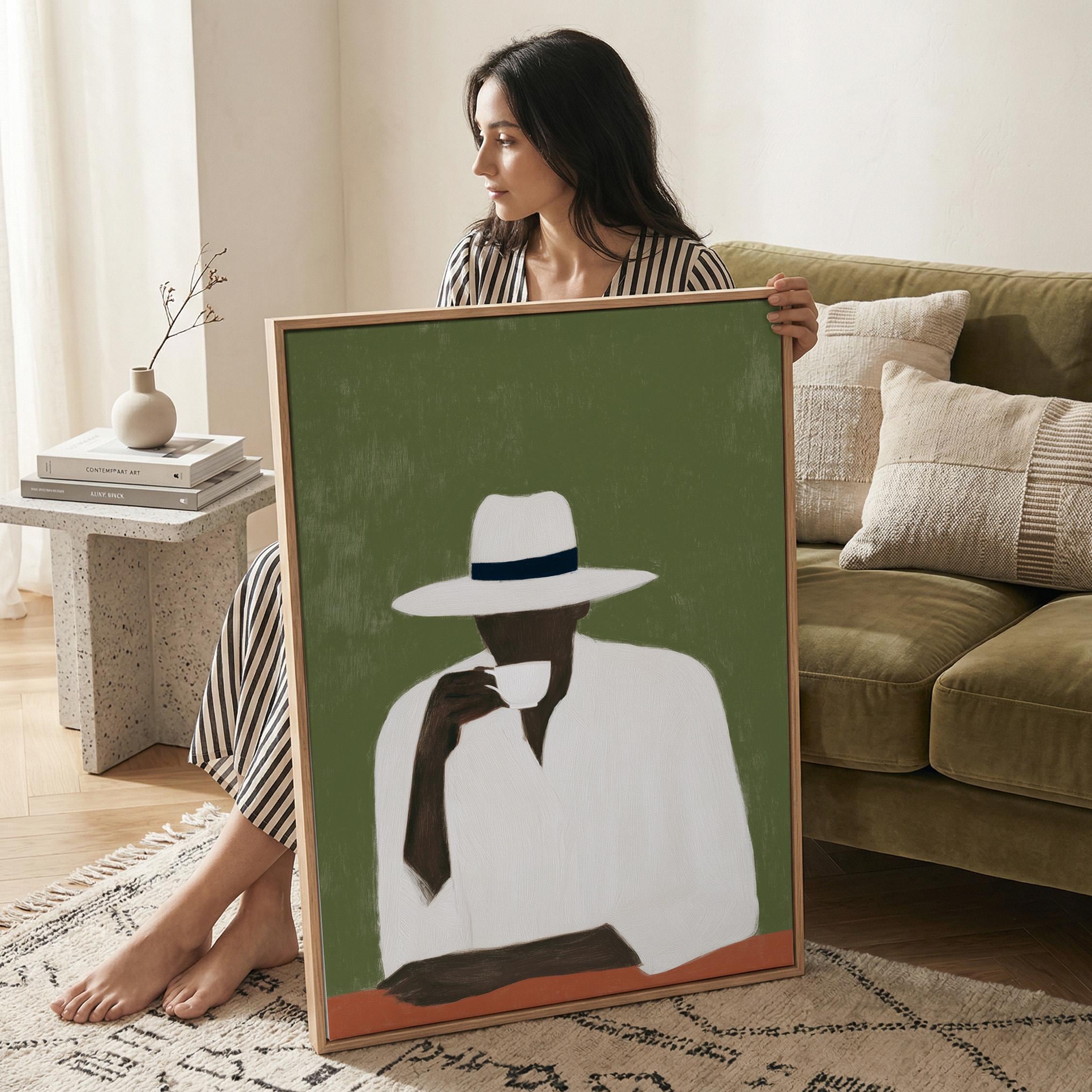 A sophisticated portrait of a Black man in a white fedora hat enjoying a peaceful coffee moment, painted in elegant minimalist style against an olive green background with warm terracotta tones.