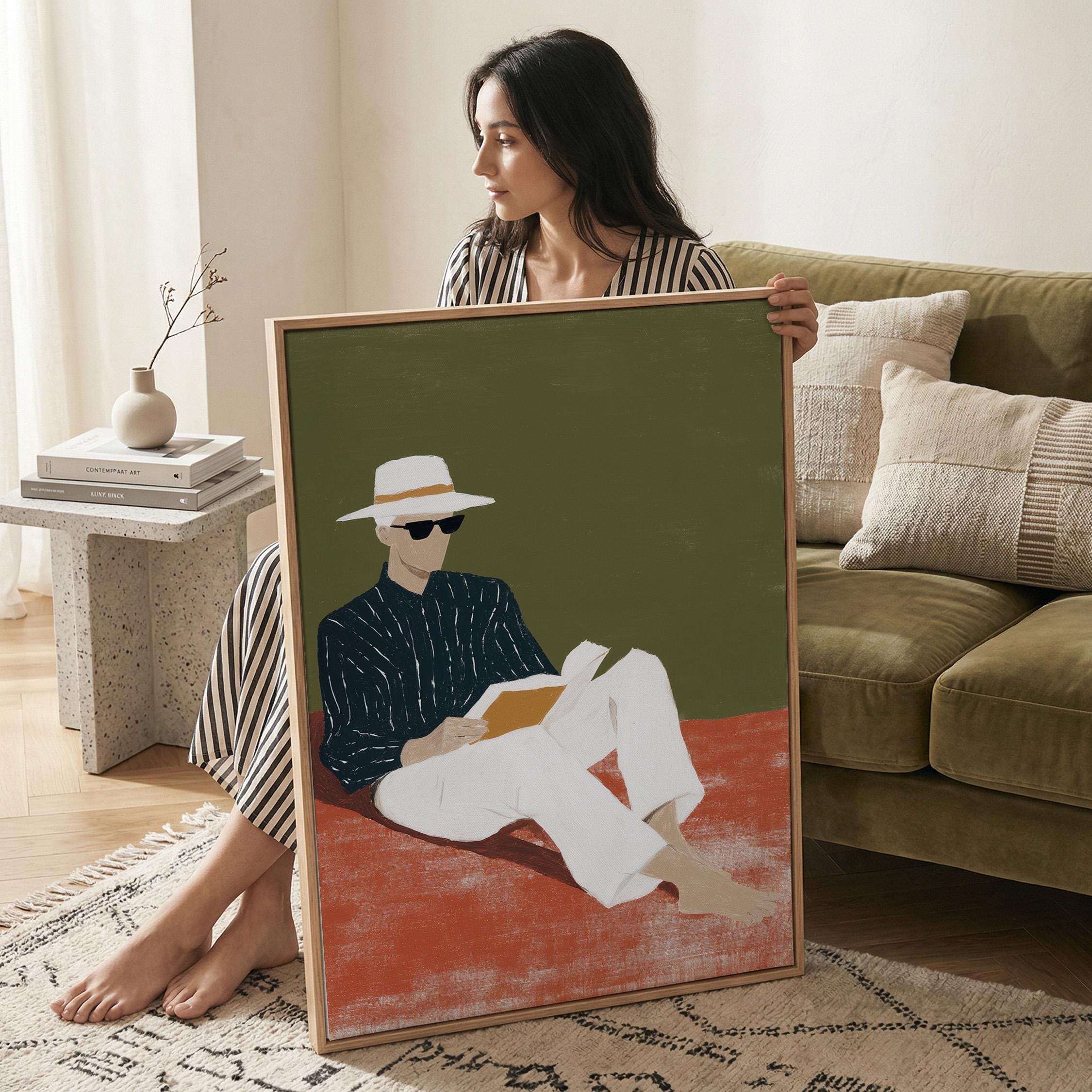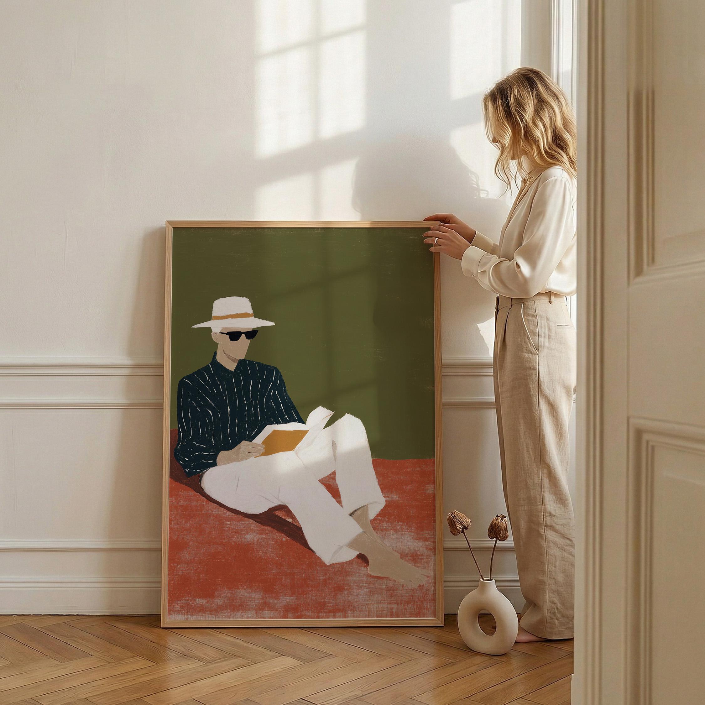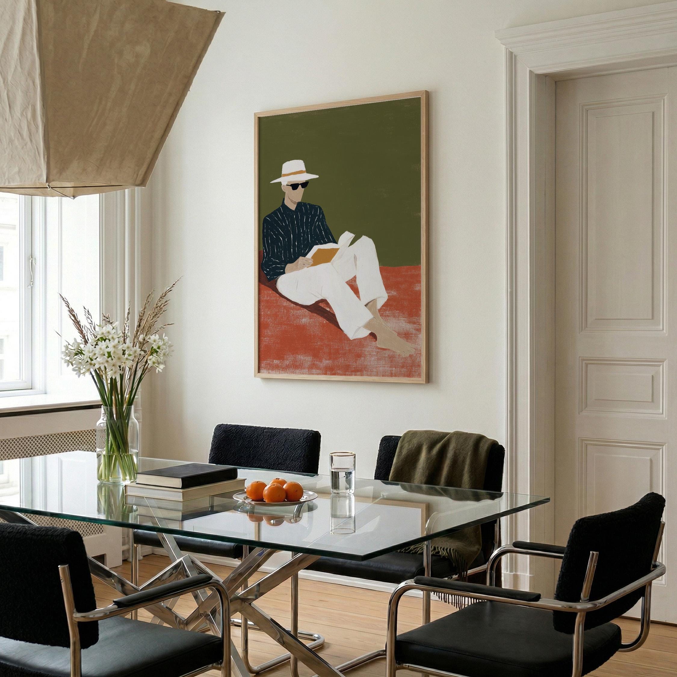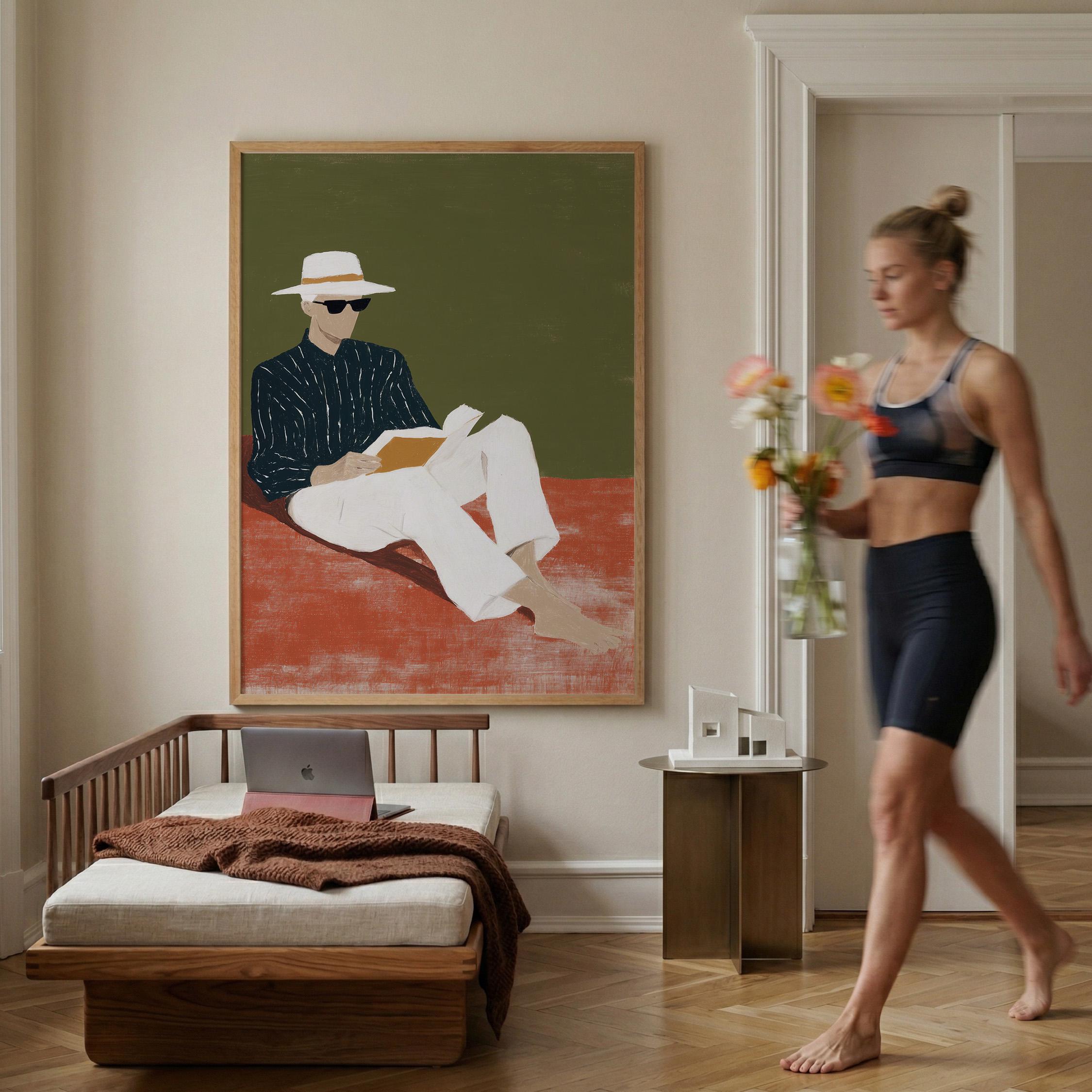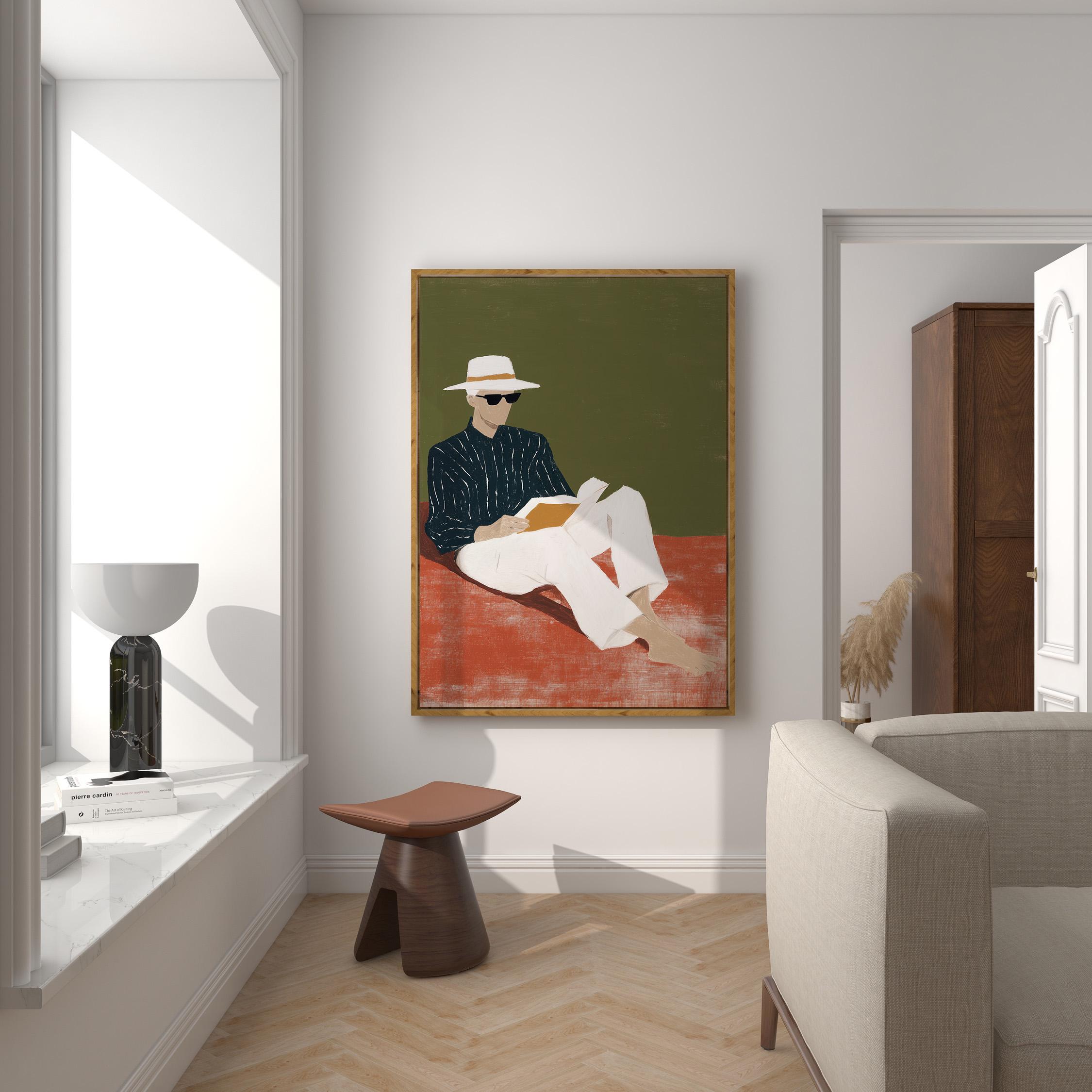 Elevate your space with this sophisticated reading wall art featuring a stylish figure immersed in a book against warm olive and terracotta tones. Perfect for book lovers, home libraries, offices, or living rooms seeking refined contemporary style.