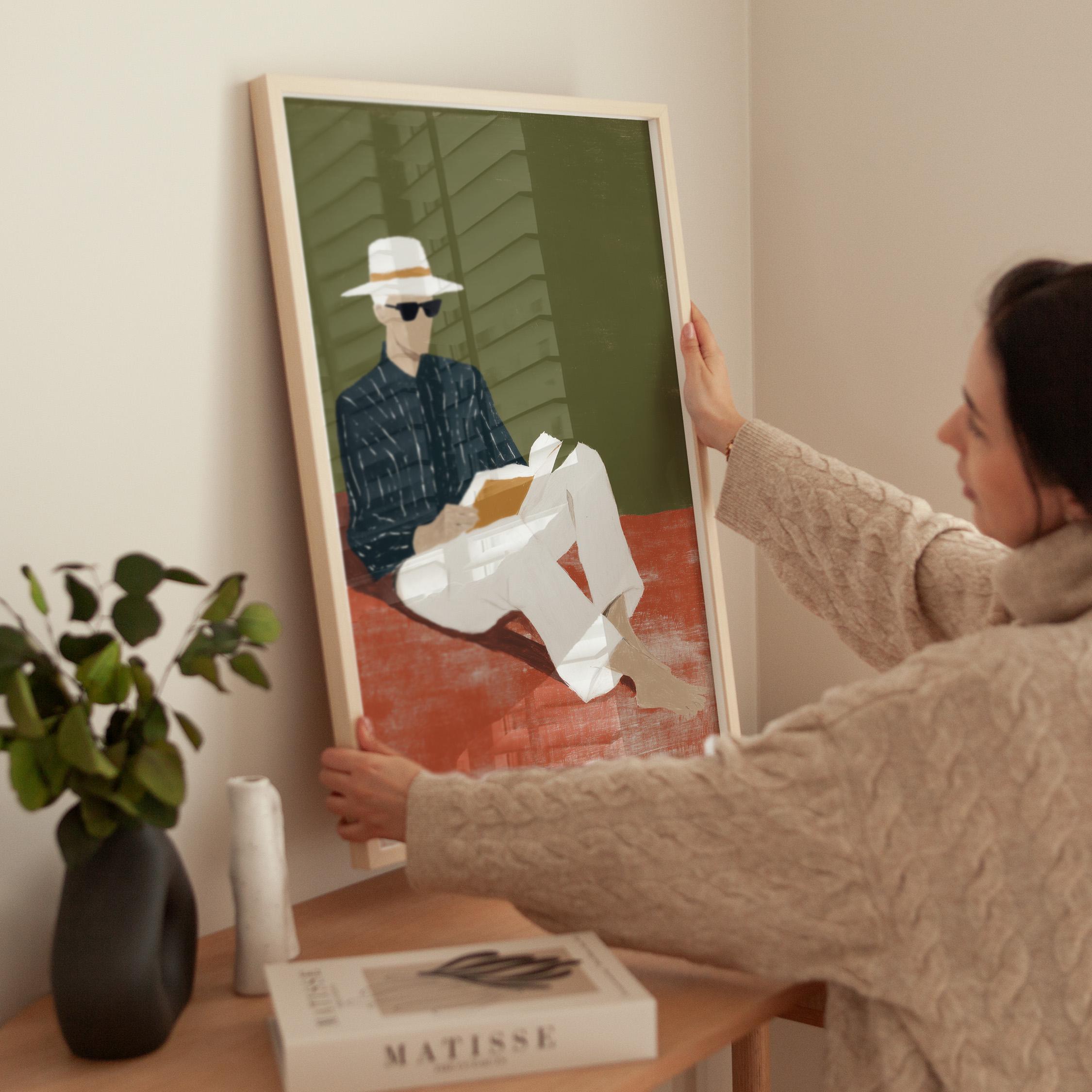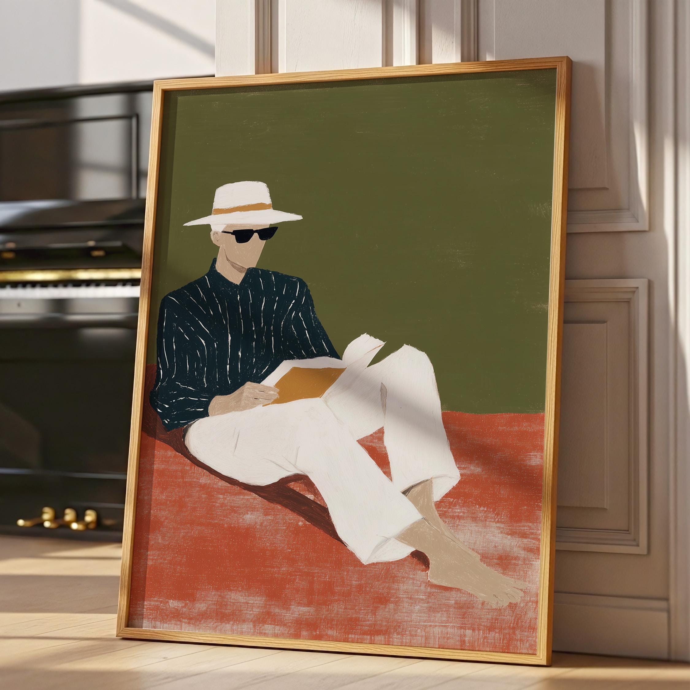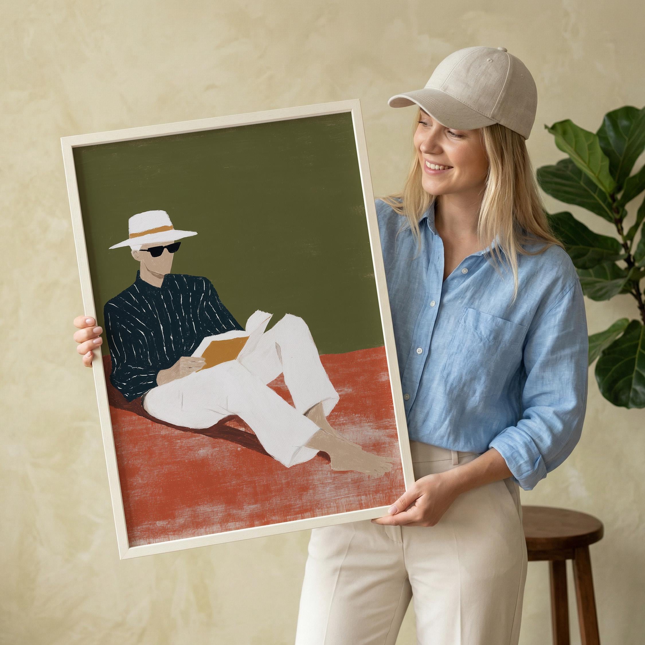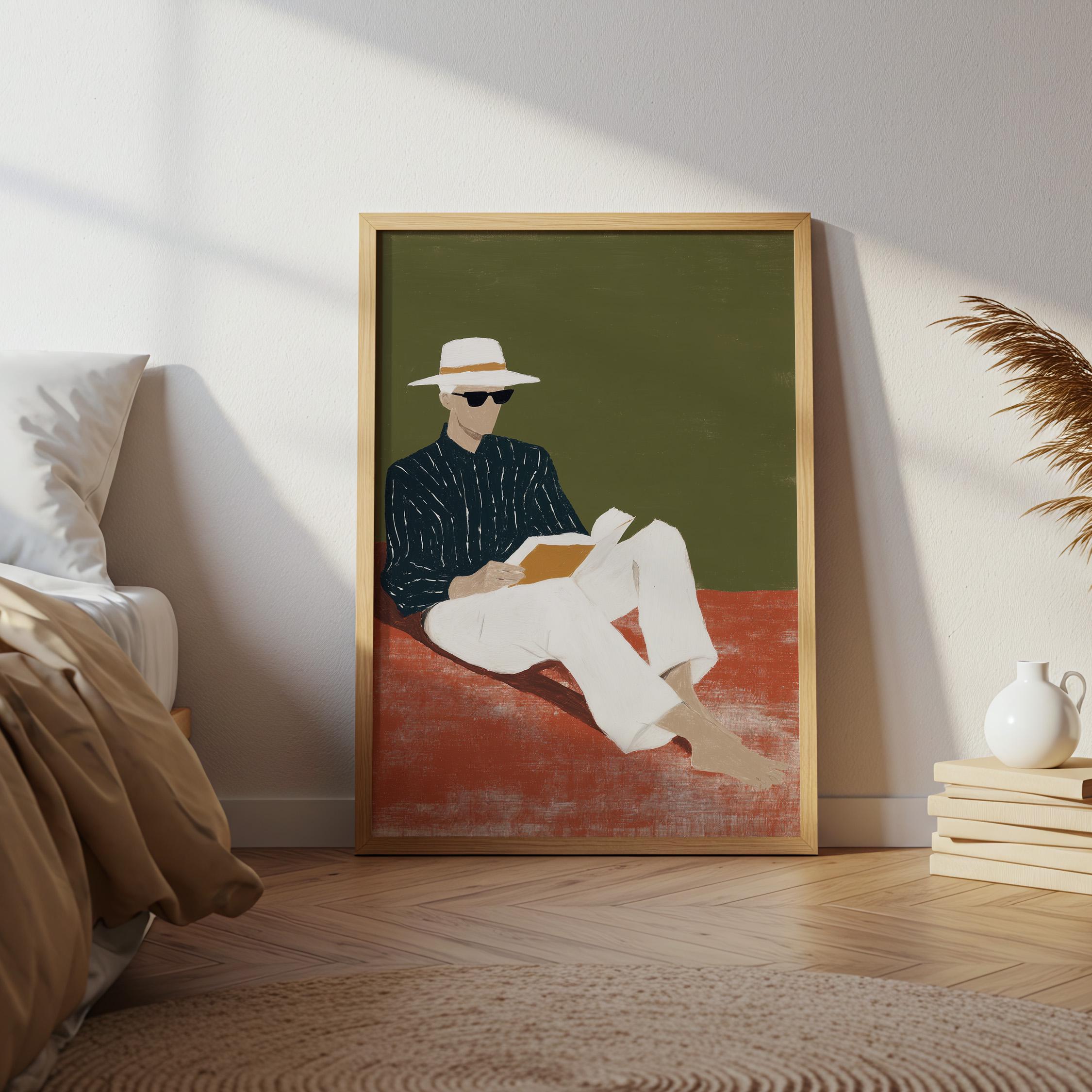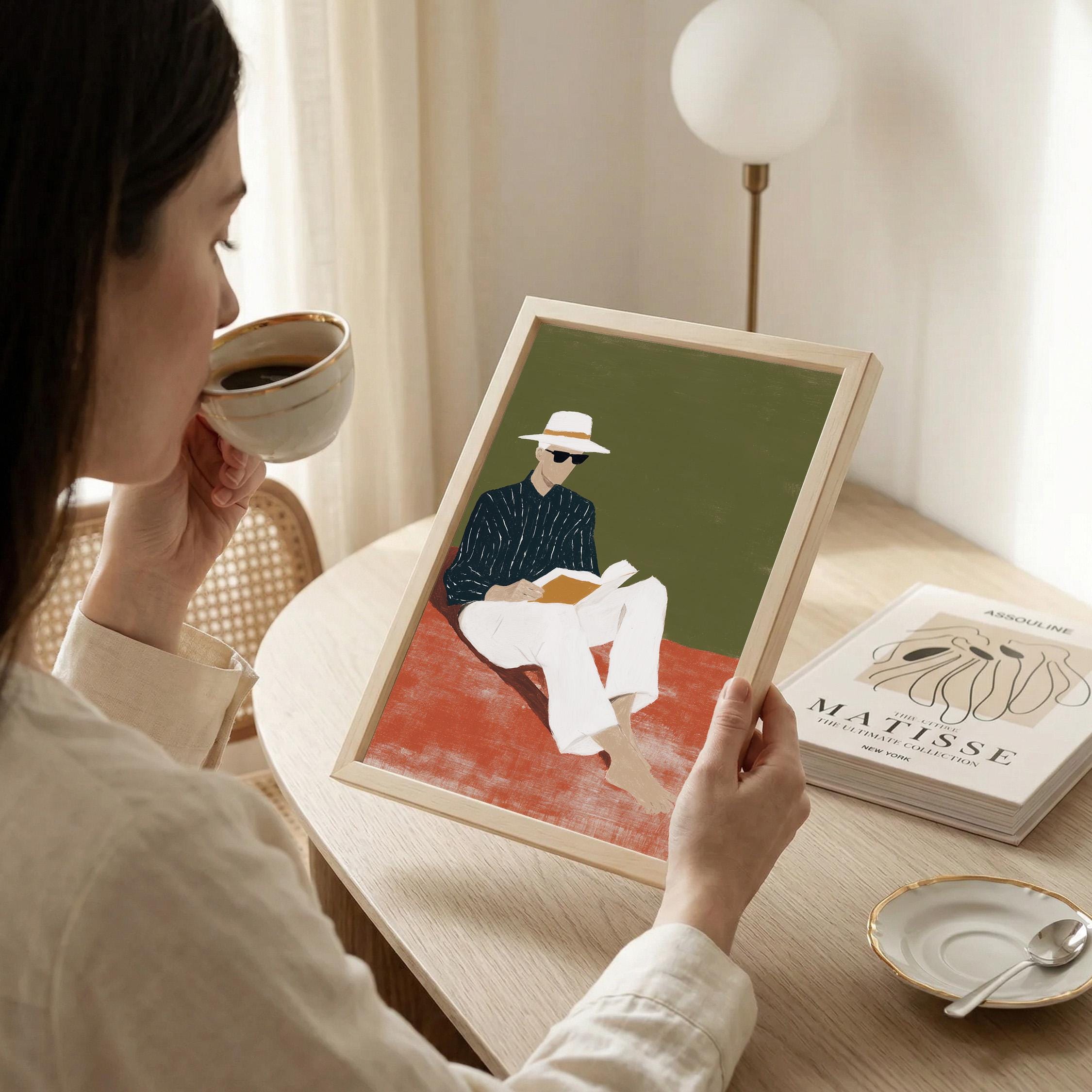 Elevate your space with this sophisticated reading wall art featuring a stylish figure immersed in a book against warm olive and terracotta tones. Perfect for book lovers, home libraries, offices, or living rooms seeking refined contemporary style.