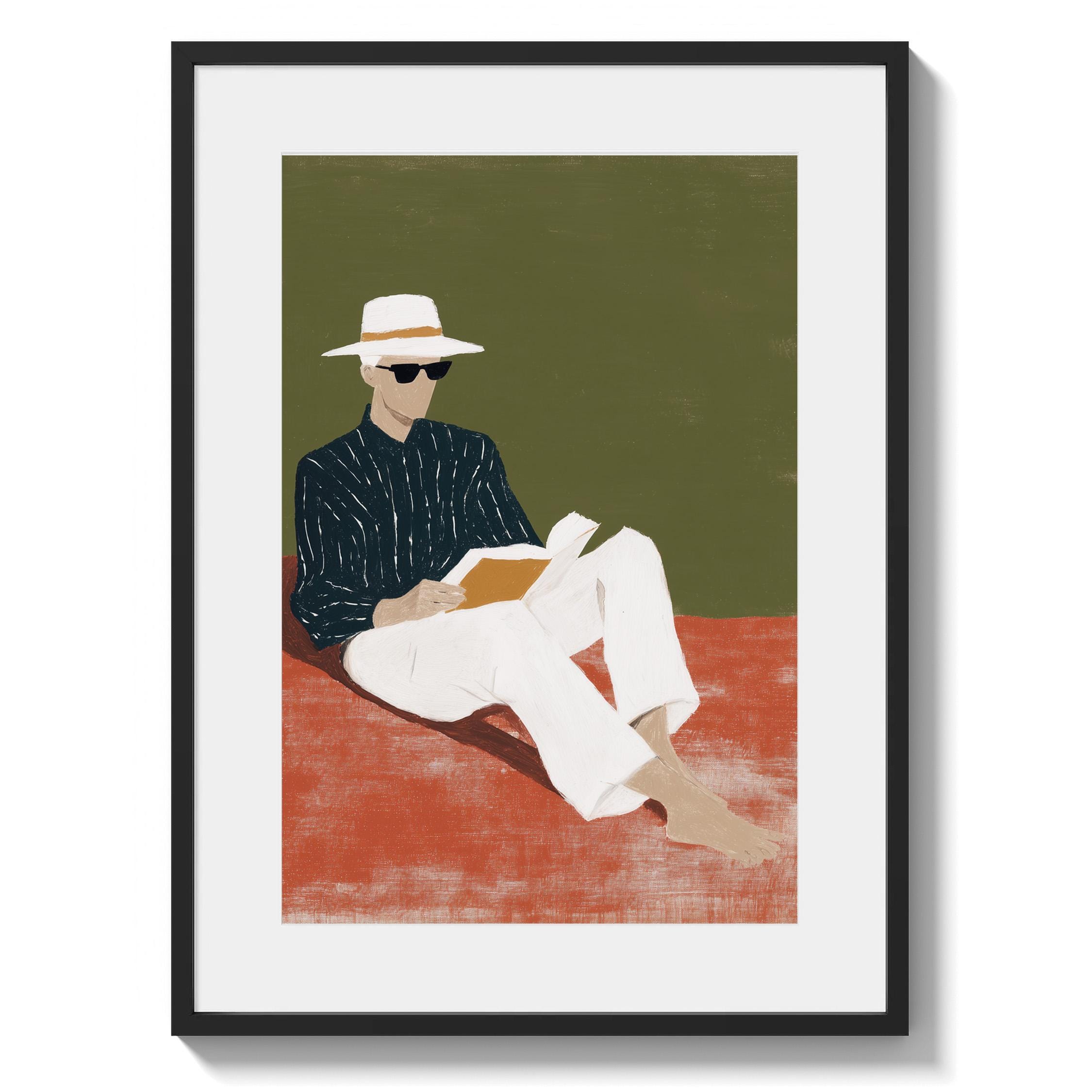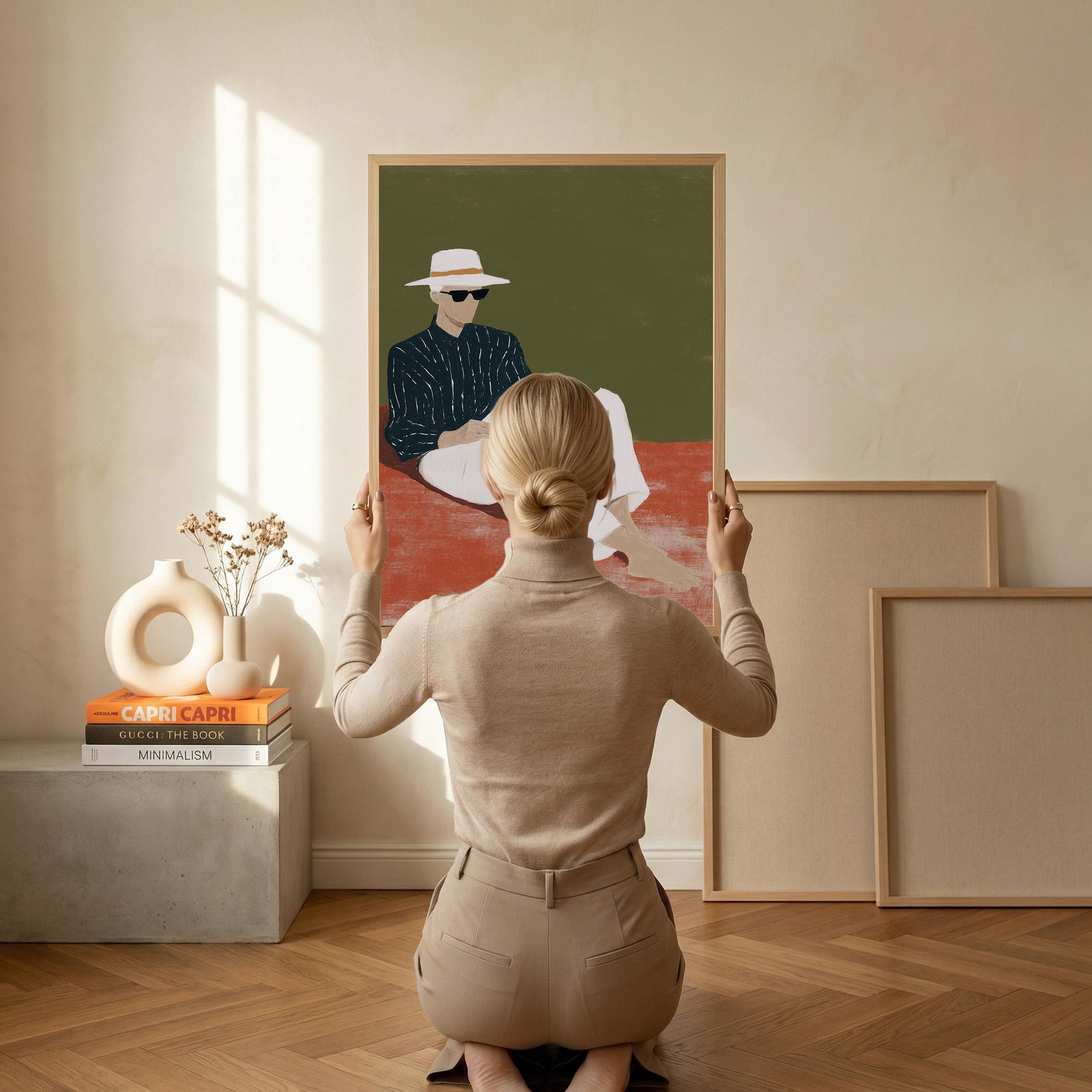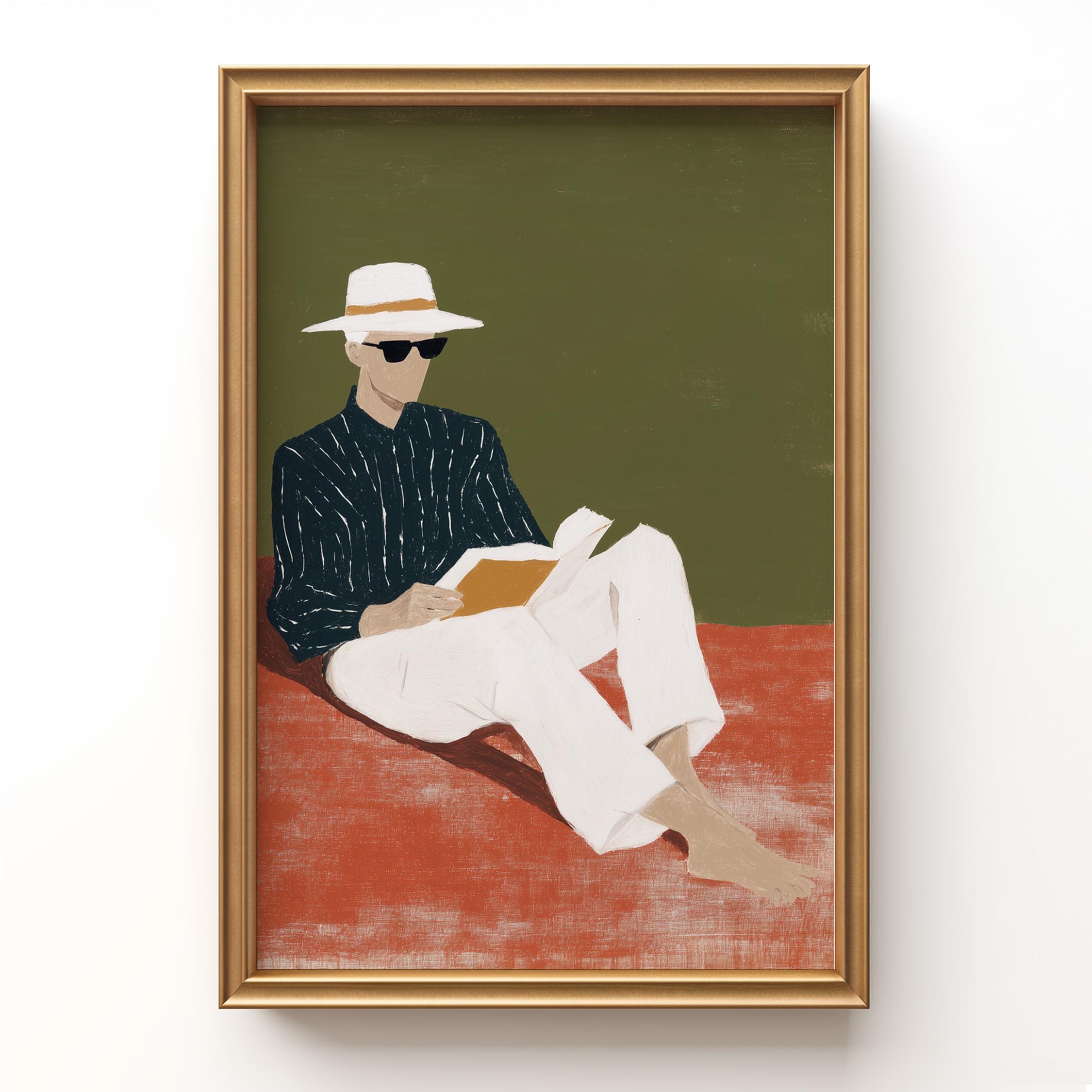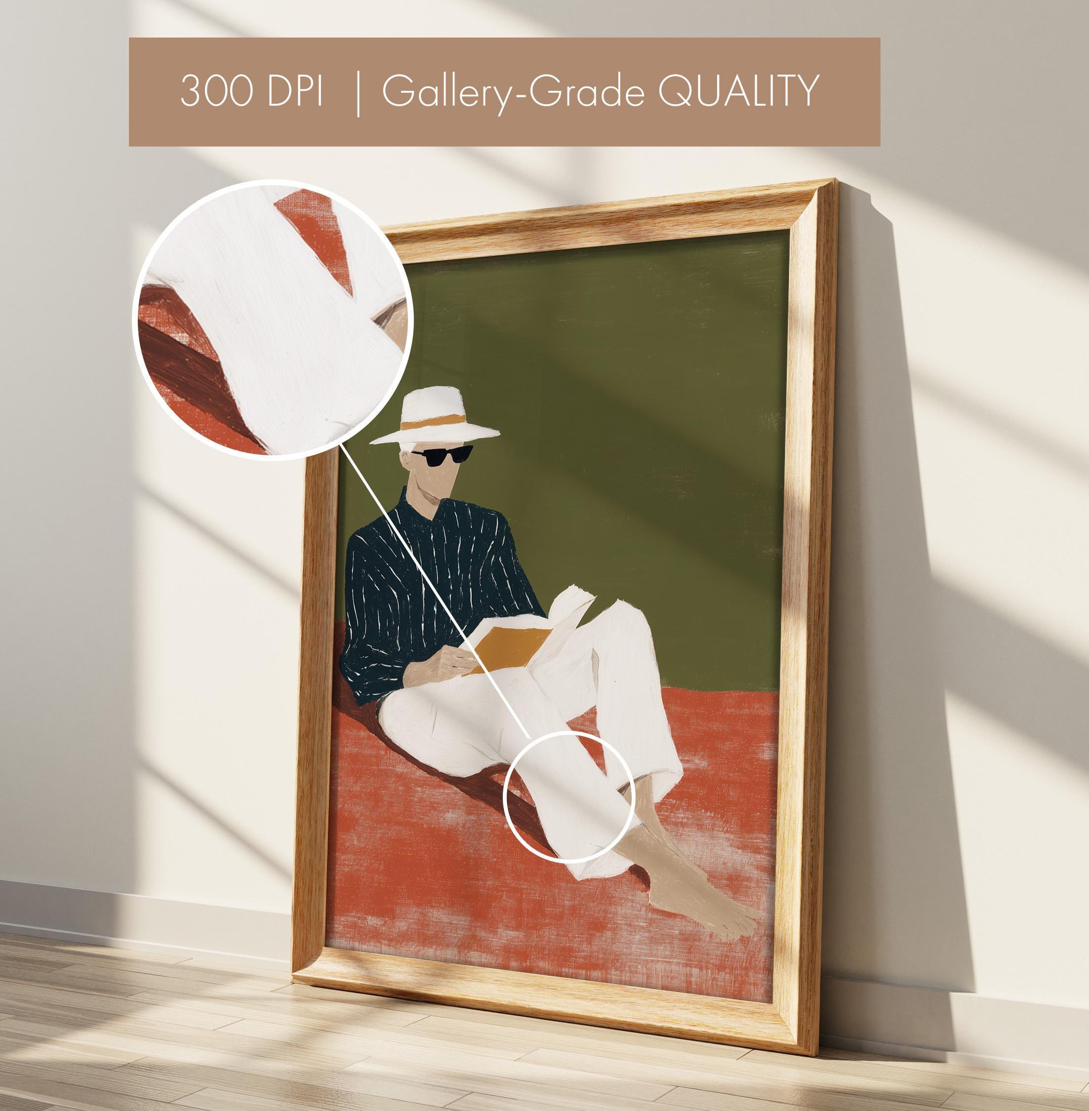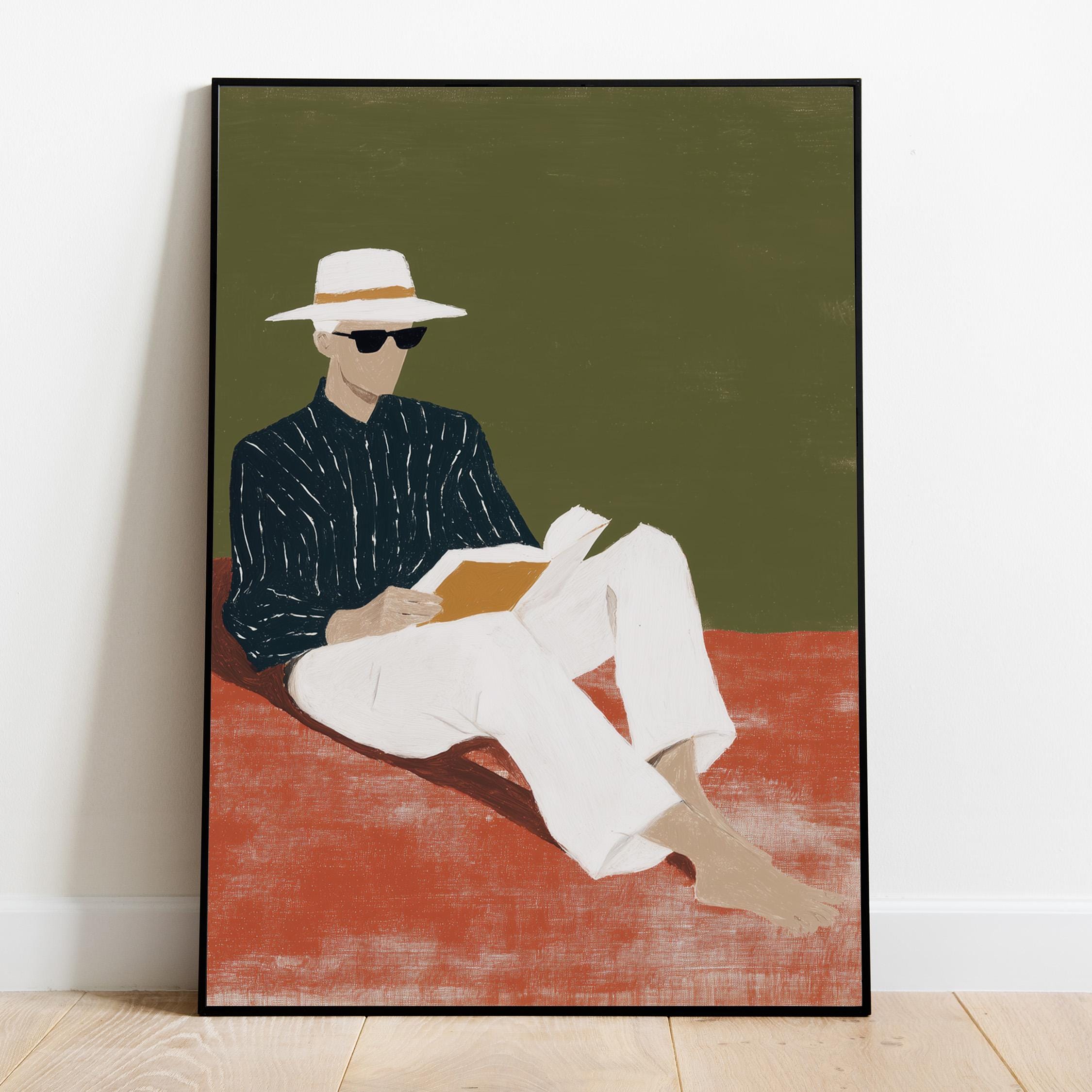 Elevate your space with this sophisticated reading wall art featuring a stylish figure immersed in a book against warm olive and terracotta tones. Perfect for book lovers, home libraries, offices, or living rooms seeking refined contemporary style.