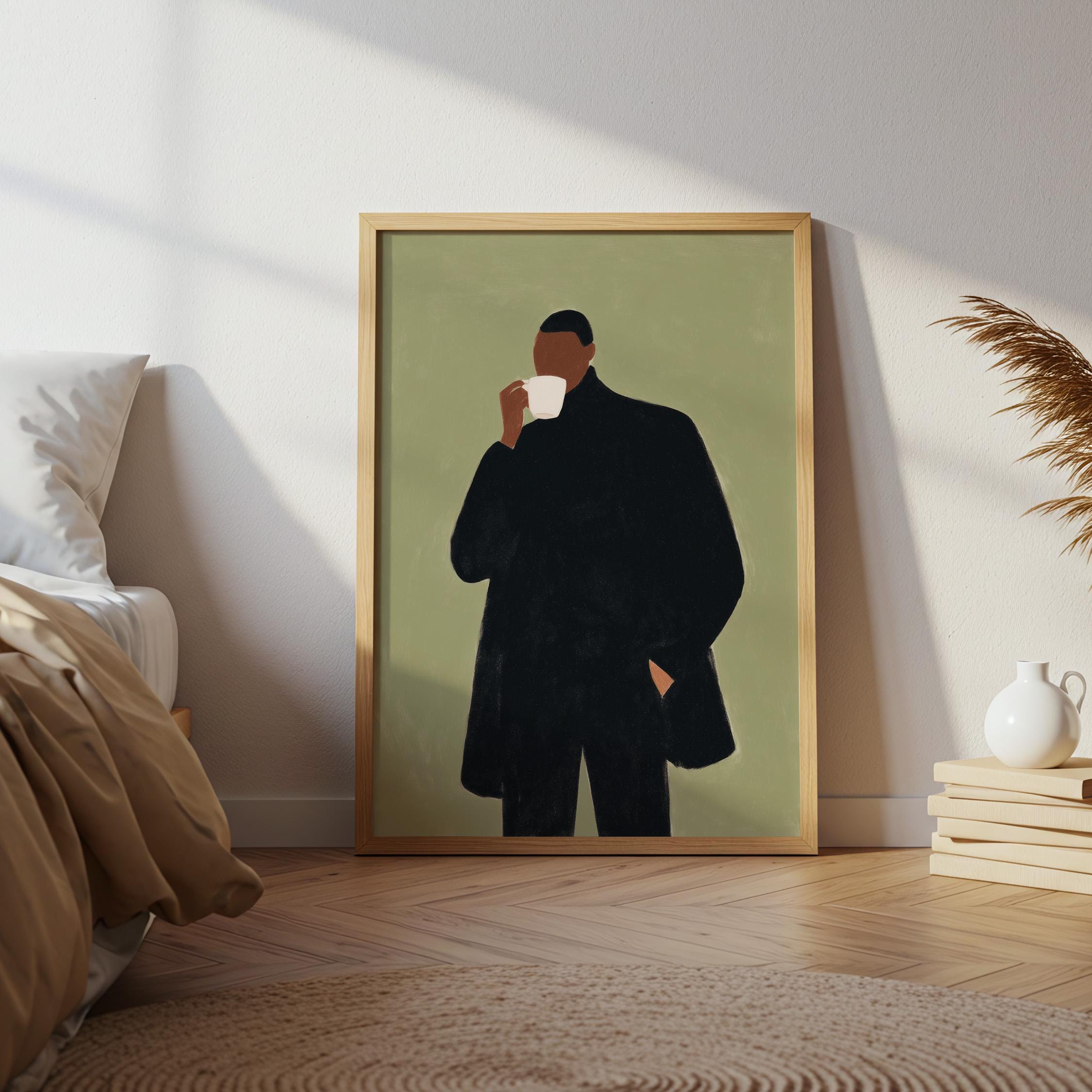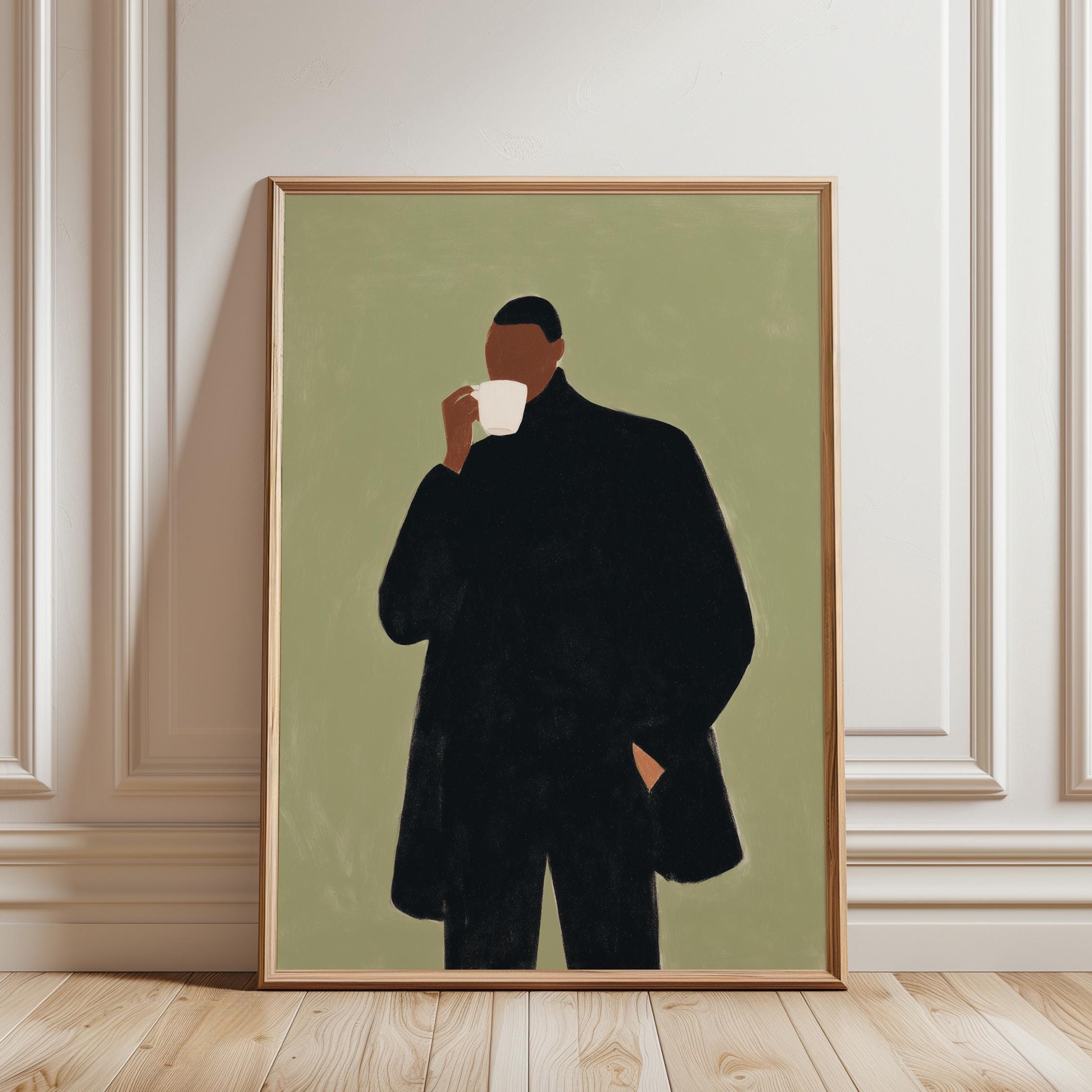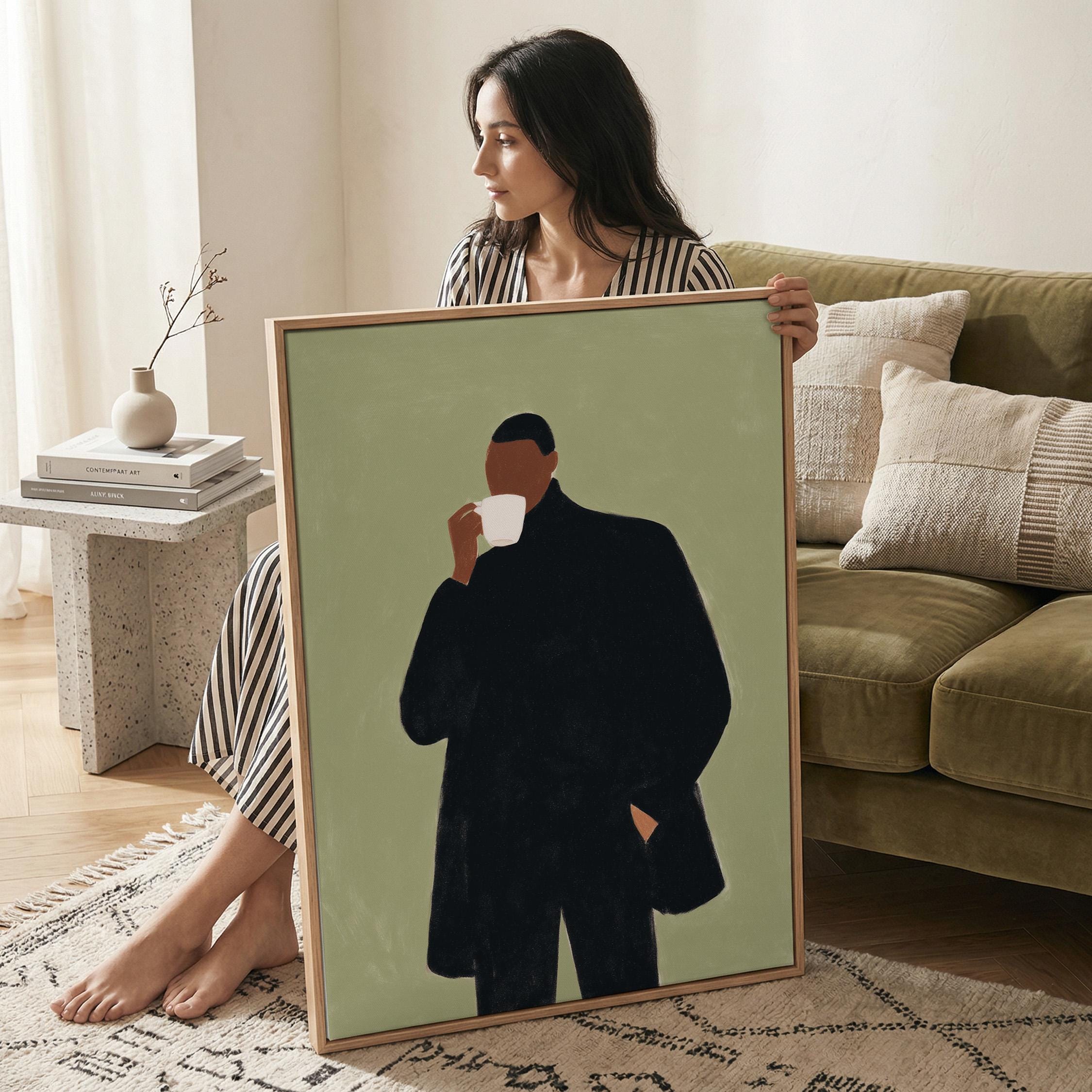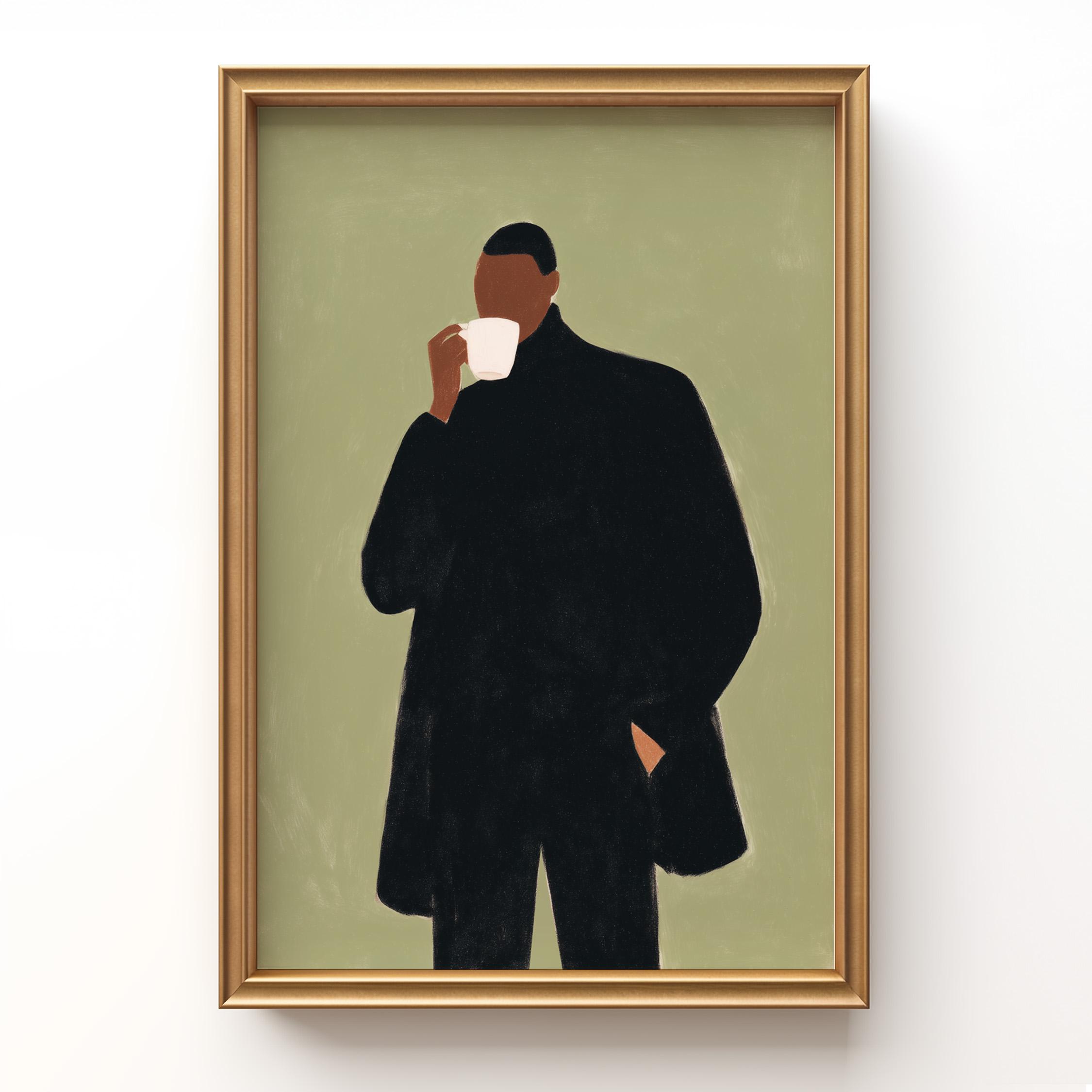 Modern black man portrait art captures quiet morning moments in minimalist style with rich olive tones and contemporary sophistication. Ideal for coffee enthusiasts, urban apartments, and anyone seeking refined masculine decor for living rooms or home offices.