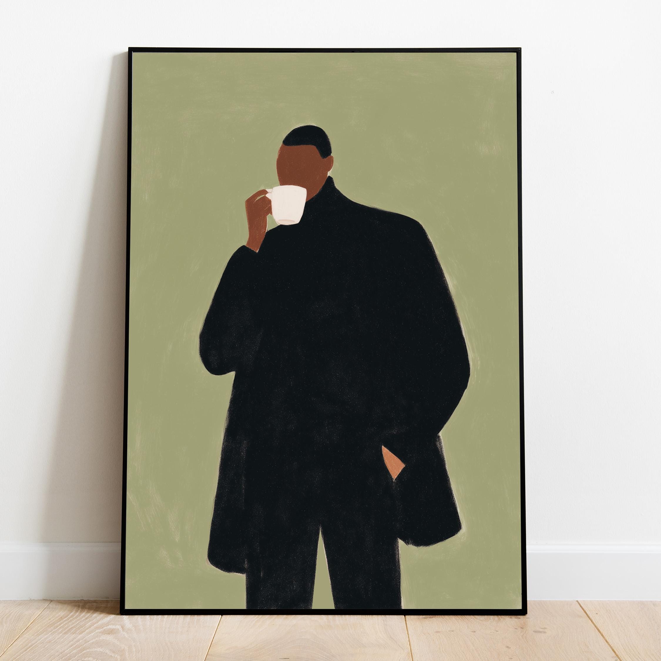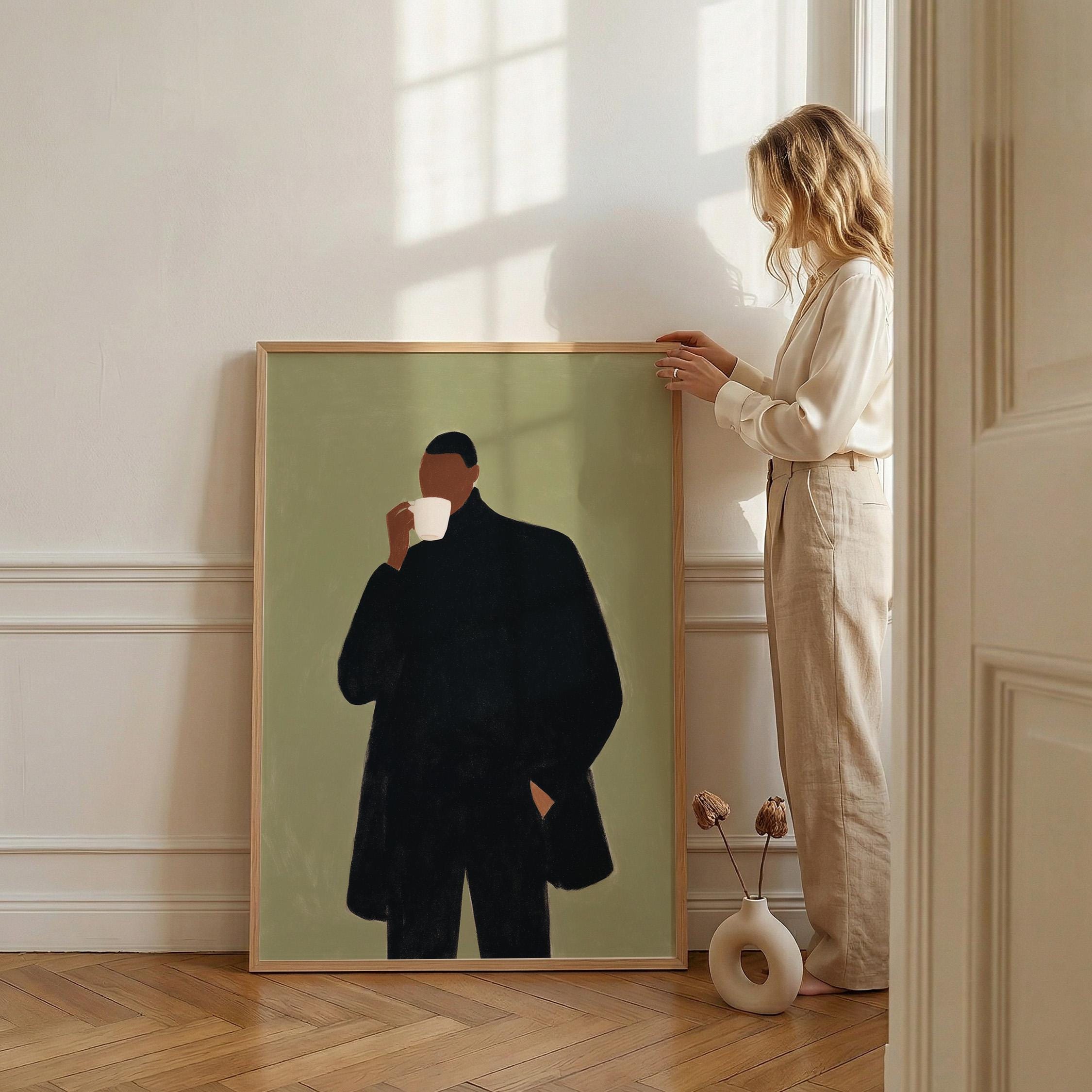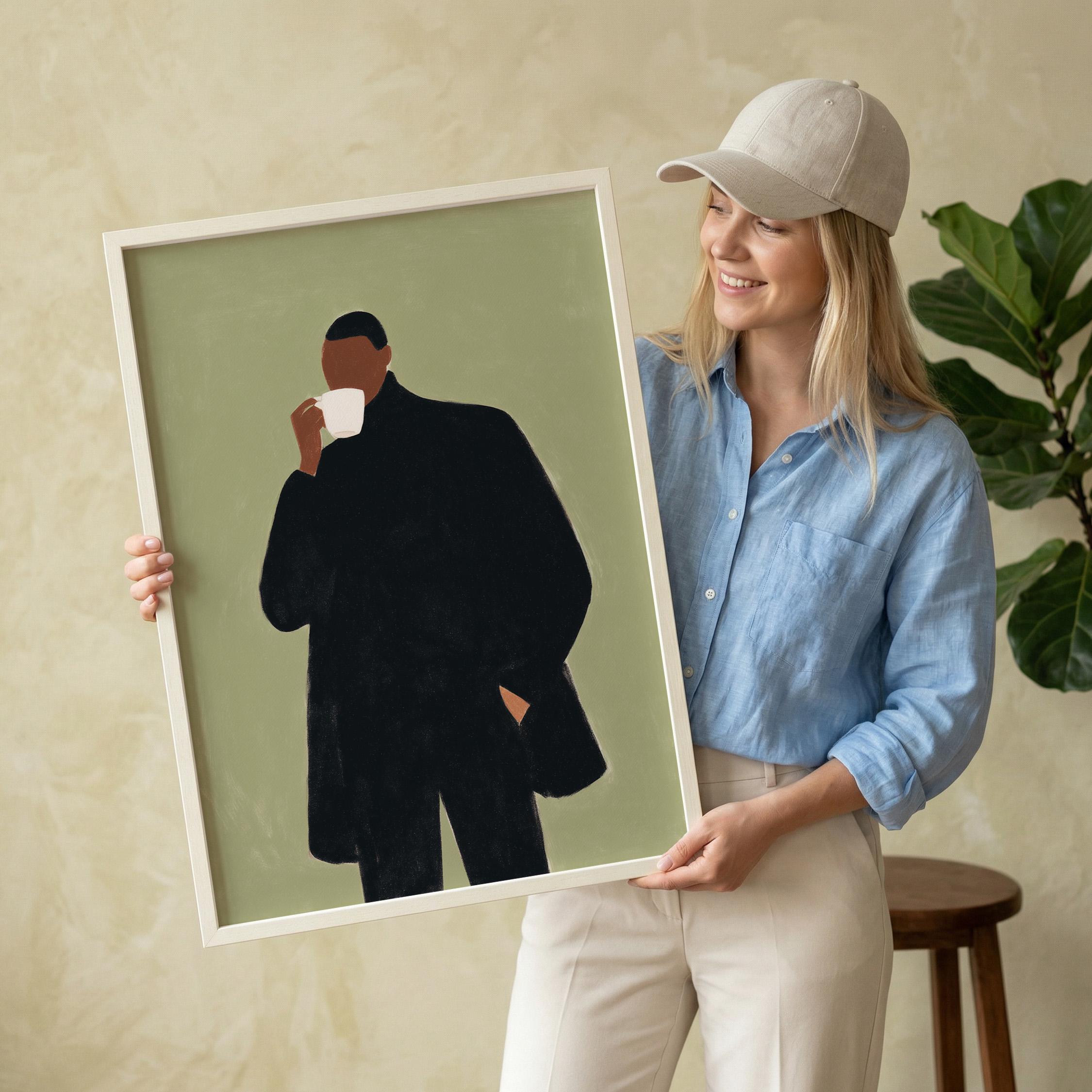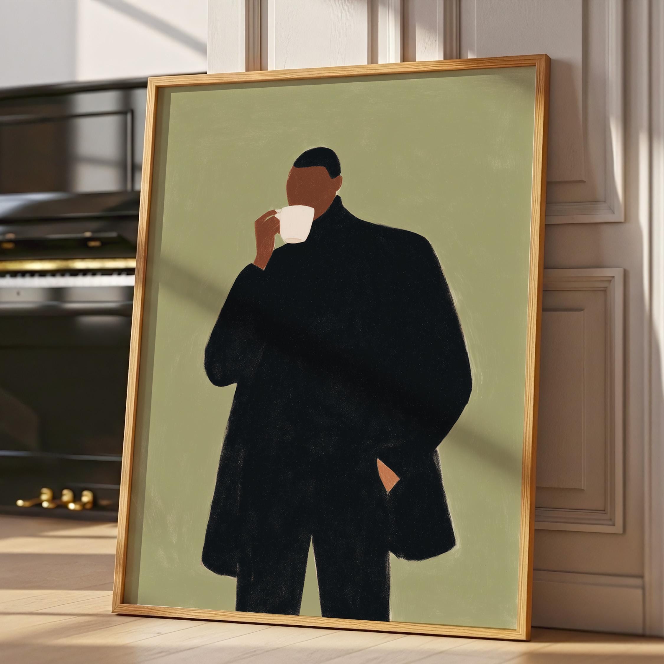 Modern black man portrait art captures quiet morning moments in minimalist style with rich olive tones and contemporary sophistication. Ideal for coffee enthusiasts, urban apartments, and anyone seeking refined masculine decor for living rooms or home offices.