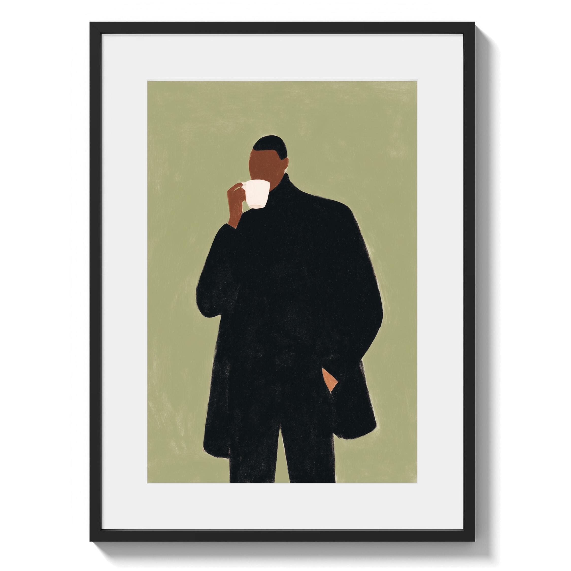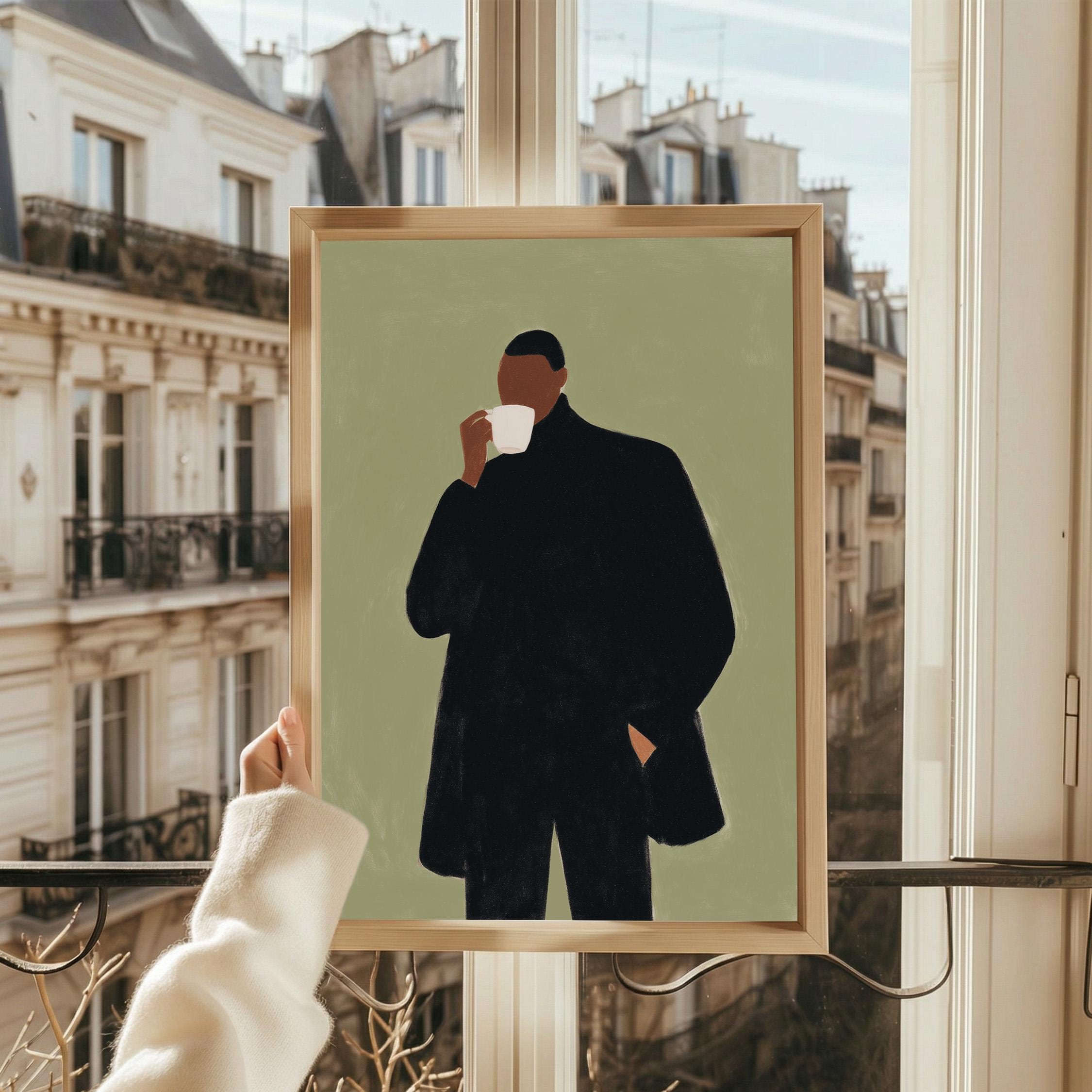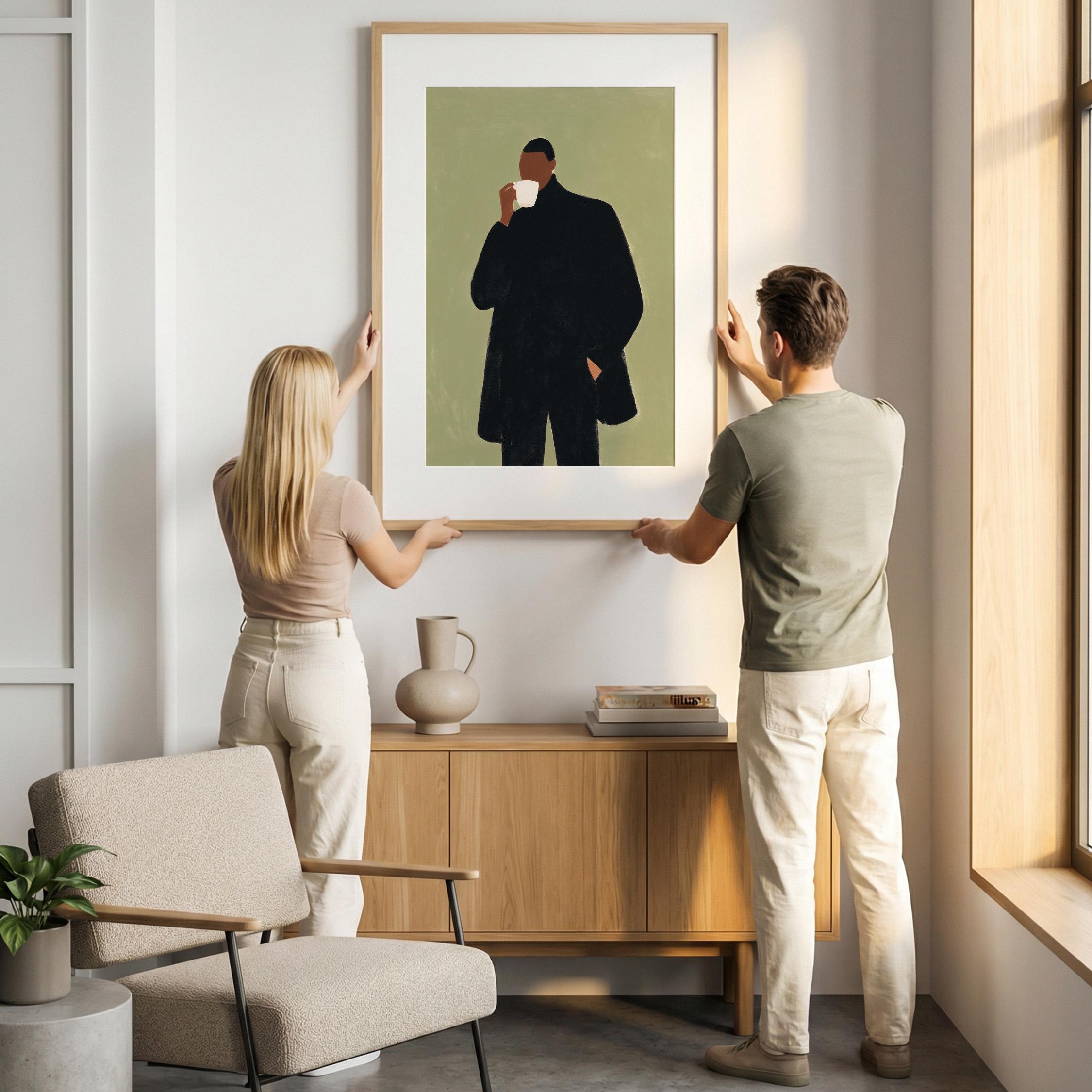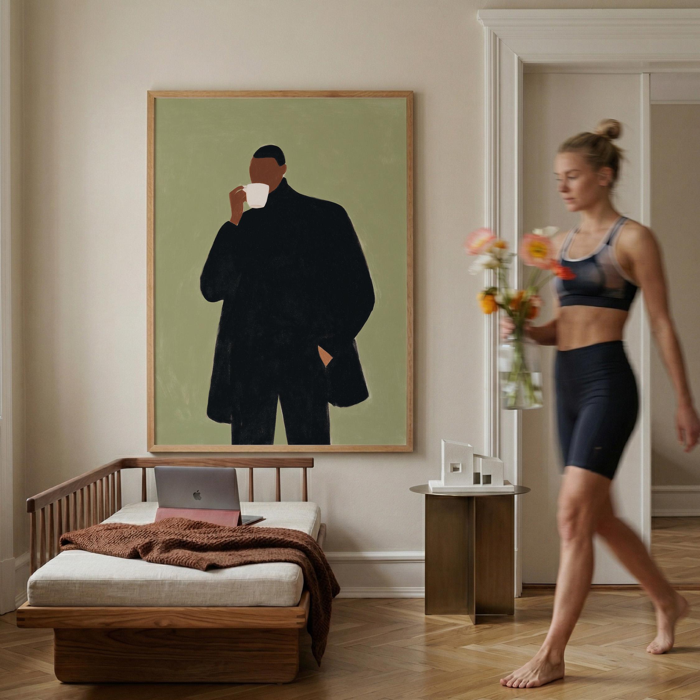 Modern black man portrait art captures quiet morning moments in minimalist style with rich olive tones and contemporary sophistication. Ideal for coffee enthusiasts, urban apartments, and anyone seeking refined masculine decor for living rooms or home offices.