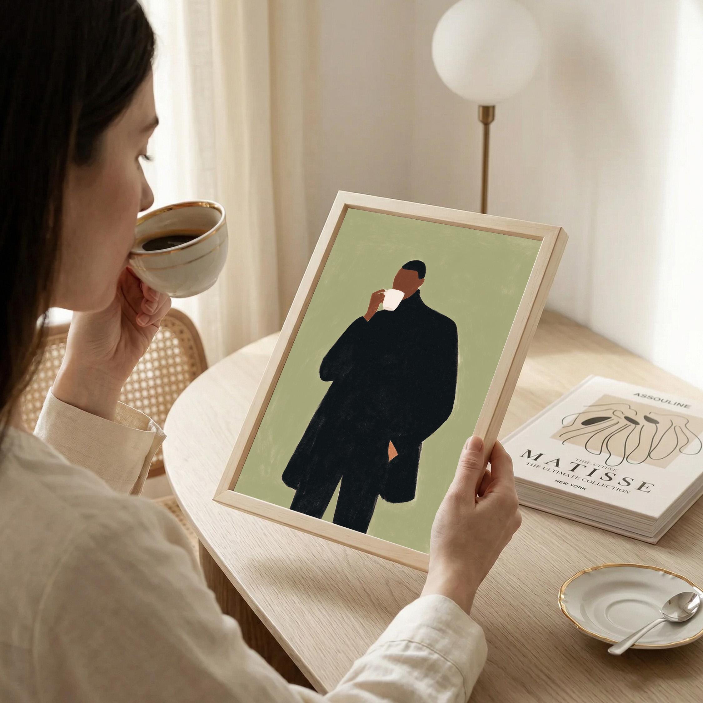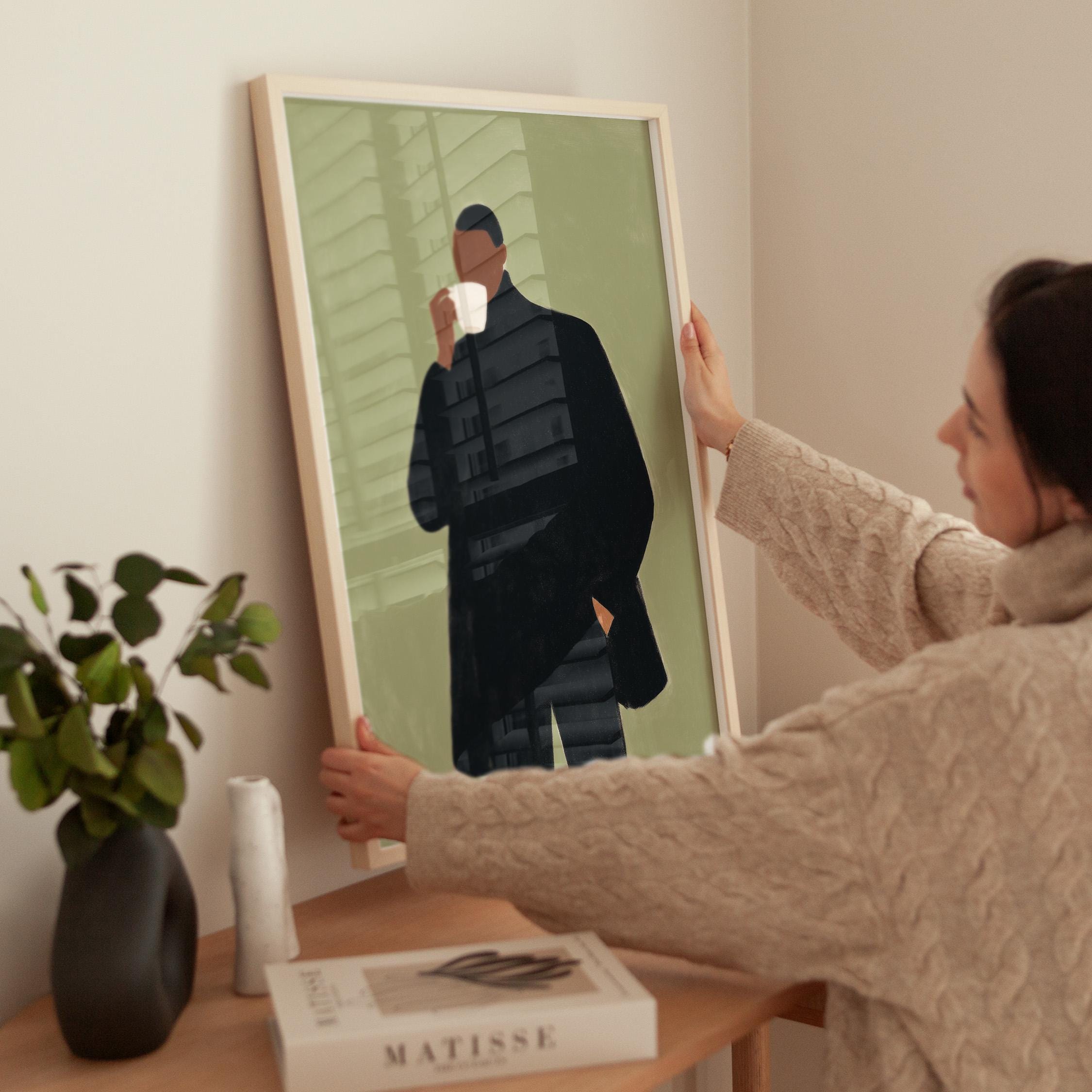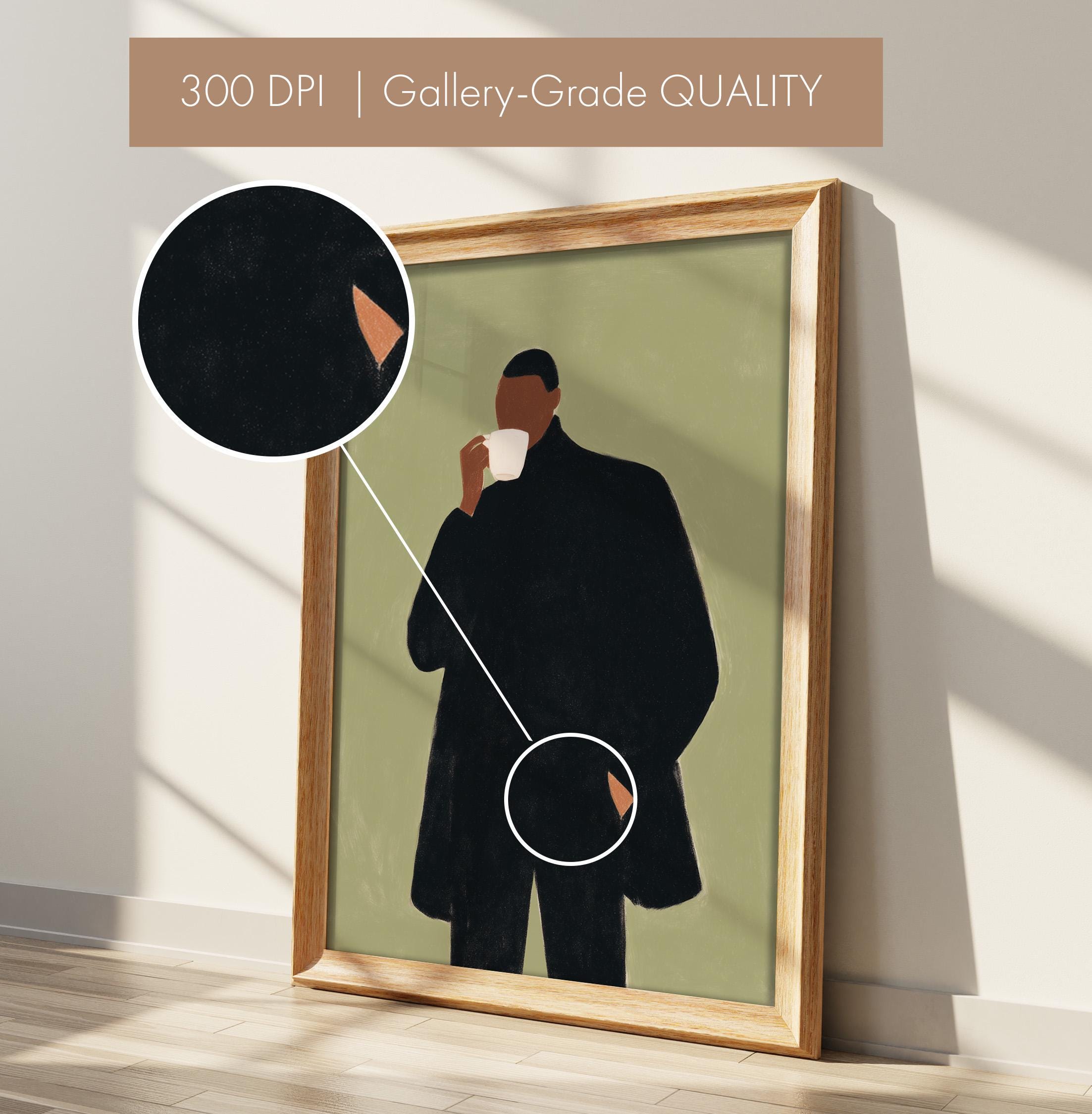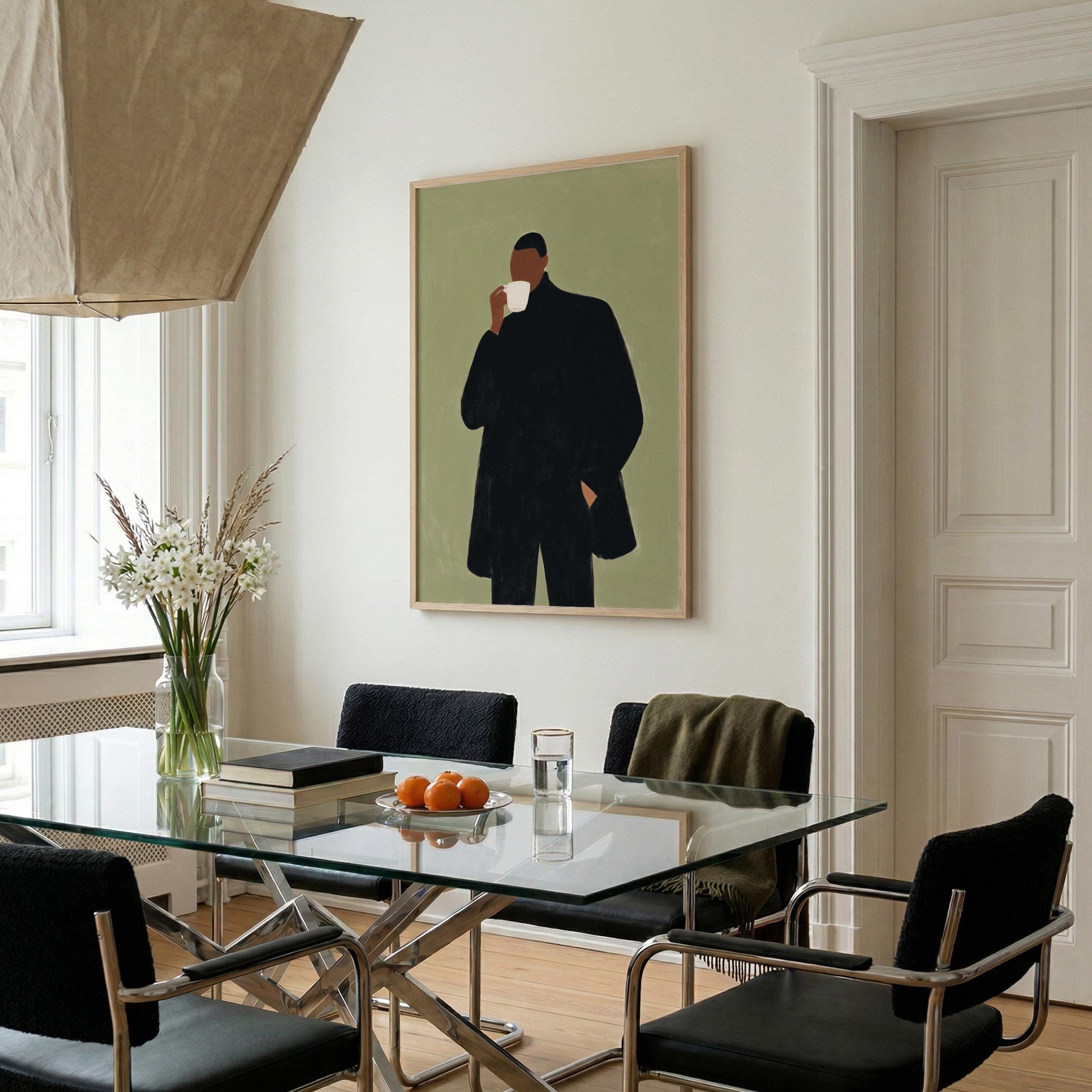 Modern black man portrait art captures quiet morning moments in minimalist style with rich olive tones and contemporary sophistication. Ideal for coffee enthusiasts, urban apartments, and anyone seeking refined masculine decor for living rooms or home offices.