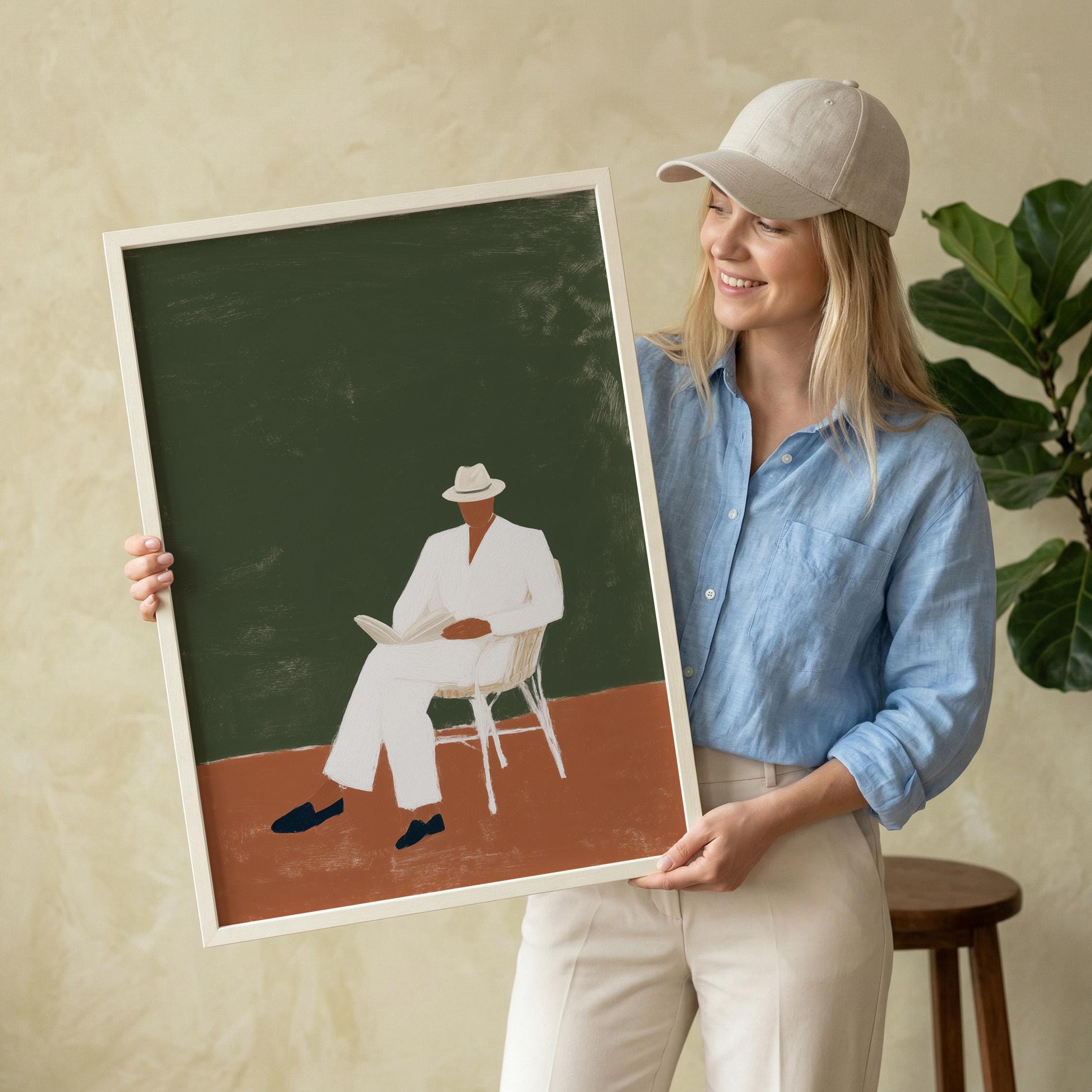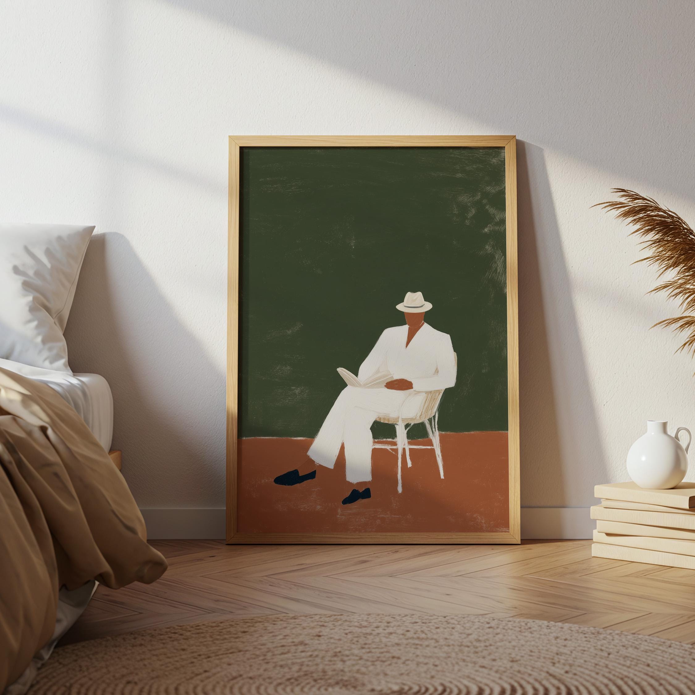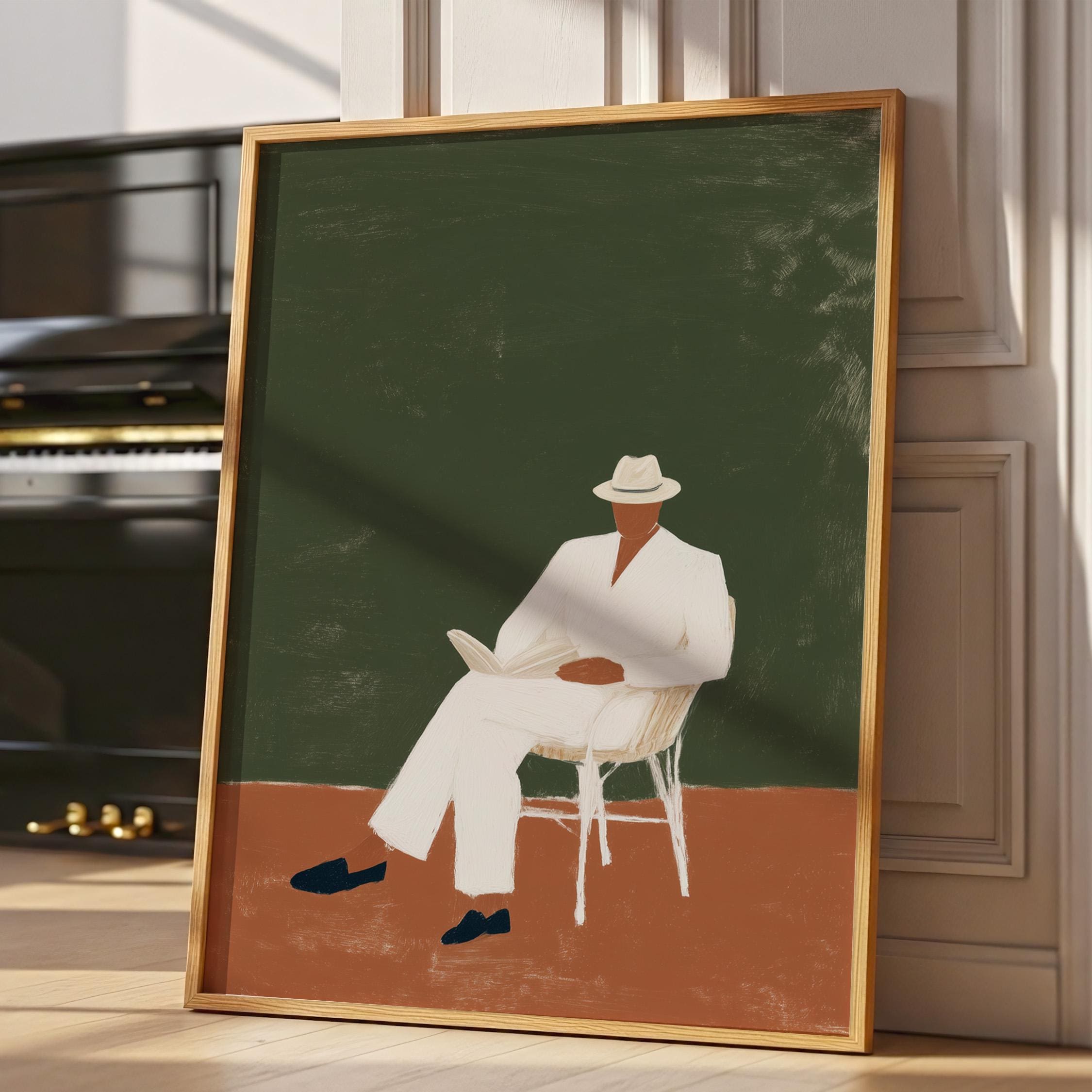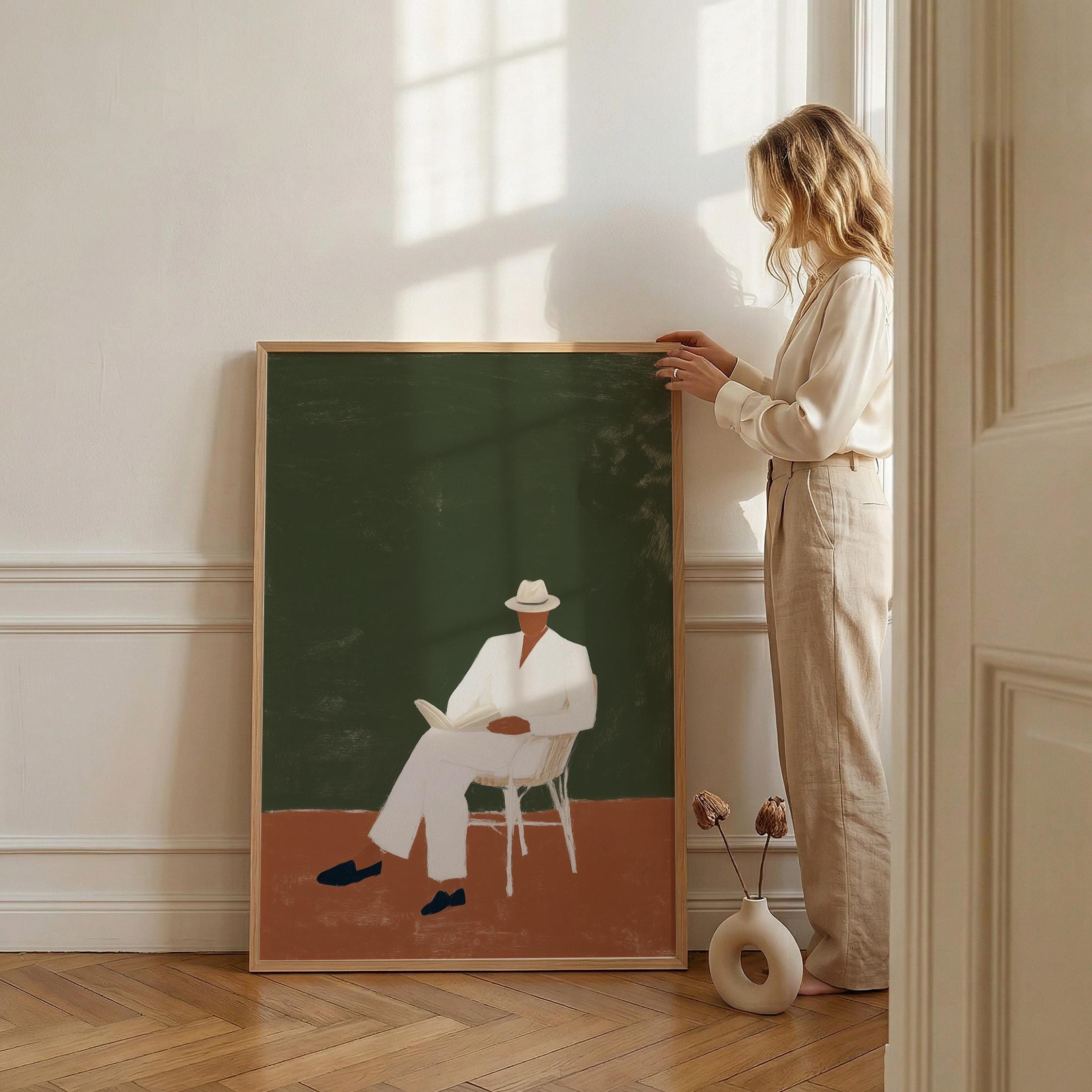 A beautifully textured print featuring a figure reading in white attire against rich green and terracotta tones. Perfect for book lovers, libraries, studies, living rooms, or any space that celebrates quiet contemplation. Brings a calm, sophisticated, and cultured atmosphere with its minimalist approach and earthy color palette. Ideal for those seeking modern abstract portraiture with an intellectual and serene vibe.