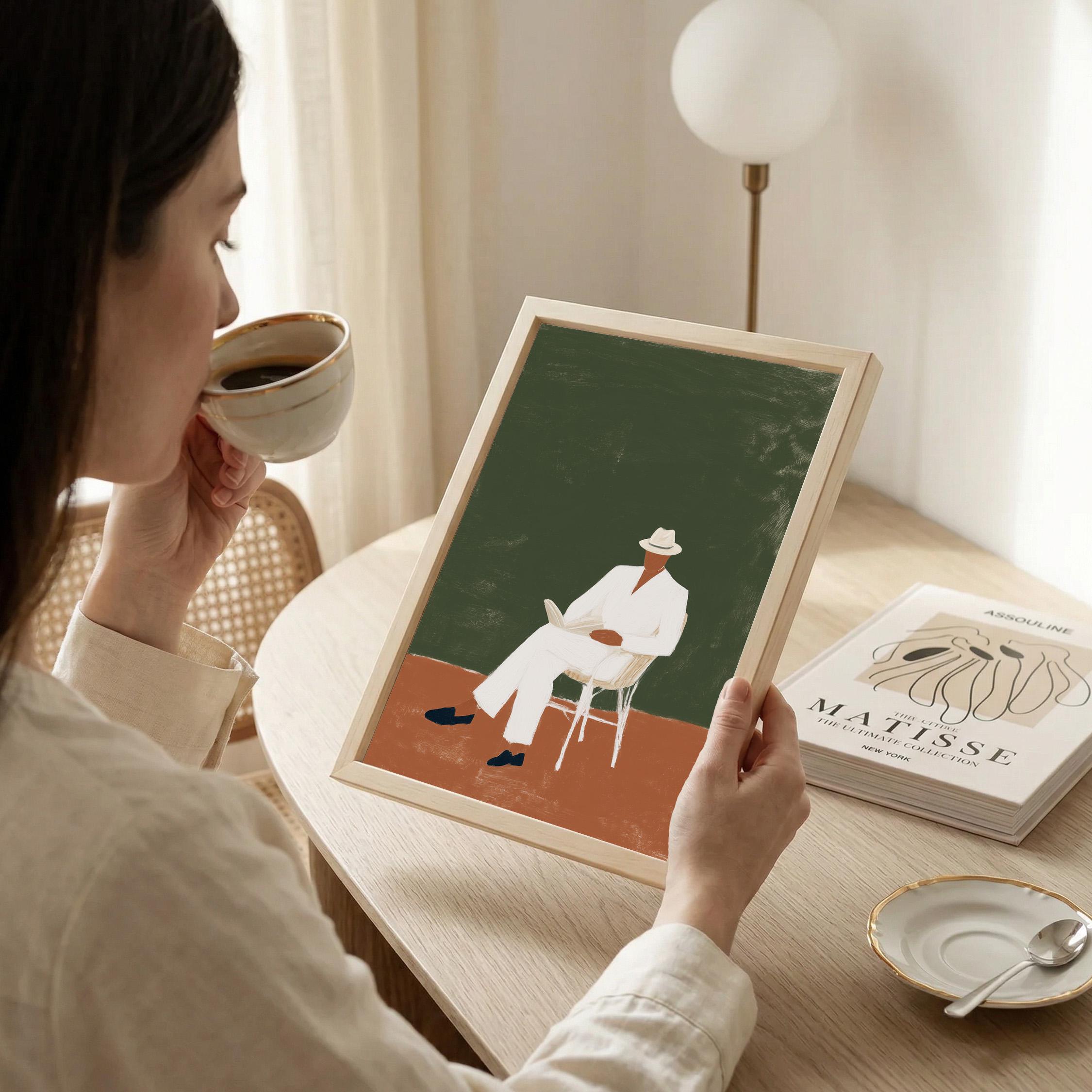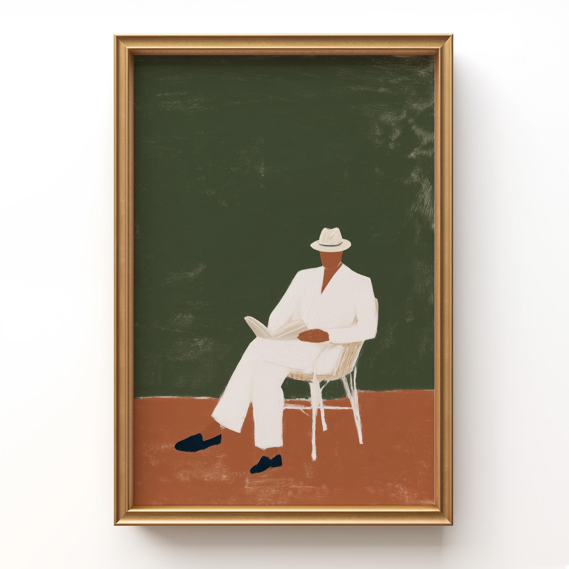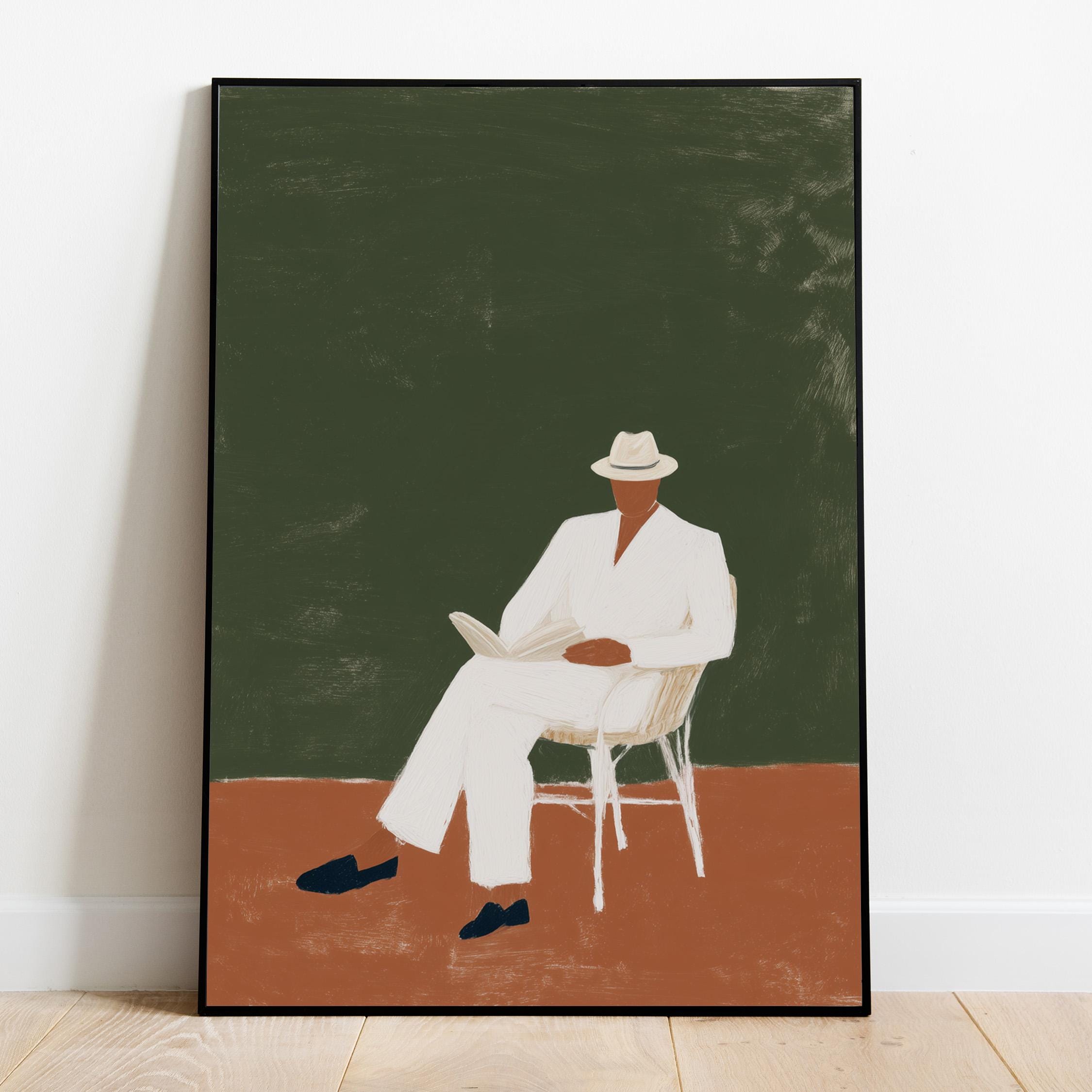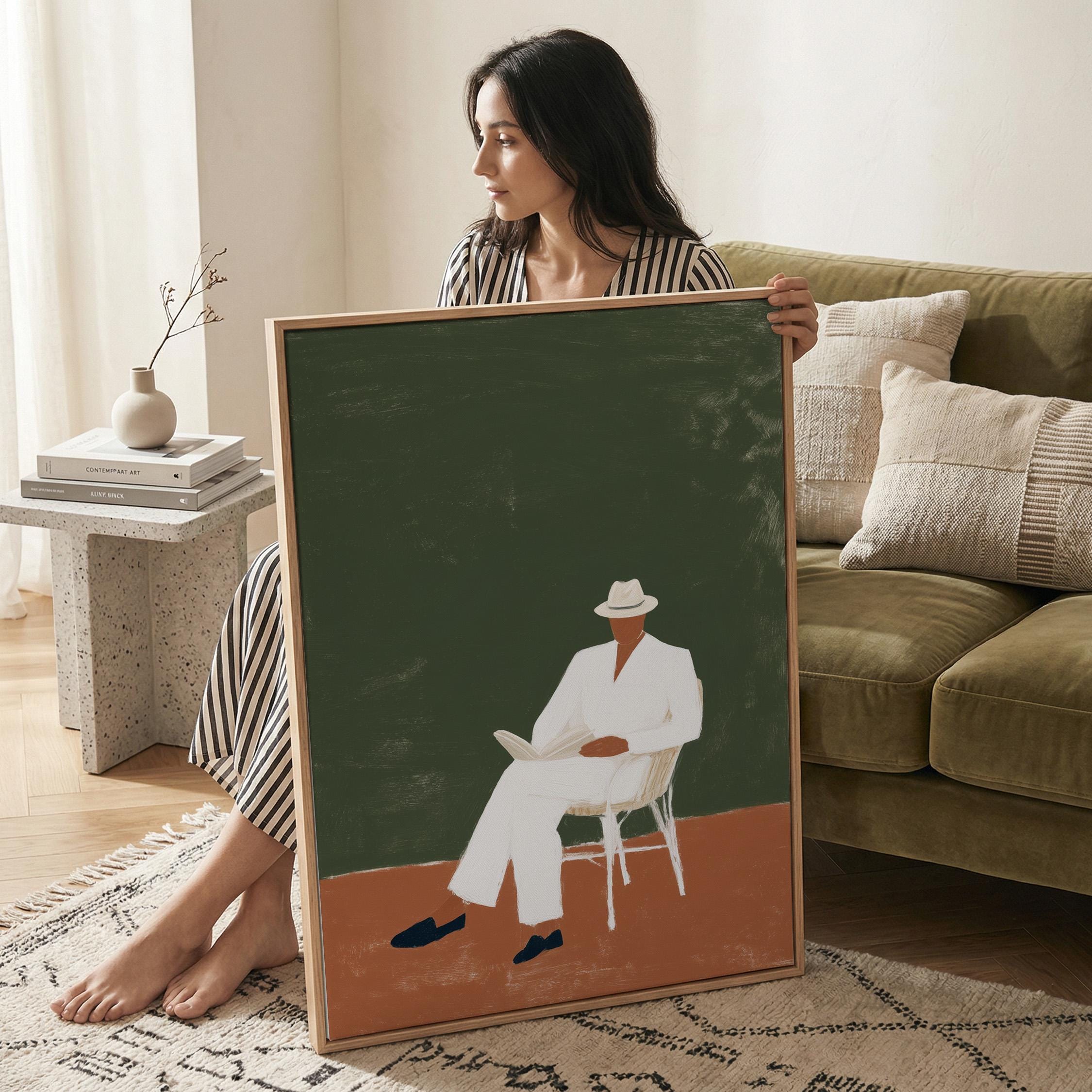 A beautifully textured print featuring a figure reading in white attire against rich green and terracotta tones. Perfect for book lovers, libraries, studies, living rooms, or any space that celebrates quiet contemplation. Brings a calm, sophisticated, and cultured atmosphere with its minimalist approach and earthy color palette. Ideal for those seeking modern abstract portraiture with an intellectual and serene vibe.