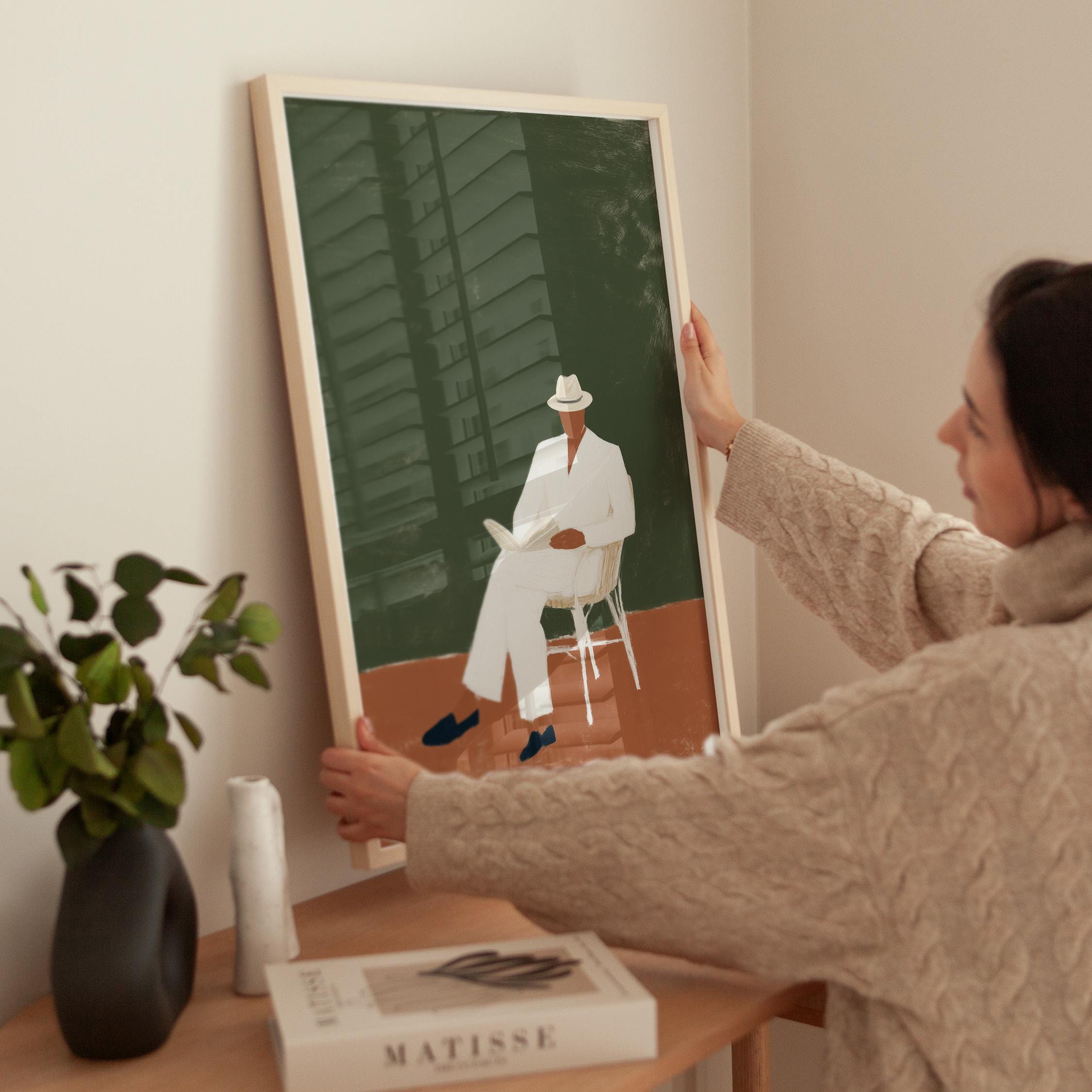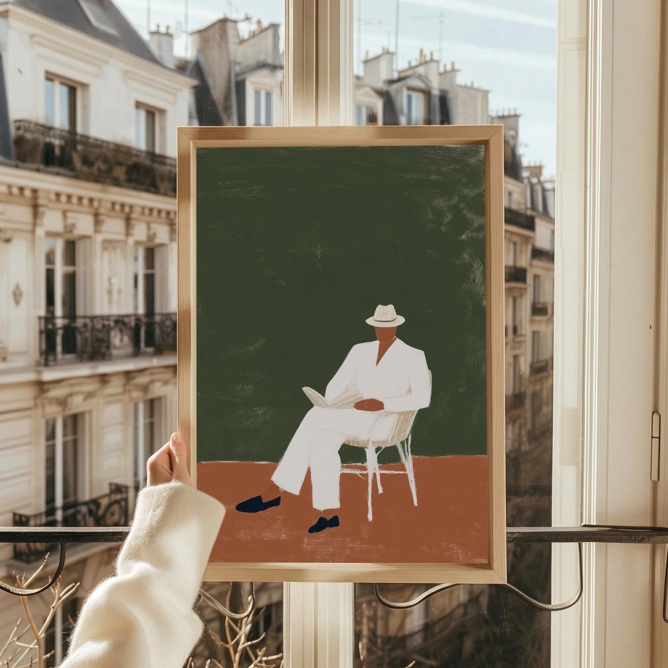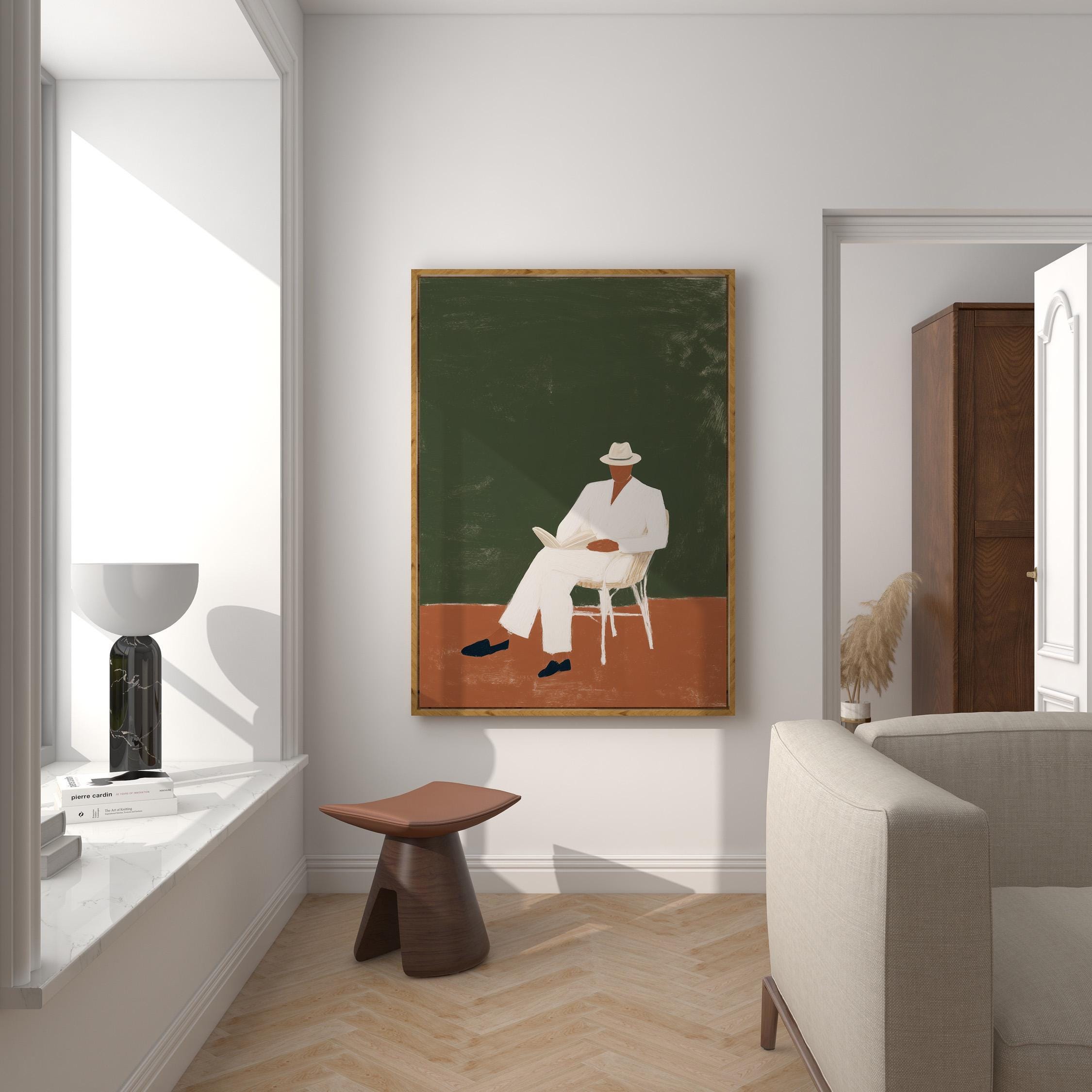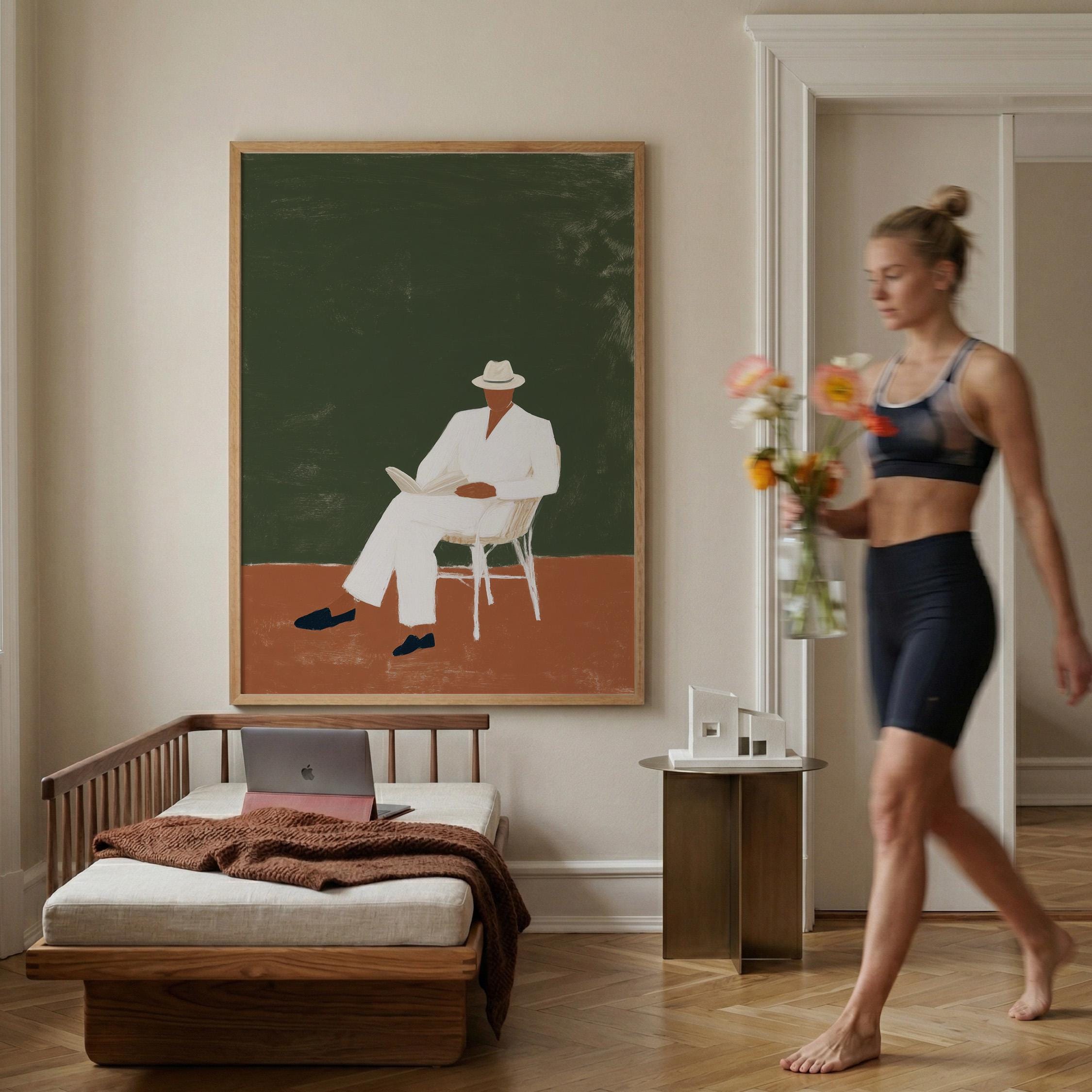 A beautifully textured print featuring a figure reading in white attire against rich green and terracotta tones. Perfect for book lovers, libraries, studies, living rooms, or any space that celebrates quiet contemplation. Brings a calm, sophisticated, and cultured atmosphere with its minimalist approach and earthy color palette. Ideal for those seeking modern abstract portraiture with an intellectual and serene vibe.
