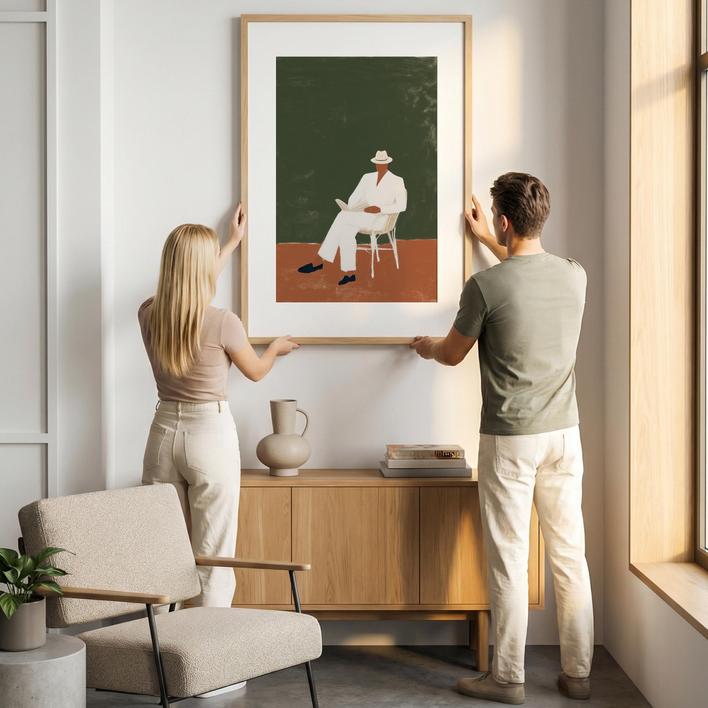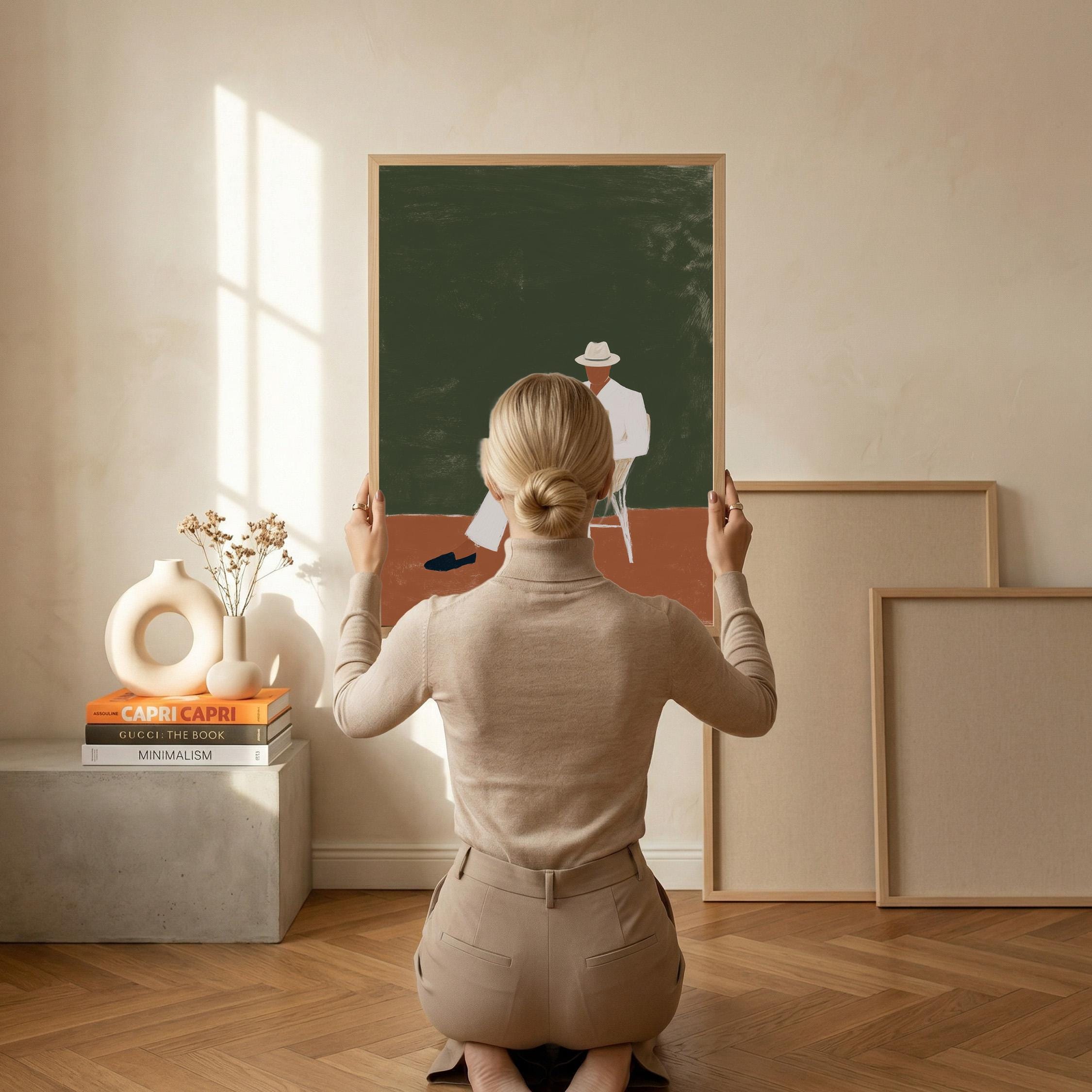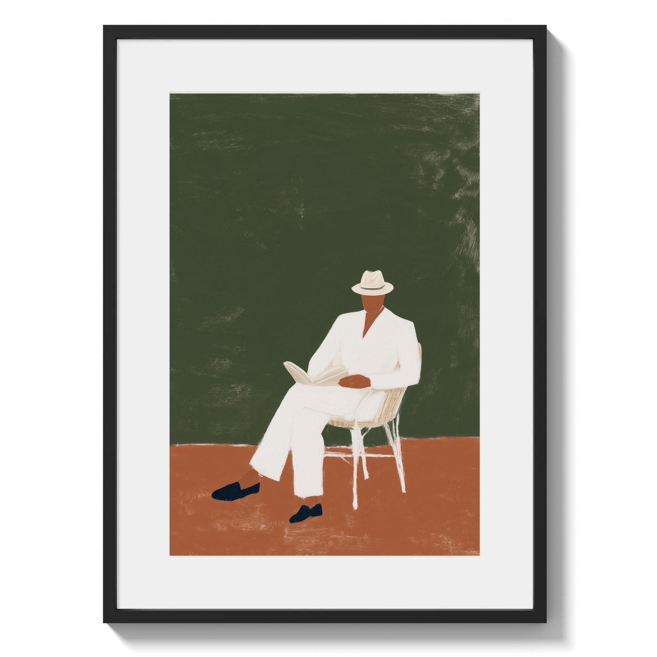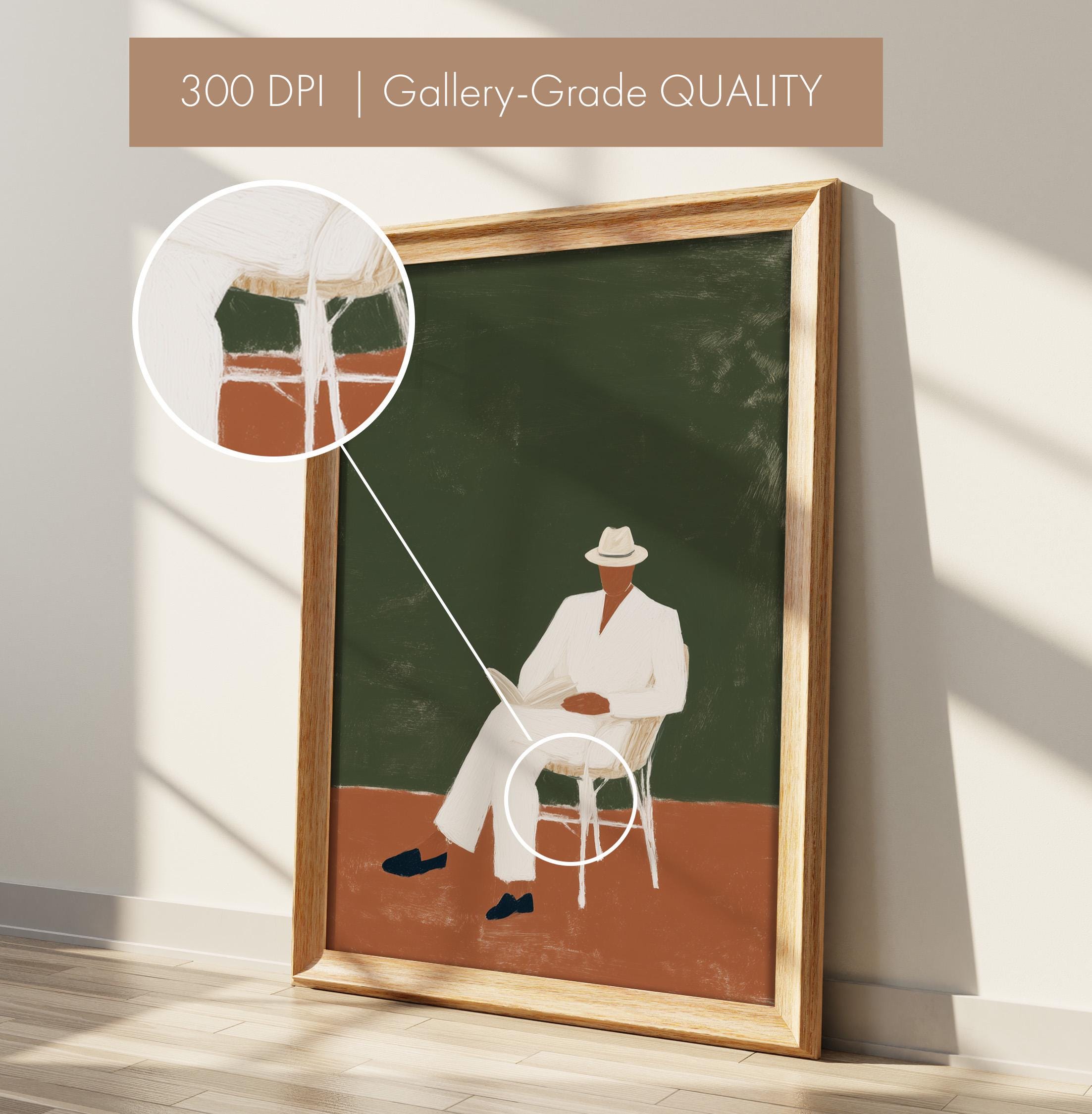 A beautifully textured print featuring a figure reading in white attire against rich green and terracotta tones. Perfect for book lovers, libraries, studies, living rooms, or any space that celebrates quiet contemplation. Brings a calm, sophisticated, and cultured atmosphere with its minimalist approach and earthy color palette. Ideal for those seeking modern abstract portraiture with an intellectual and serene vibe.