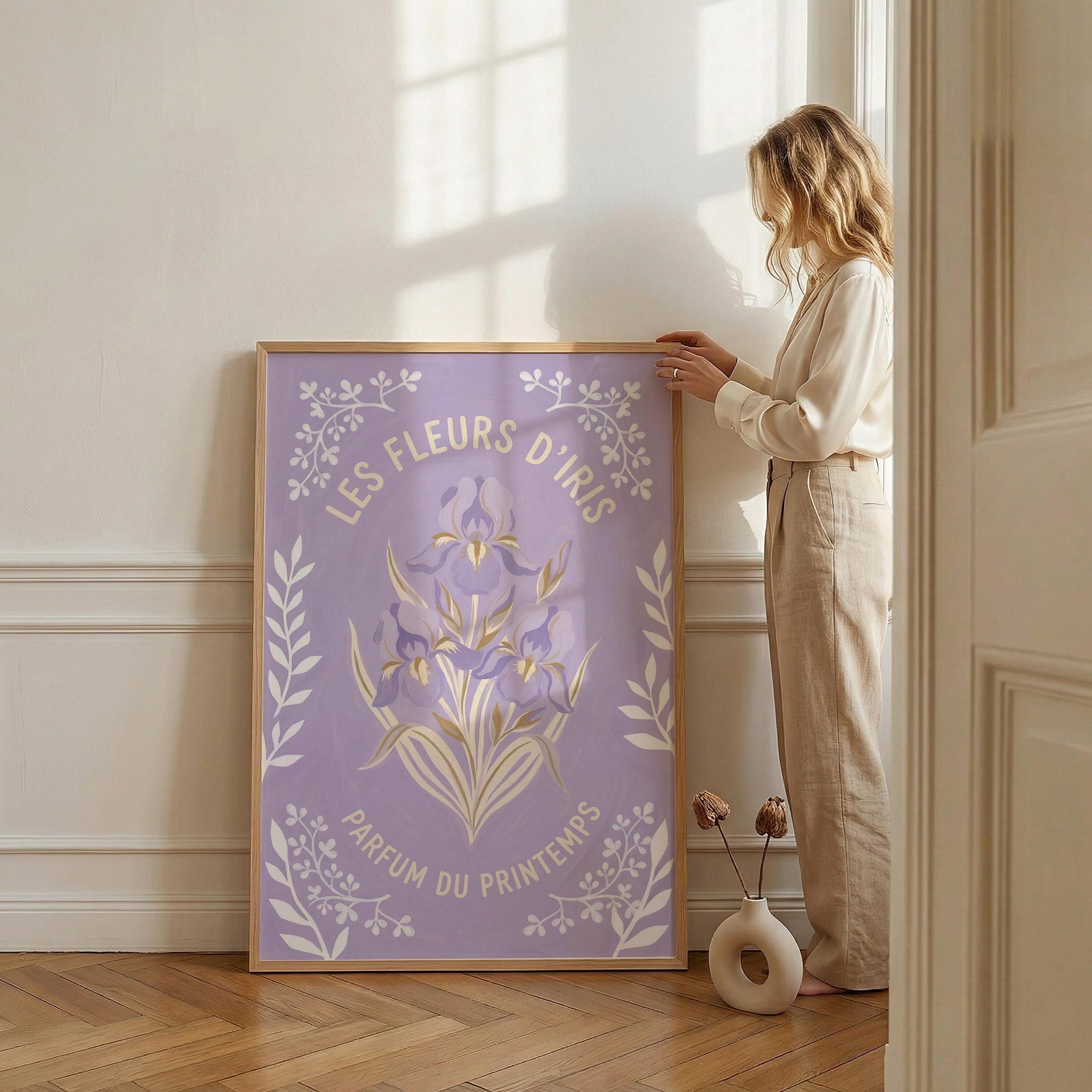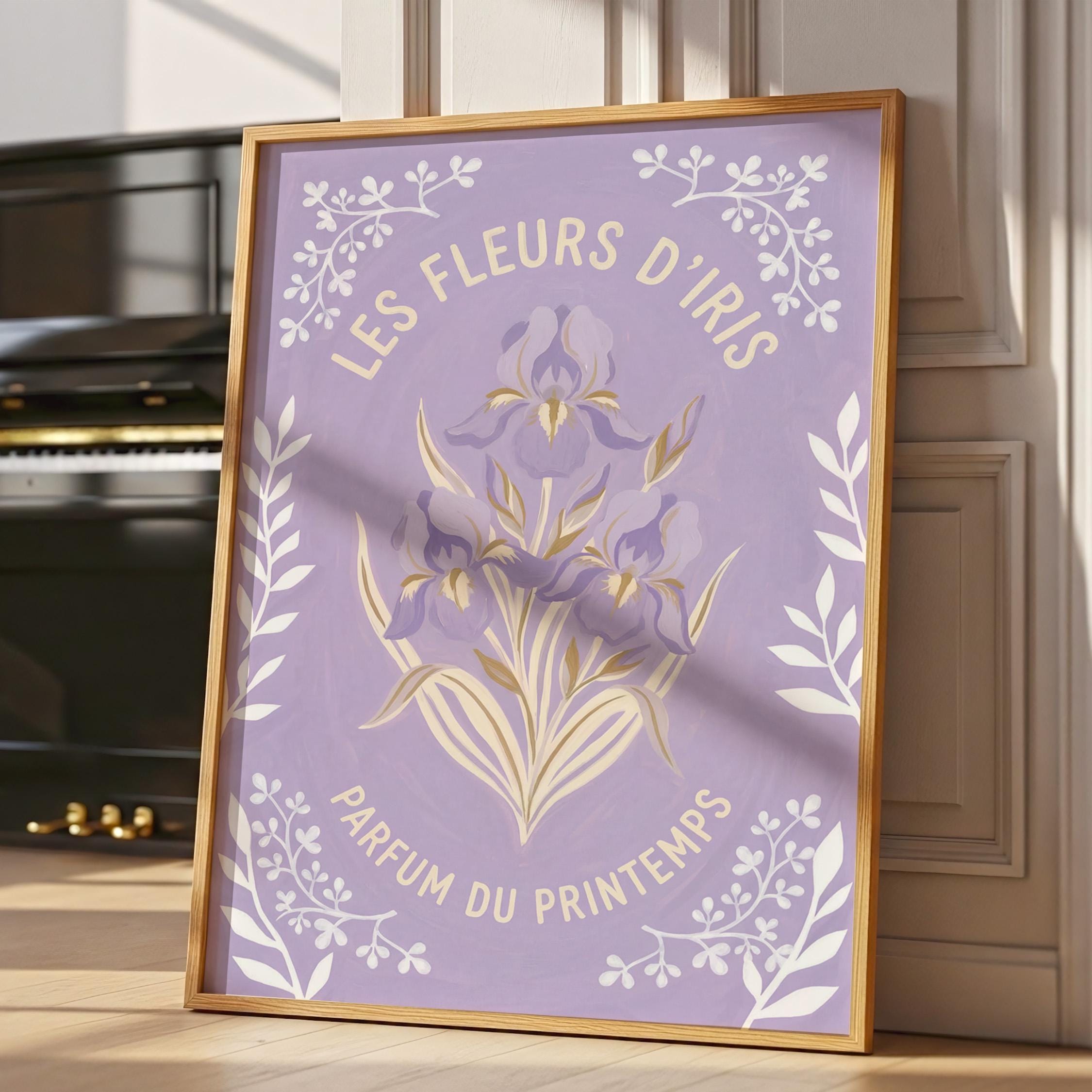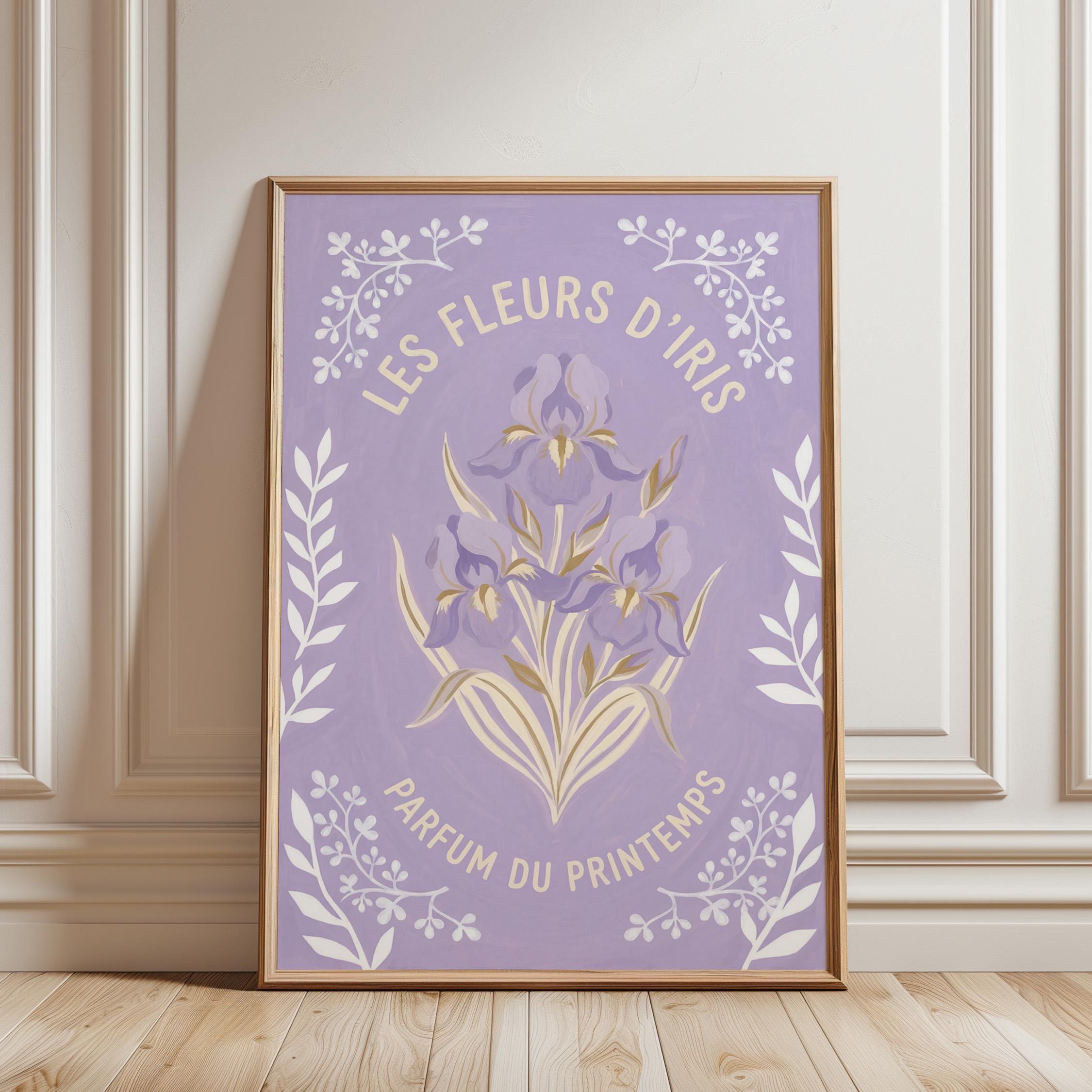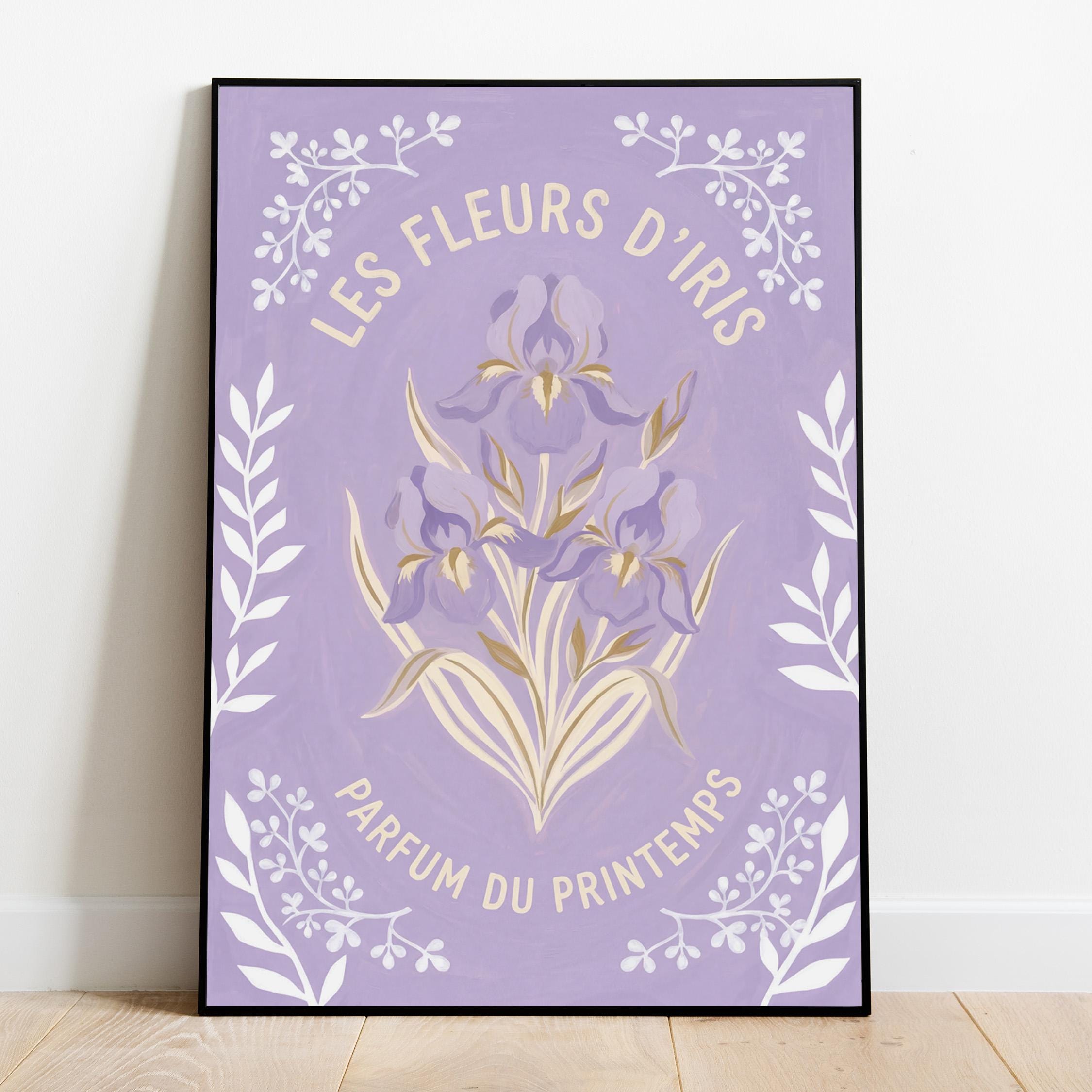 Transform your space with this stunning French botanical iris print featuring elegant Les Fleurs D'Iris typography and delicate lavender blooms. Perfect for cottage, farmhouse, or French country bedrooms, bathrooms, powder rooms, and living spaces seeking vintage charm. Brings a soft, romantic, and serene ambiance with its soothing purple and cream color palette and timeless botanical elegance.