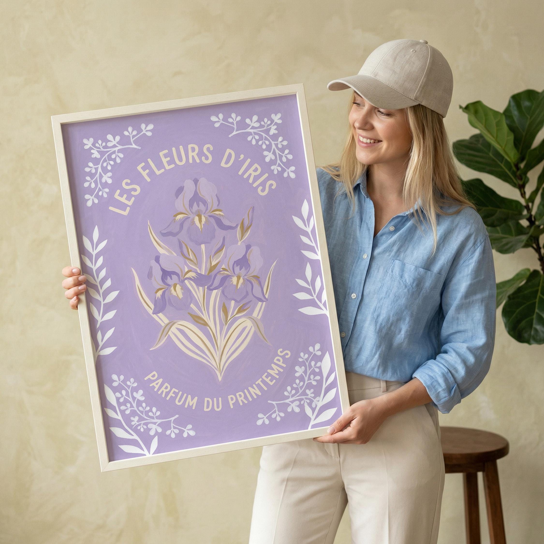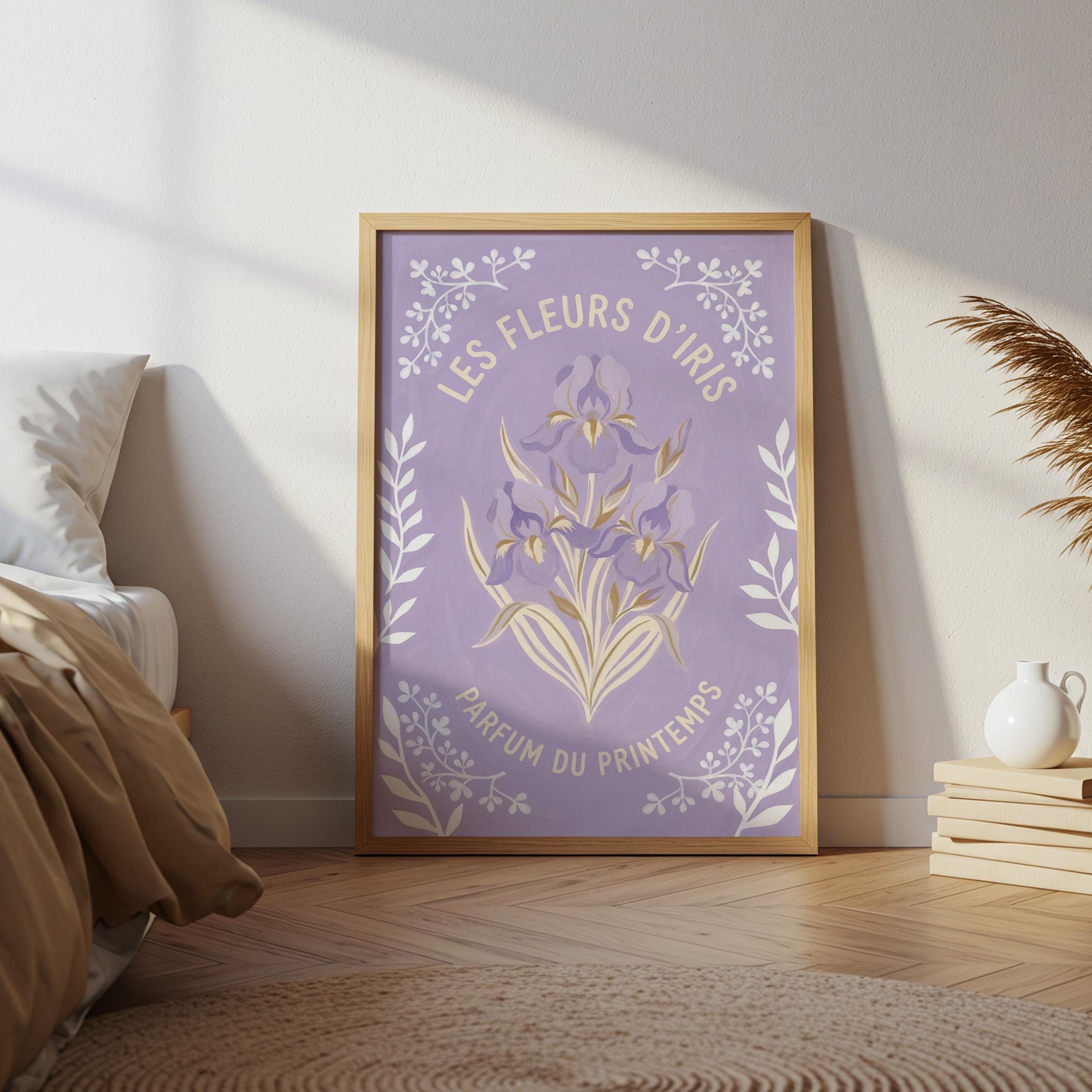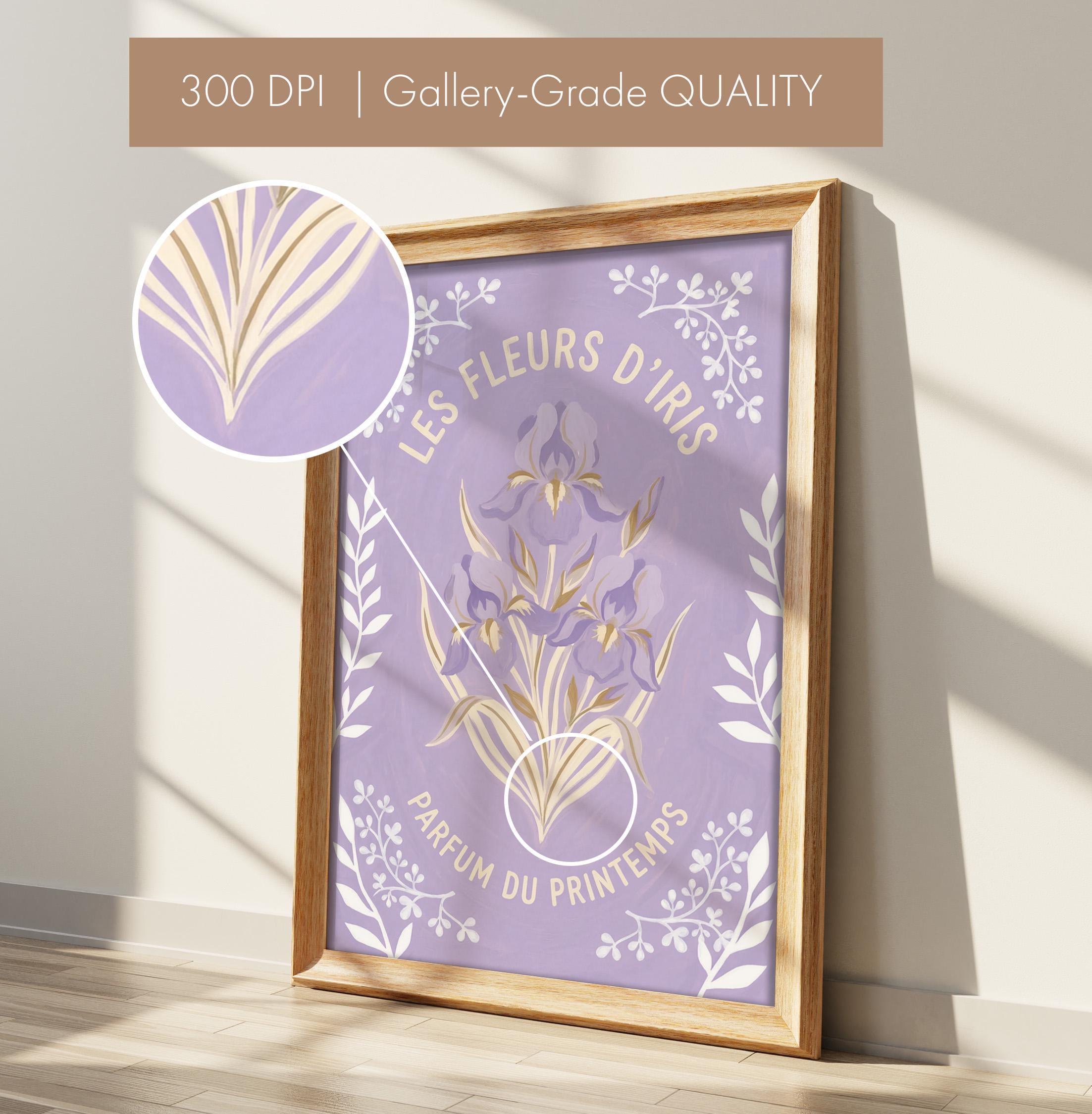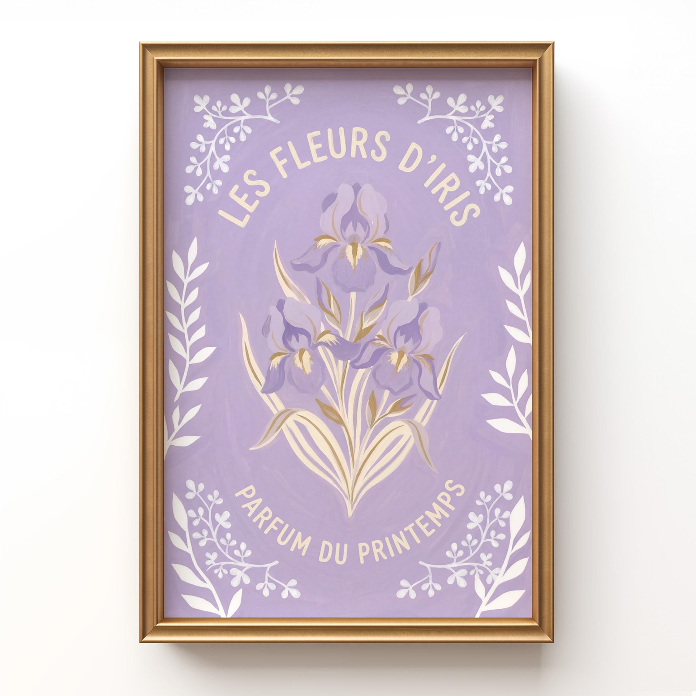 Transform your space with this stunning French botanical iris print featuring elegant Les Fleurs D'Iris typography and delicate lavender blooms. Perfect for cottage, farmhouse, or French country bedrooms, bathrooms, powder rooms, and living spaces seeking vintage charm. Brings a soft, romantic, and serene ambiance with its soothing purple and cream color palette and timeless botanical elegance.