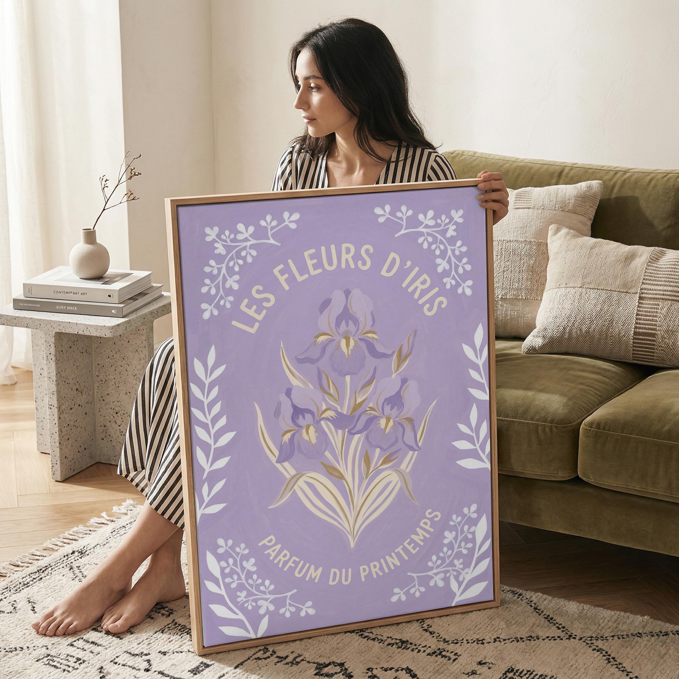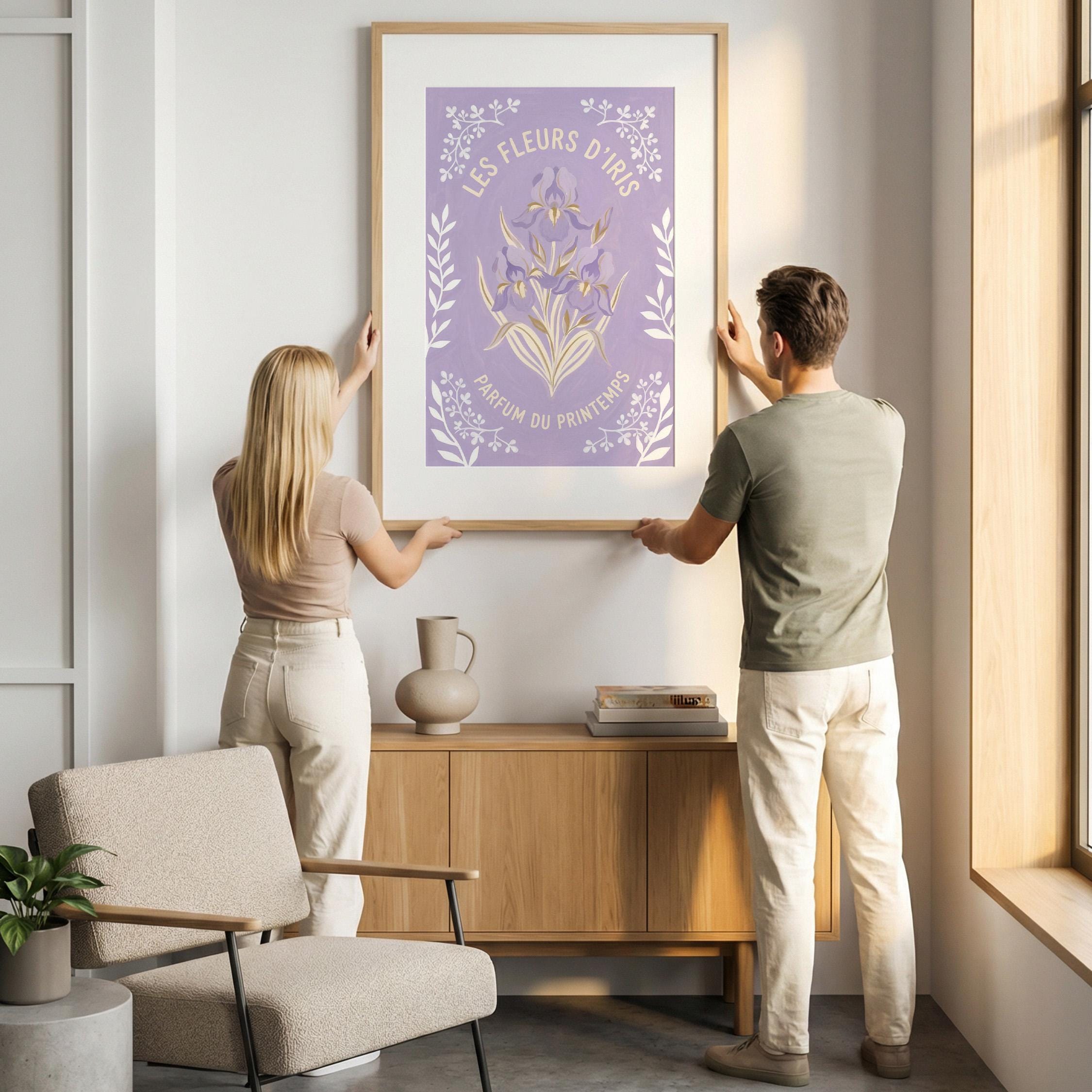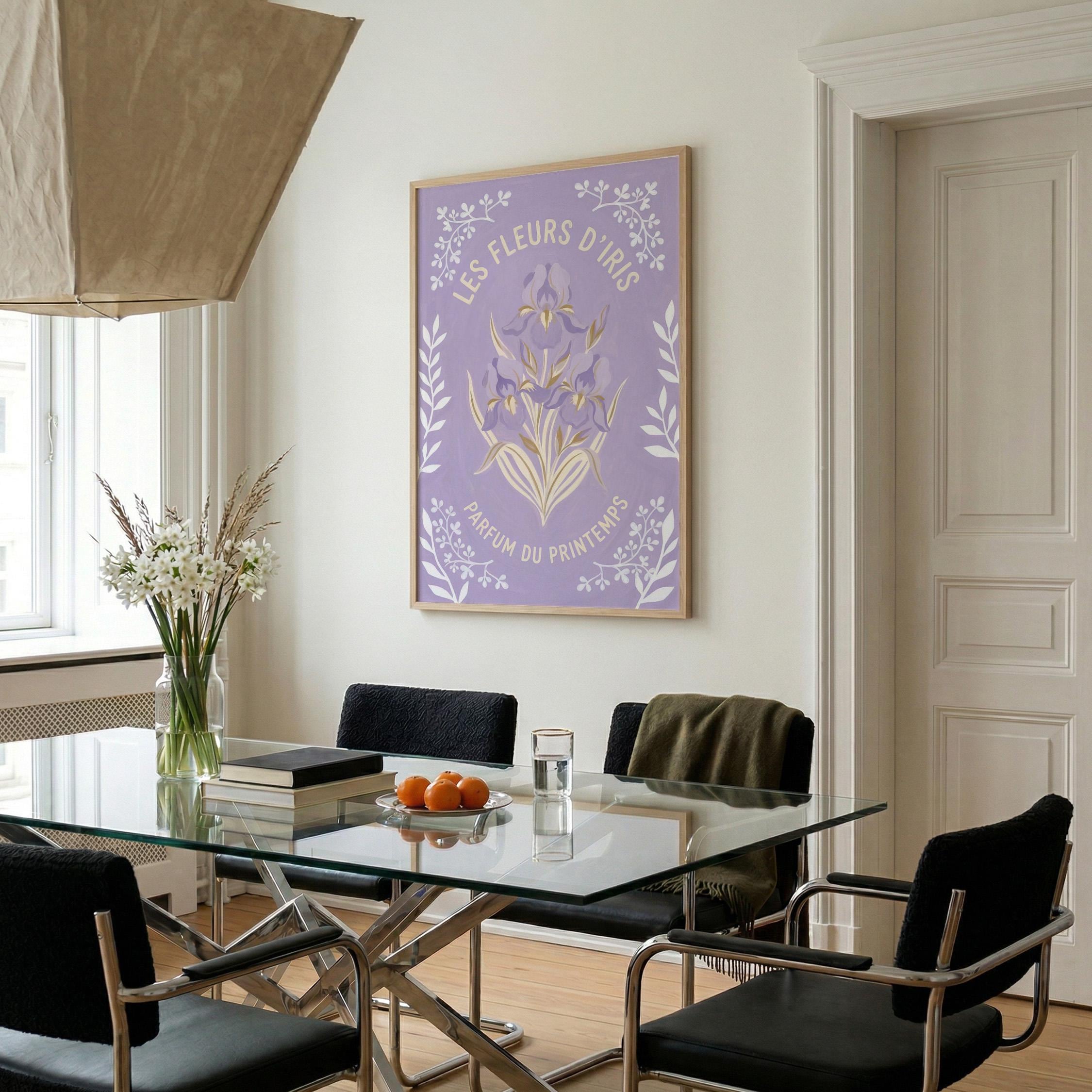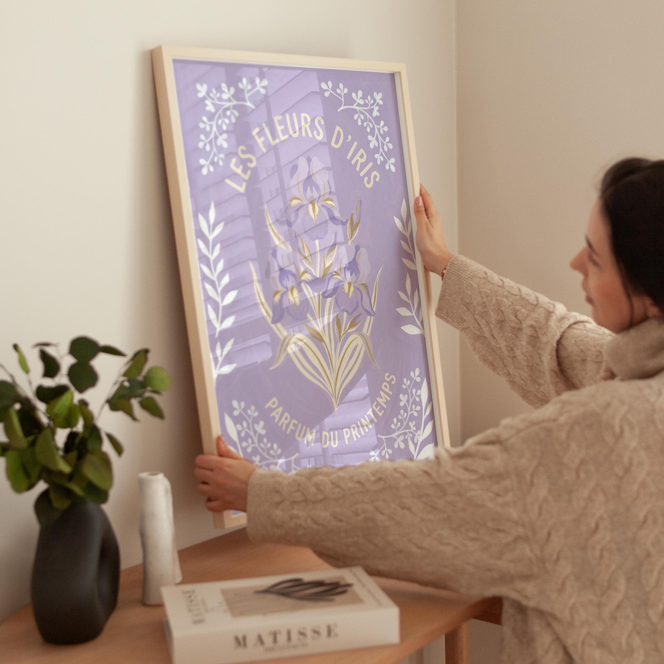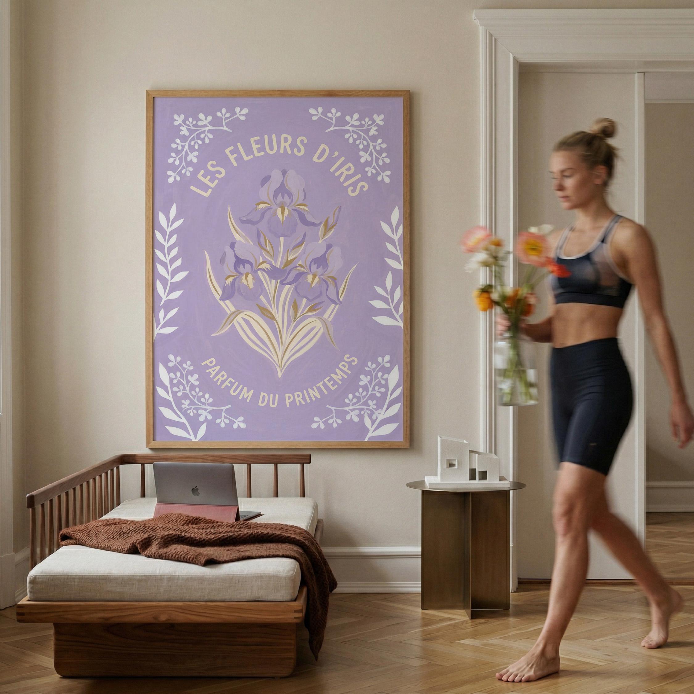 Transform your space with this stunning French botanical iris print featuring elegant Les Fleurs D'Iris typography and delicate lavender blooms. Perfect for cottage, farmhouse, or French country bedrooms, bathrooms, powder rooms, and living spaces seeking vintage charm. Brings a soft, romantic, and serene ambiance with its soothing purple and cream color palette and timeless botanical elegance.