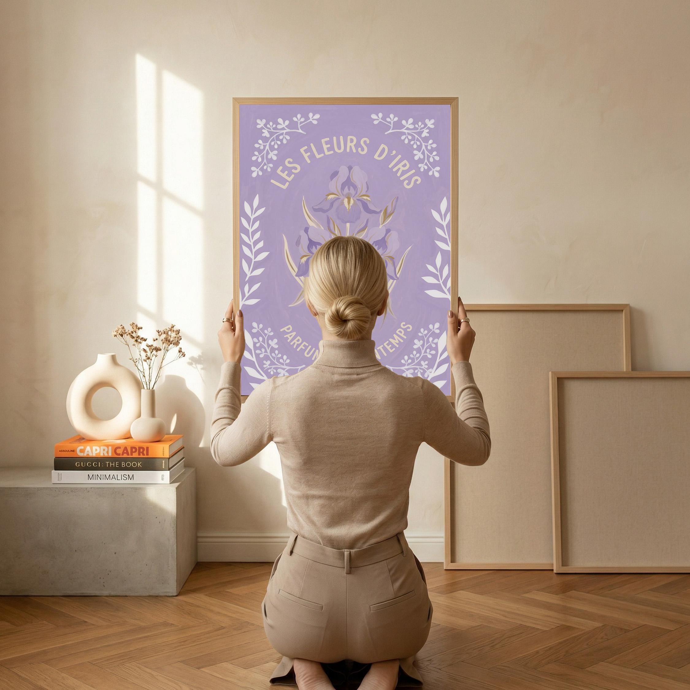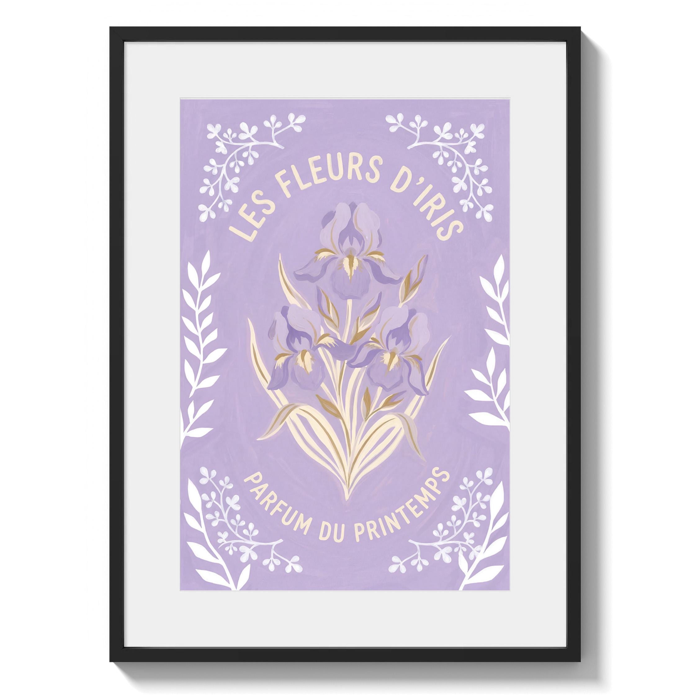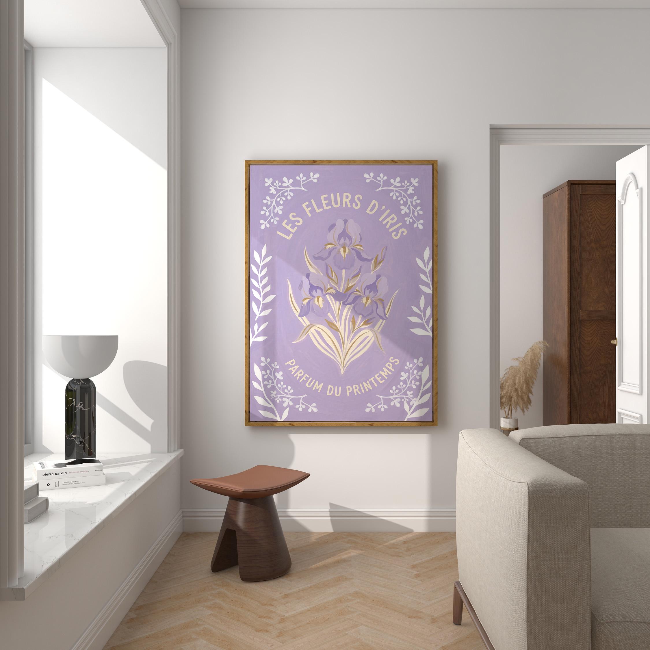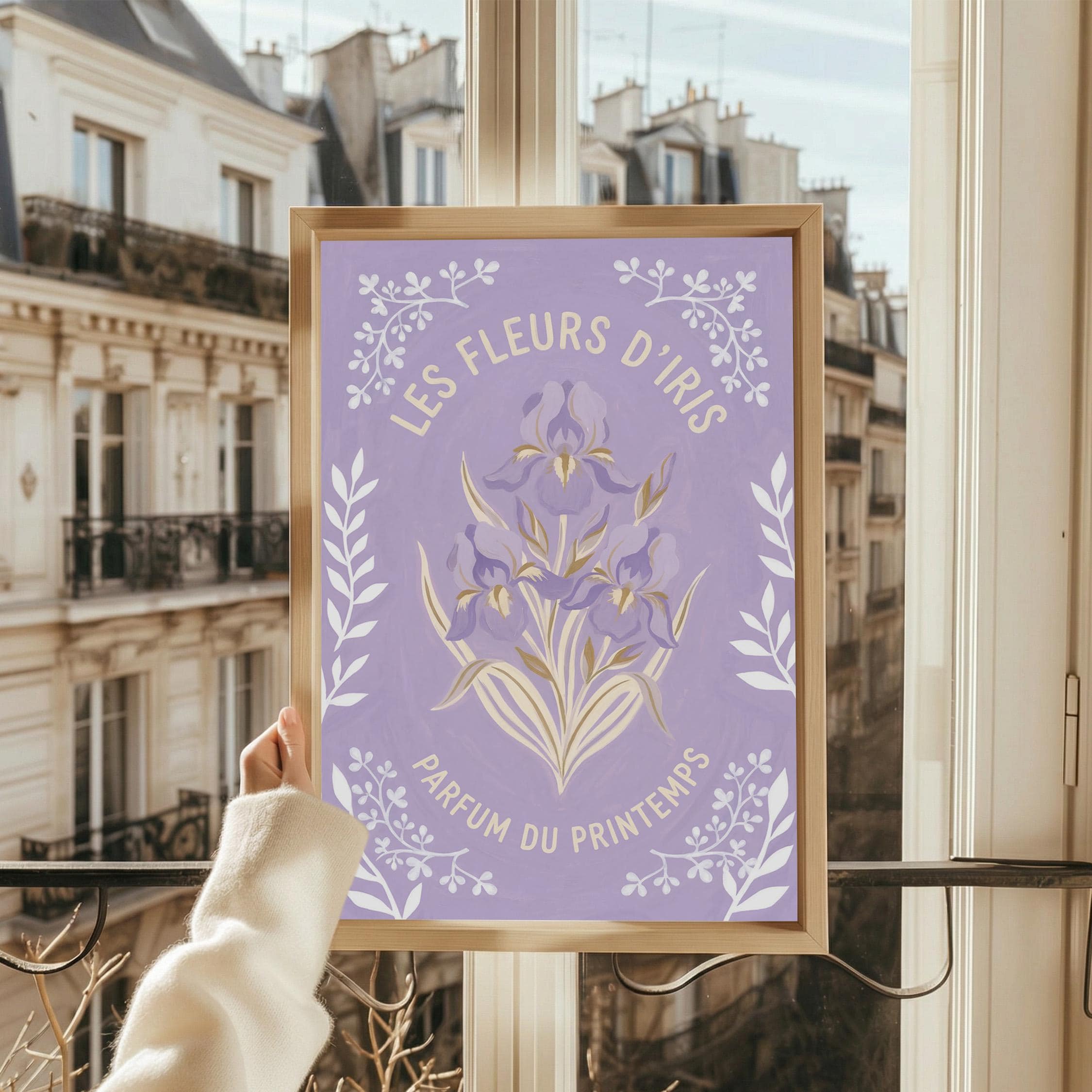 Transform your space with this stunning French botanical iris print featuring elegant Les Fleurs D'Iris typography and delicate lavender blooms. Perfect for cottage, farmhouse, or French country bedrooms, bathrooms, powder rooms, and living spaces seeking vintage charm. Brings a soft, romantic, and serene ambiance with its soothing purple and cream color palette and timeless botanical elegance.
