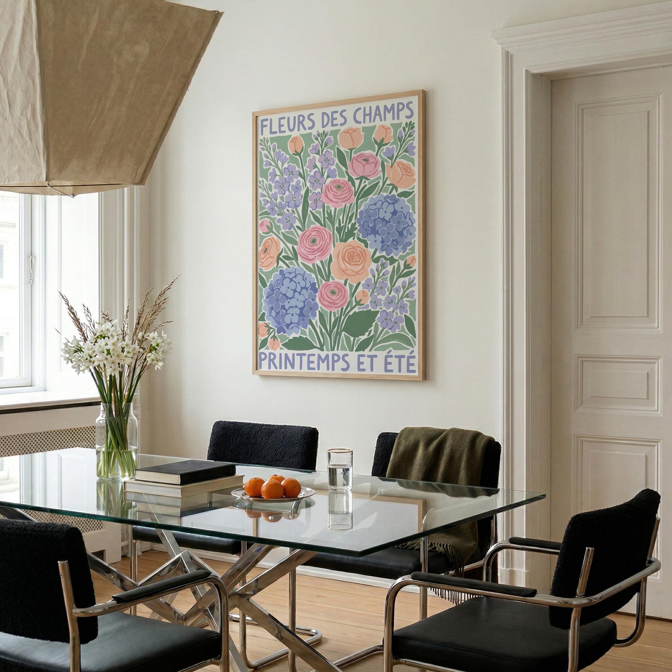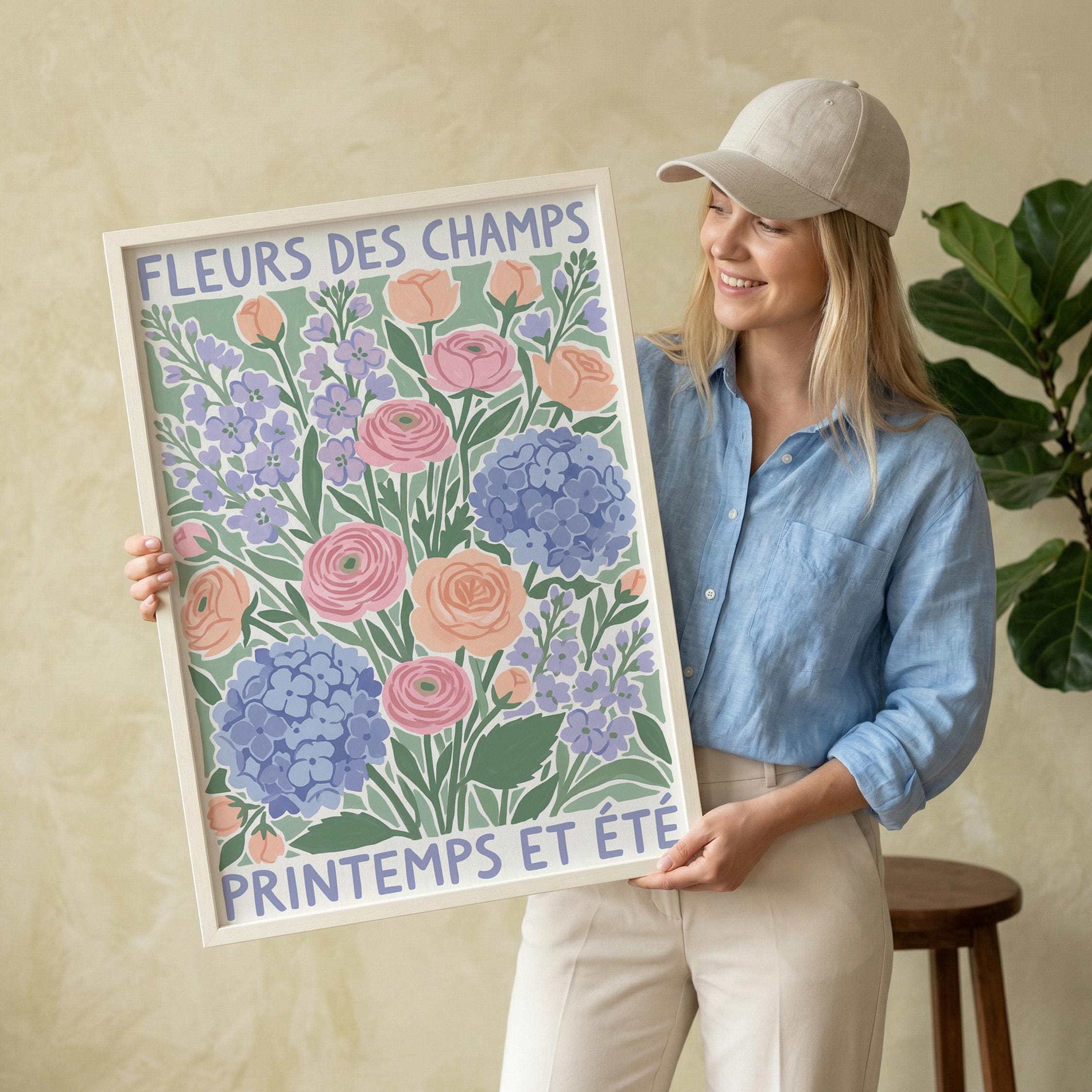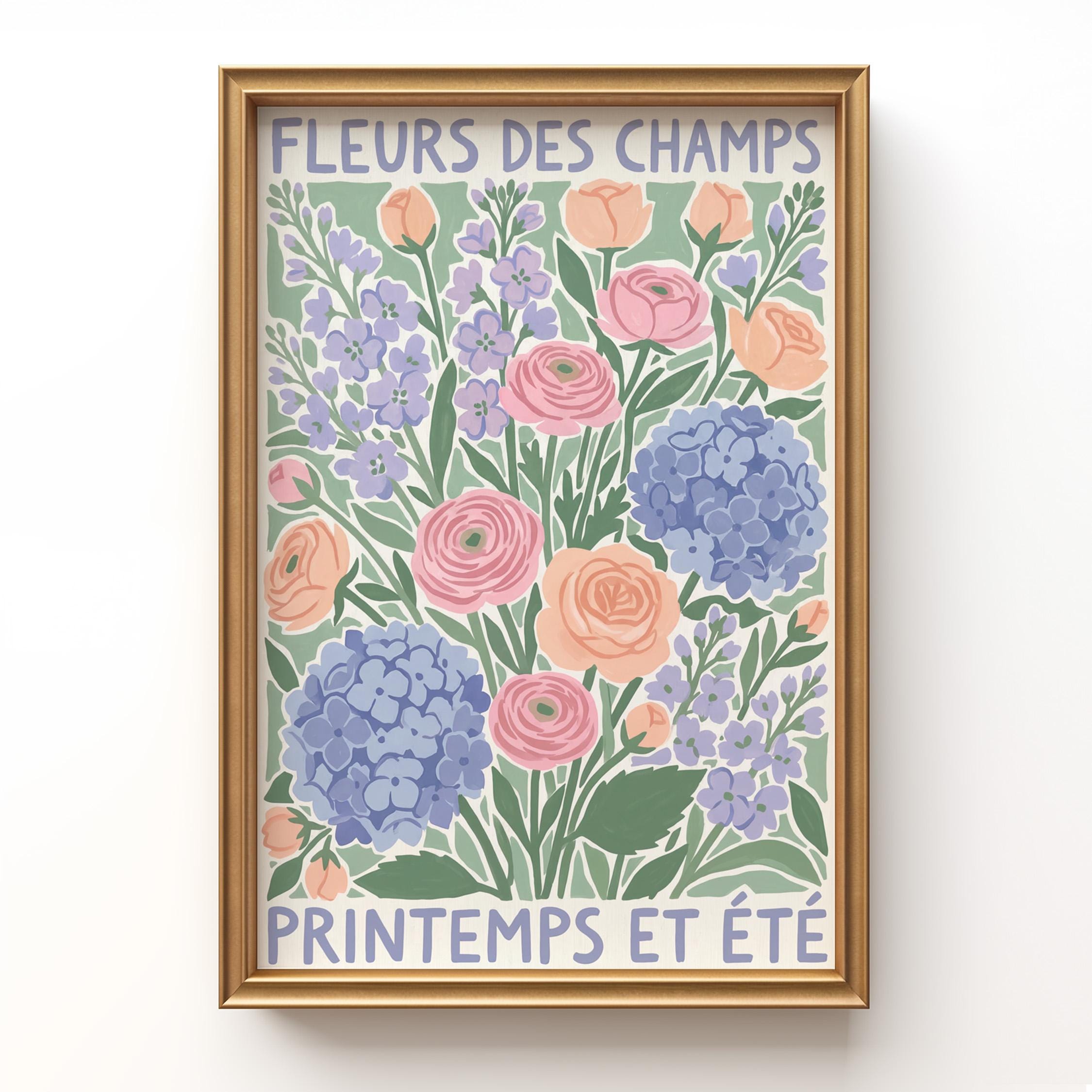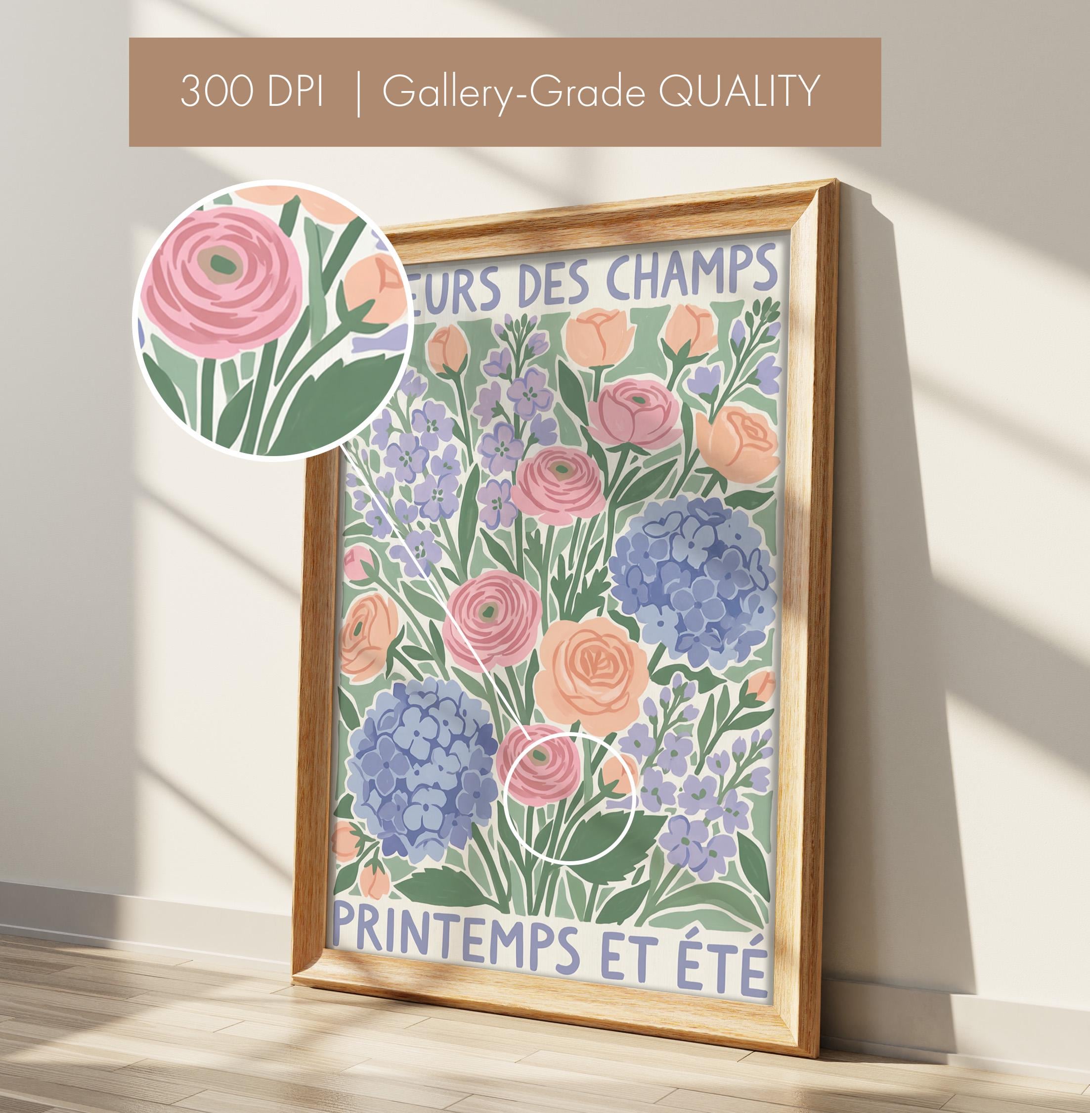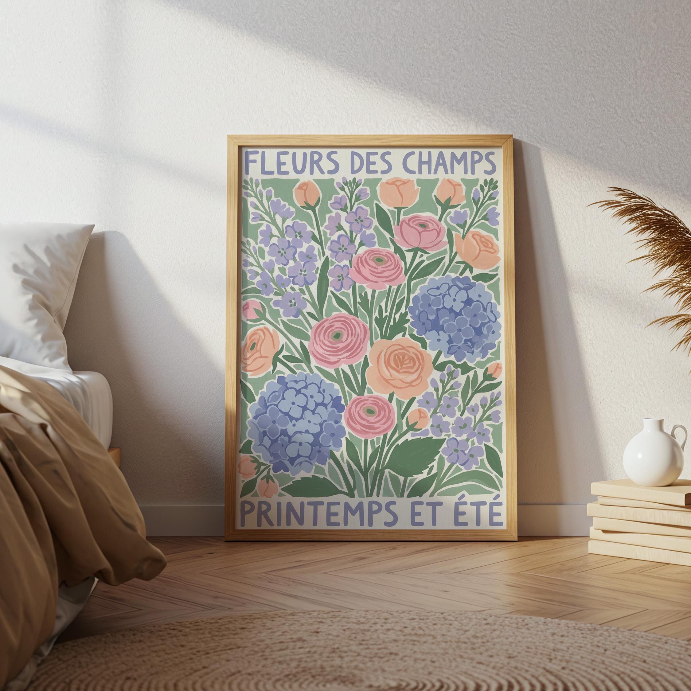 This French wildflower garden wall art print features soft ranunculus, hydrangeas, and lavender in pastel peach, pink, and periwinkle tones with charming vintage typography. Perfect for cottage, farmhouse, or French country style lovers who want to bring springtime beauty into their bedroom, kitchen, nursery, or living room. Creates a serene, romantic, and nature-inspired atmosphere with its delicate botanical illustration and soothing color palette.