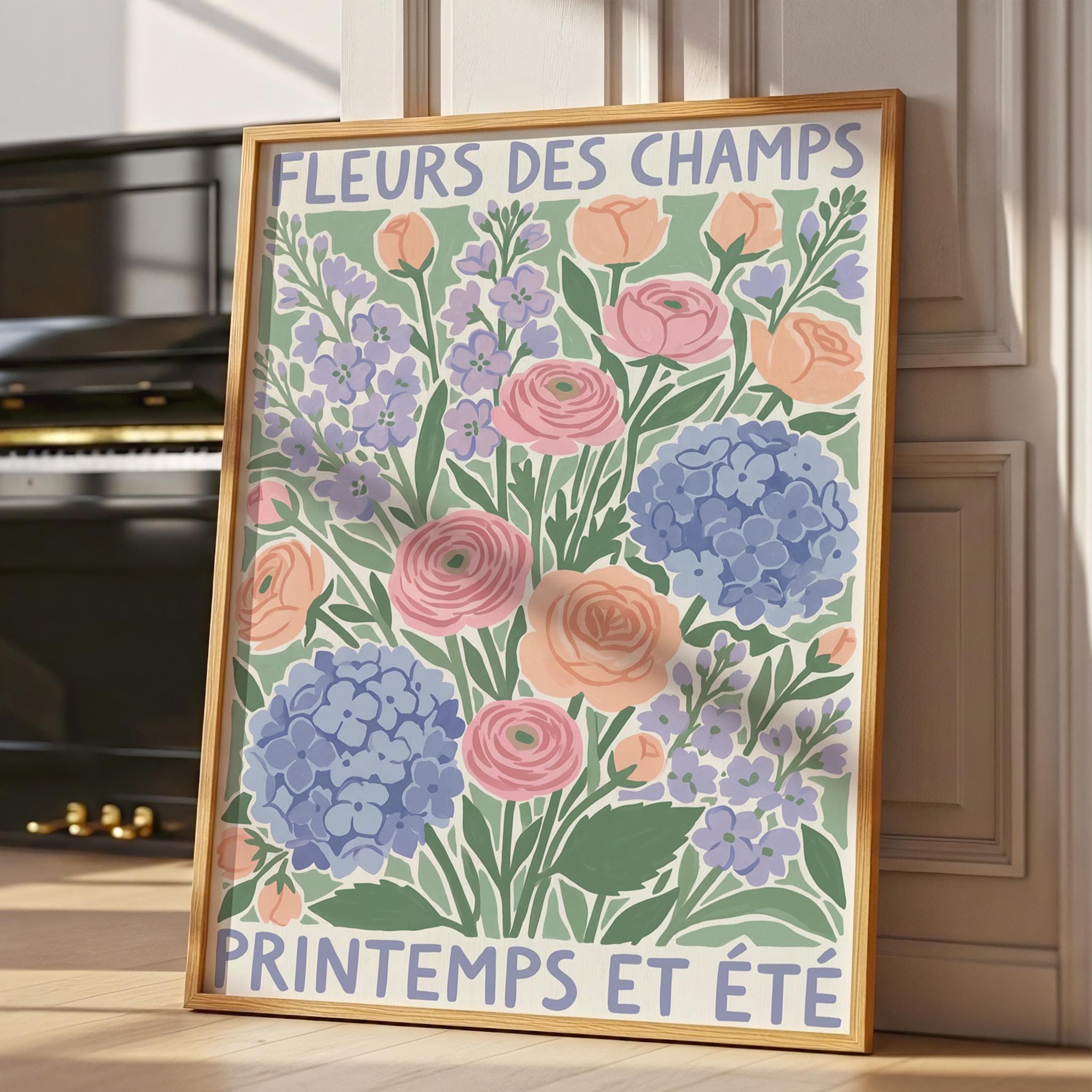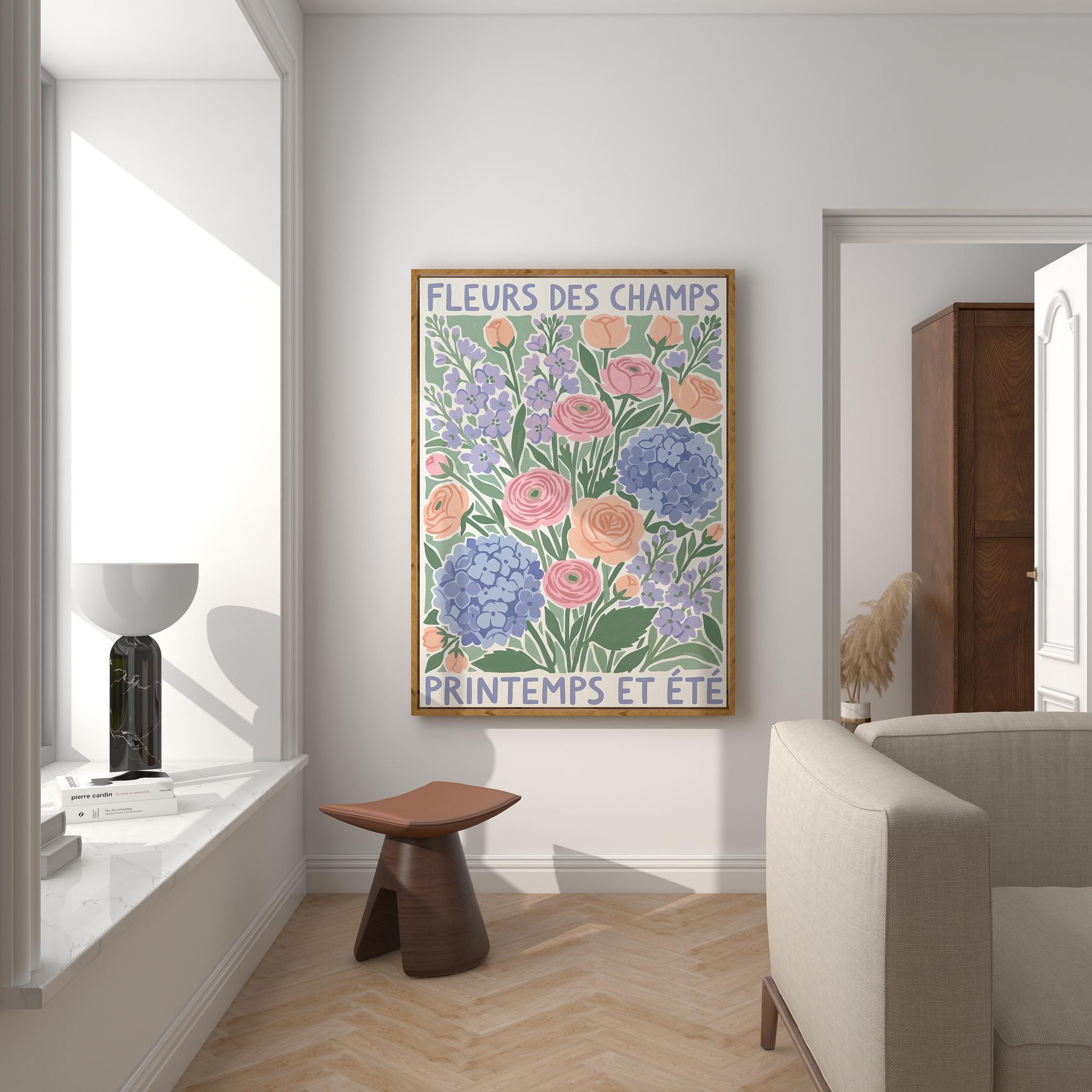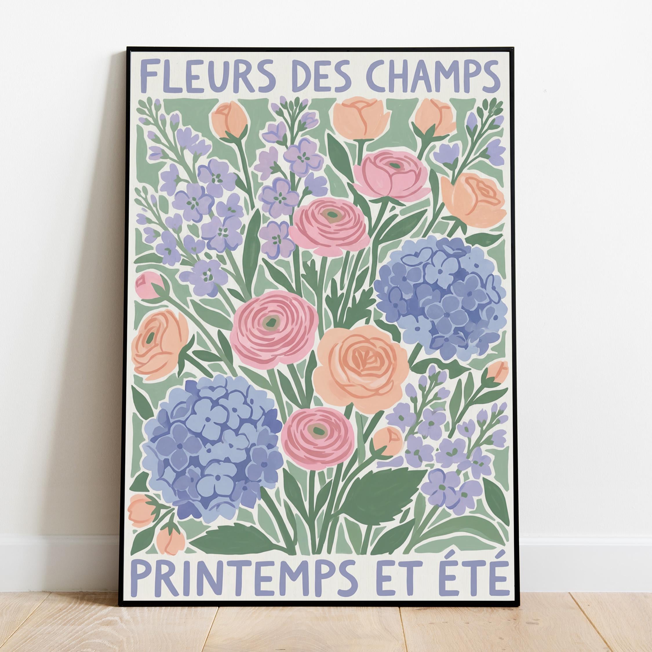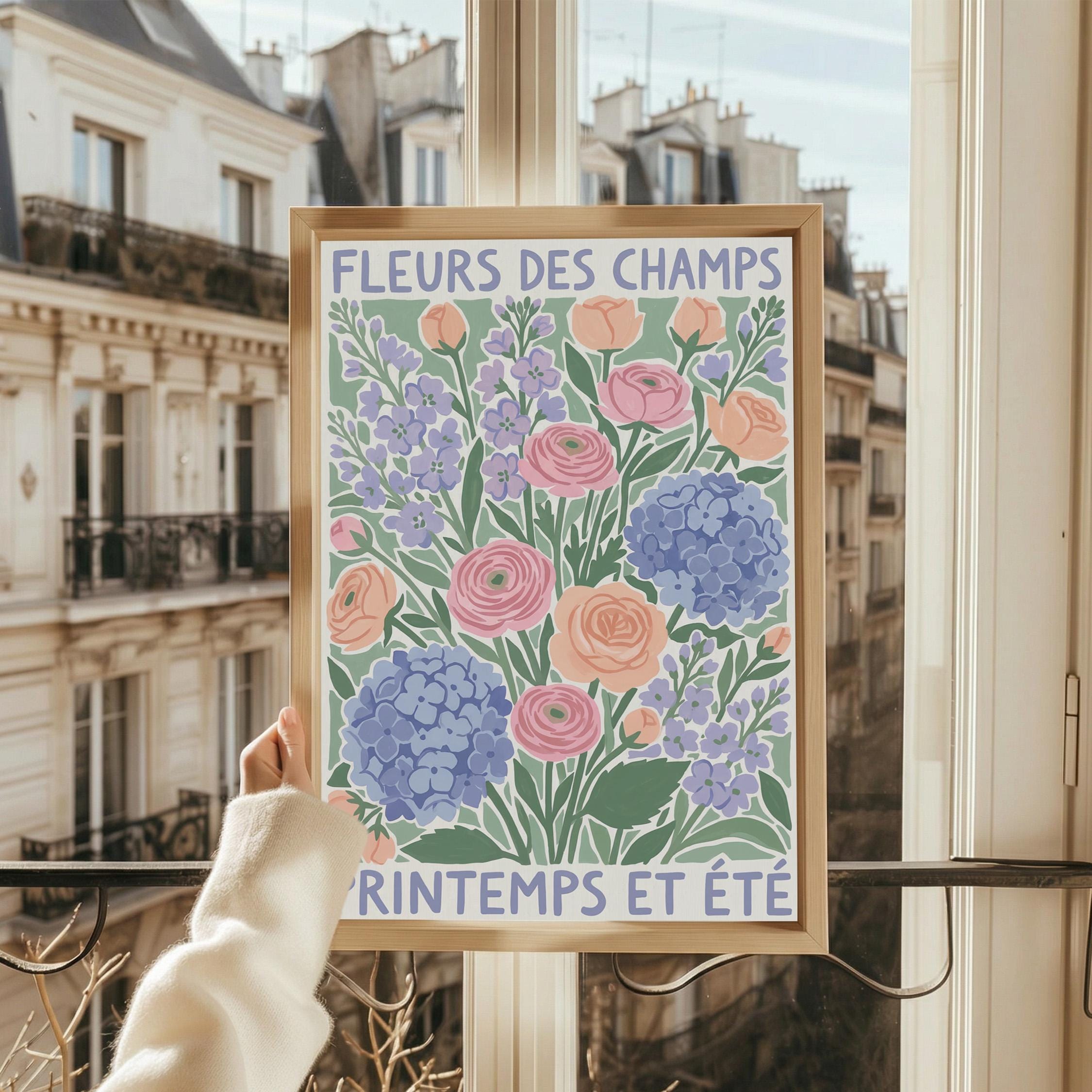 This French wildflower garden wall art print features soft ranunculus, hydrangeas, and lavender in pastel peach, pink, and periwinkle tones with charming vintage typography. Perfect for cottage, farmhouse, or French country style lovers who want to bring springtime beauty into their bedroom, kitchen, nursery, or living room. Creates a serene, romantic, and nature-inspired atmosphere with its delicate botanical illustration and soothing color palette.