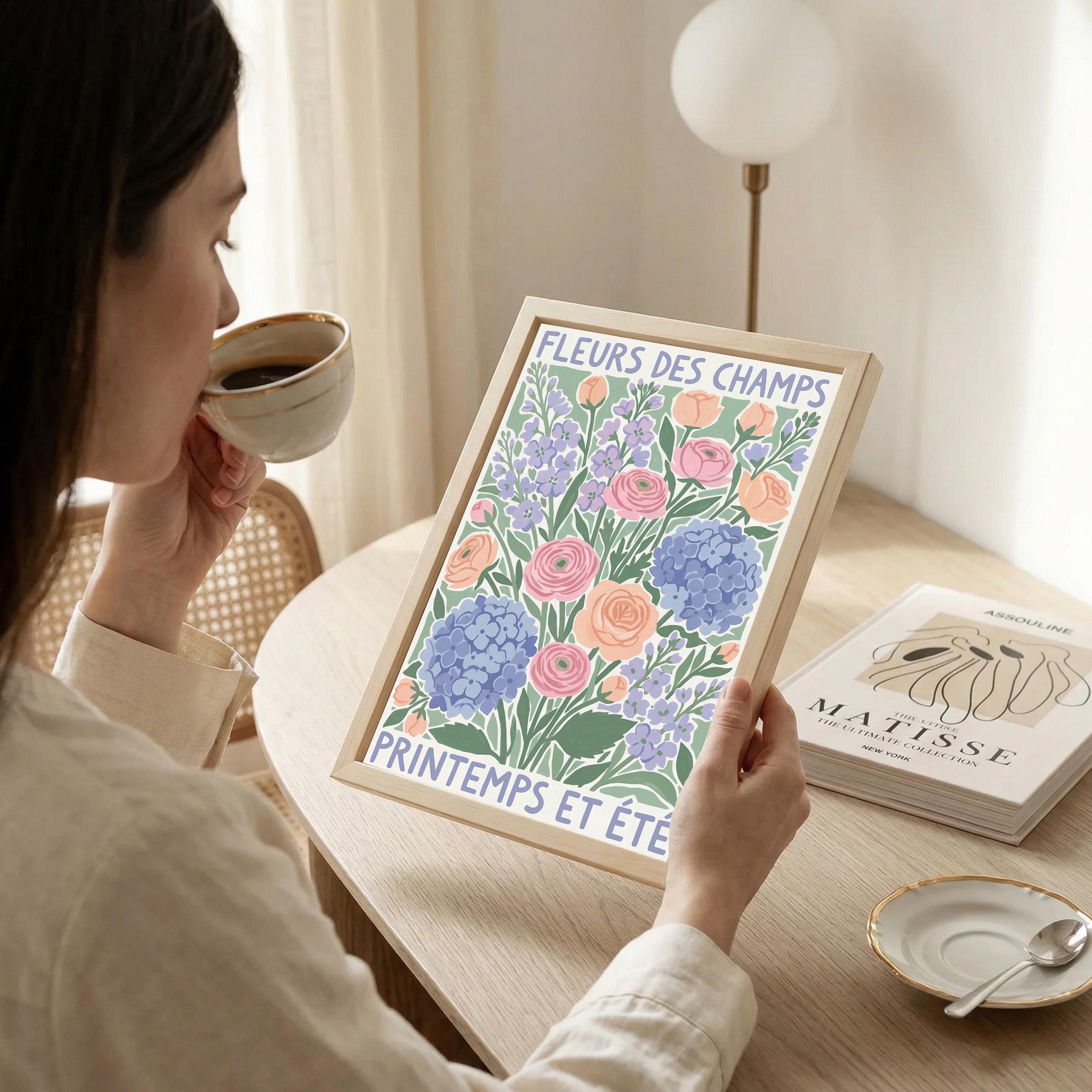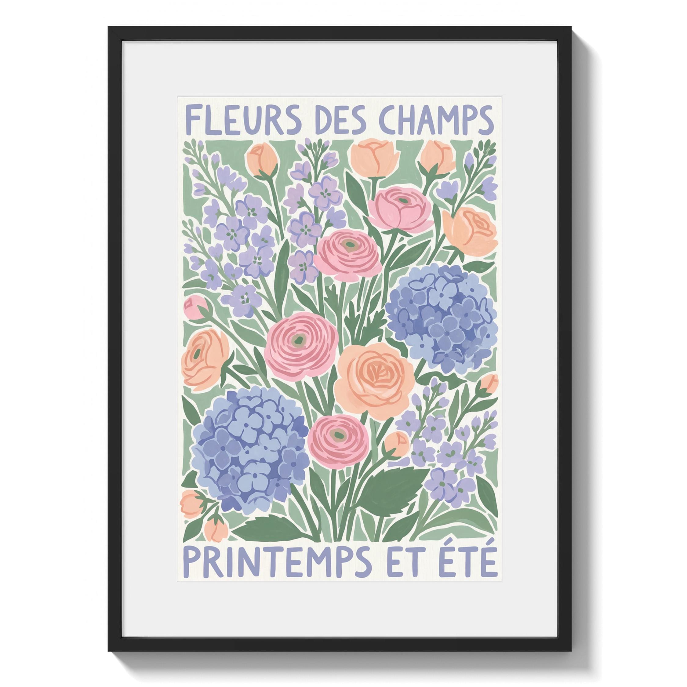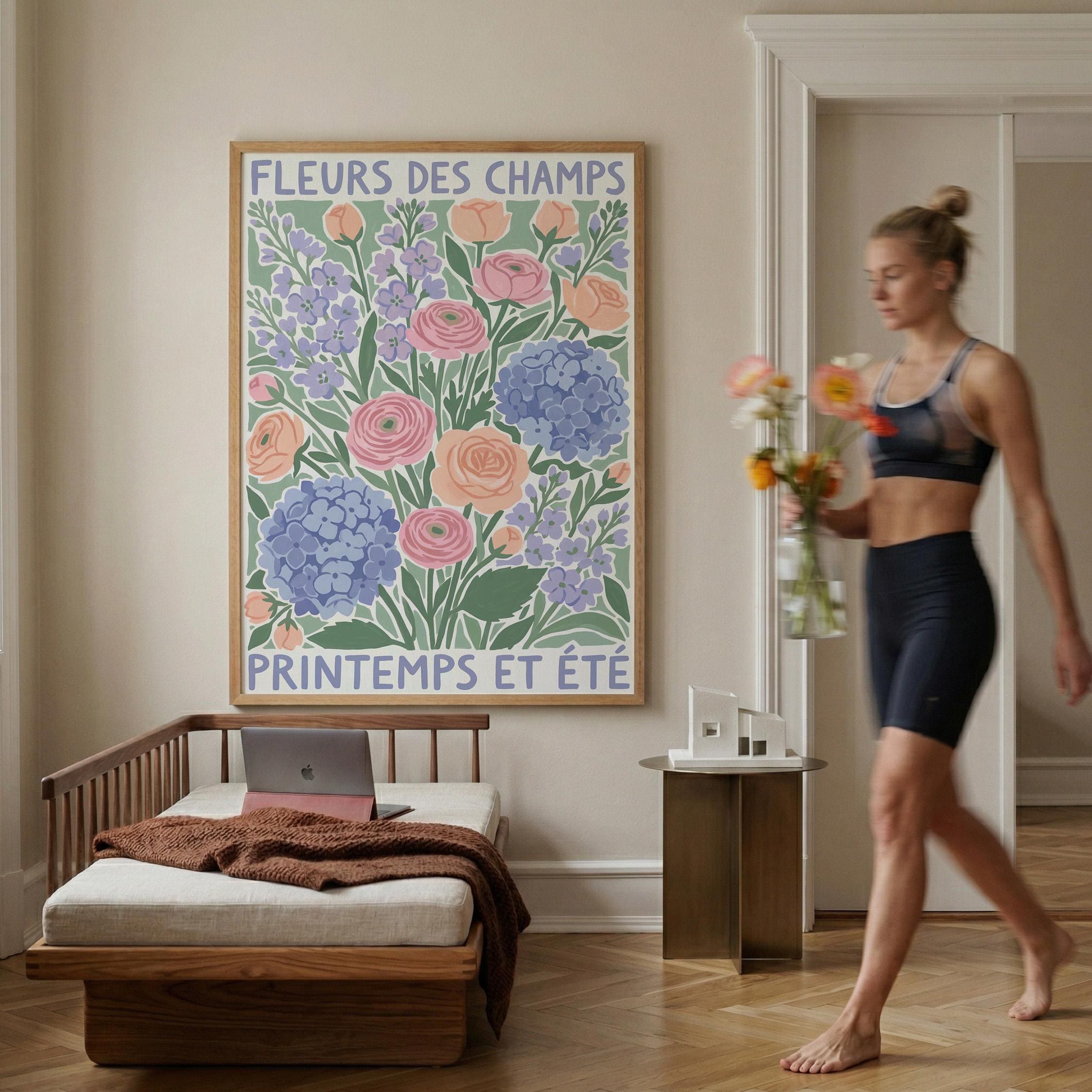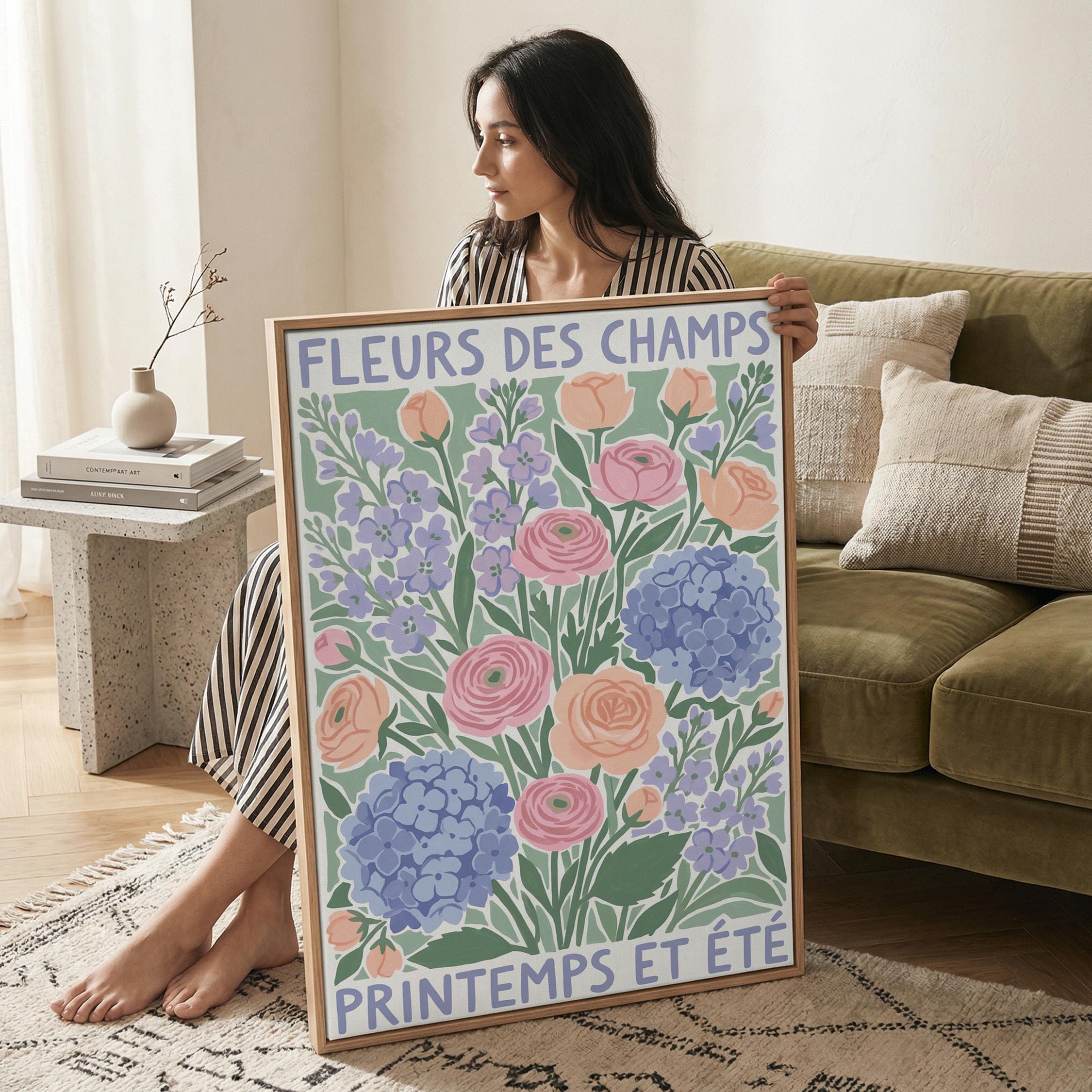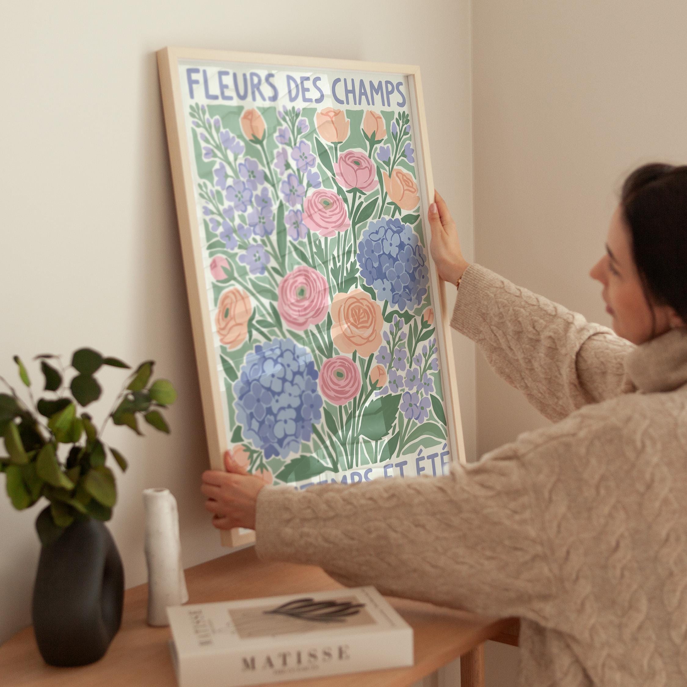 This French wildflower garden wall art print features soft ranunculus, hydrangeas, and lavender in pastel peach, pink, and periwinkle tones with charming vintage typography. Perfect for cottage, farmhouse, or French country style lovers who want to bring springtime beauty into their bedroom, kitchen, nursery, or living room. Creates a serene, romantic, and nature-inspired atmosphere with its delicate botanical illustration and soothing color palette.