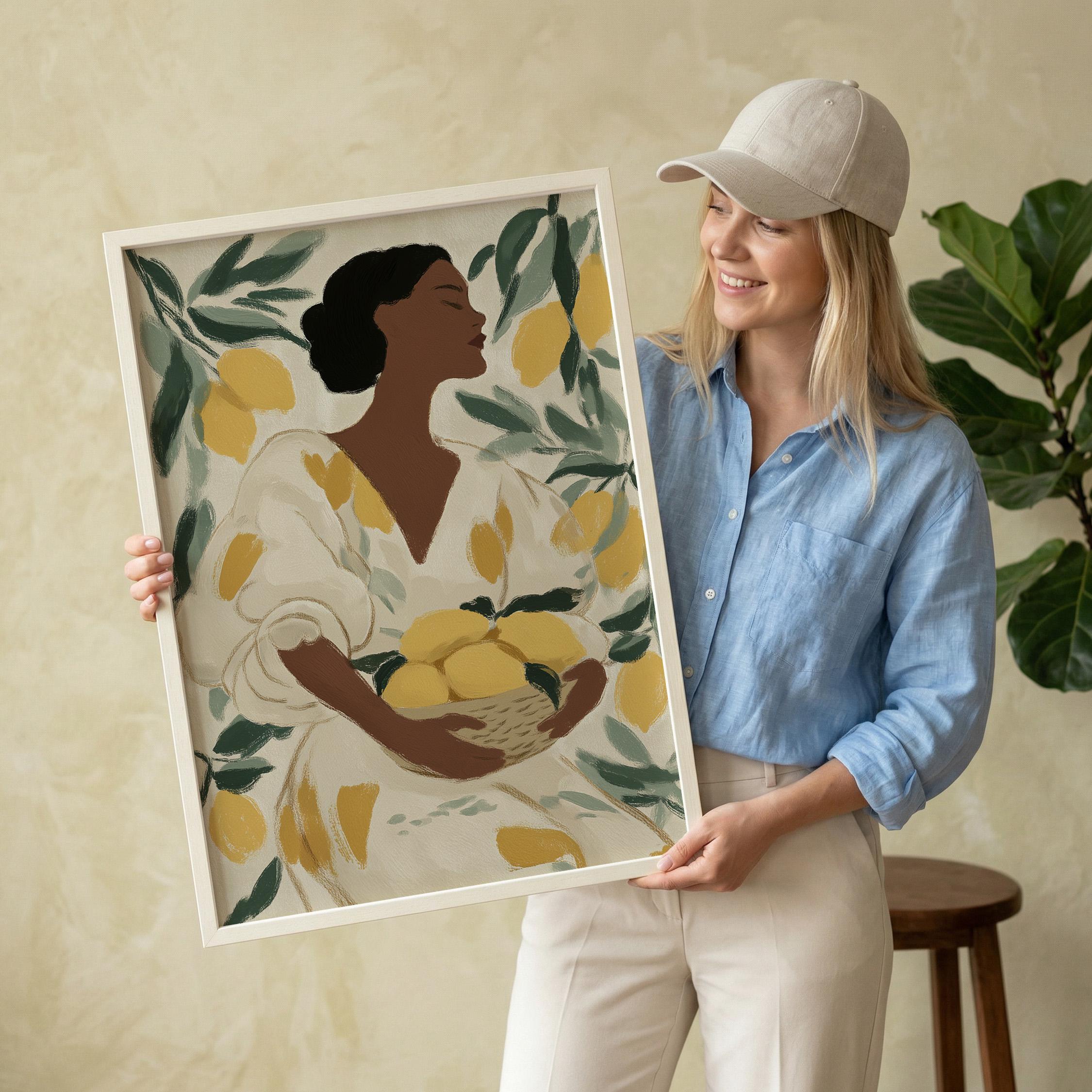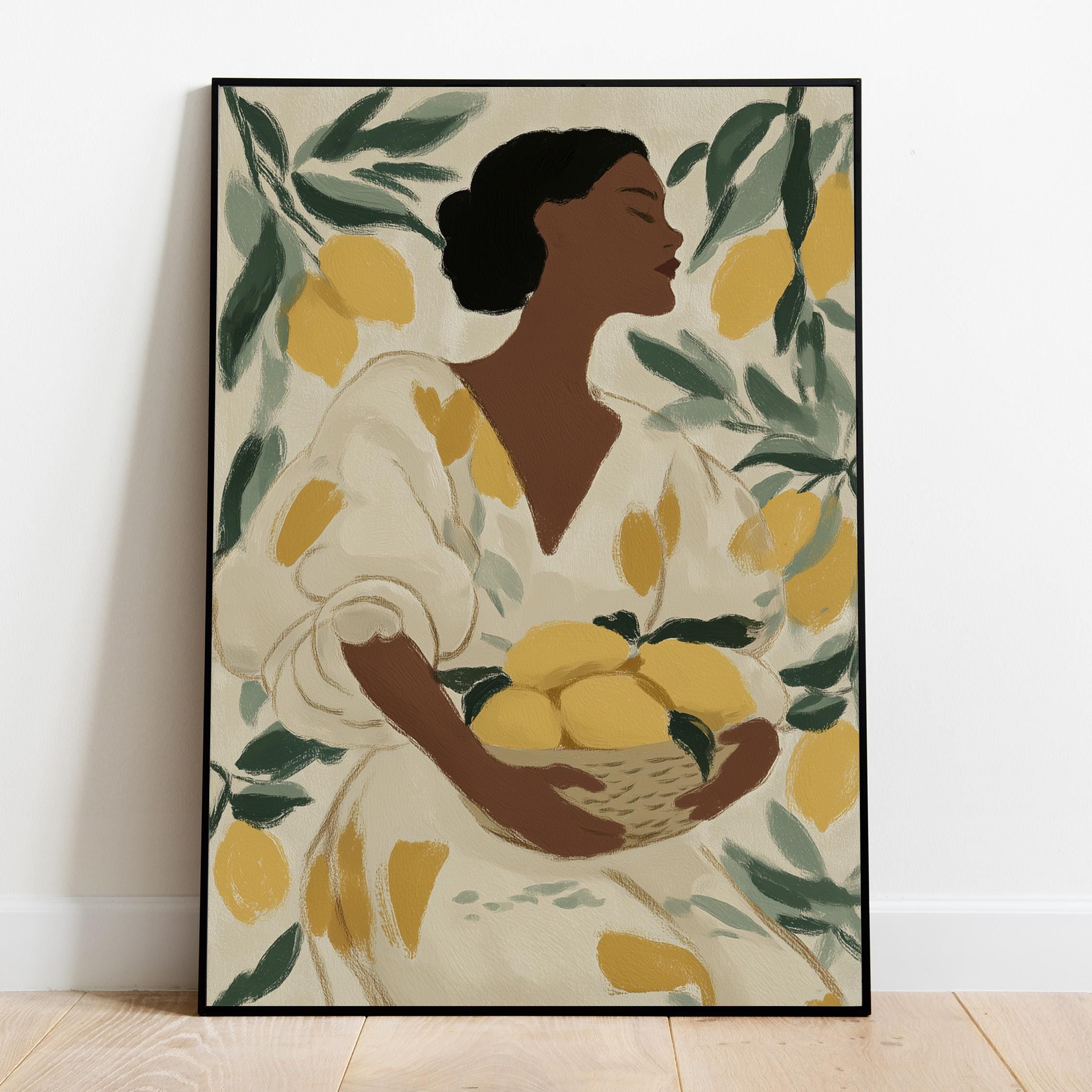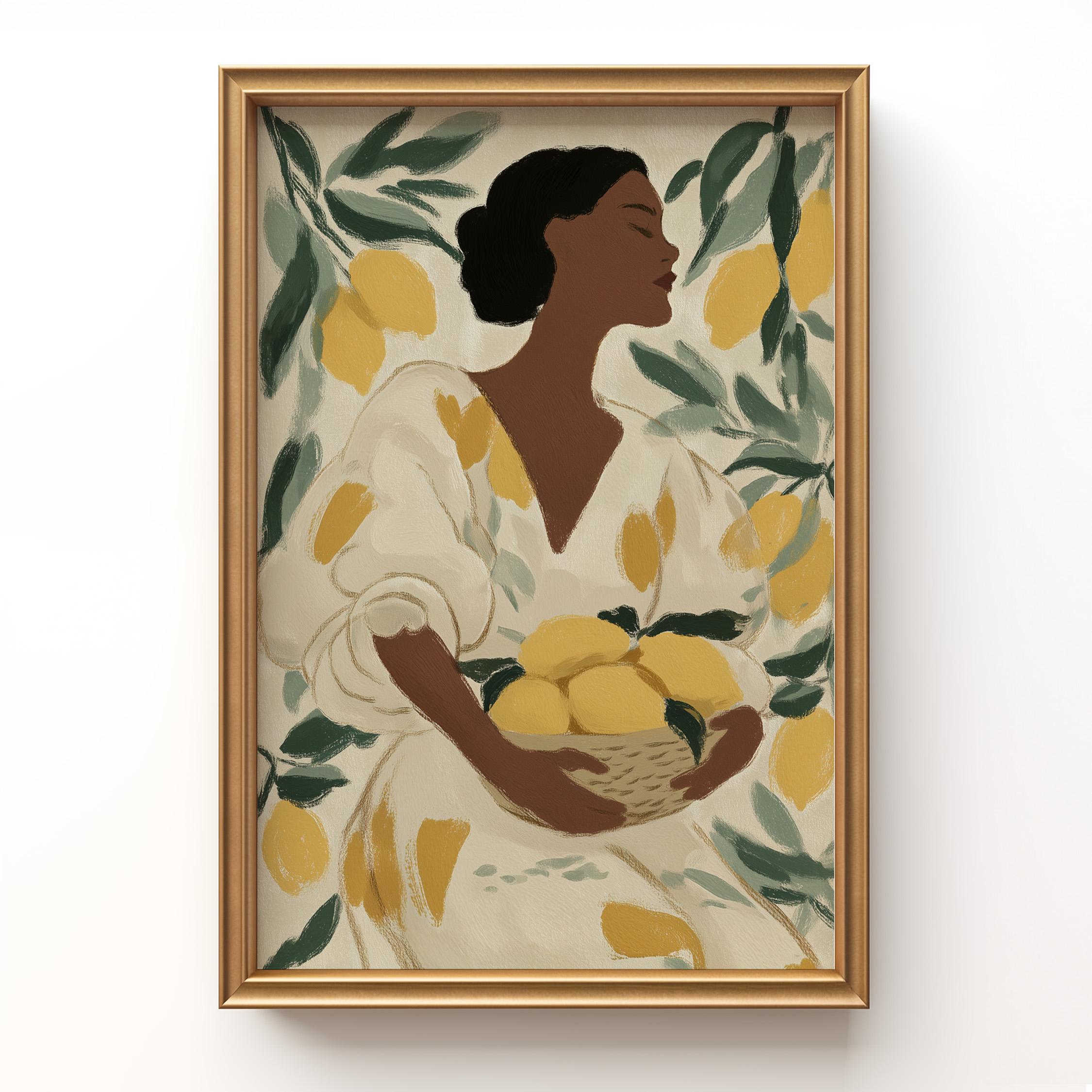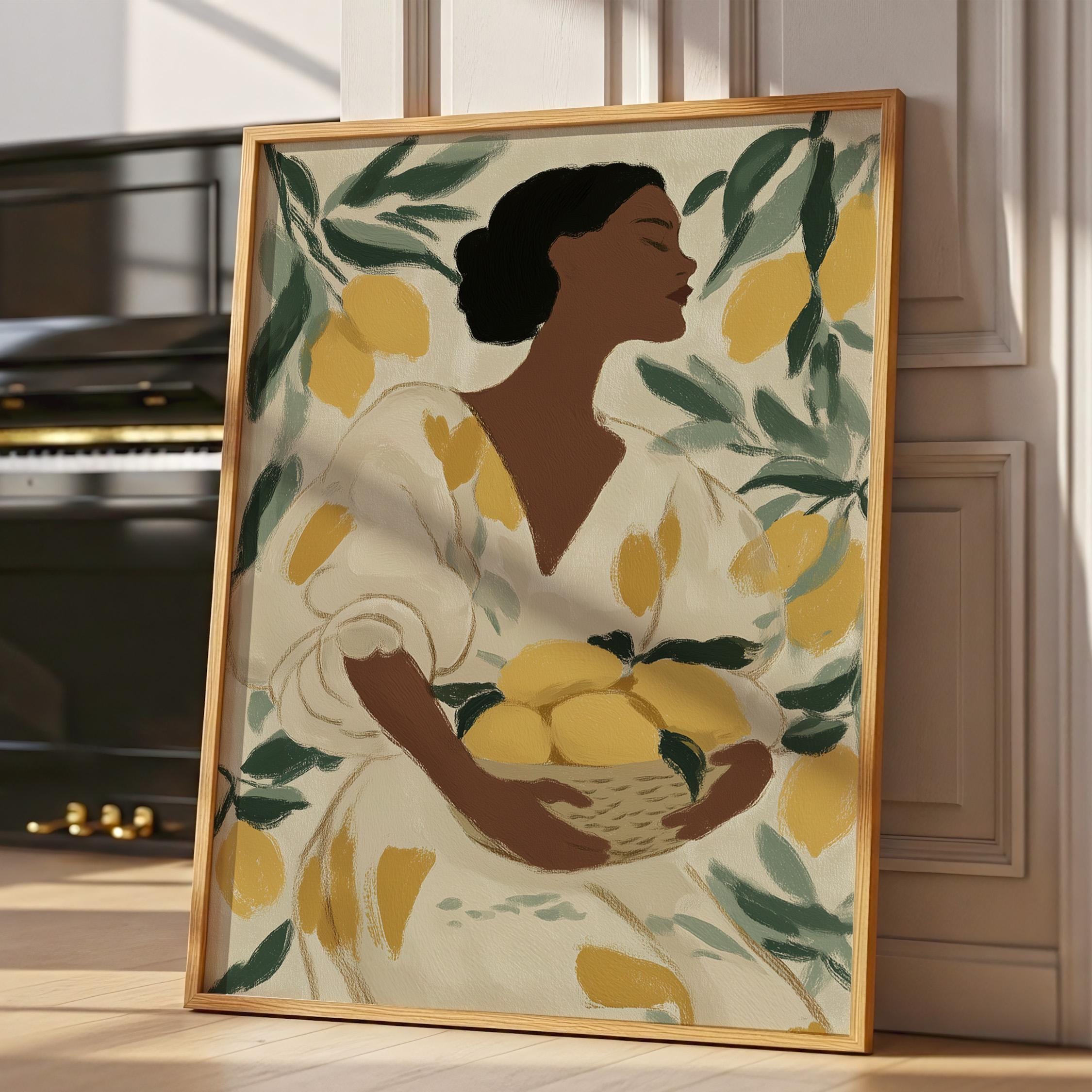 Woman with Lemons Wall Art Print brings Mediterranean warmth and botanical elegance to your kitchen or dining space.