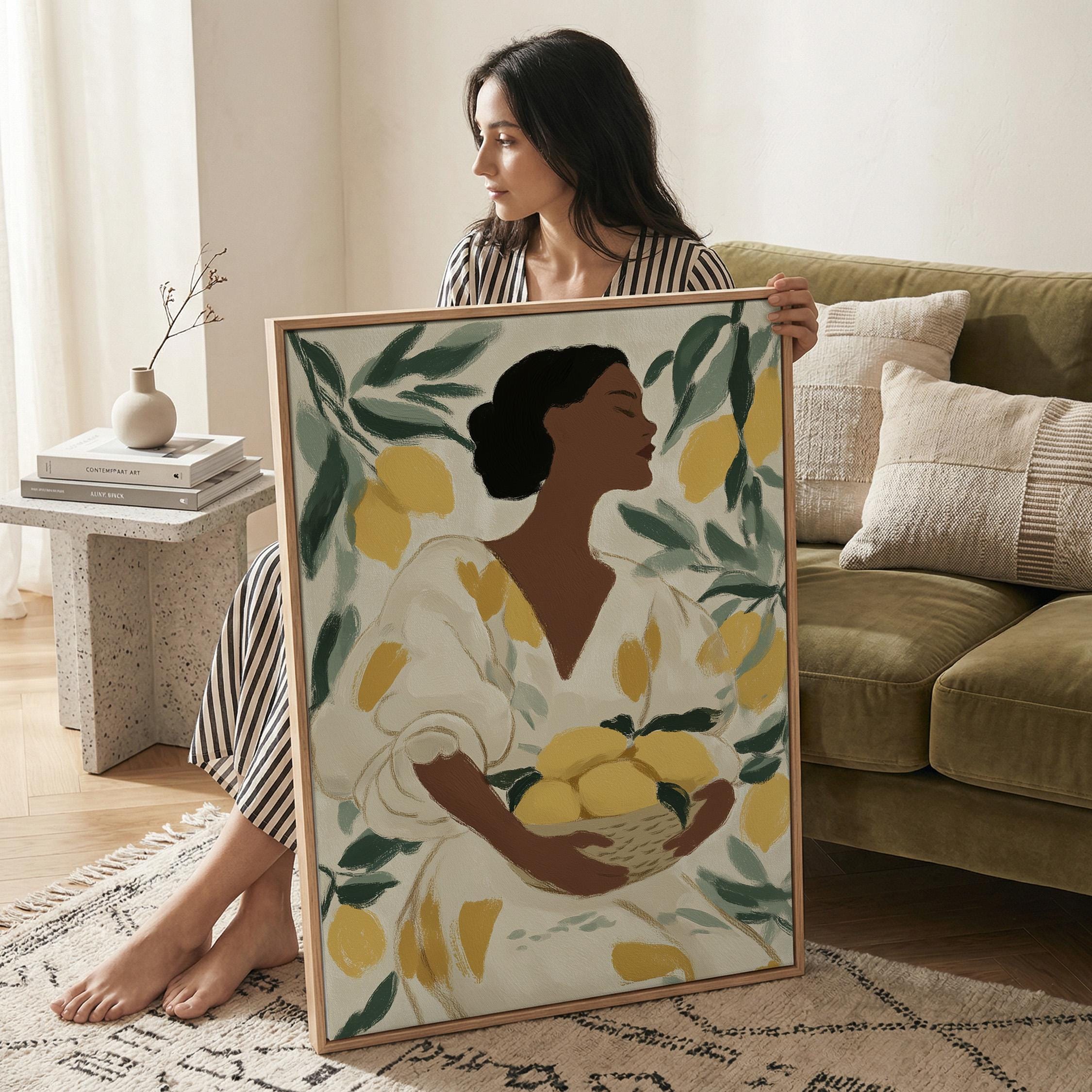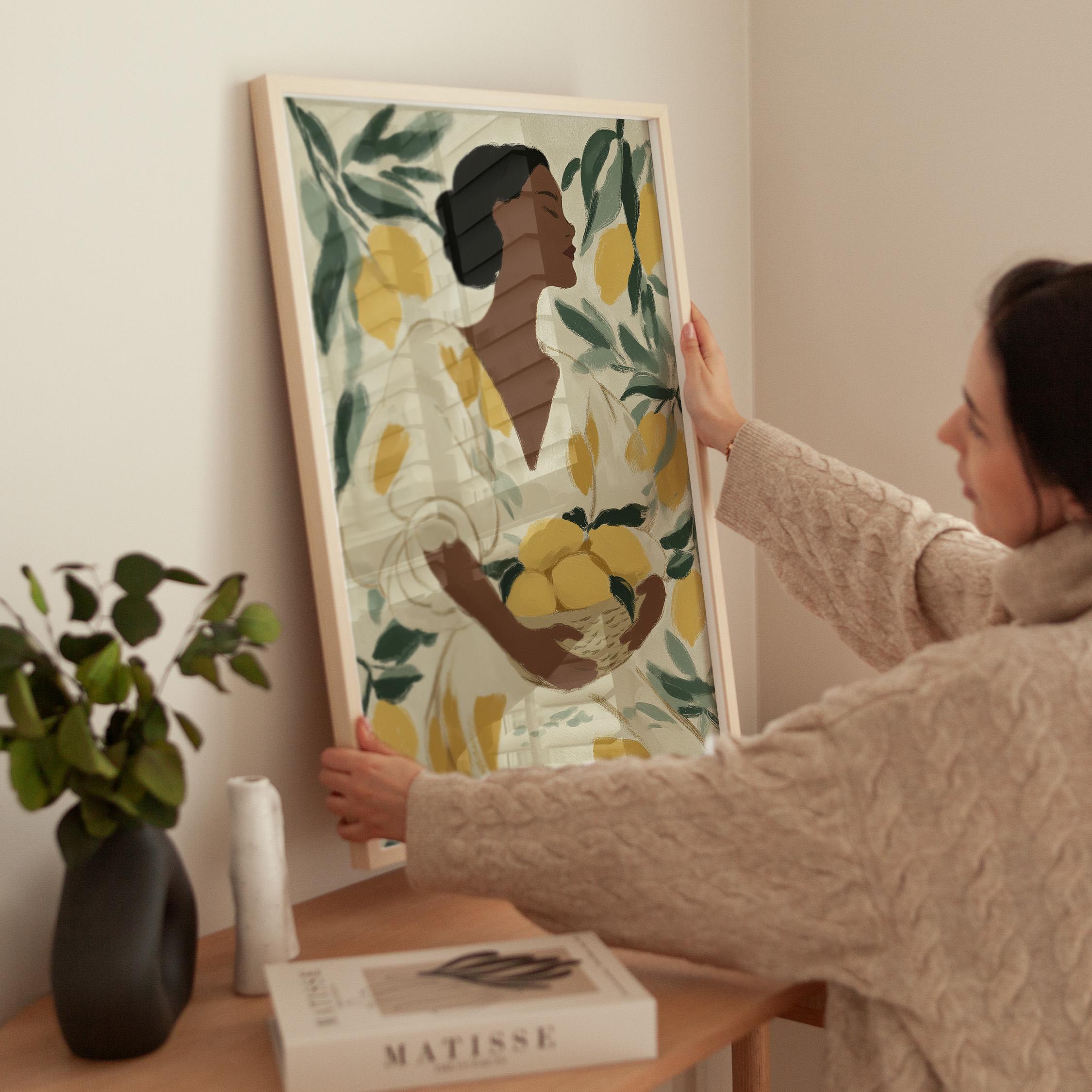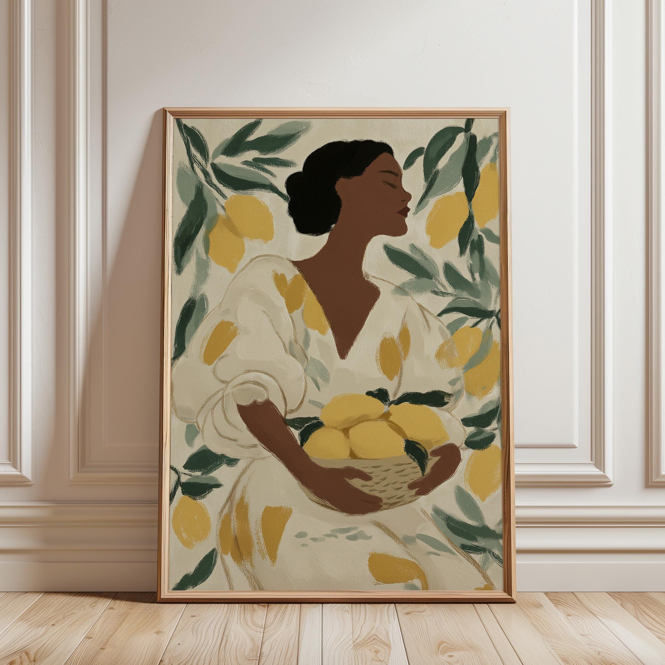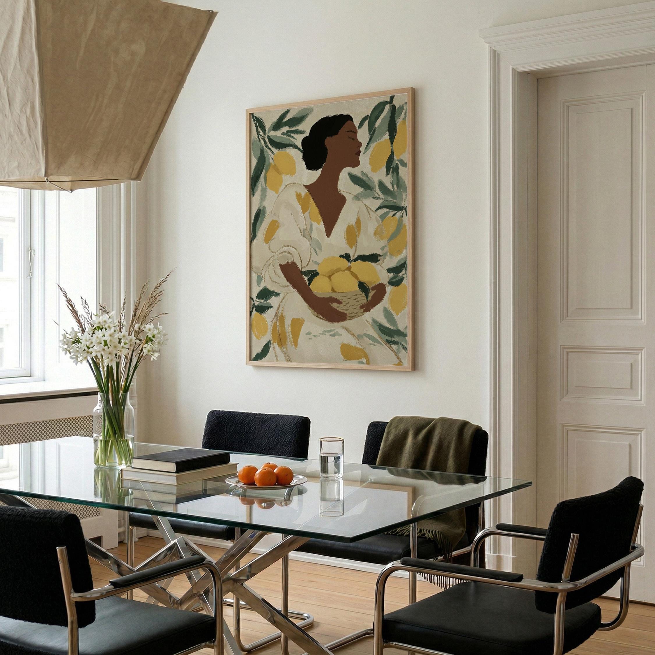 Woman with Lemons Wall Art Print brings Mediterranean warmth and botanical elegance to your kitchen or dining space.