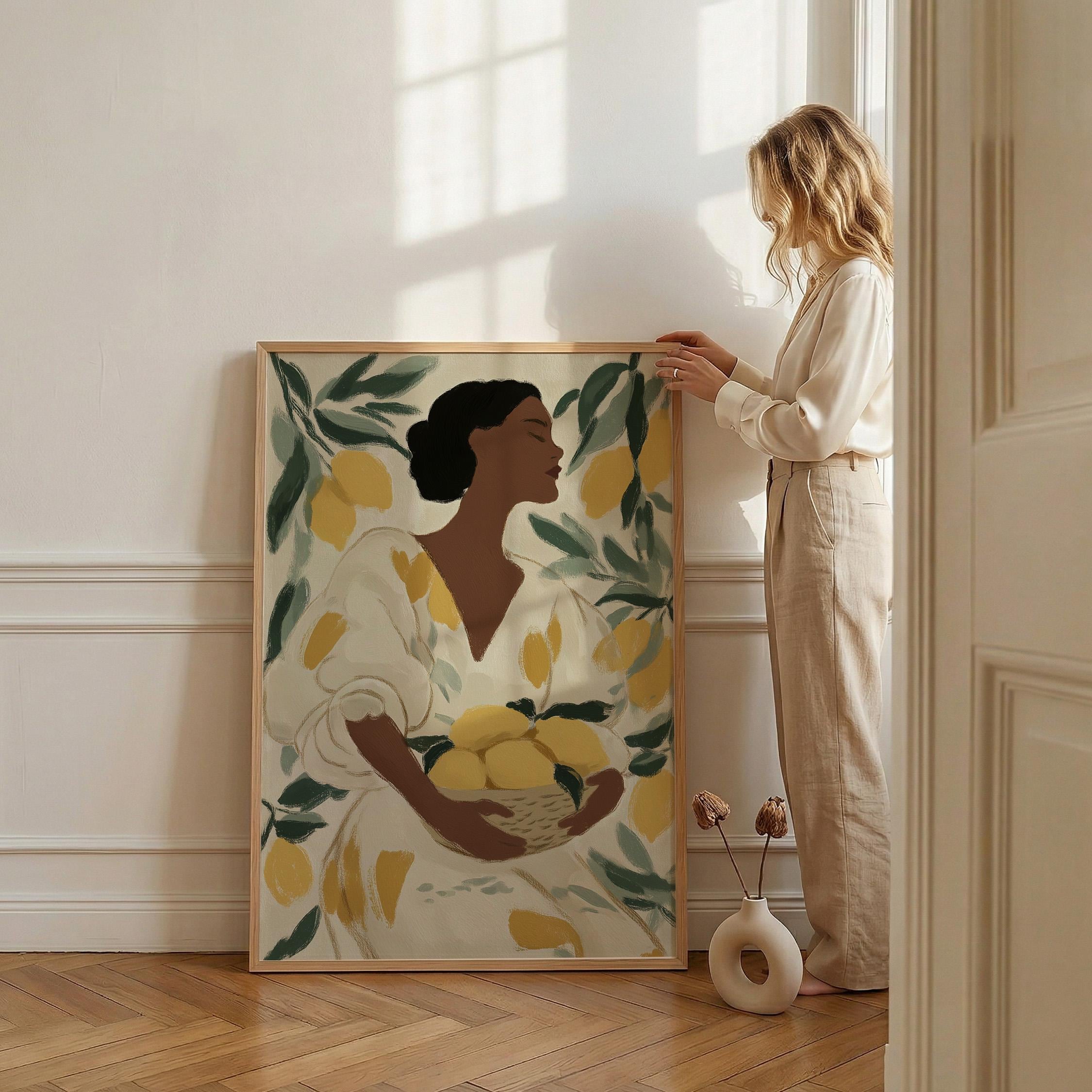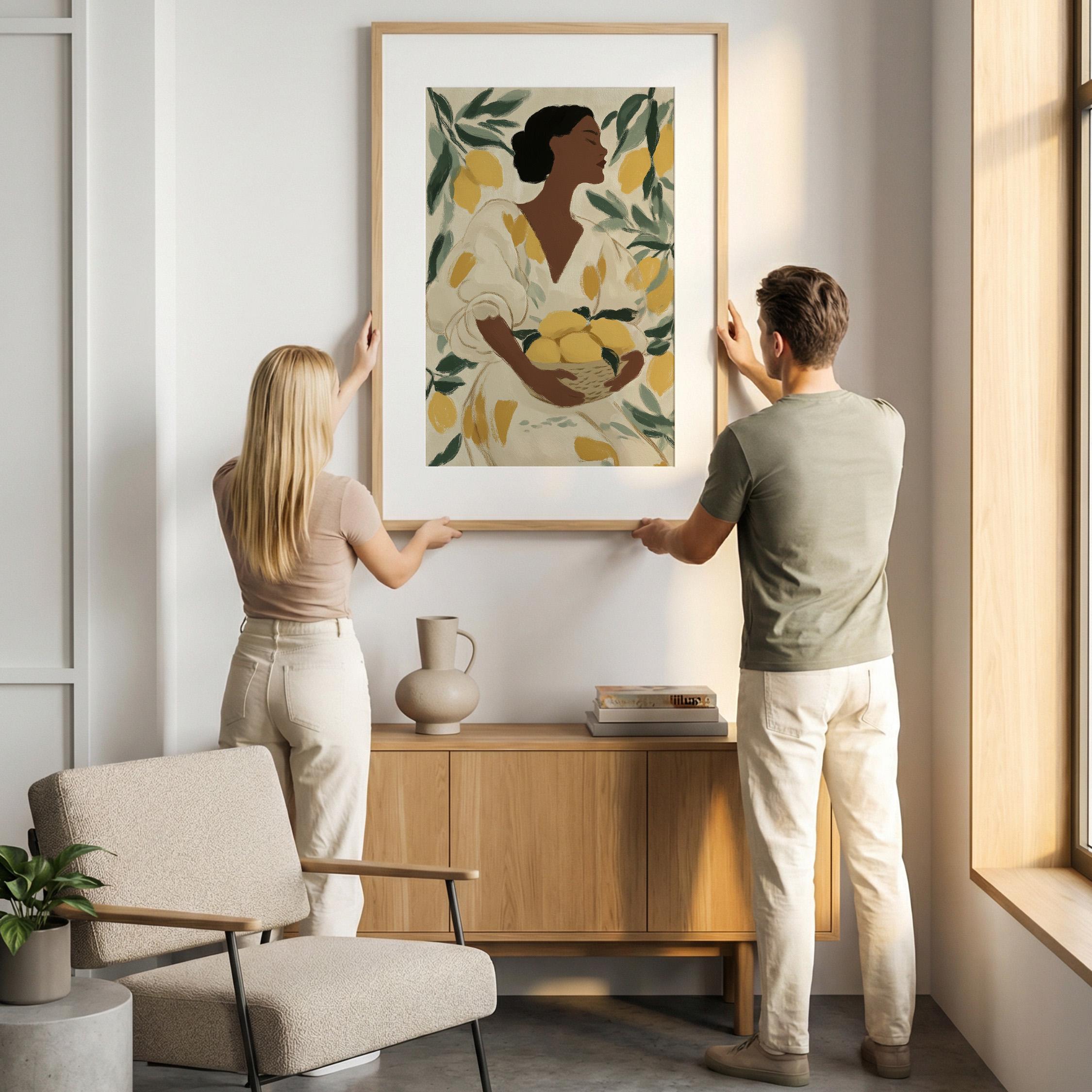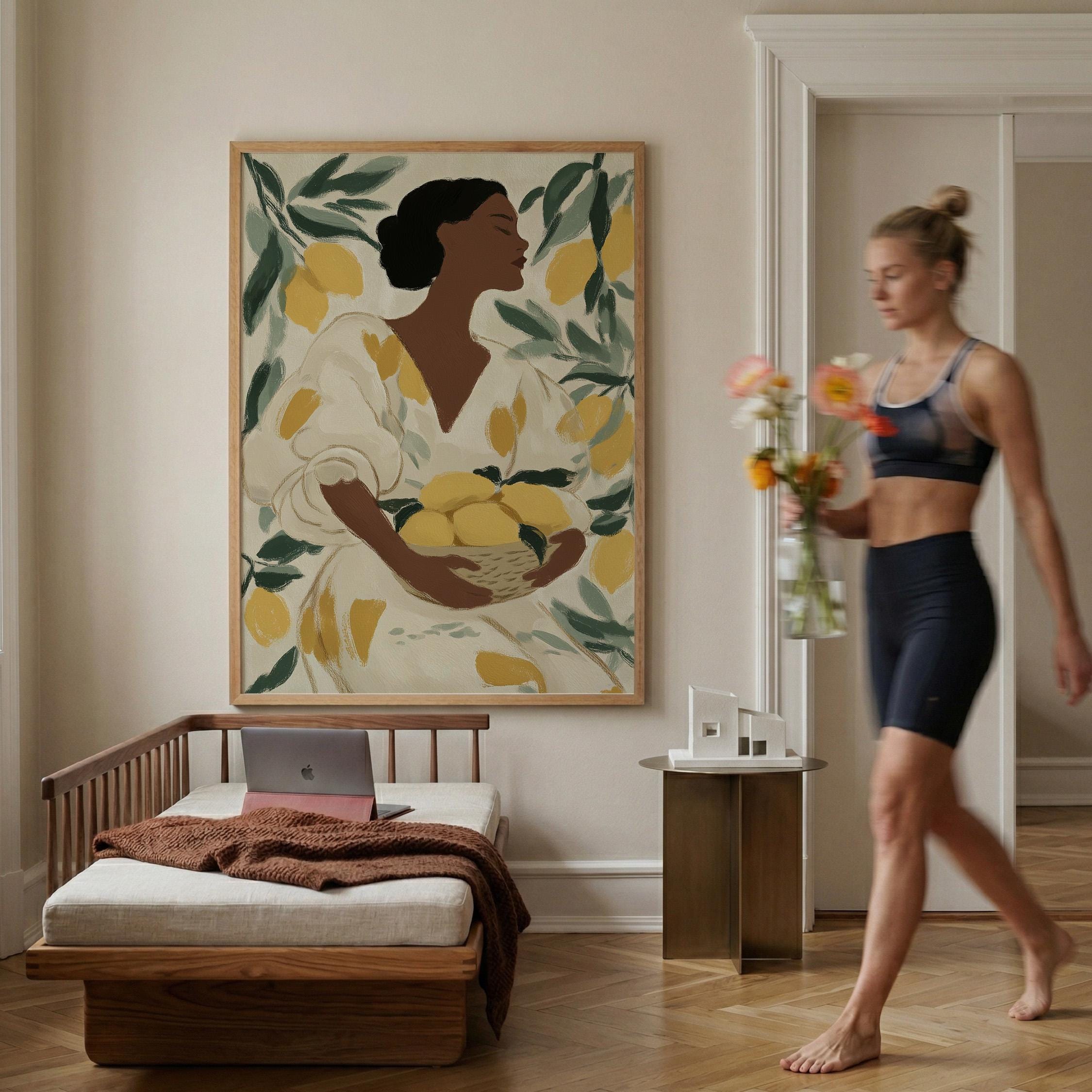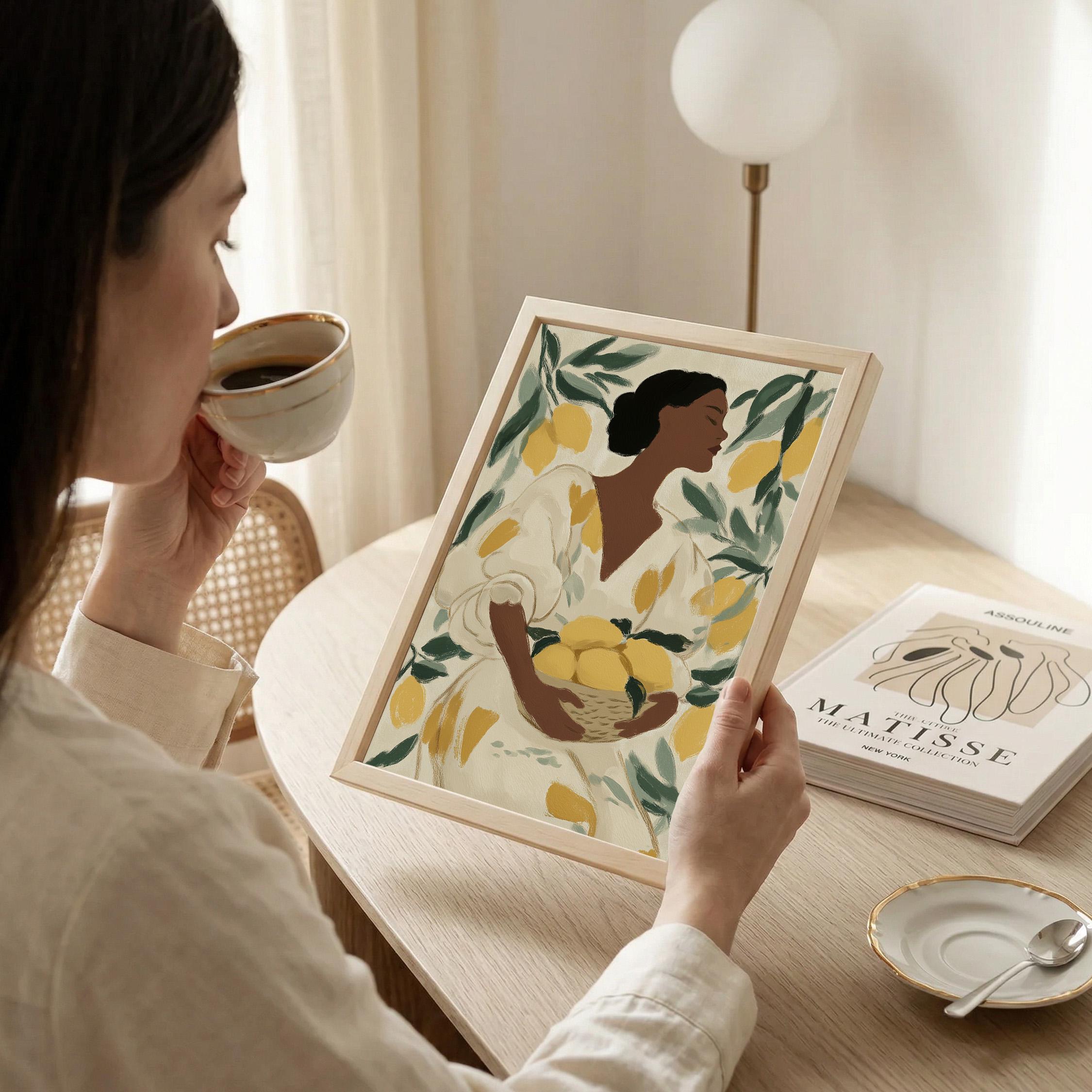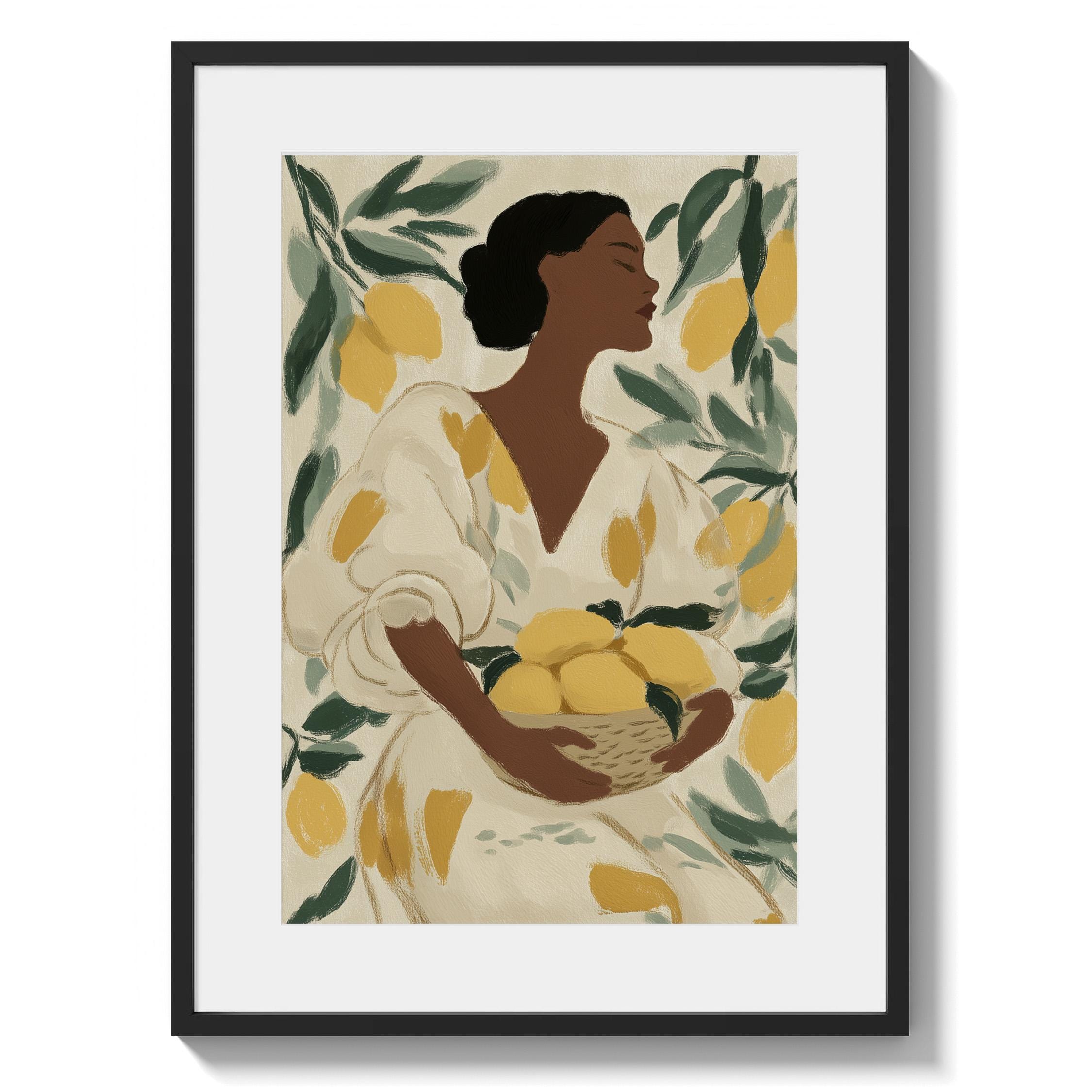 Woman with Lemons Wall Art Print brings Mediterranean warmth and botanical elegance to your kitchen or dining space.