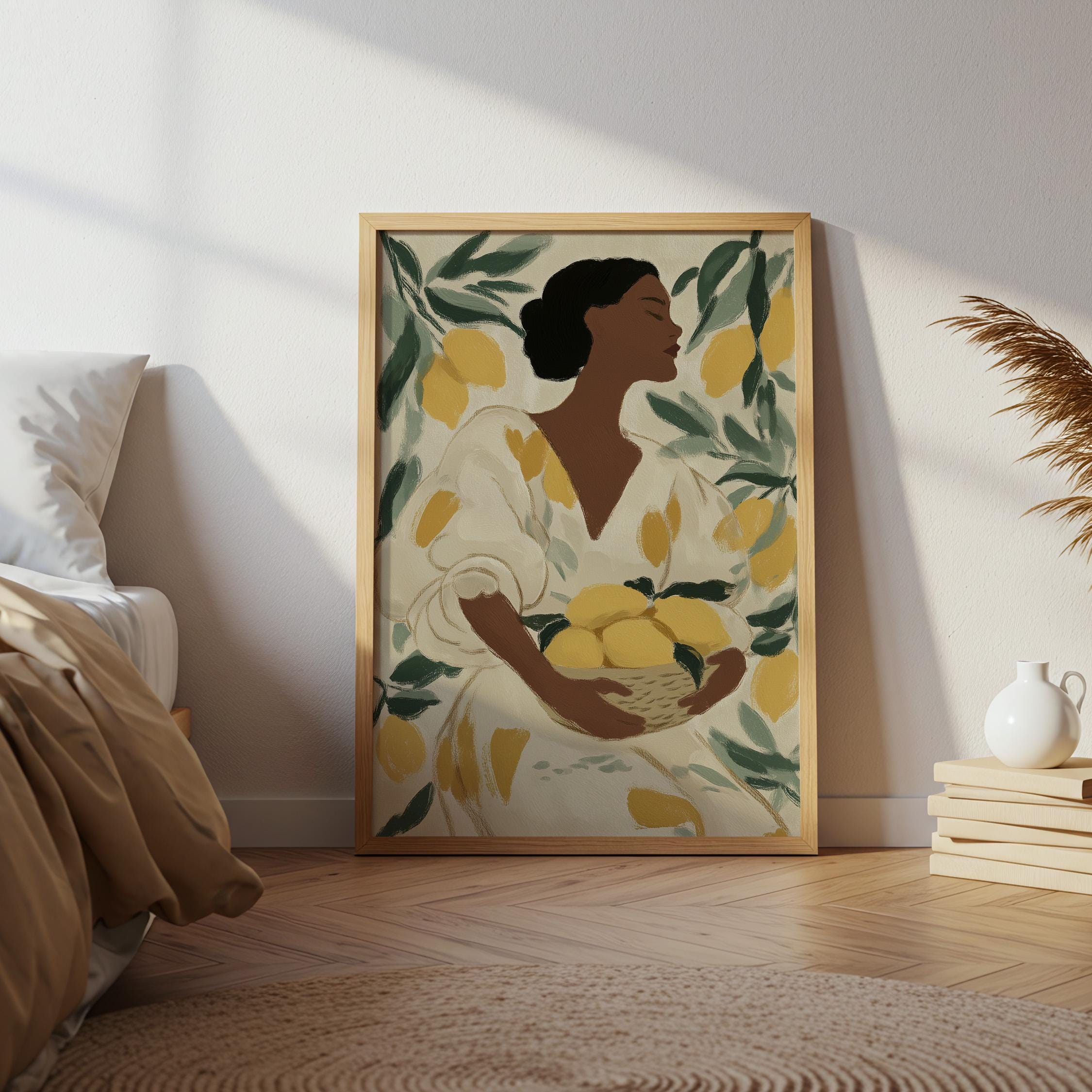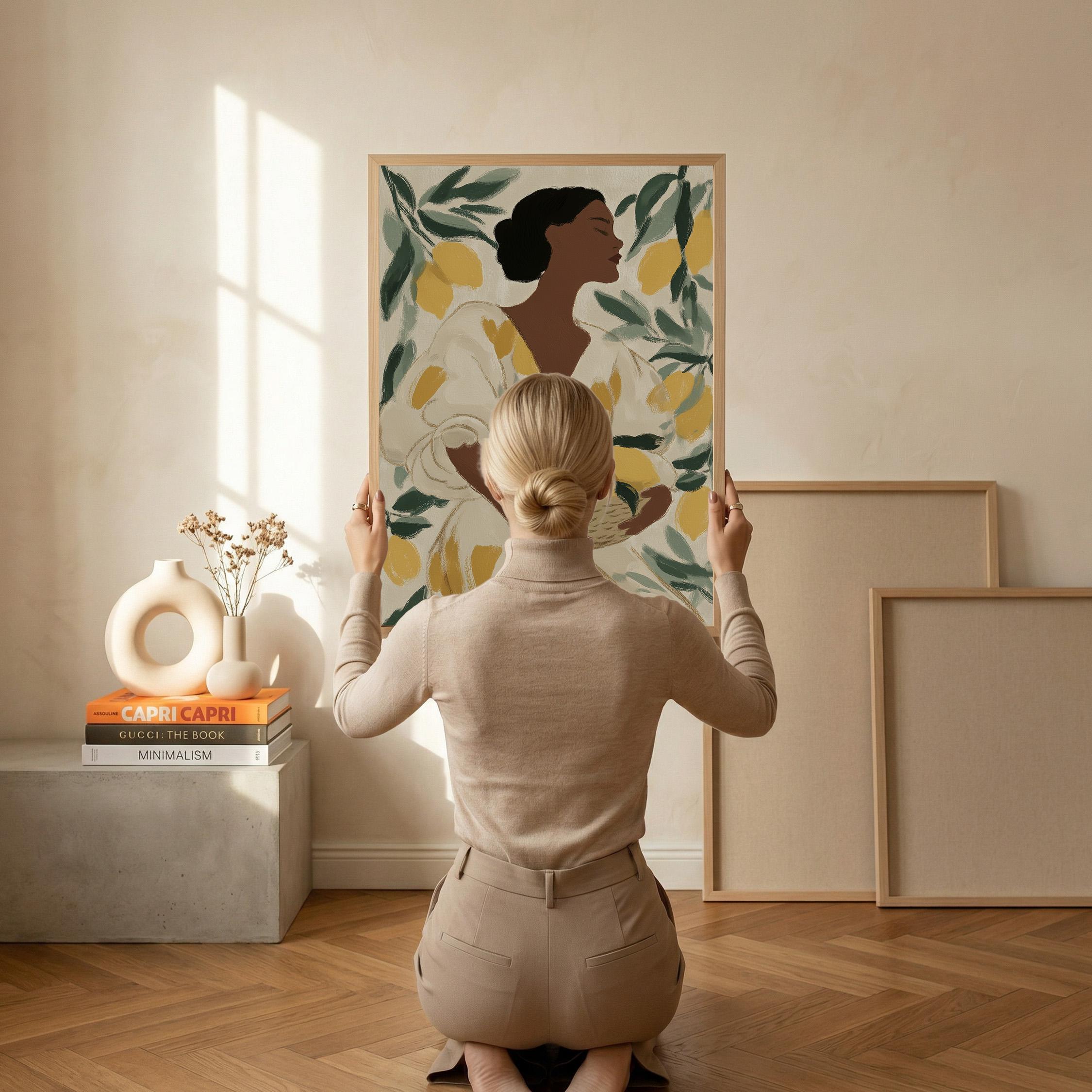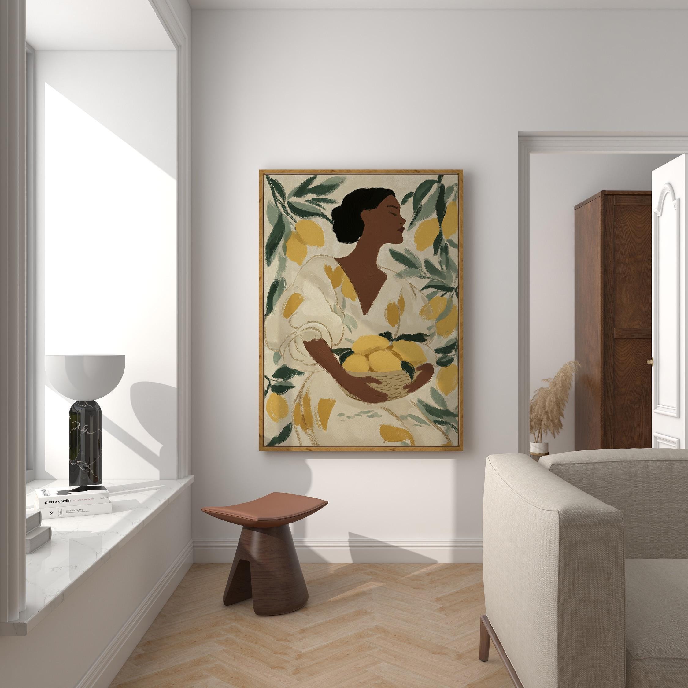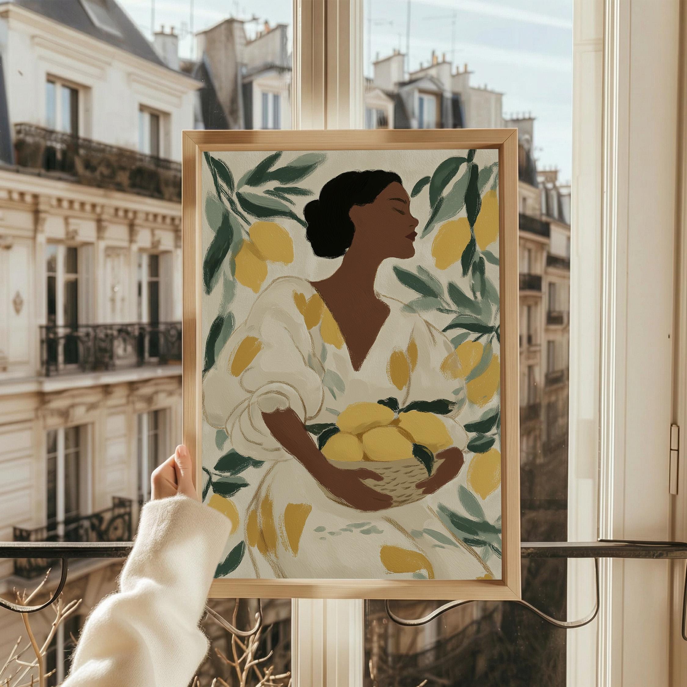 Woman with Lemons Wall Art Print brings Mediterranean warmth and botanical elegance to your kitchen or dining space.