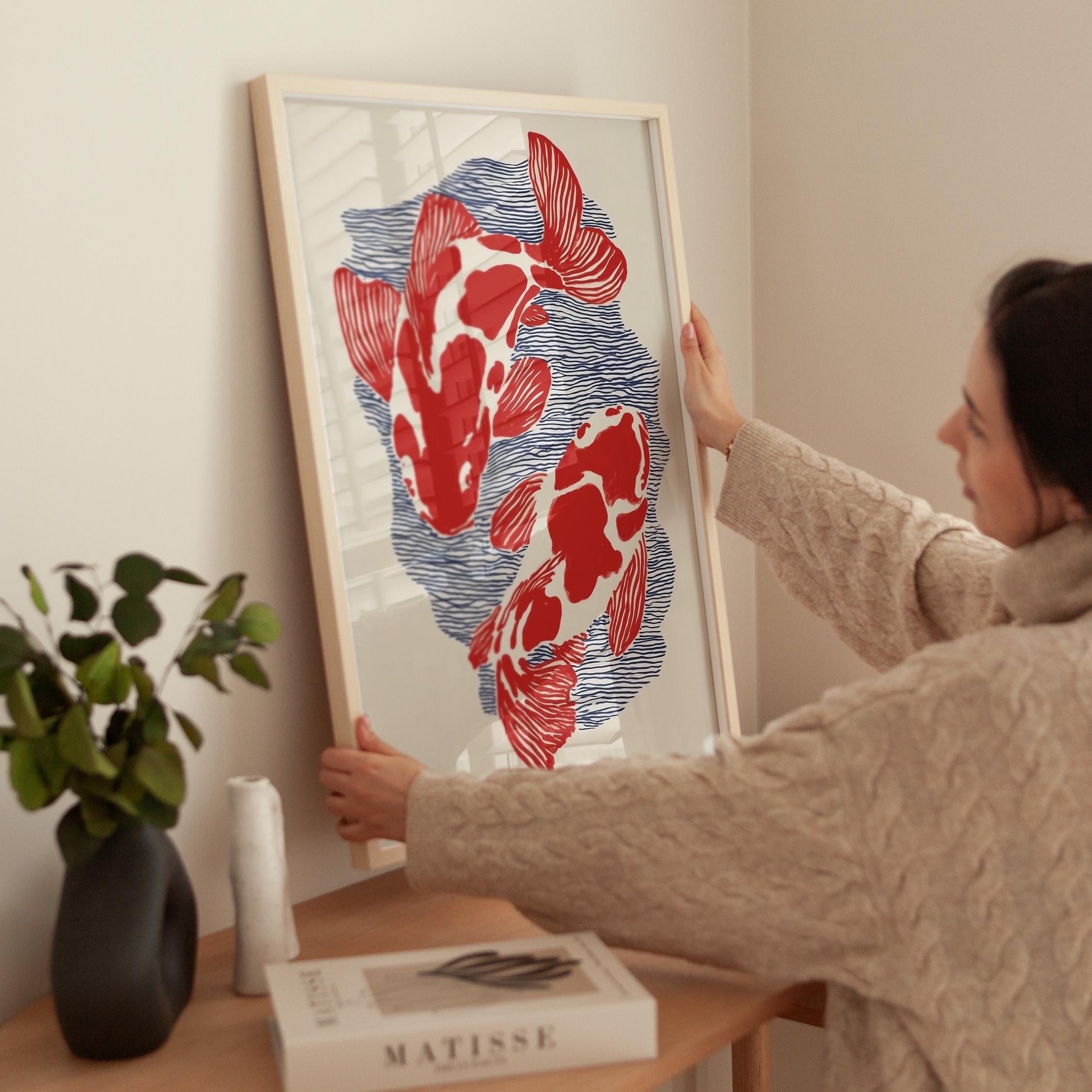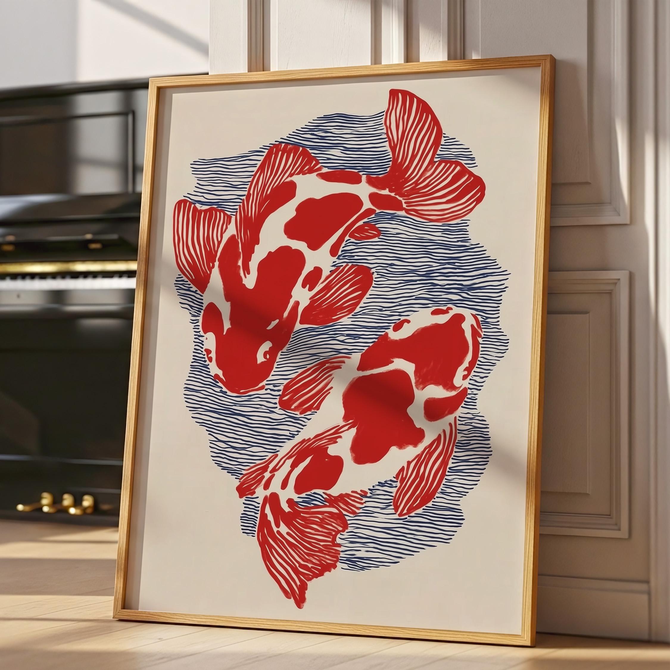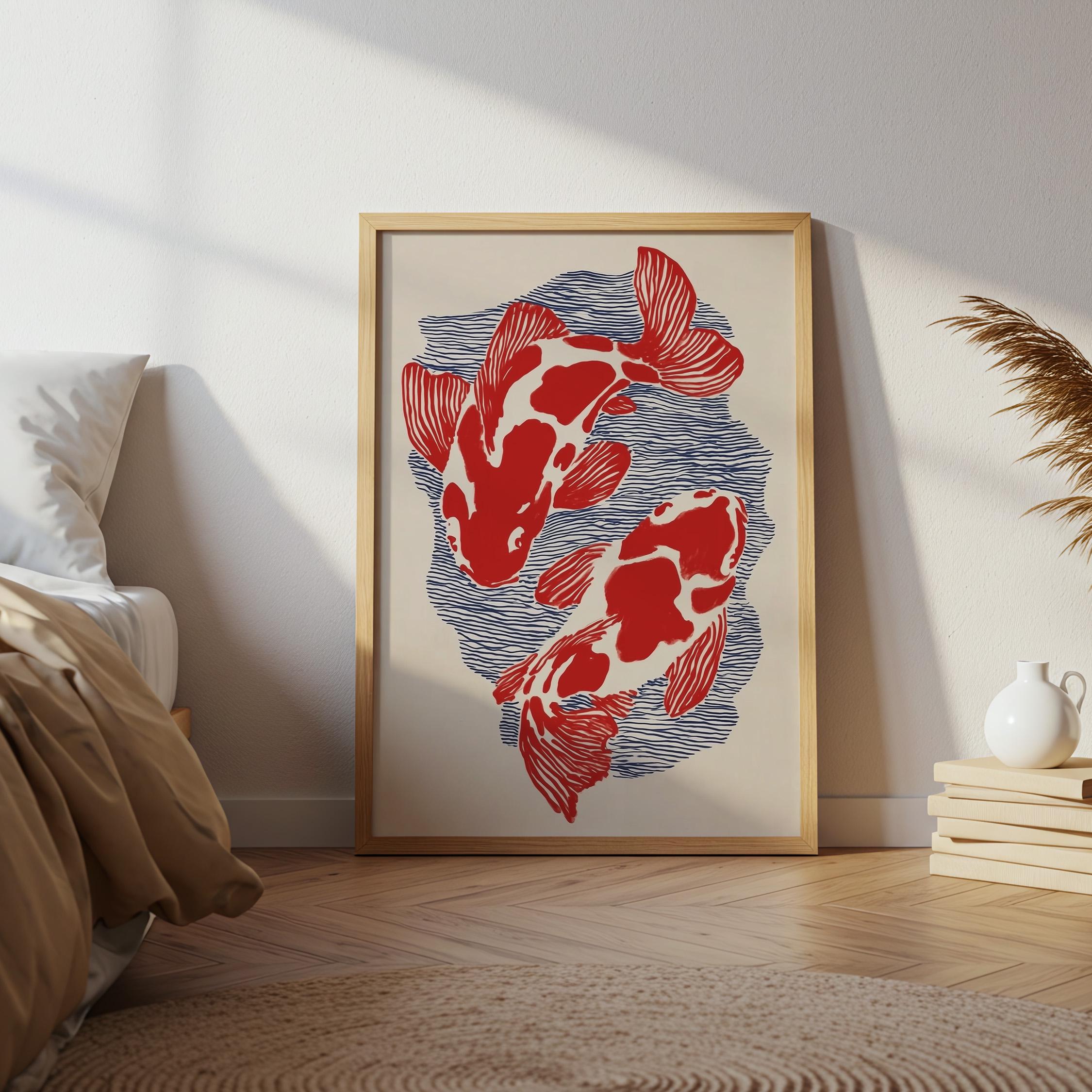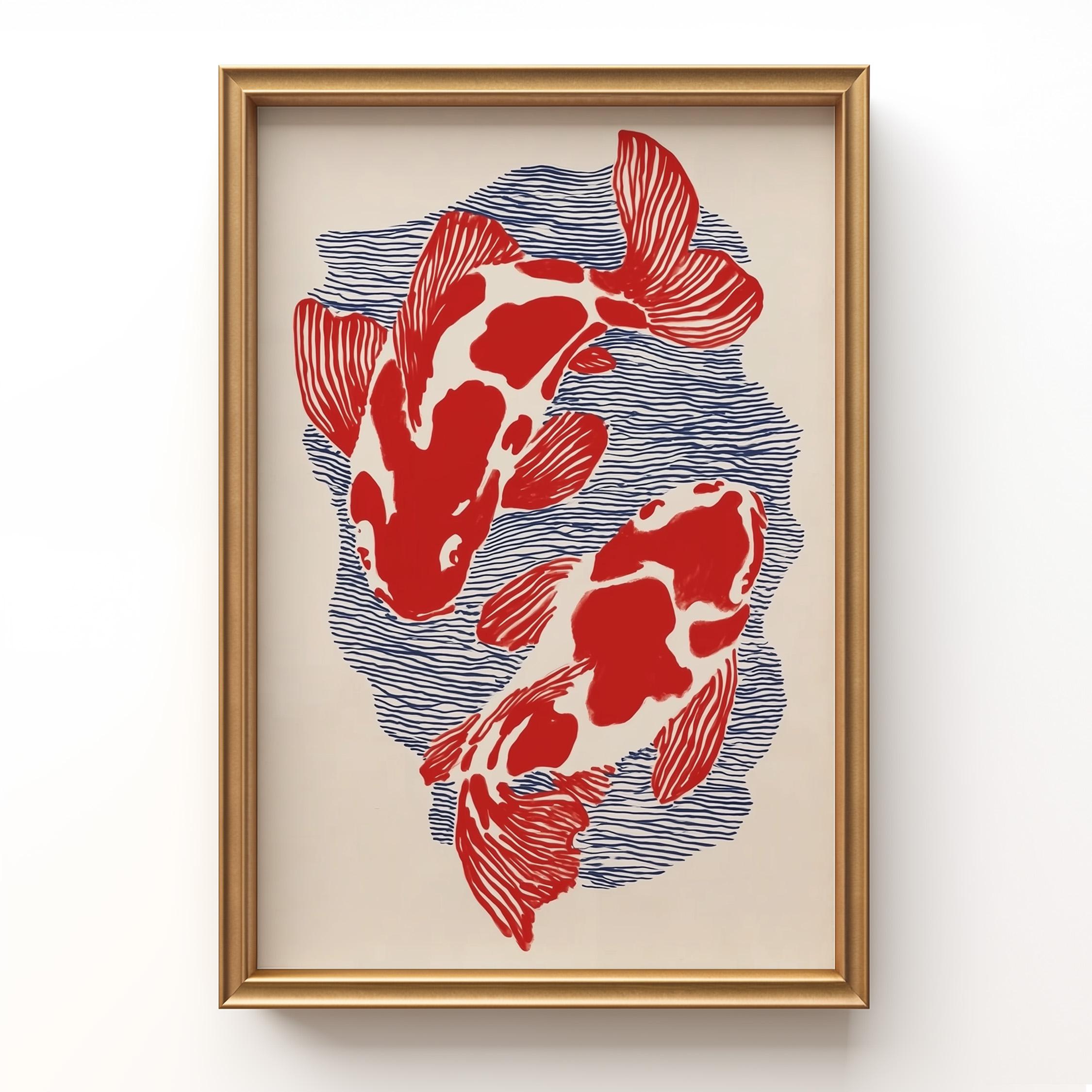 Transform your space with this striking koi fish wall art print featuring bold red fish swimming through flowing blue waves on a neutral background.