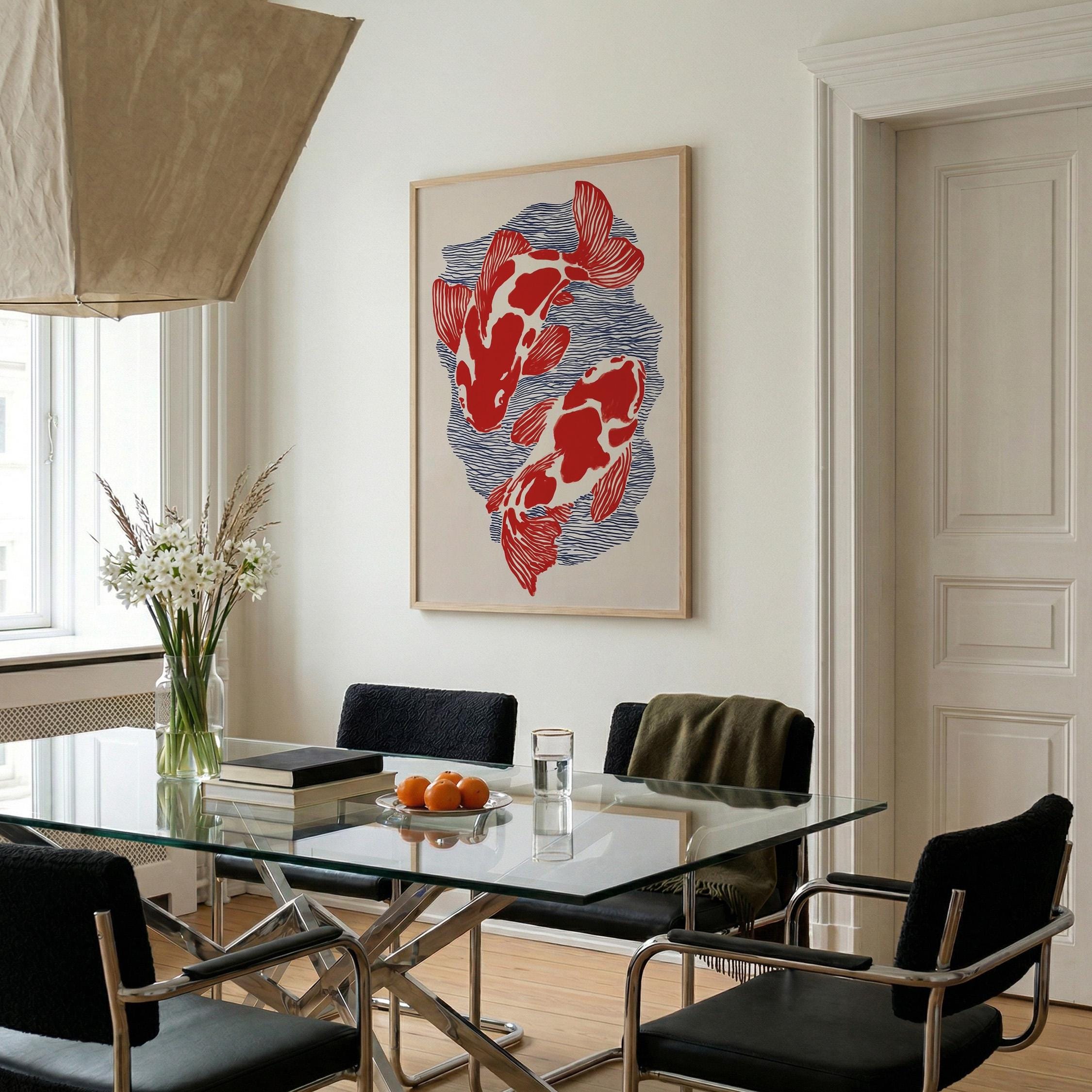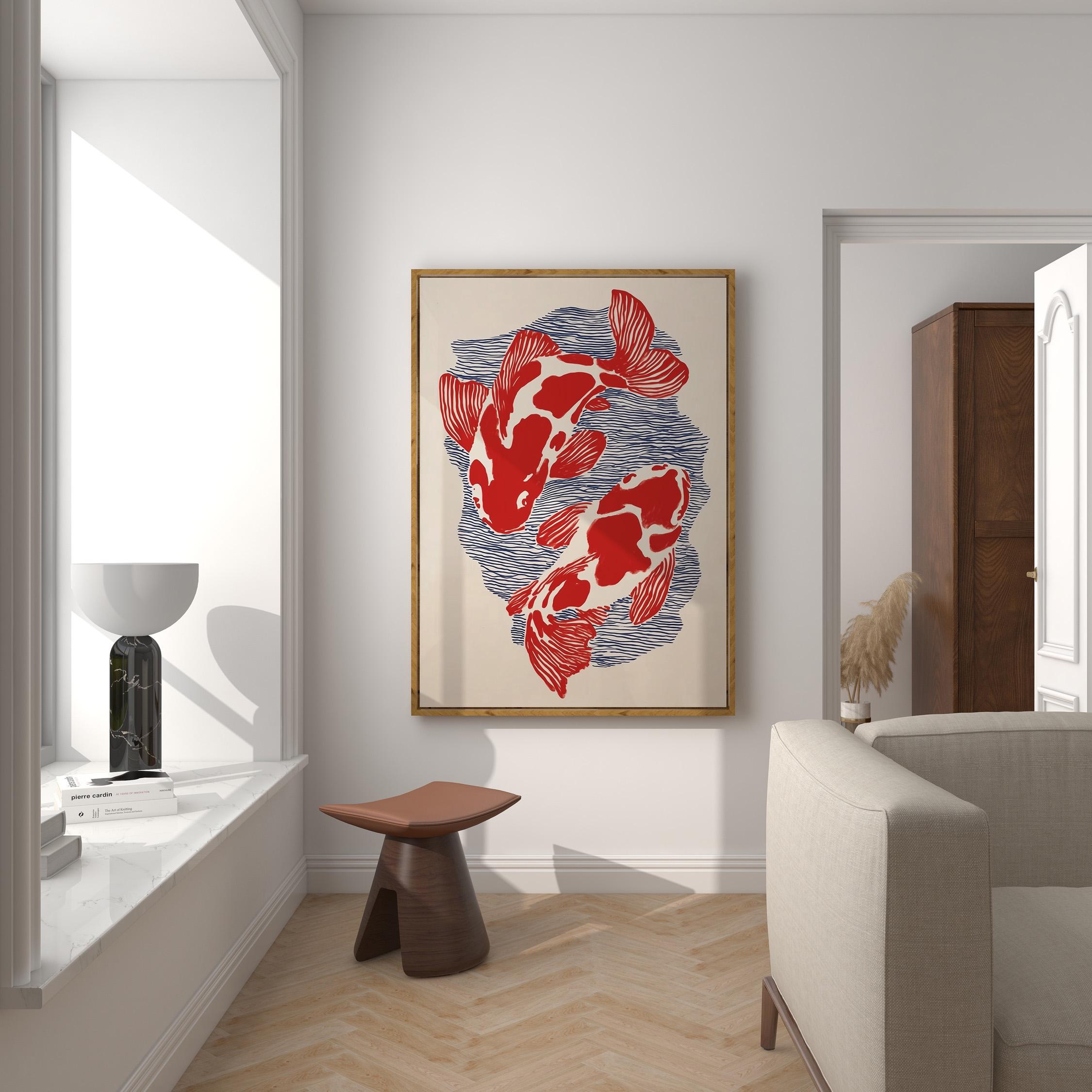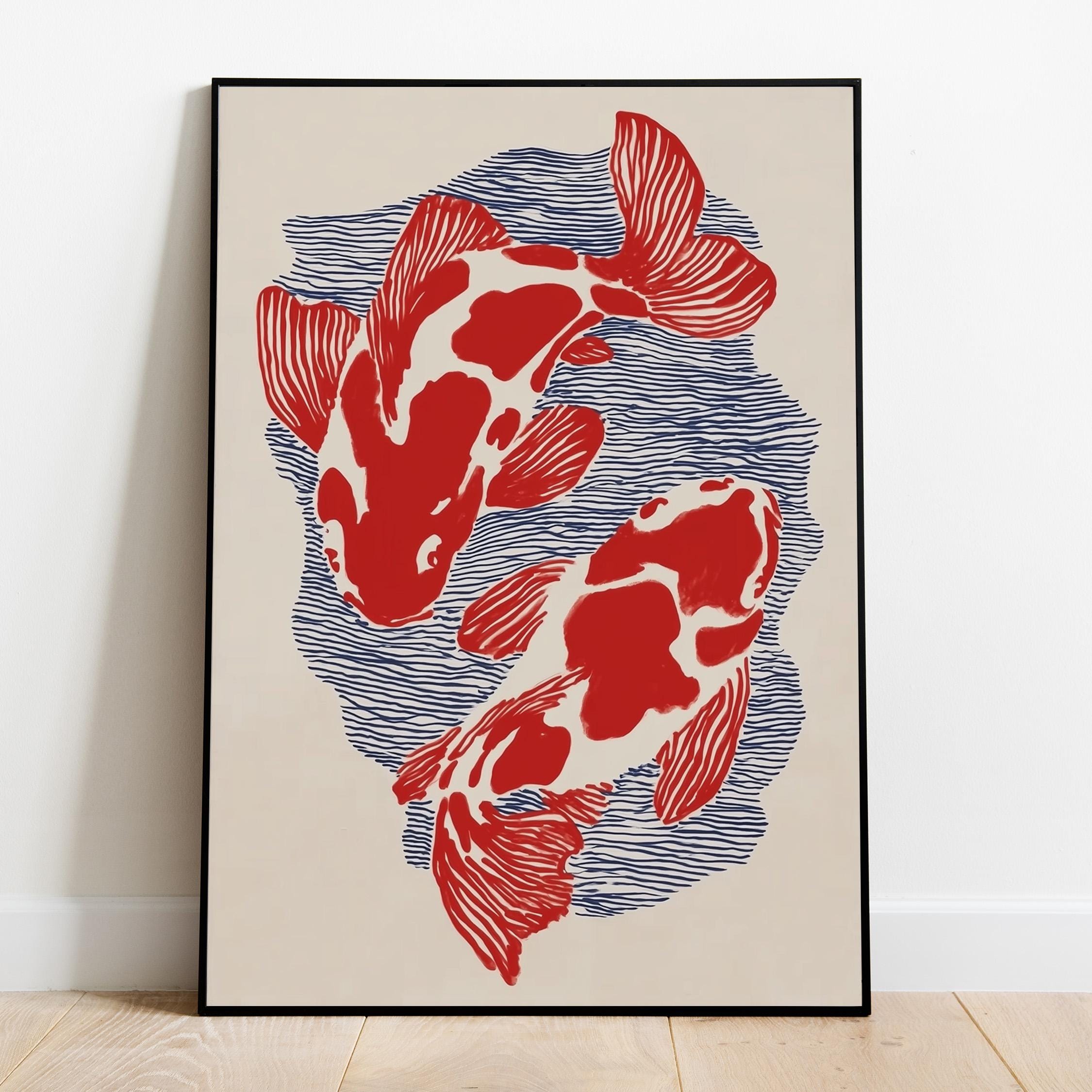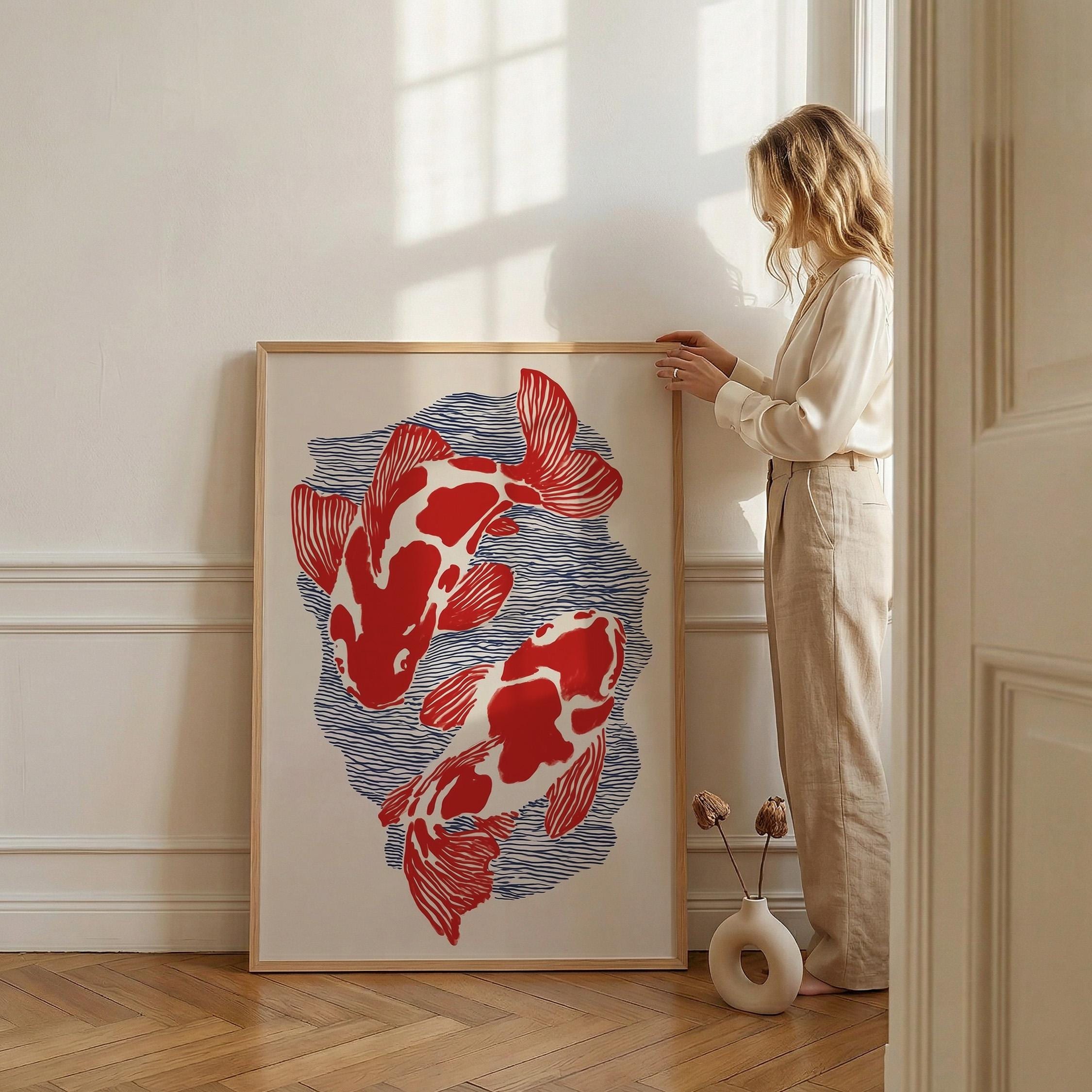 Transform your space with this striking koi fish wall art print featuring bold red fish swimming through flowing blue waves on a neutral background.