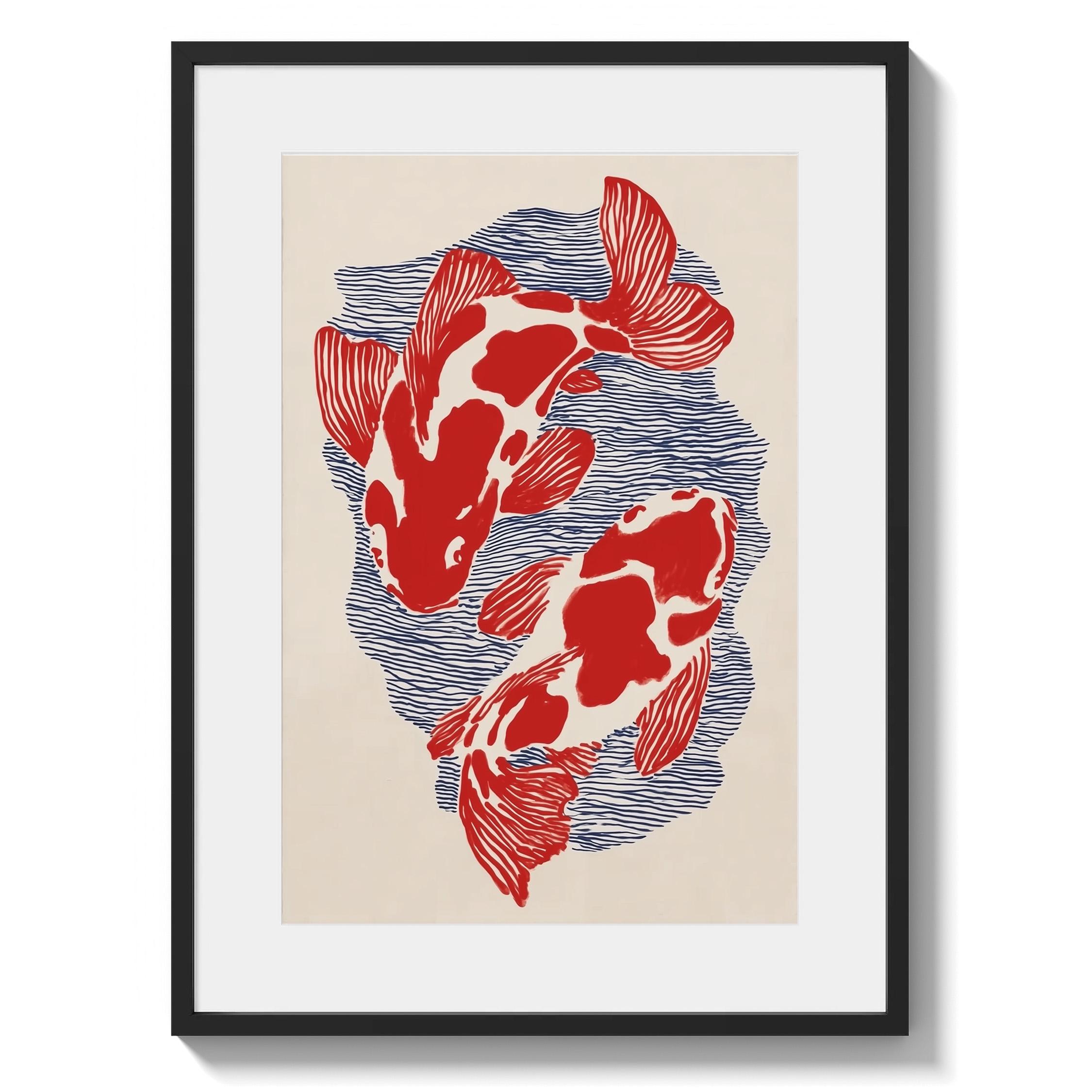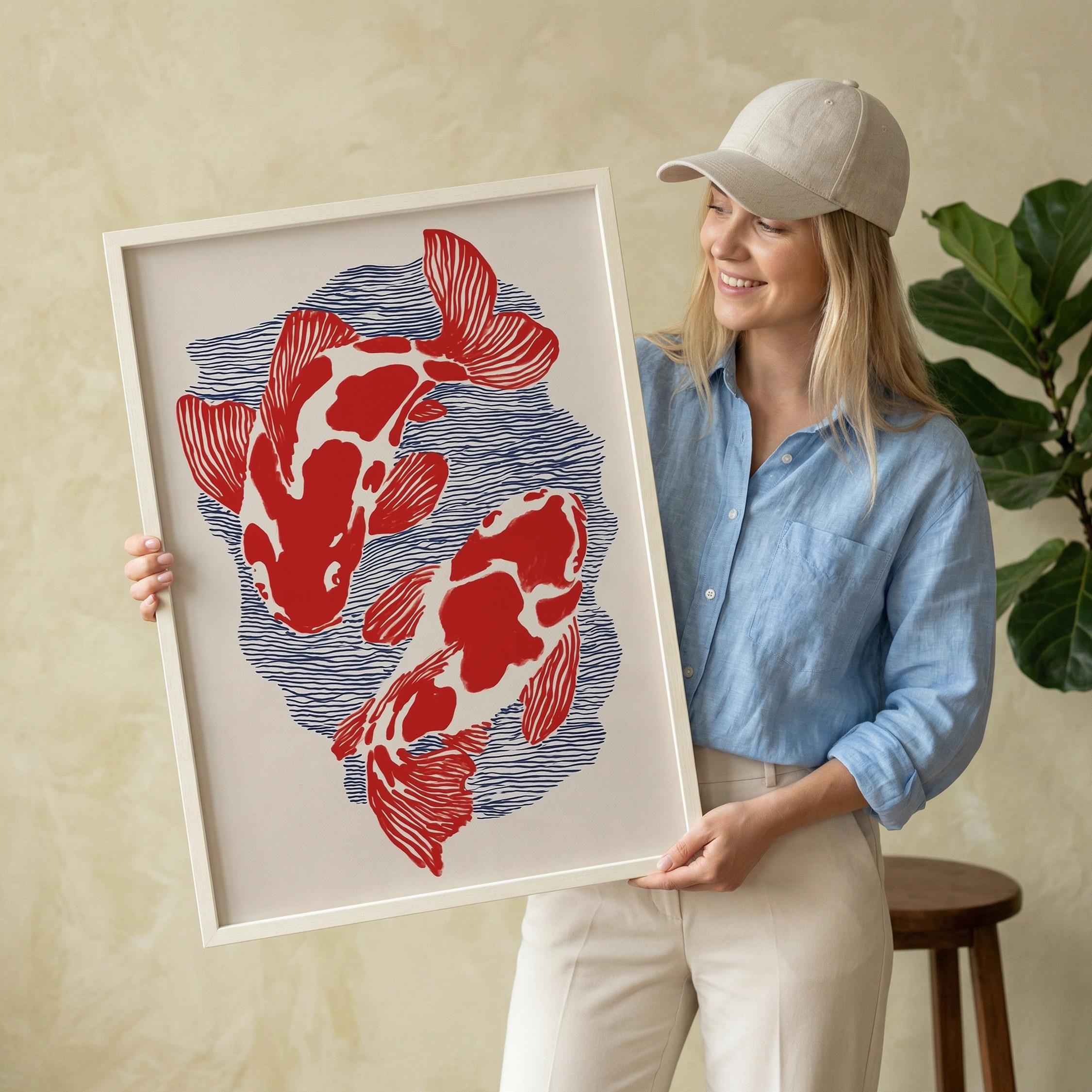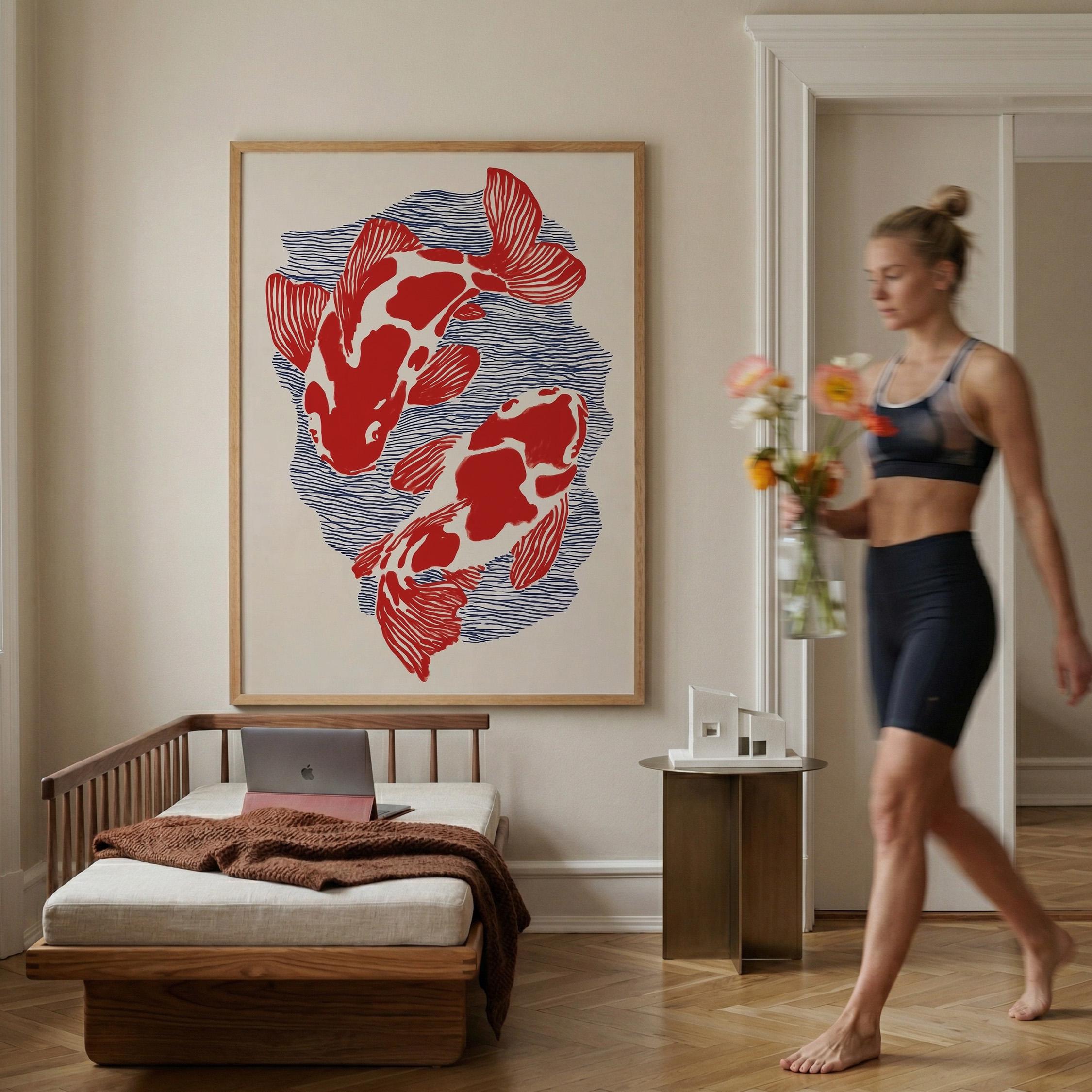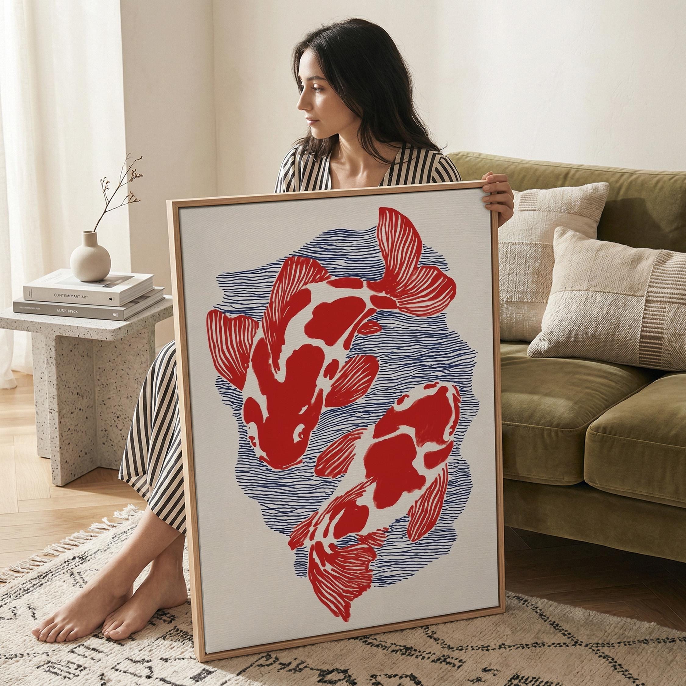 Transform your space with this striking koi fish wall art print featuring bold red fish swimming through flowing blue waves on a neutral background.