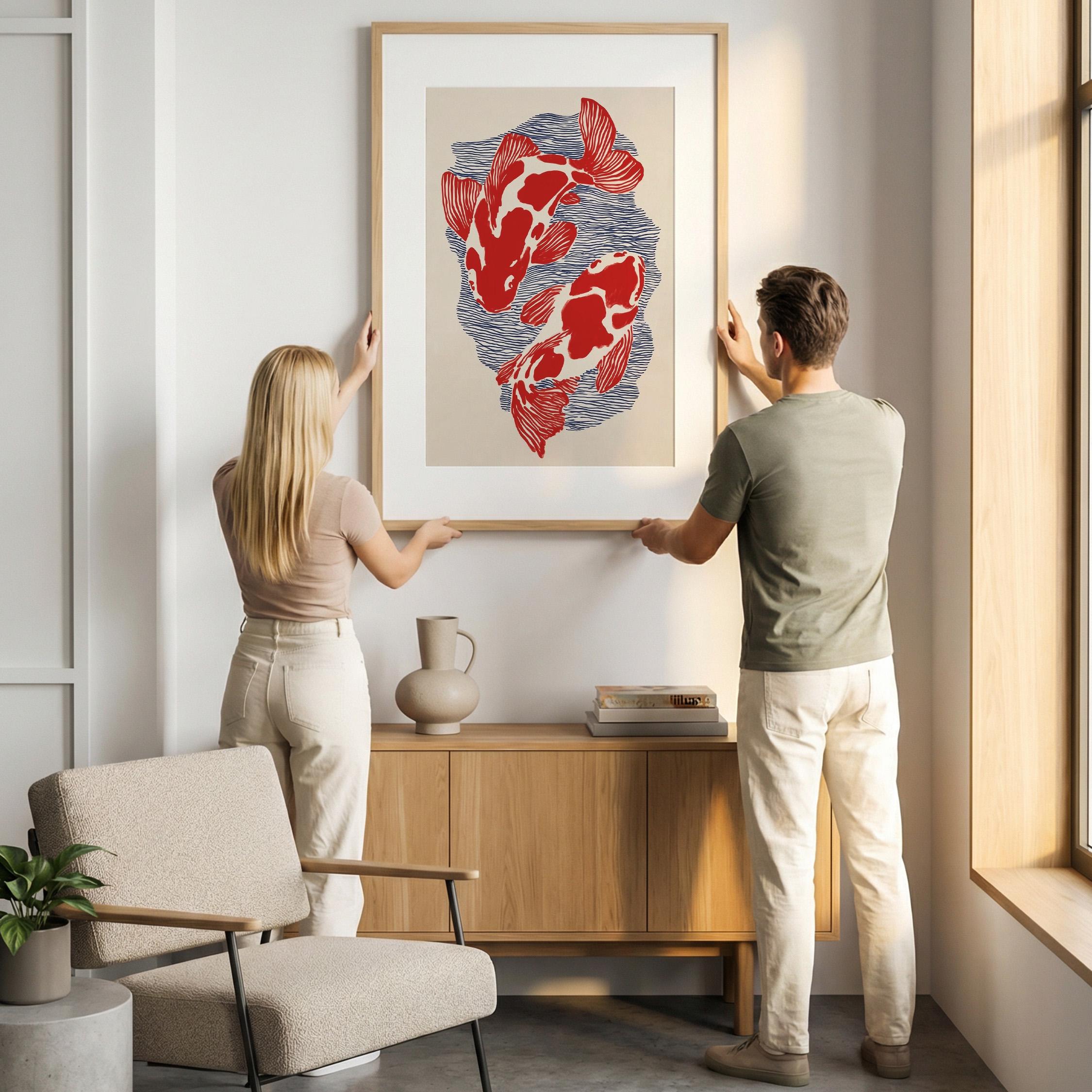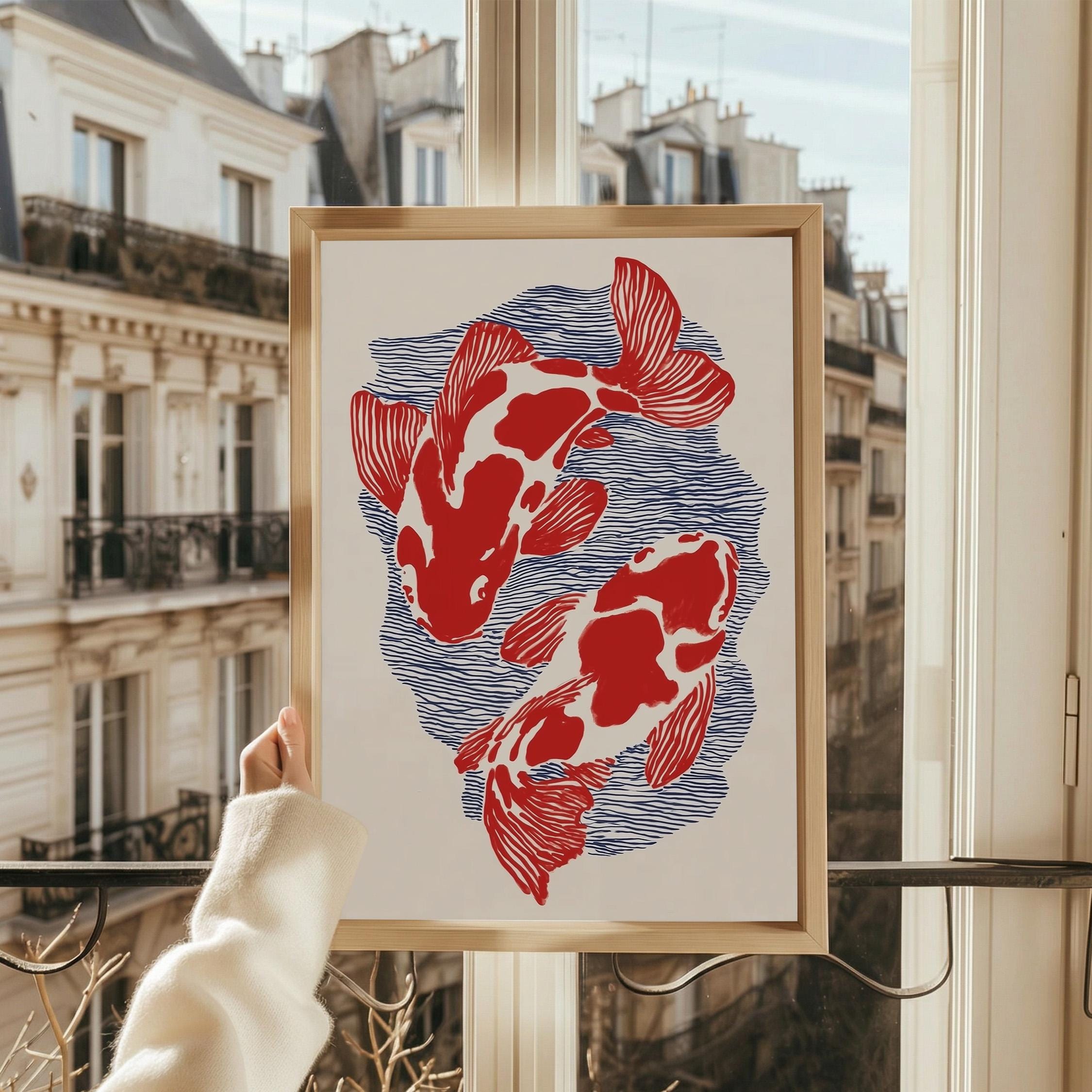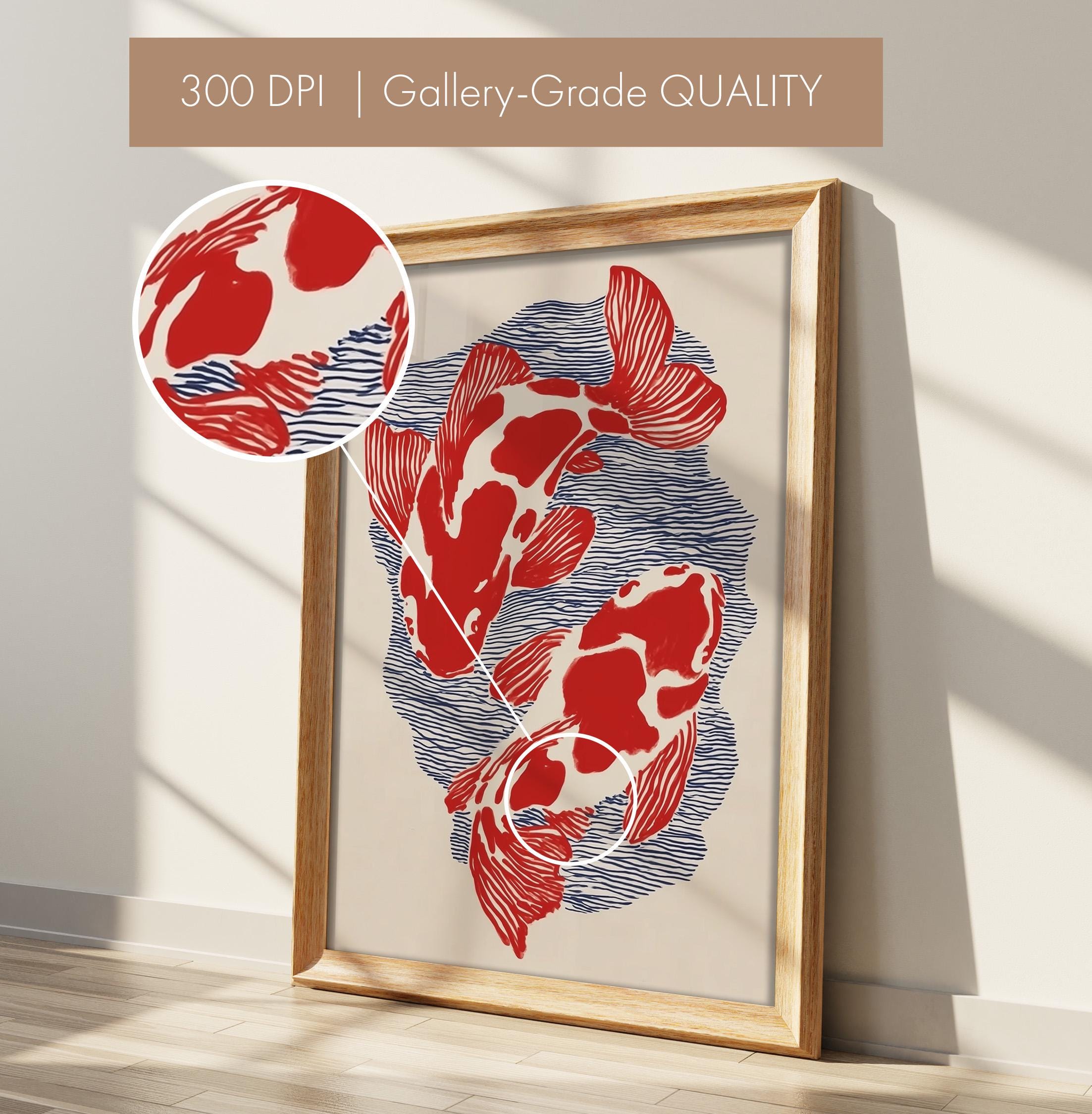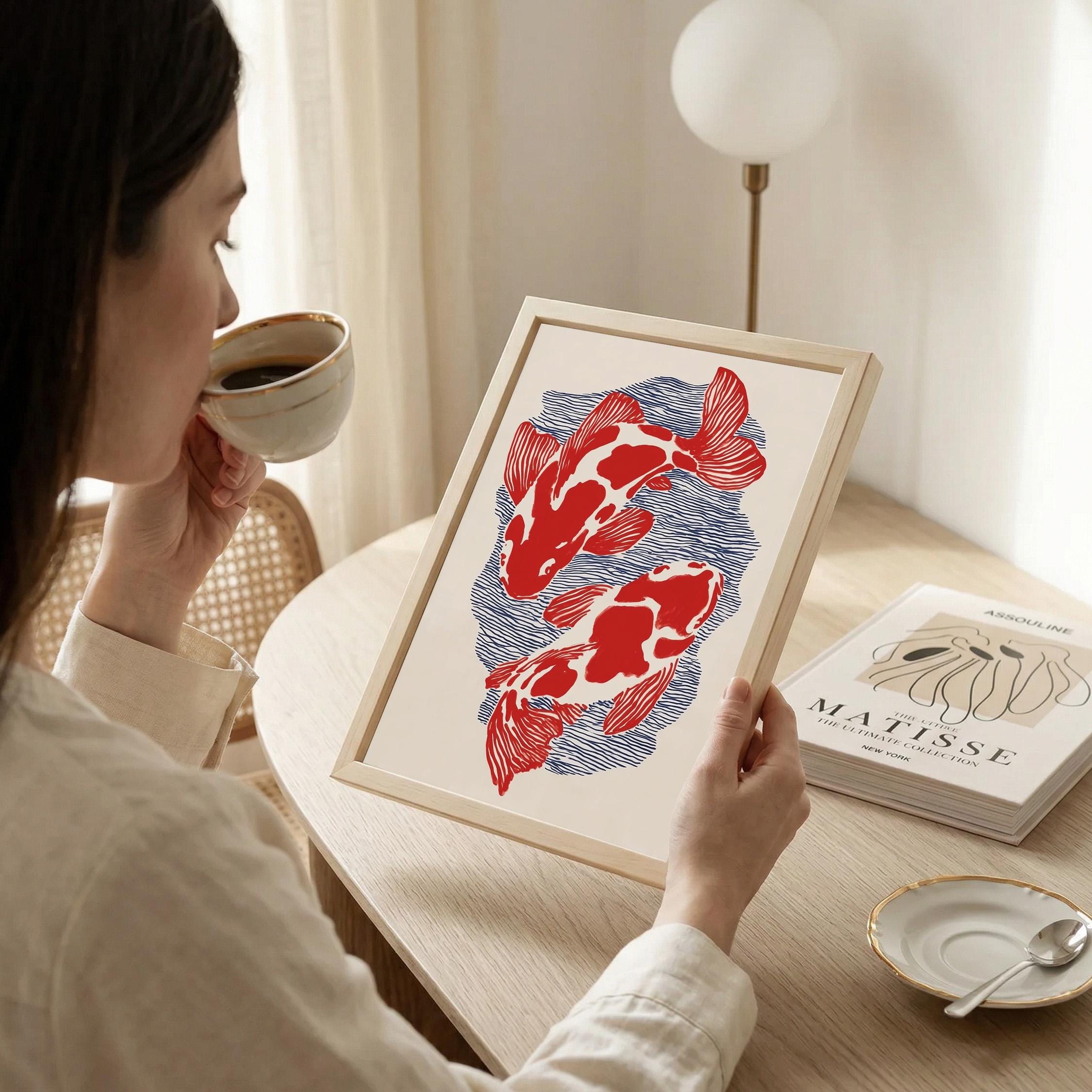 Transform your space with this striking koi fish wall art print featuring bold red fish swimming through flowing blue waves on a neutral background.