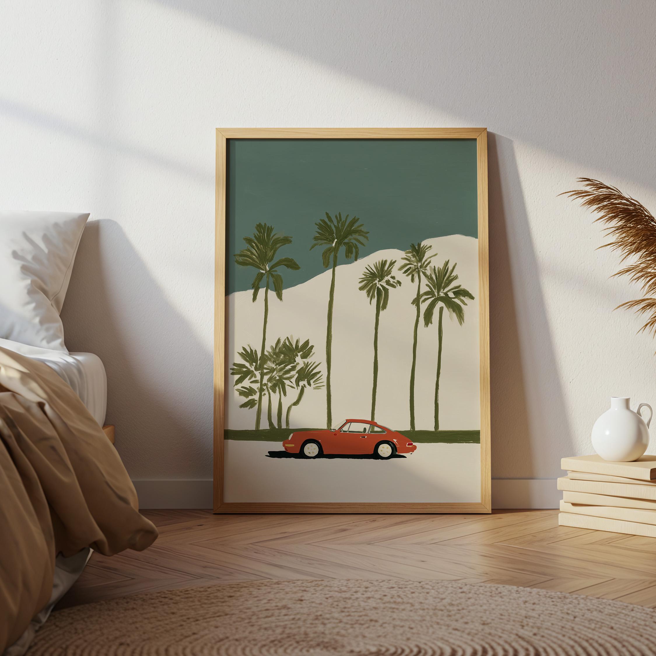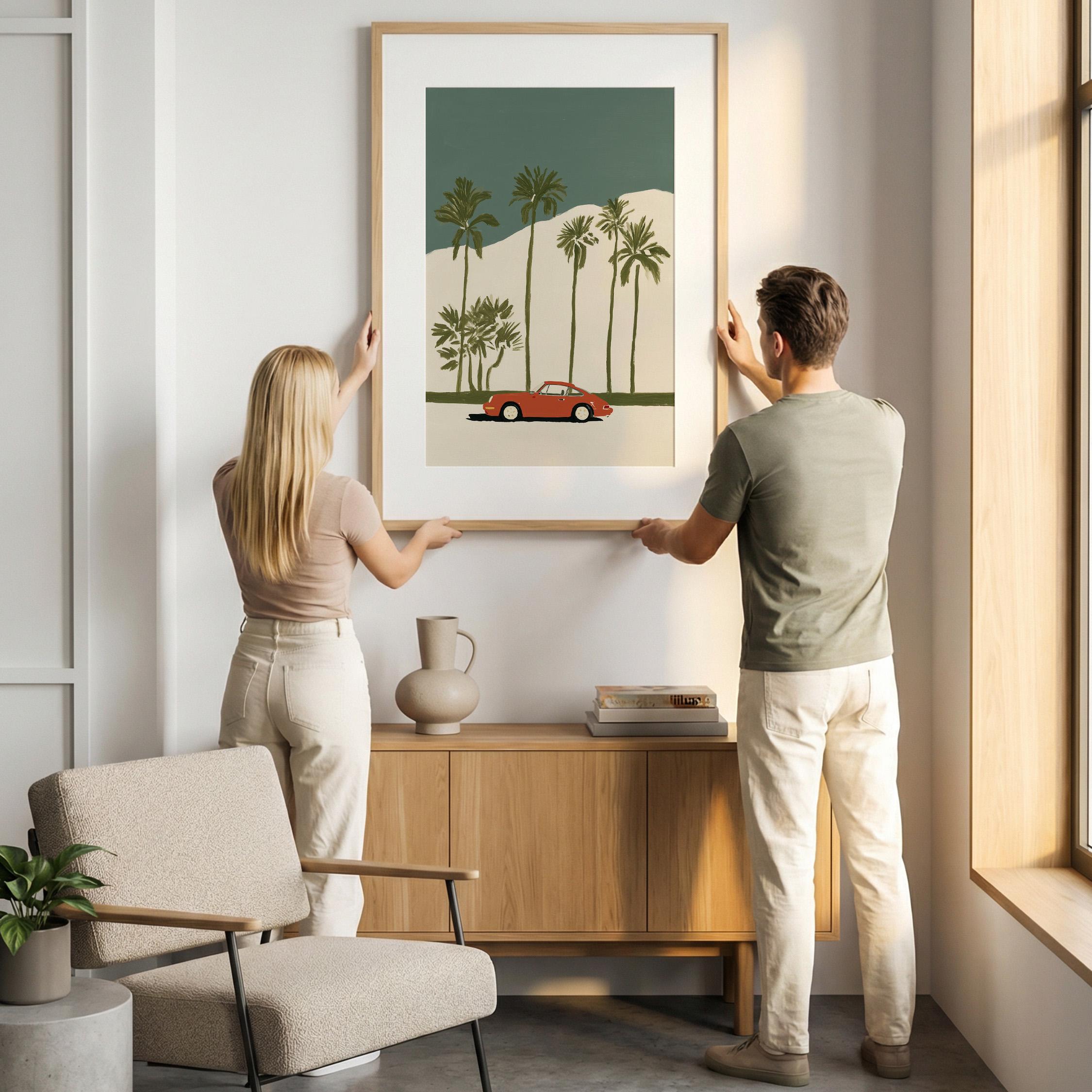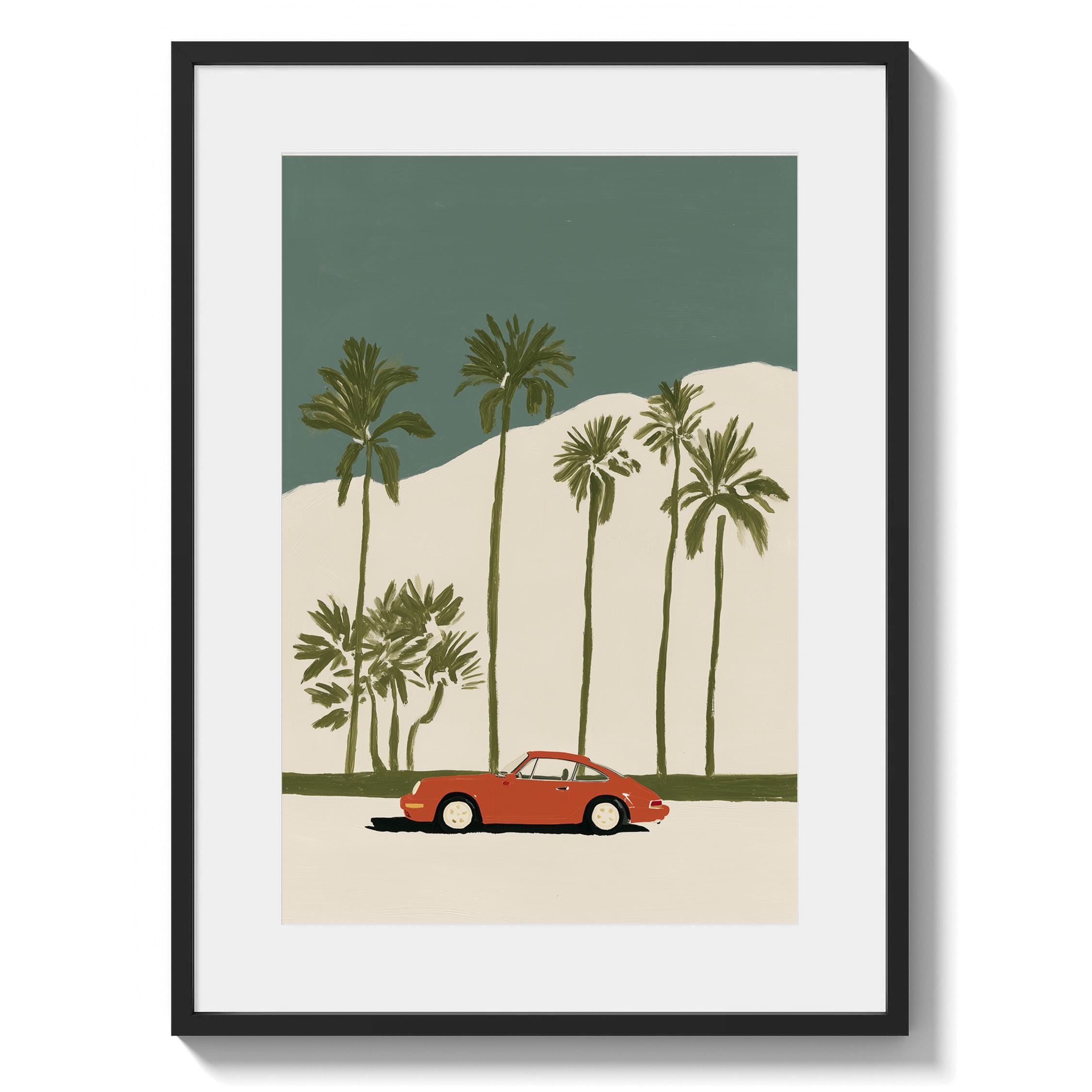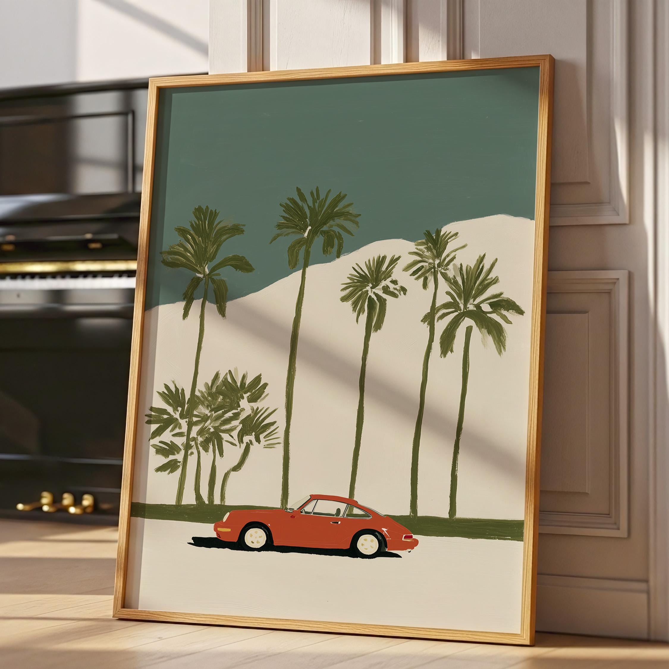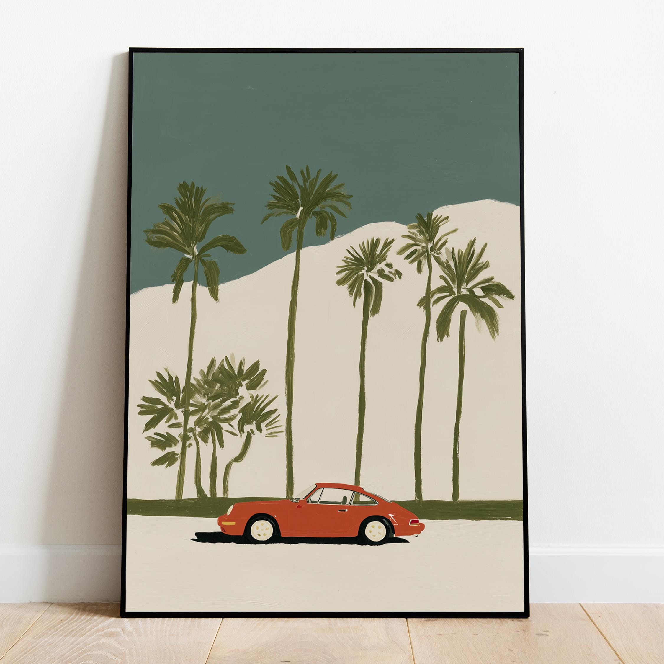This vintage Porsche 911 palm tree print brings California cool to any space with its retro sports car silhouette against towering palms.
