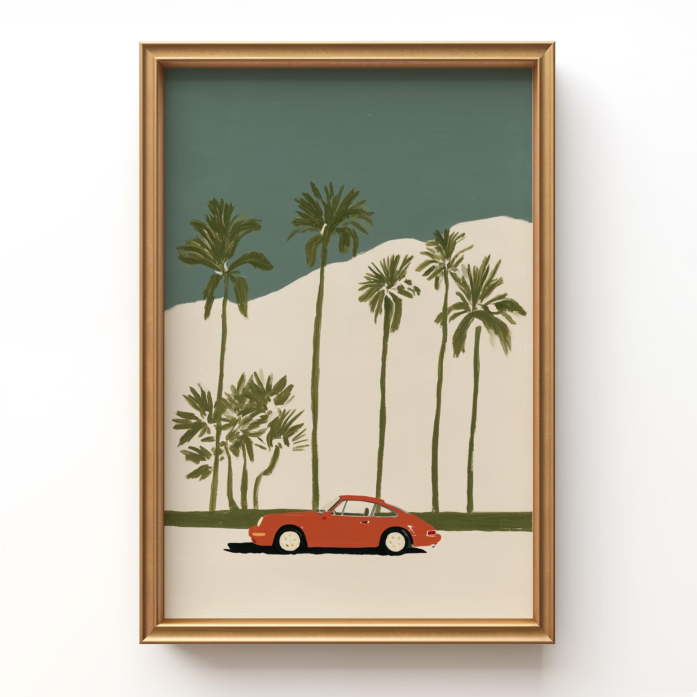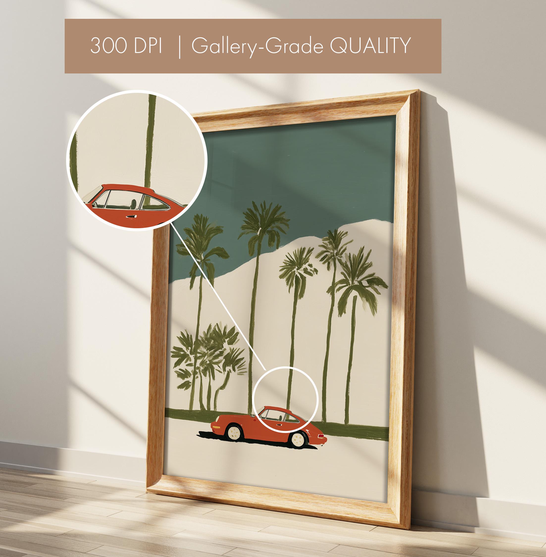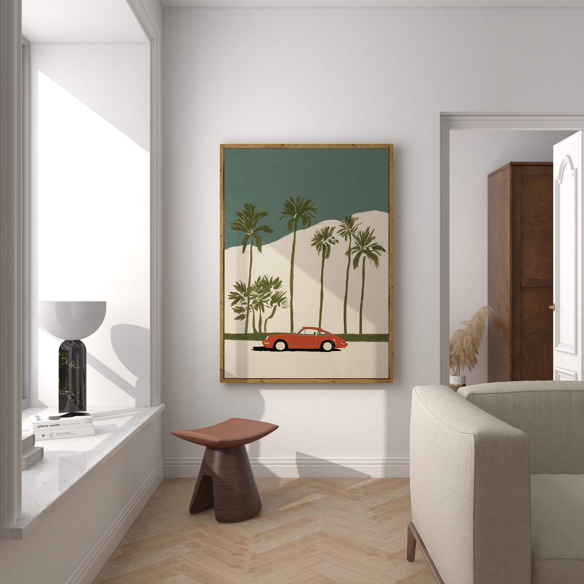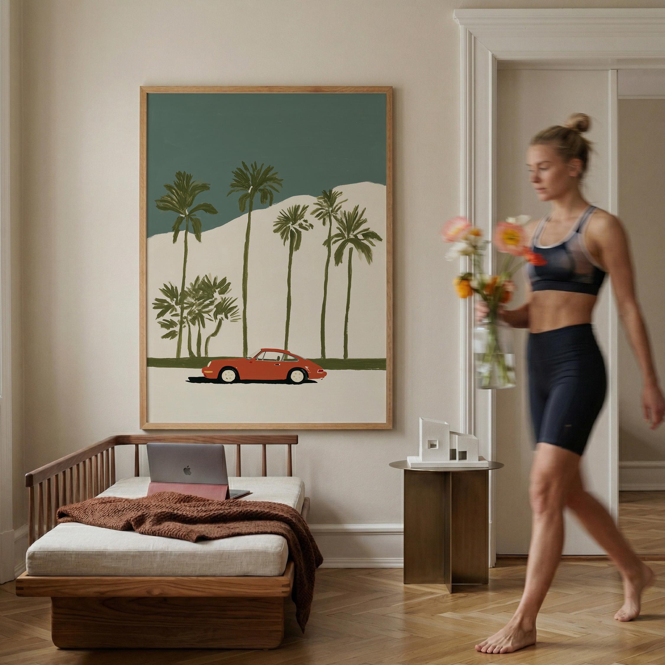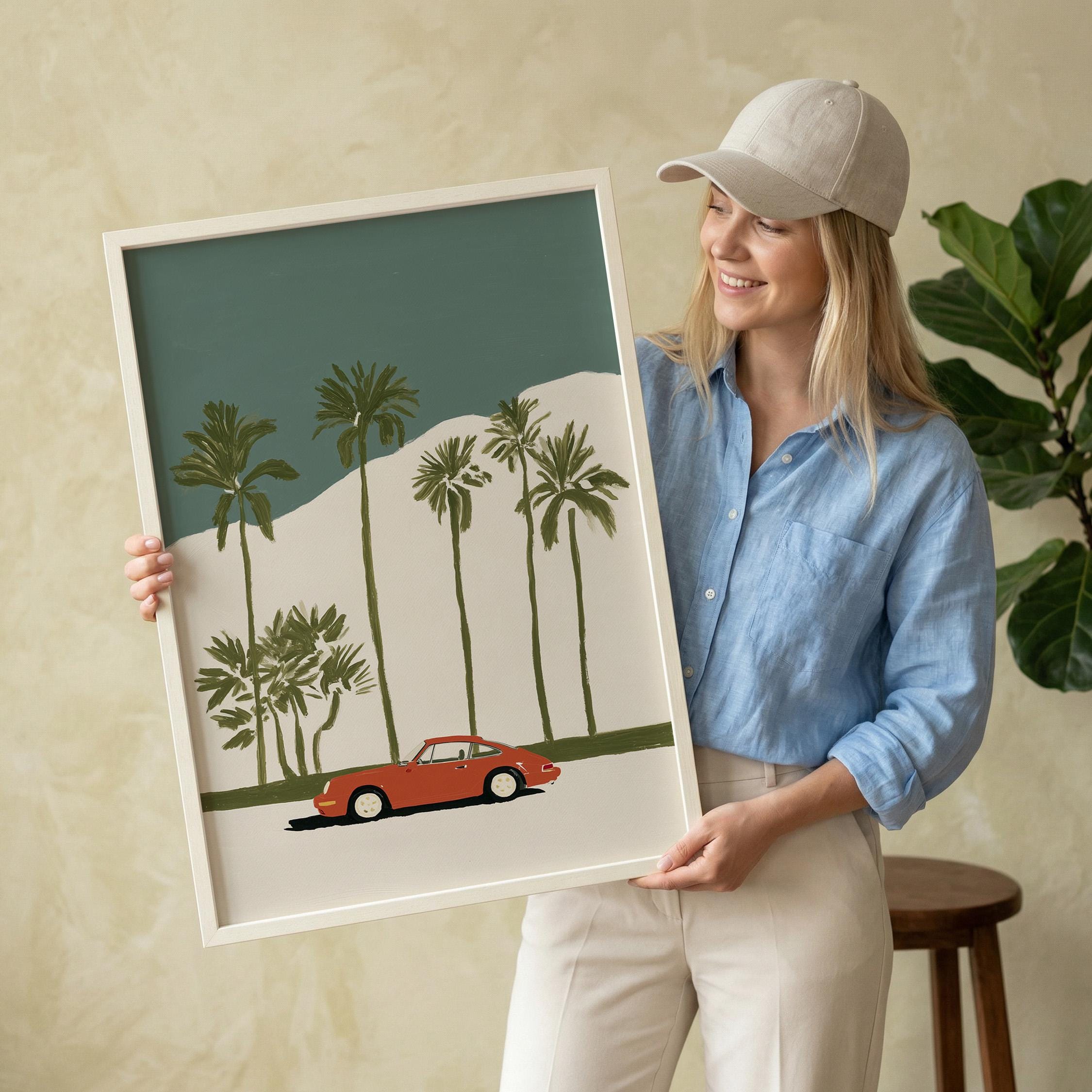 This vintage Porsche 911 palm tree print brings California cool to any space with its retro sports car silhouette against towering palms.