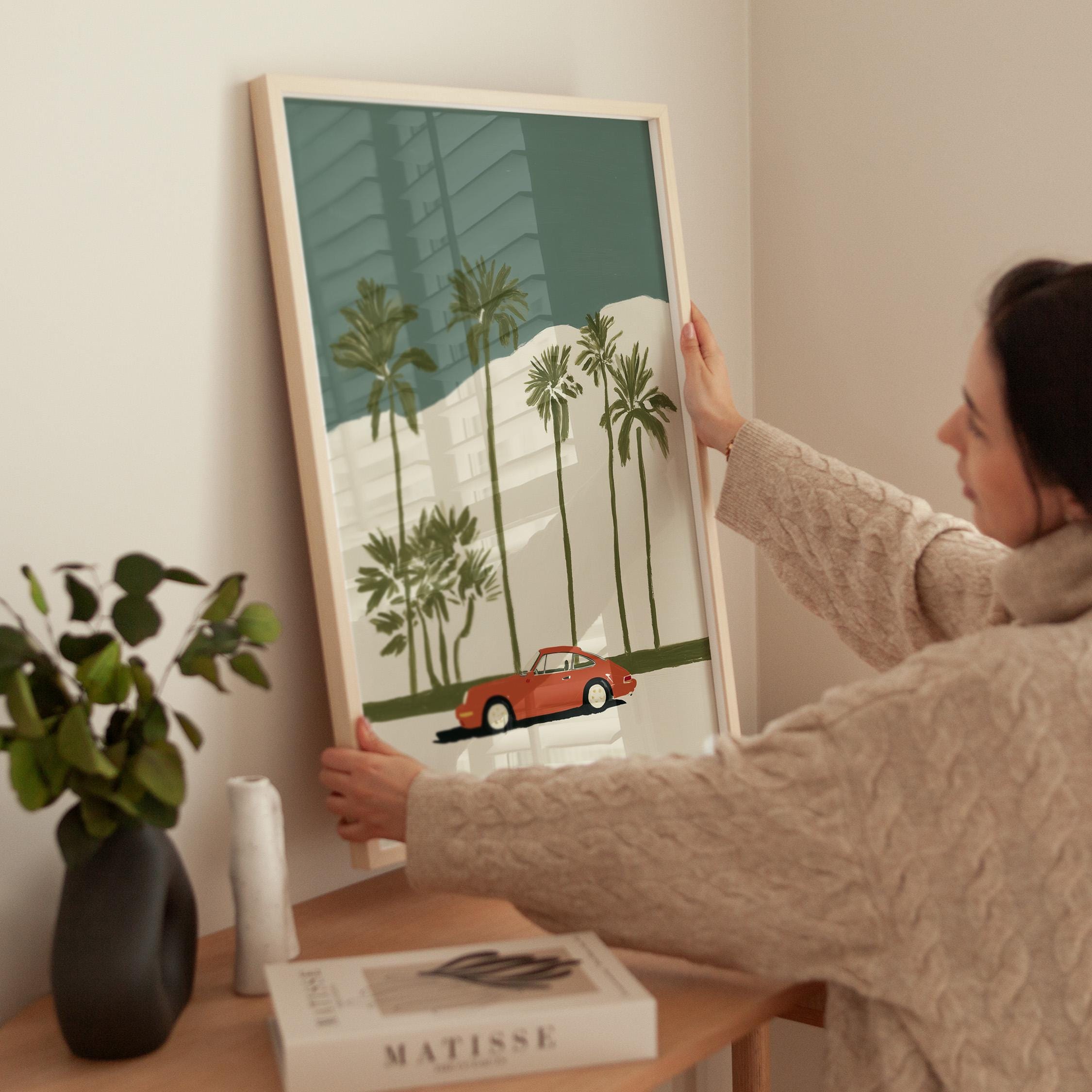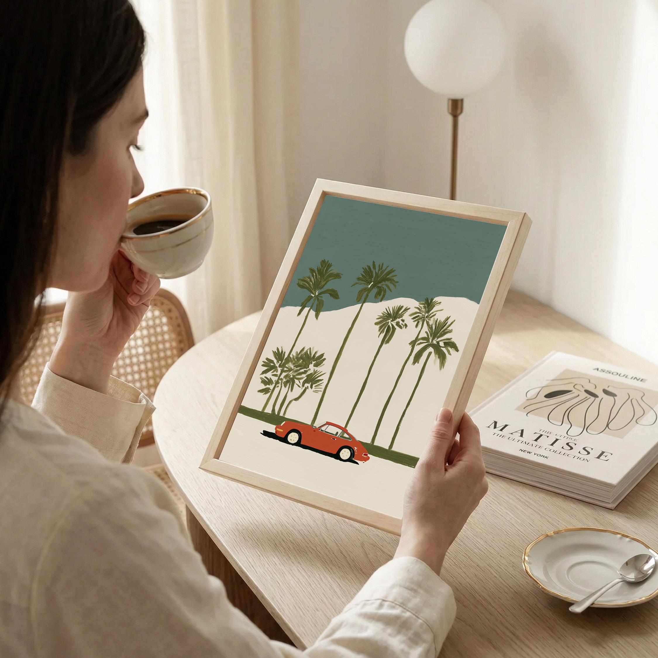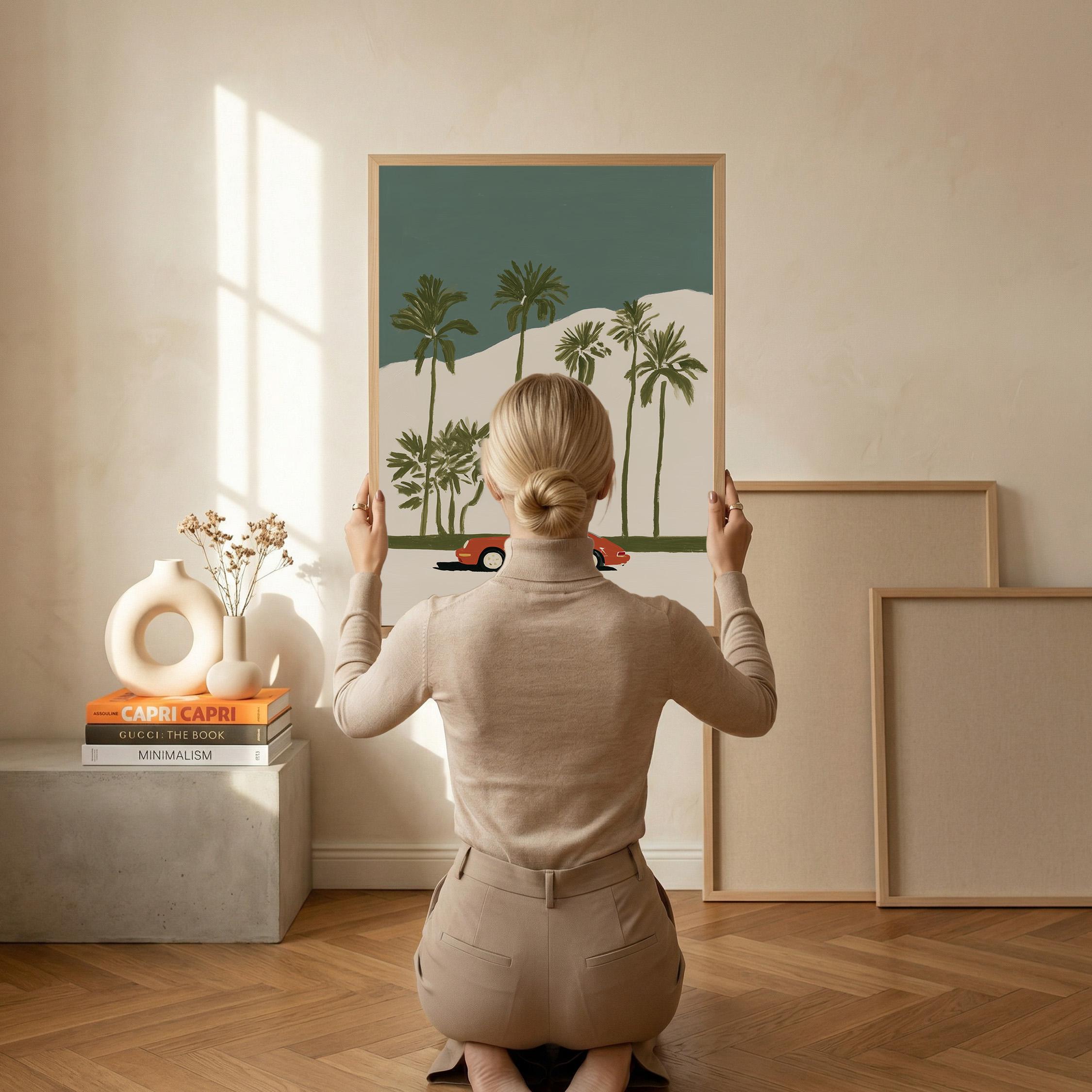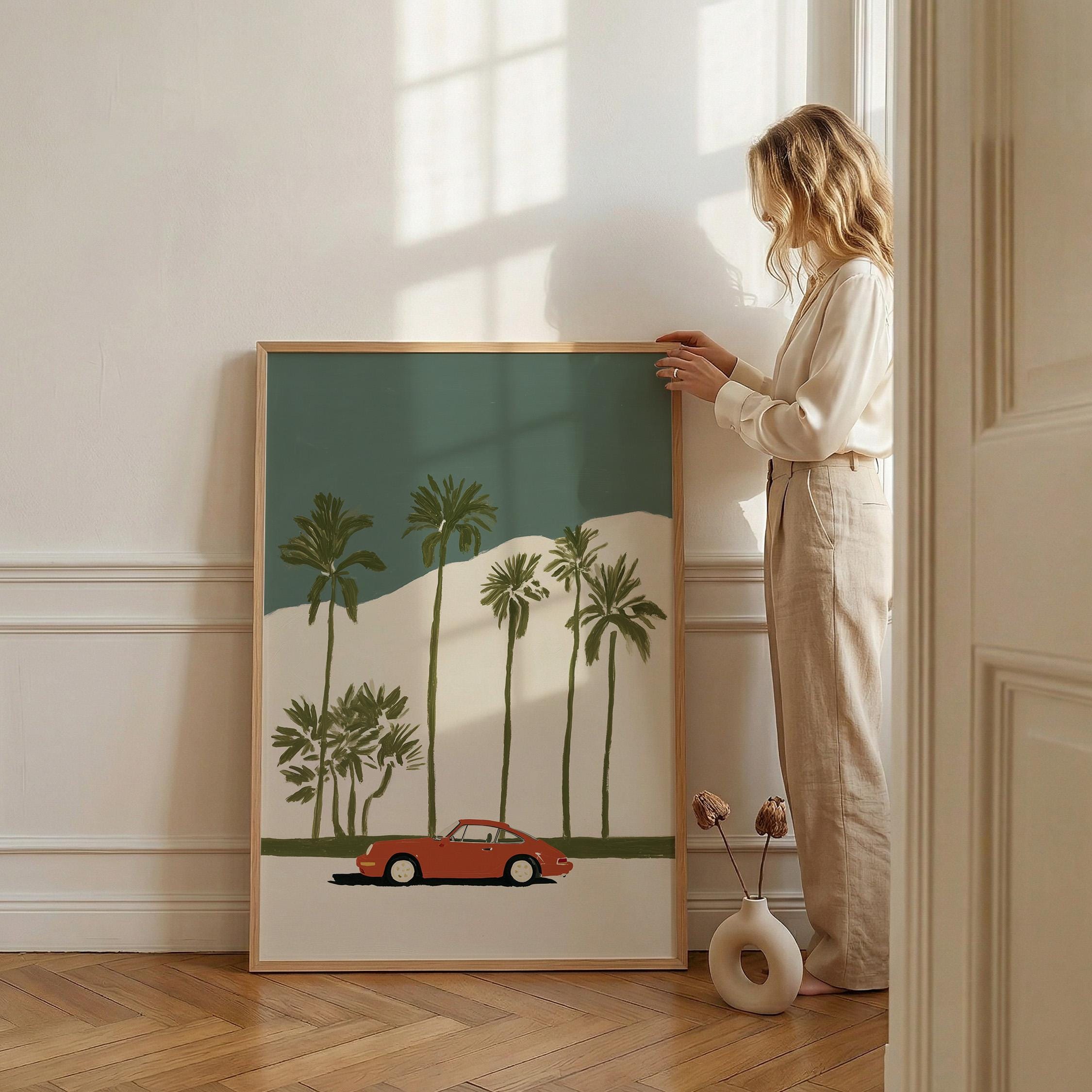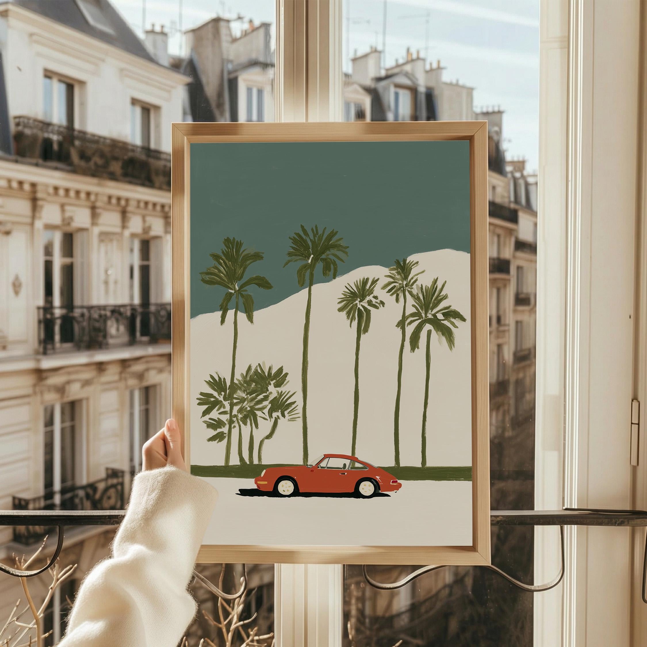 This vintage Porsche 911 palm tree print brings California cool to any space with its retro sports car silhouette against towering palms.
