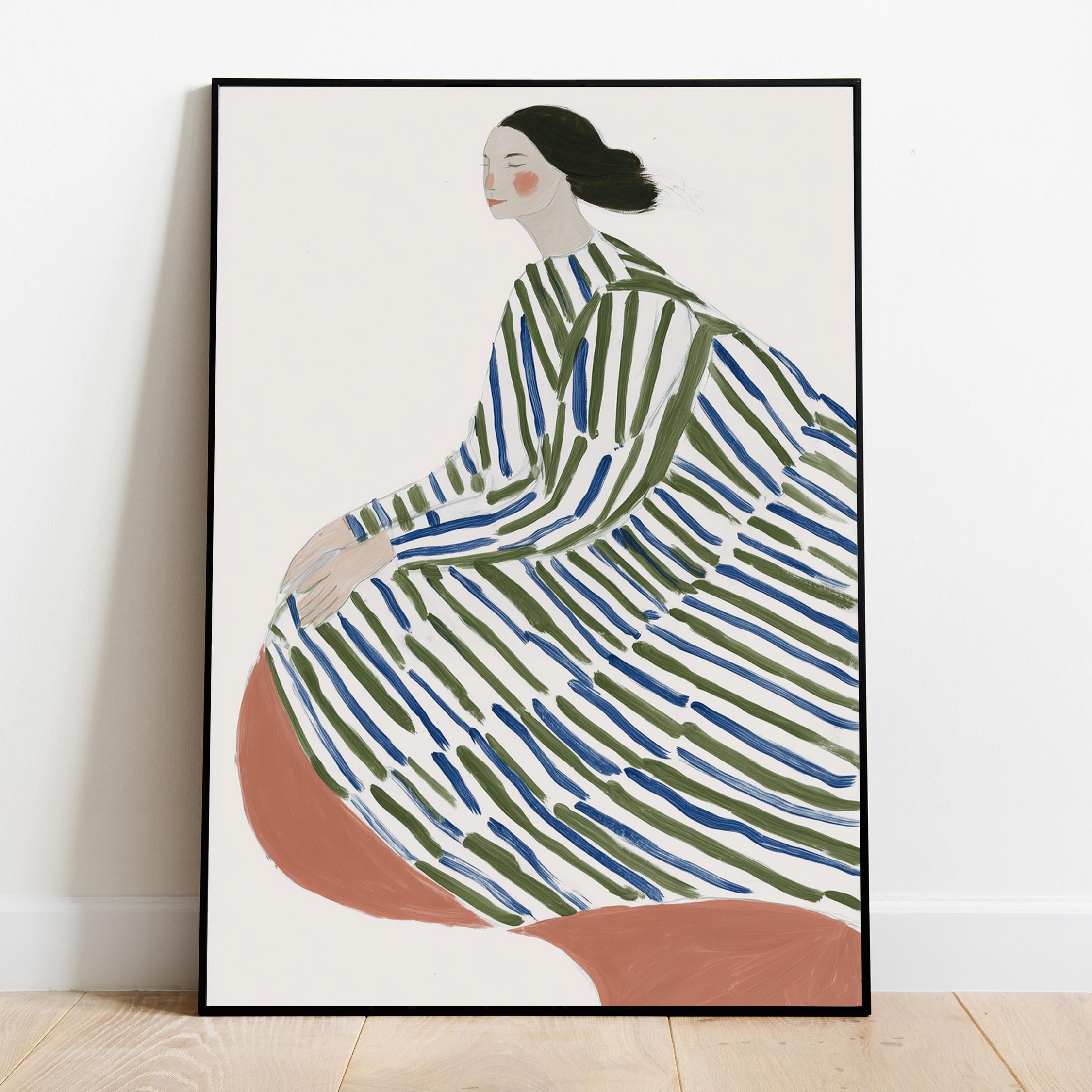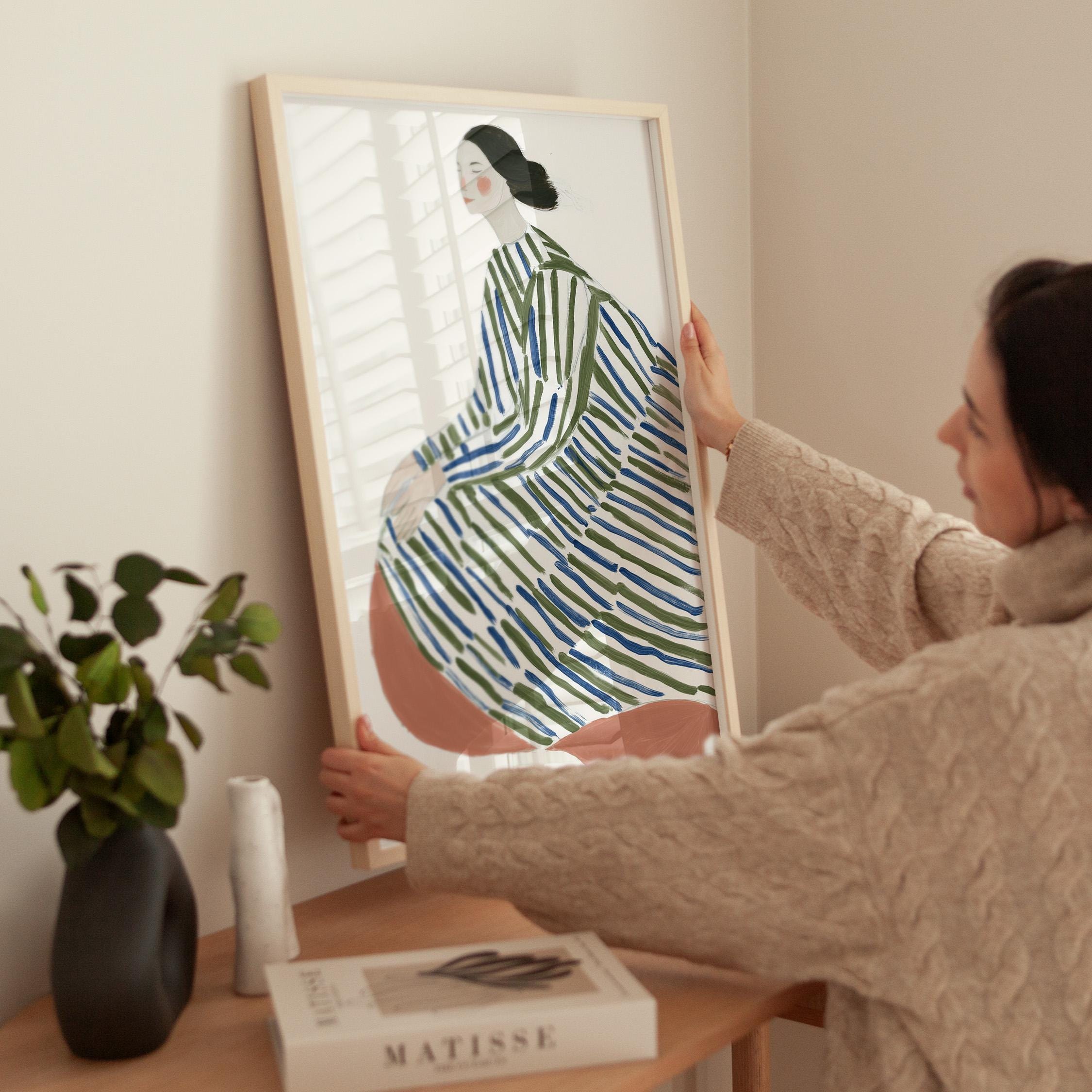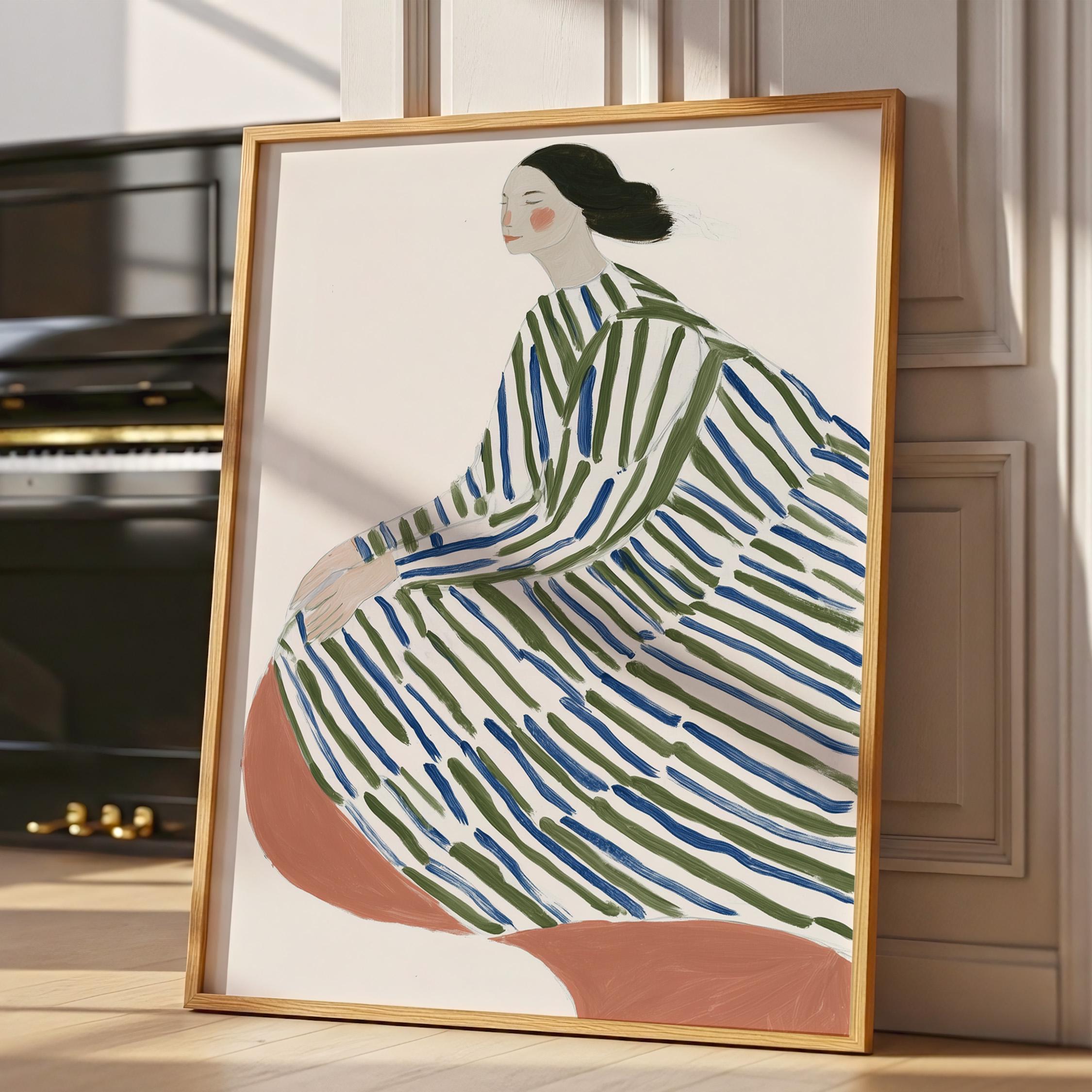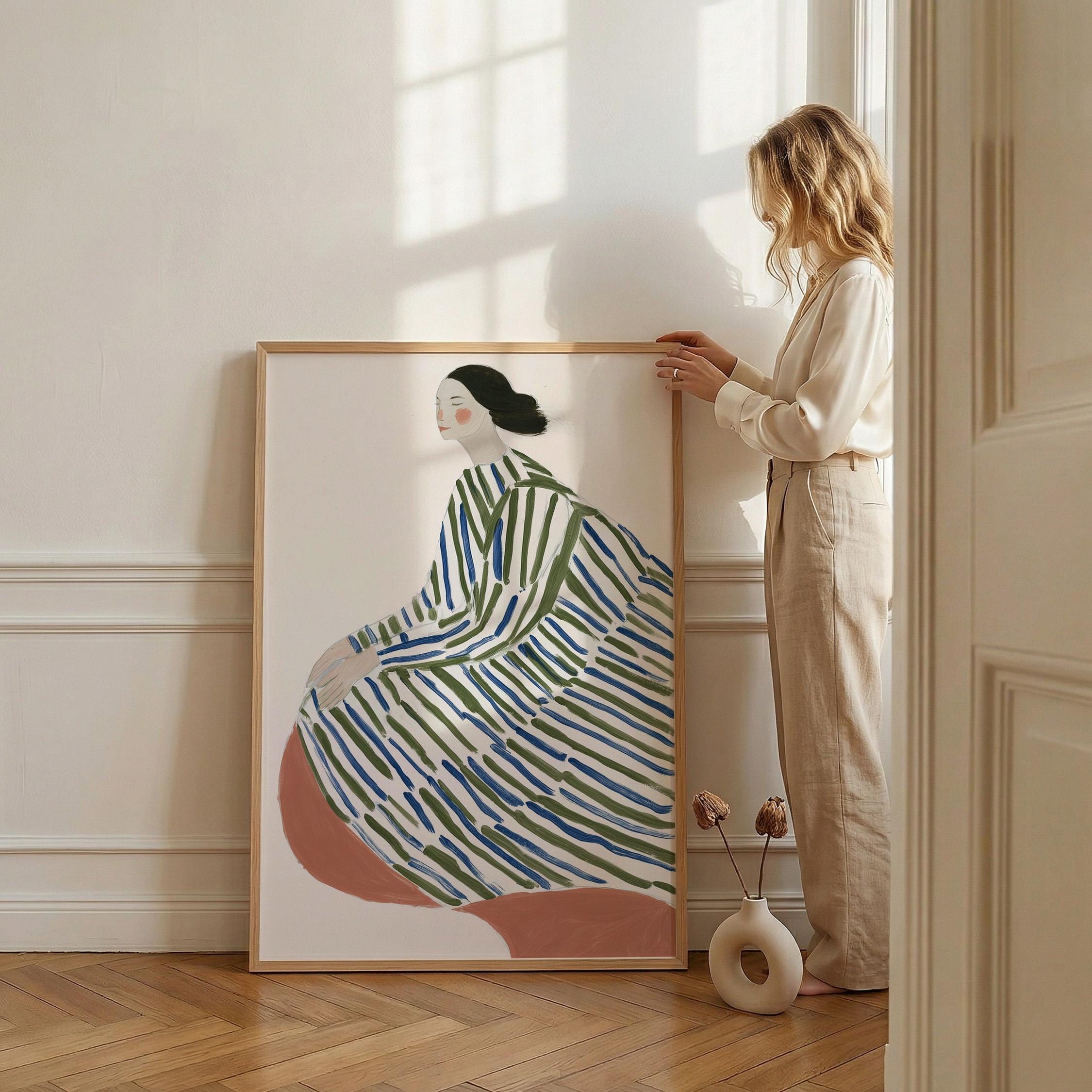 This elegant woman in striped robe wall art brings a serene, sophisticated touch to any space with its flowing lines and calming green and blue palette.