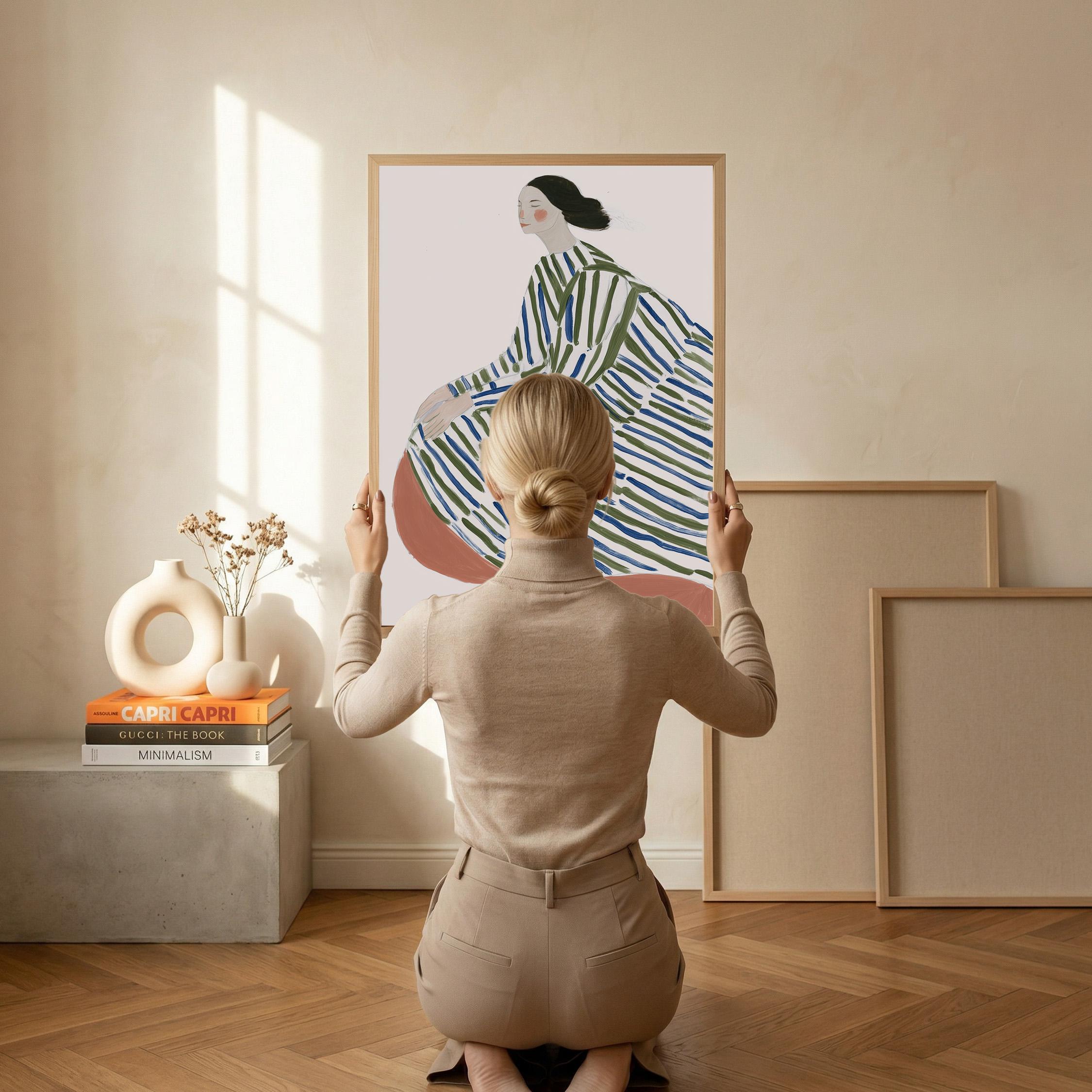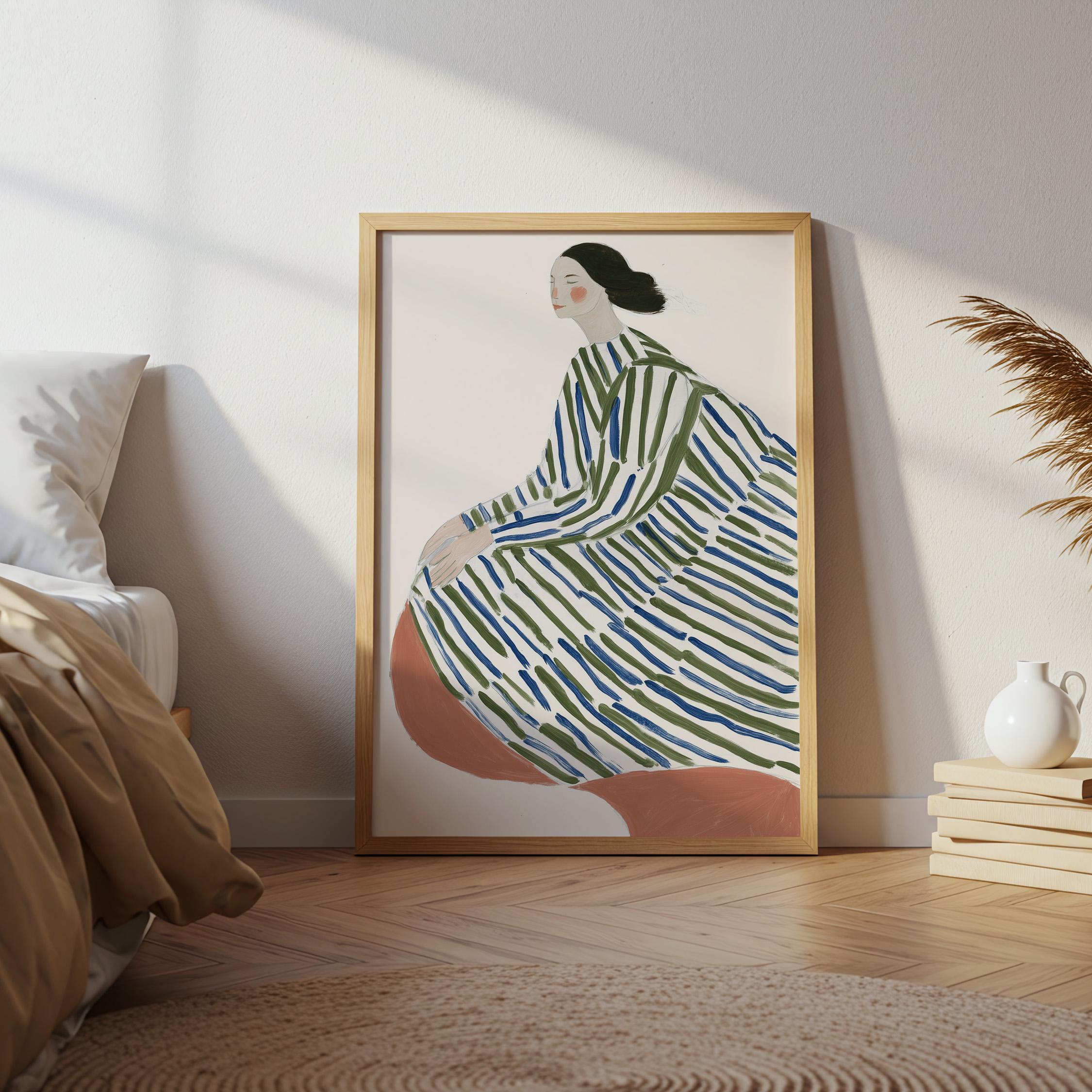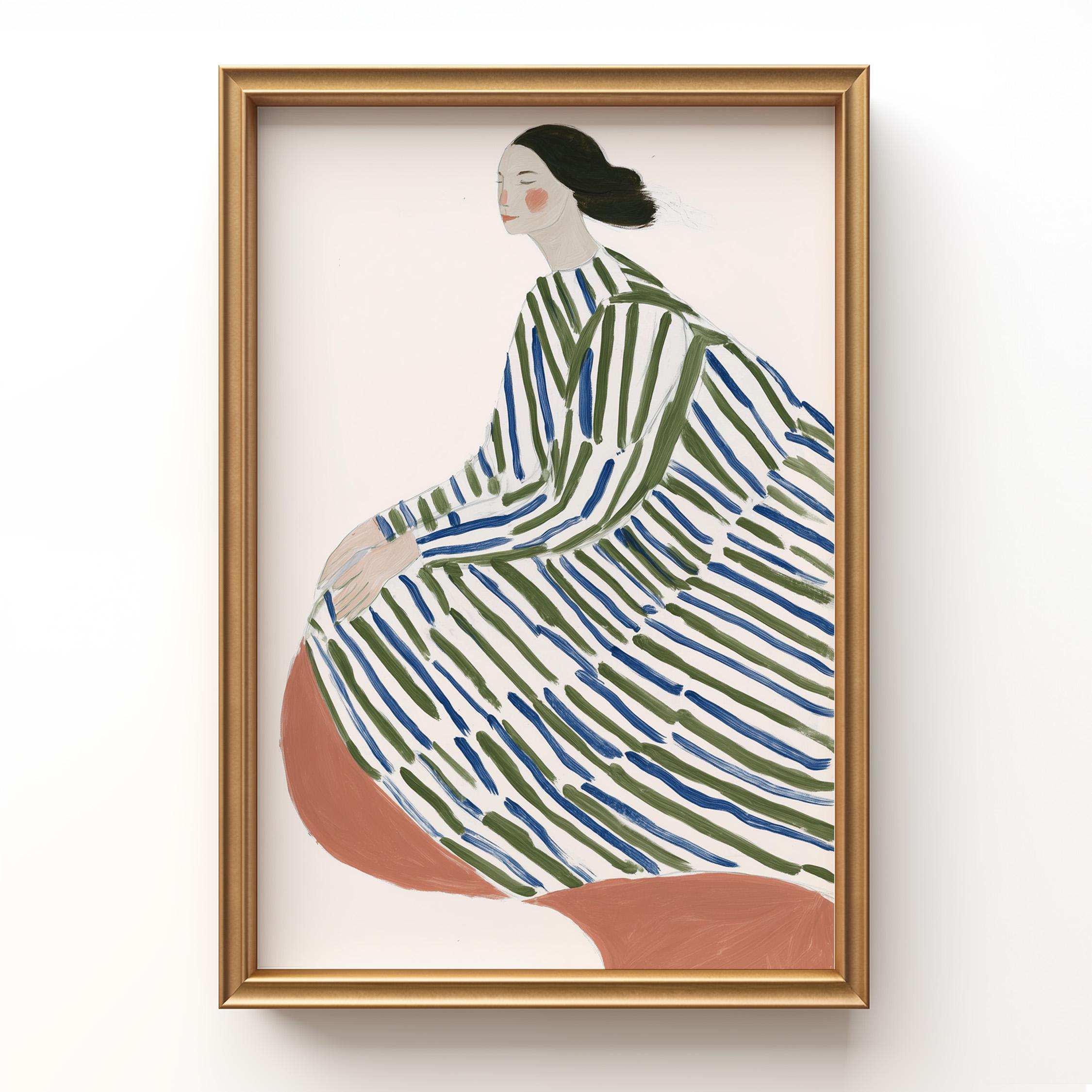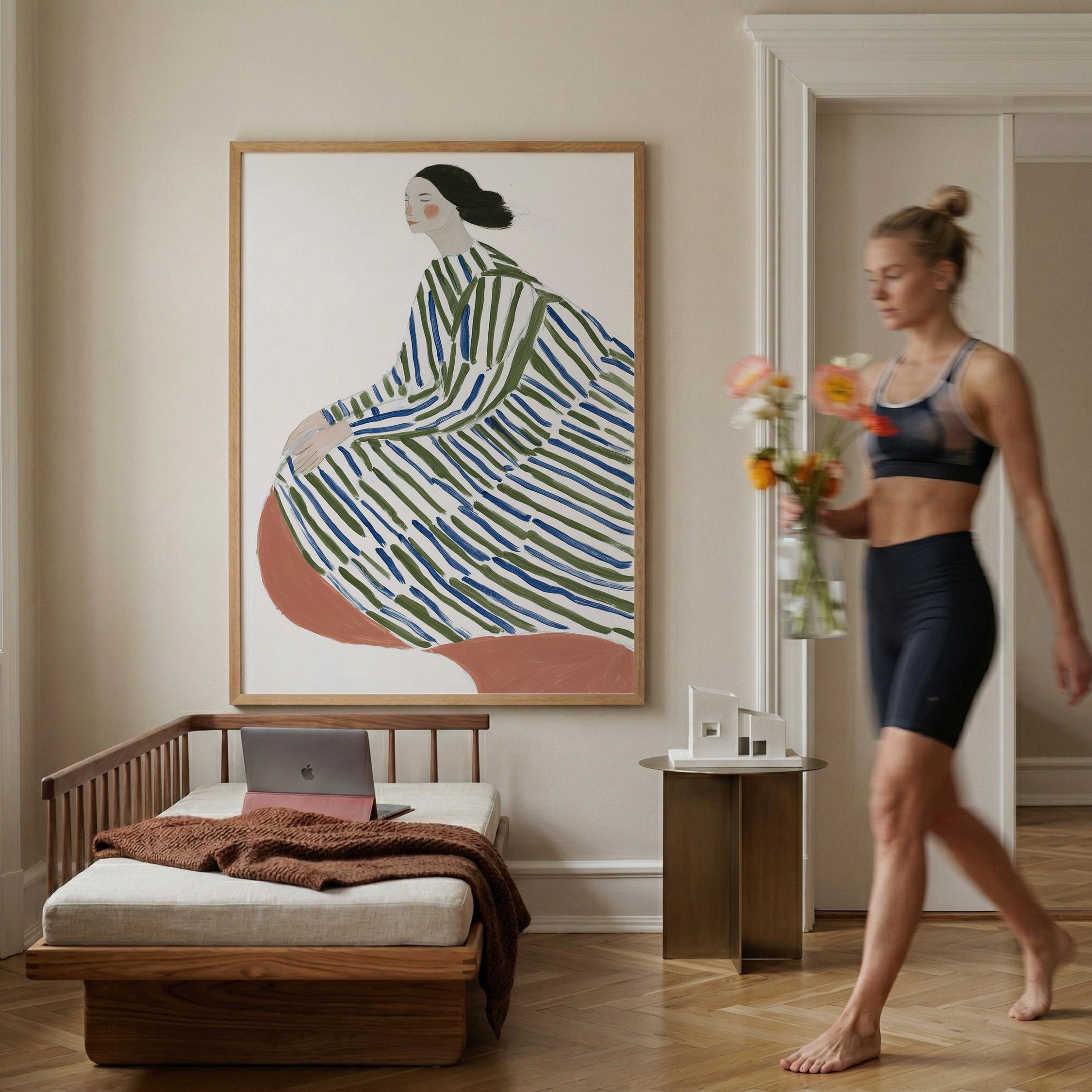 This elegant woman in striped robe wall art brings a serene, sophisticated touch to any space with its flowing lines and calming green and blue palette.