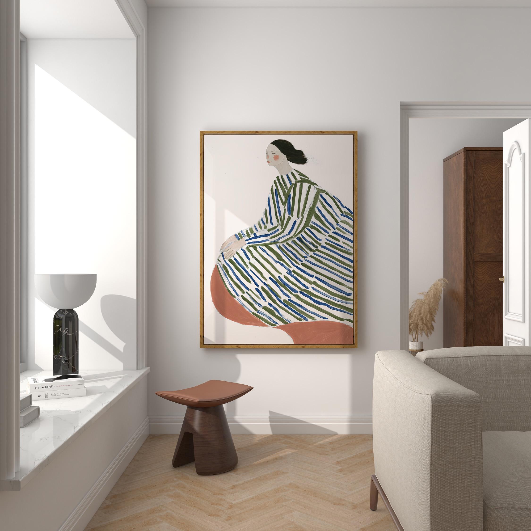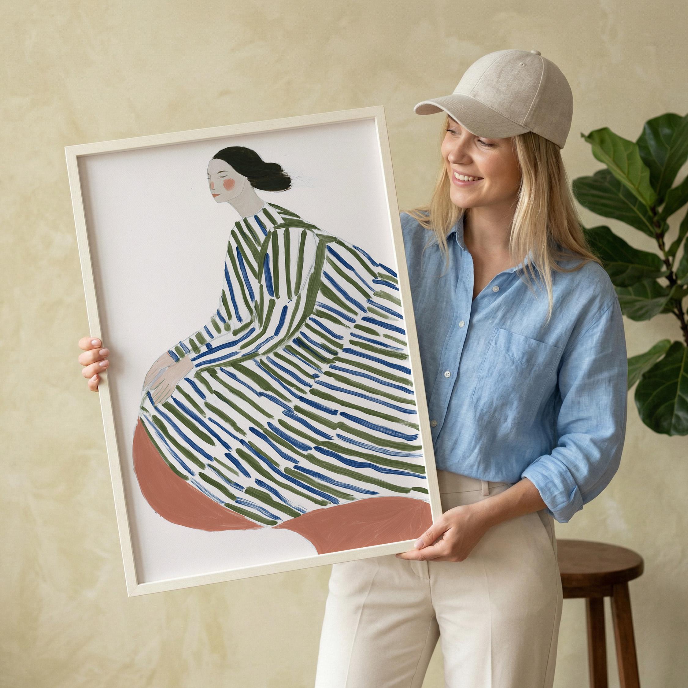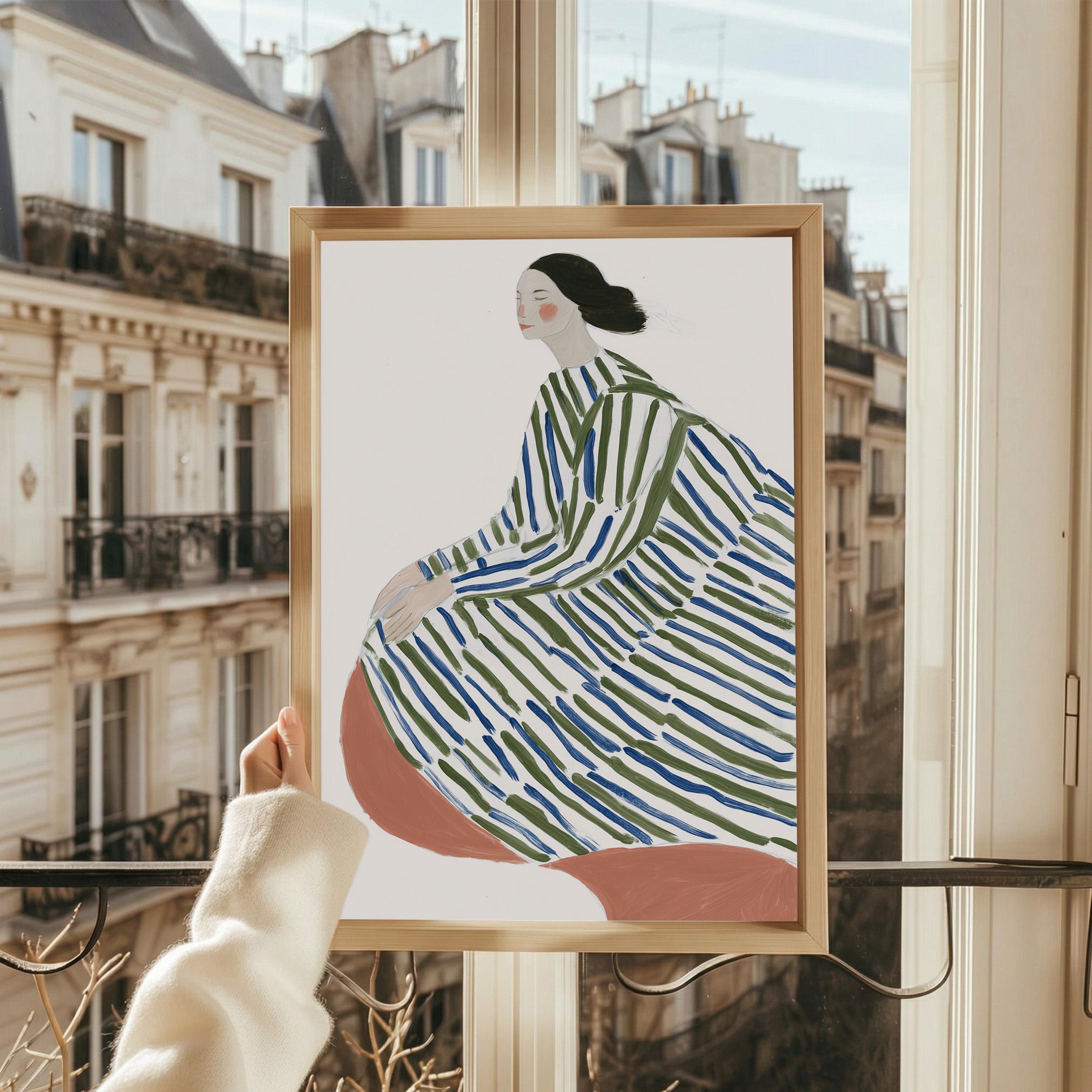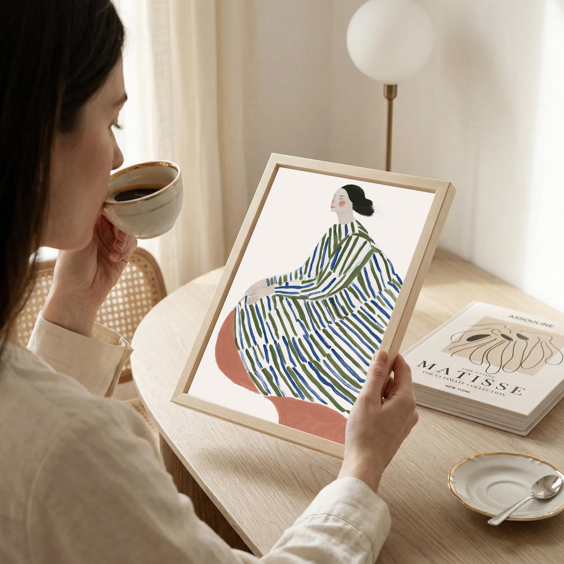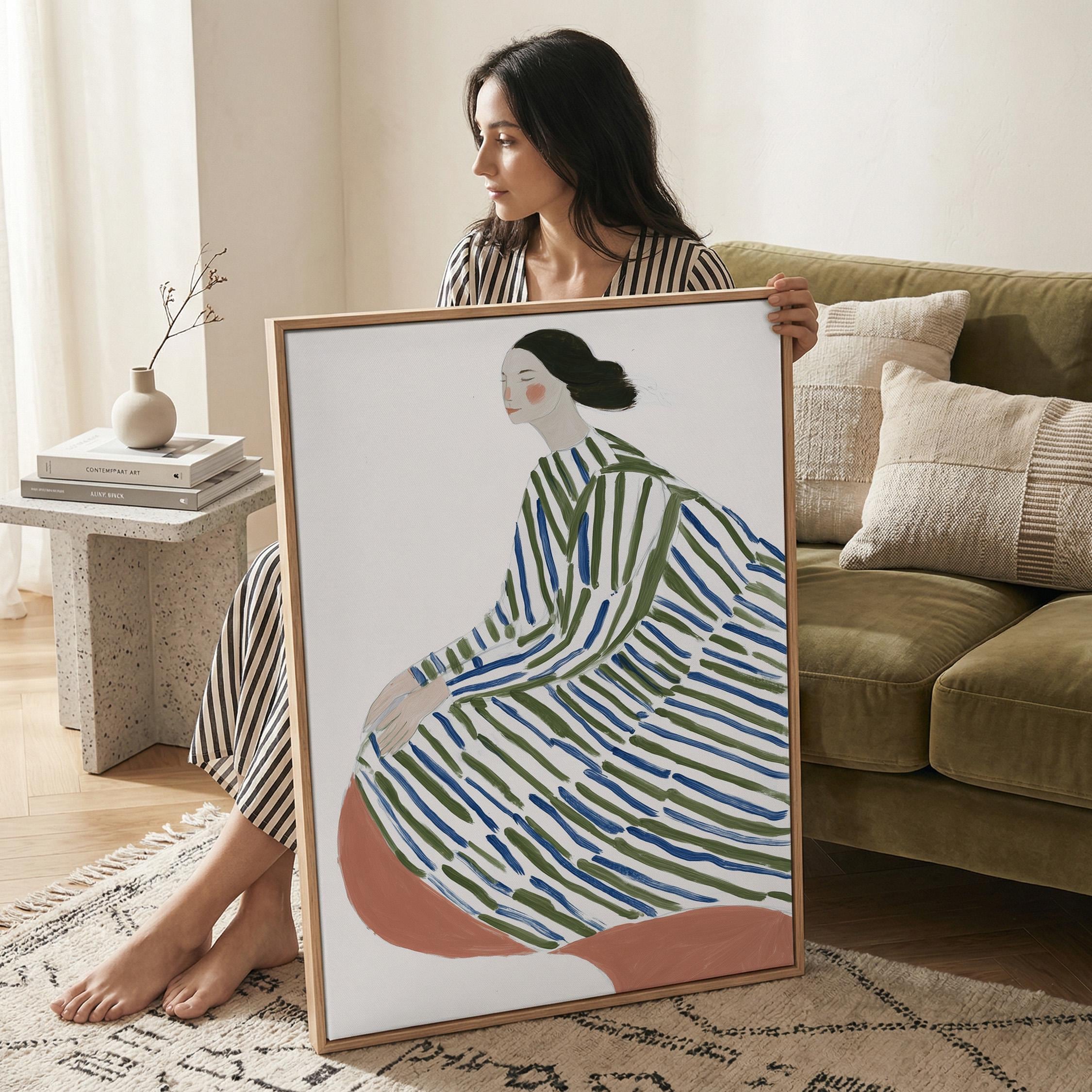 This elegant woman in striped robe wall art brings a serene, sophisticated touch to any space with its flowing lines and calming green and blue palette.